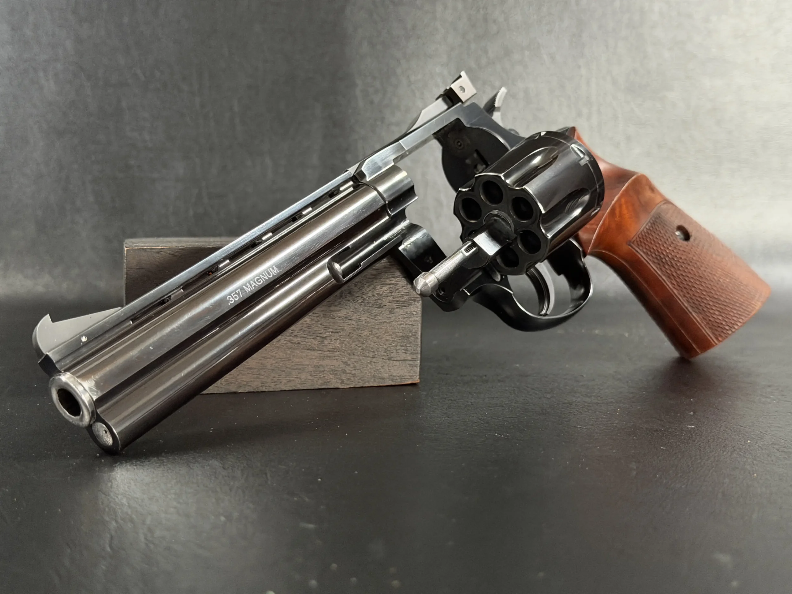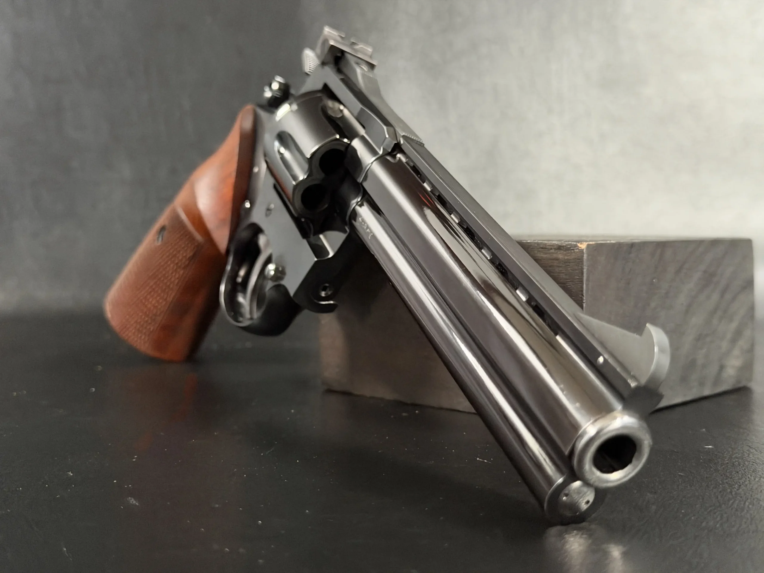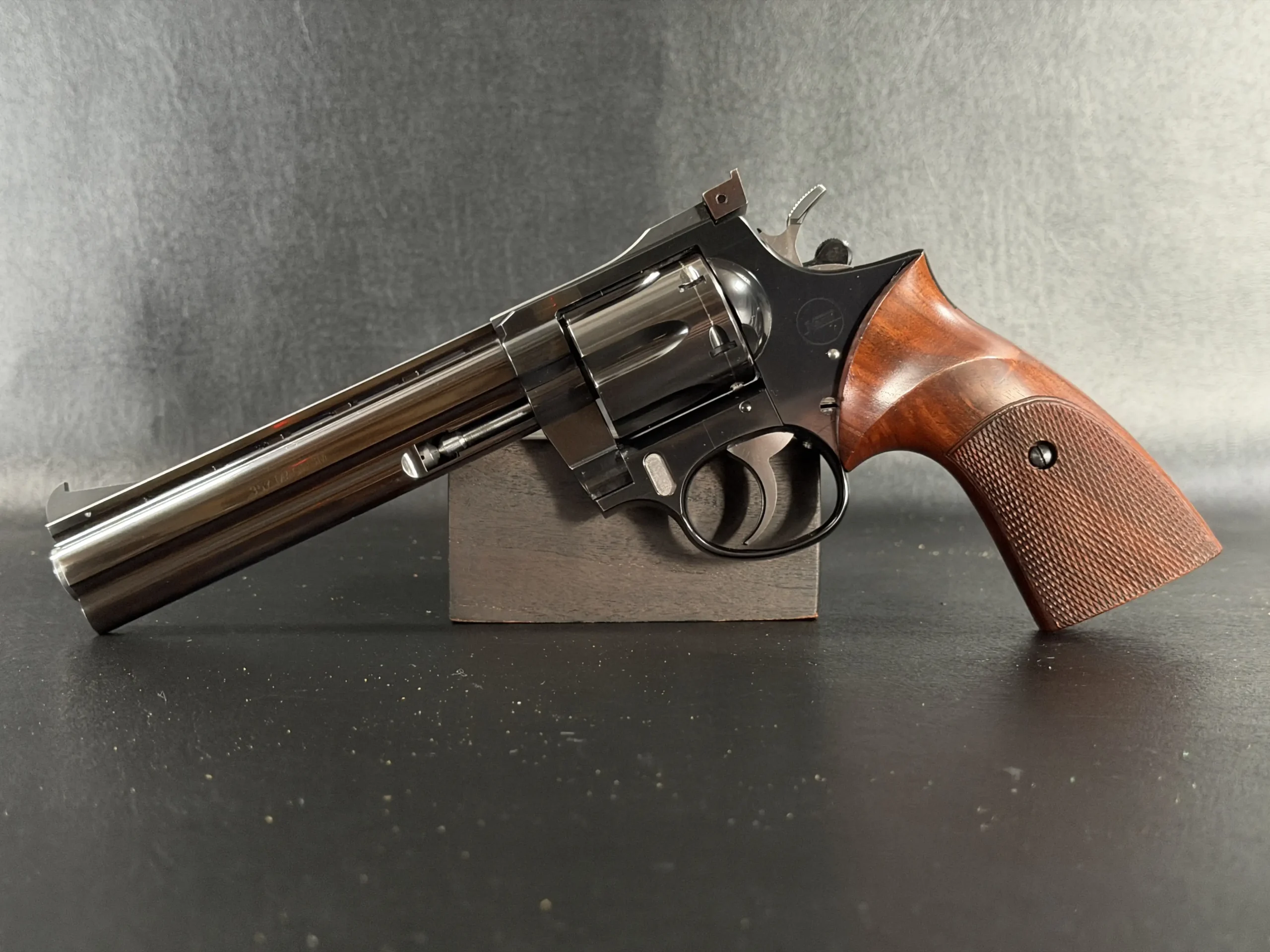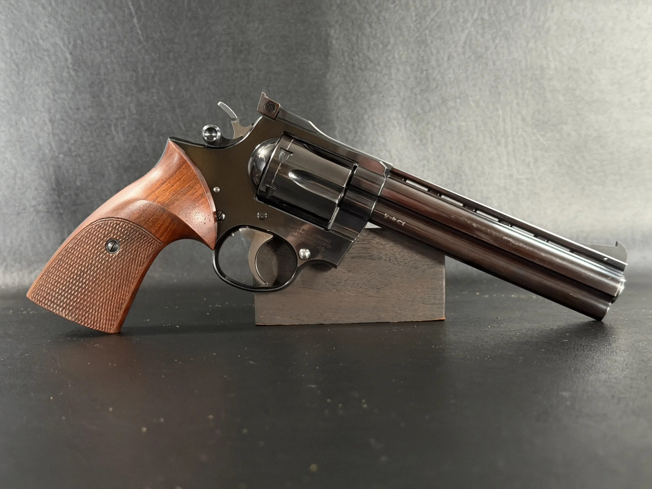 The Korth Ratzeburg Sport is a 6-inch revolver chambered in .357 Magnum, combining refined workmanship with a target-oriented configuration. This example features a 6-inch barrel with a ventilated rib, giving it an extended sight radius and balanced handling for range use or display.