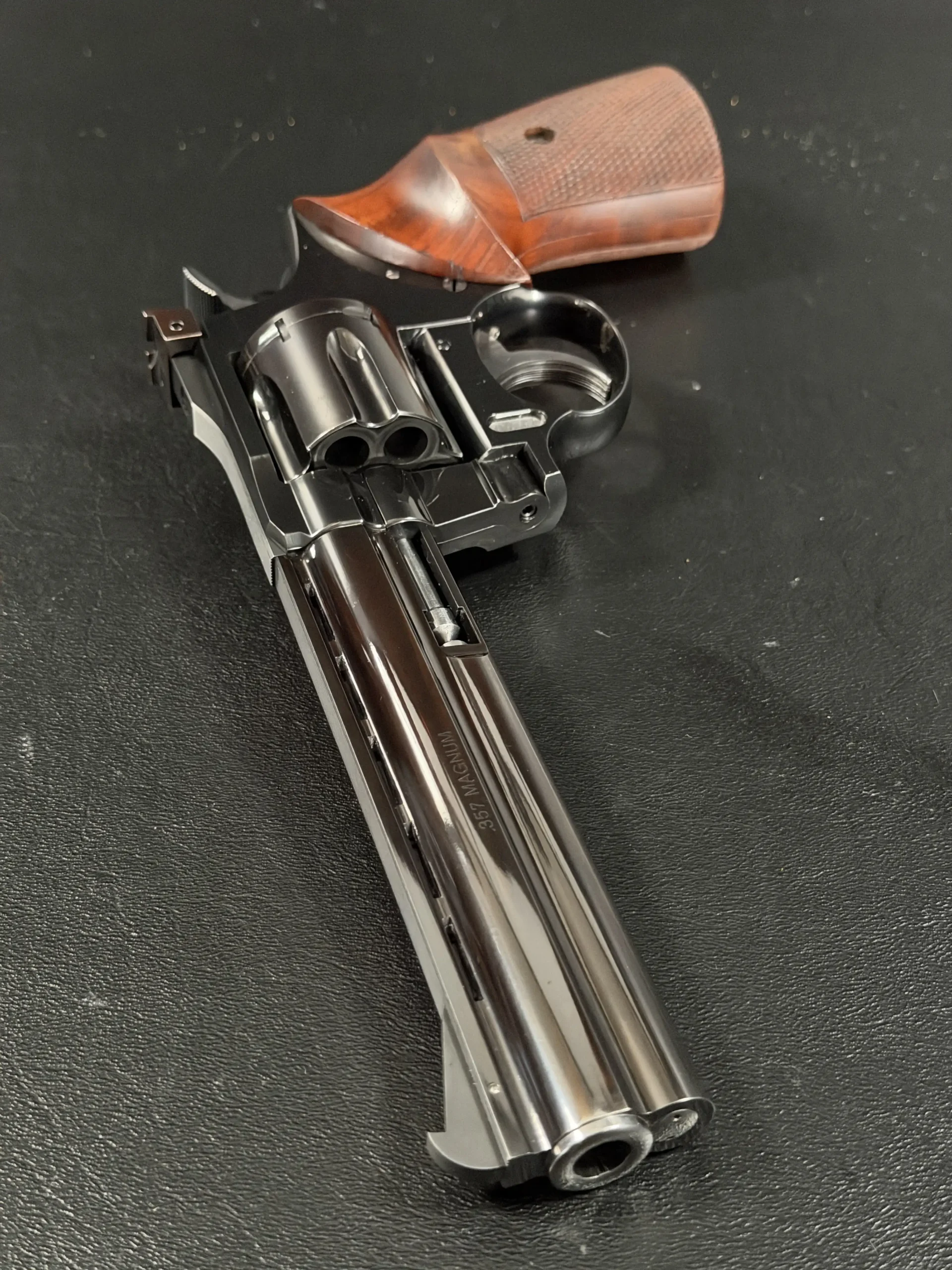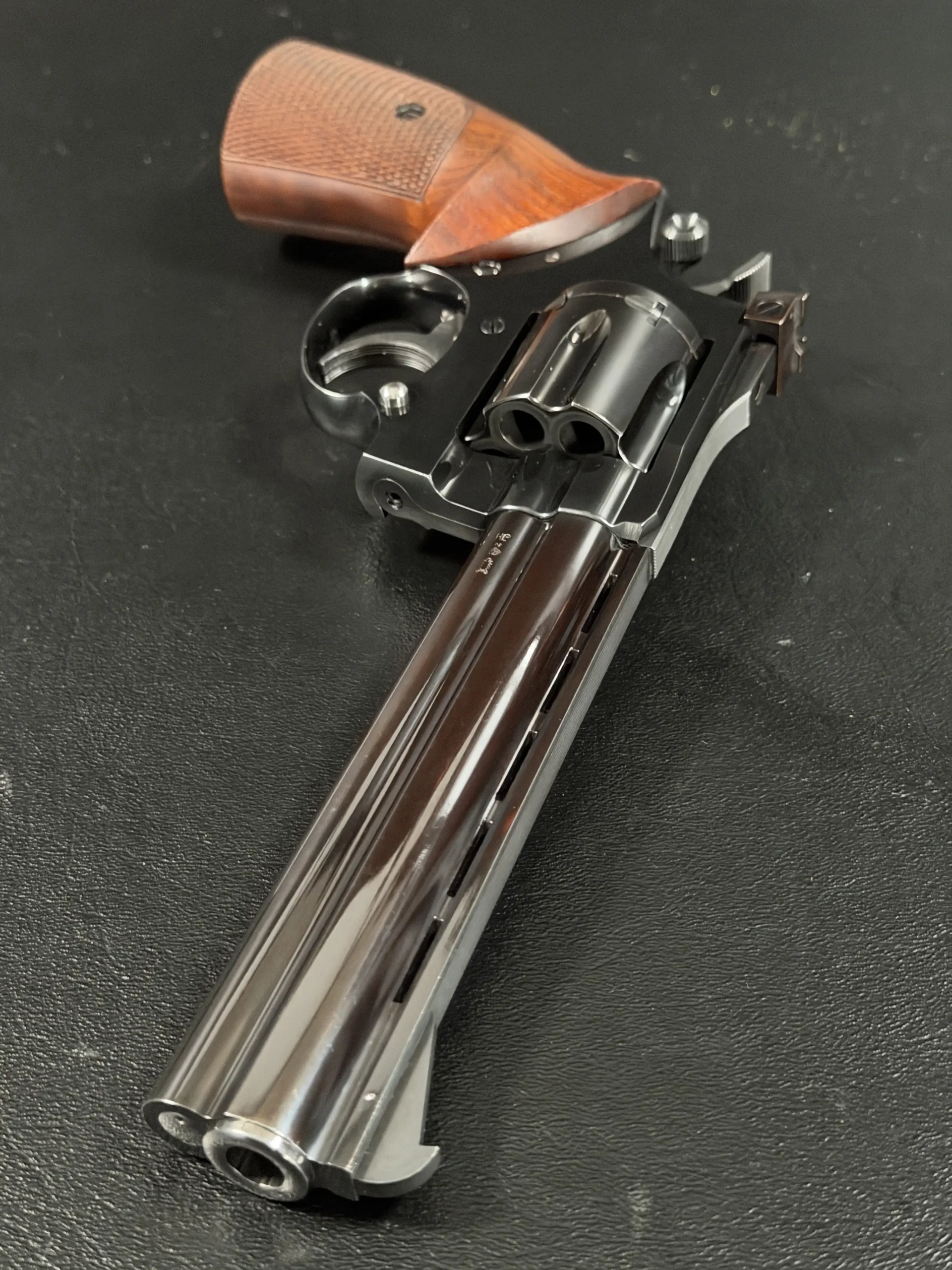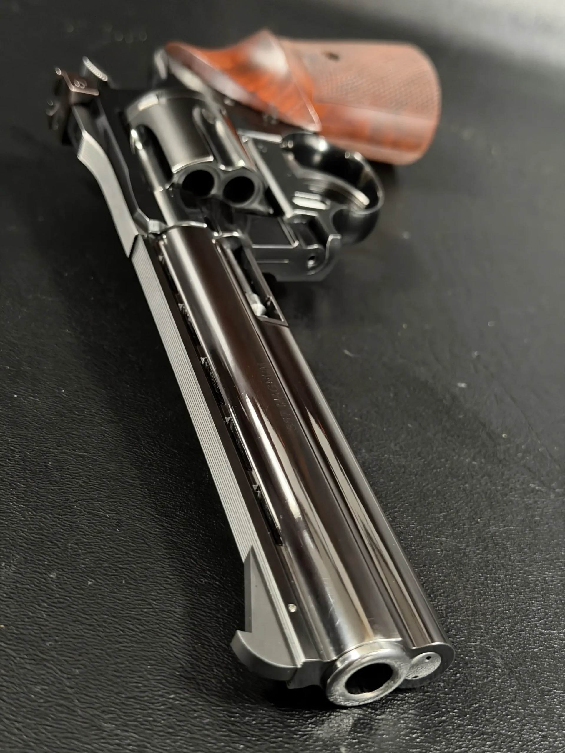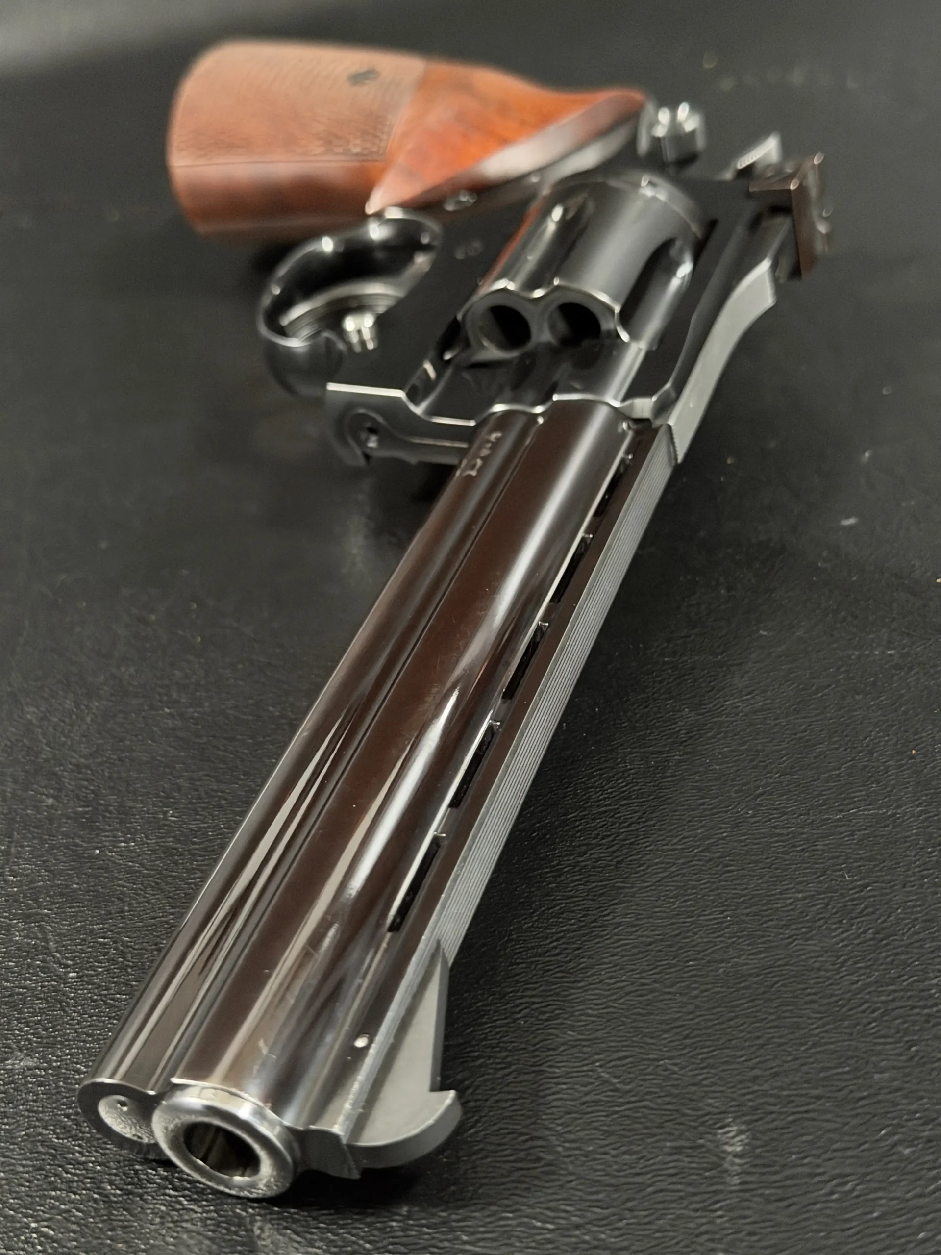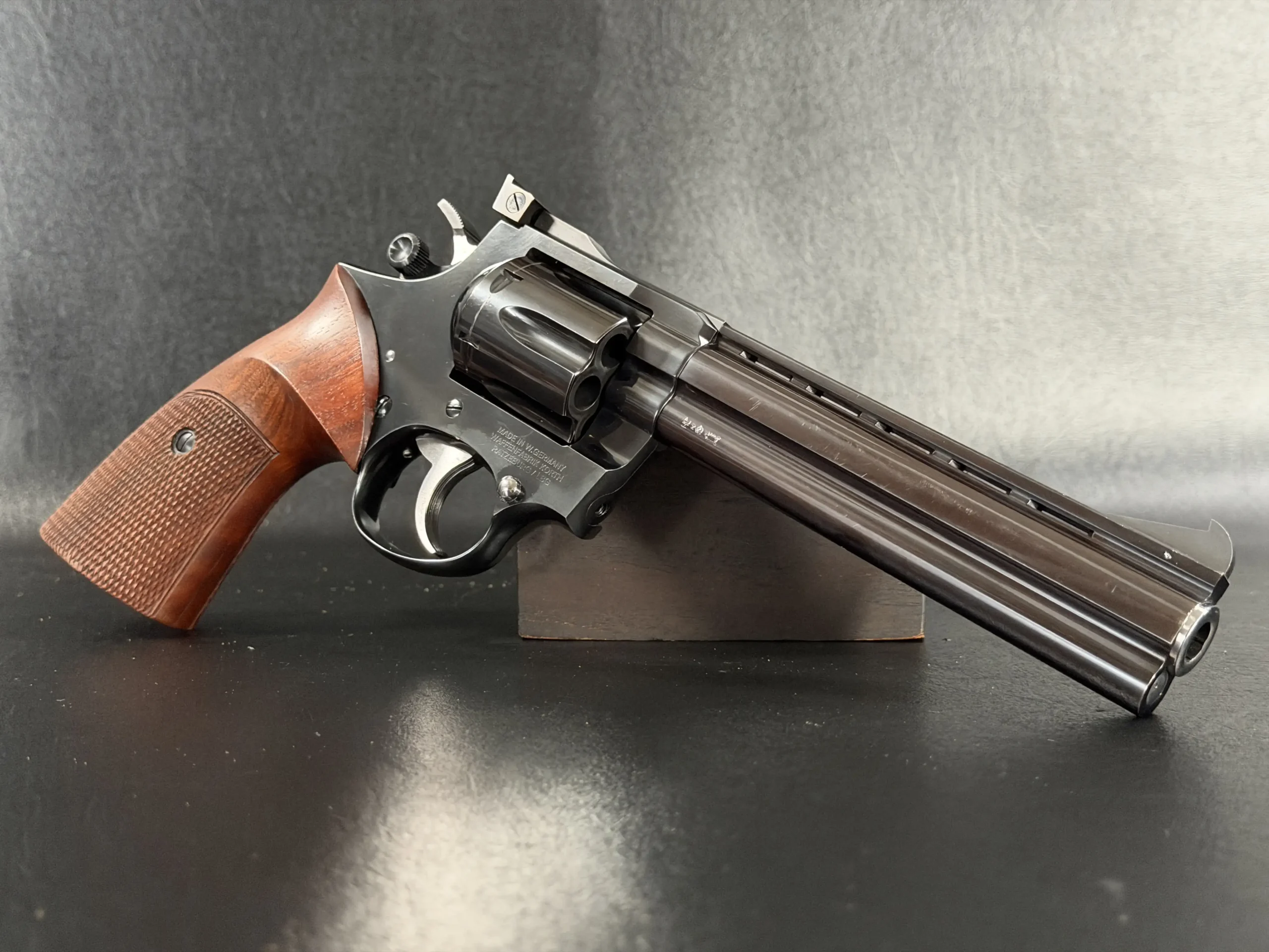 The Korth Ratzeburg Sport is a 6-inch revolver chambered in .357 Magnum, combining refined workmanship with a target-oriented configuration. This example features a 6-inch barrel with a ventilated rib, giving it an extended sight radius and balanced handling for range use or display.