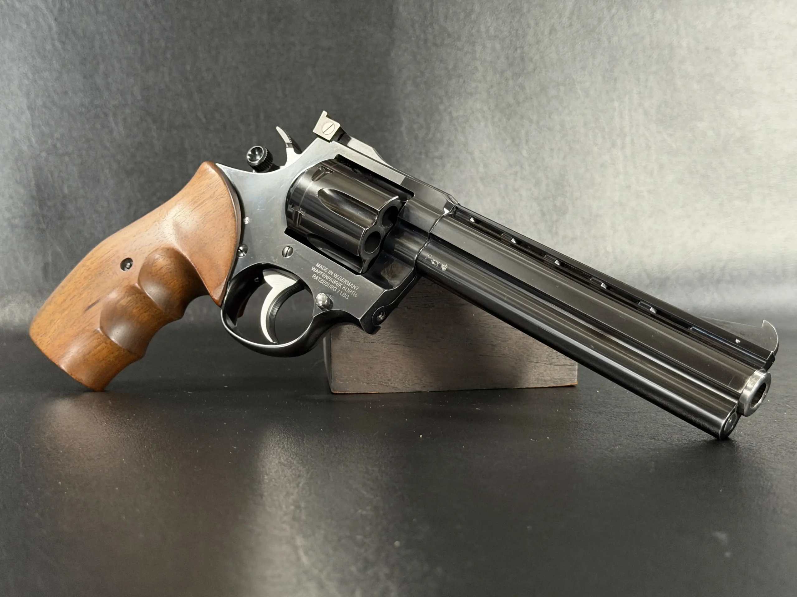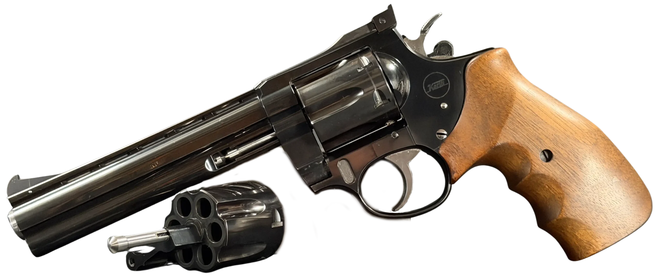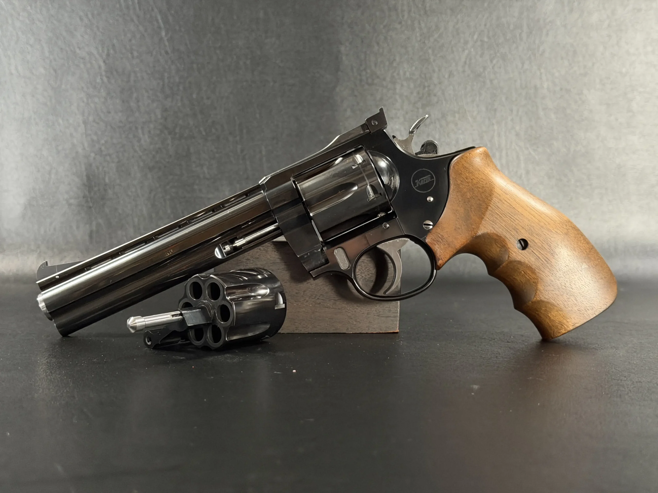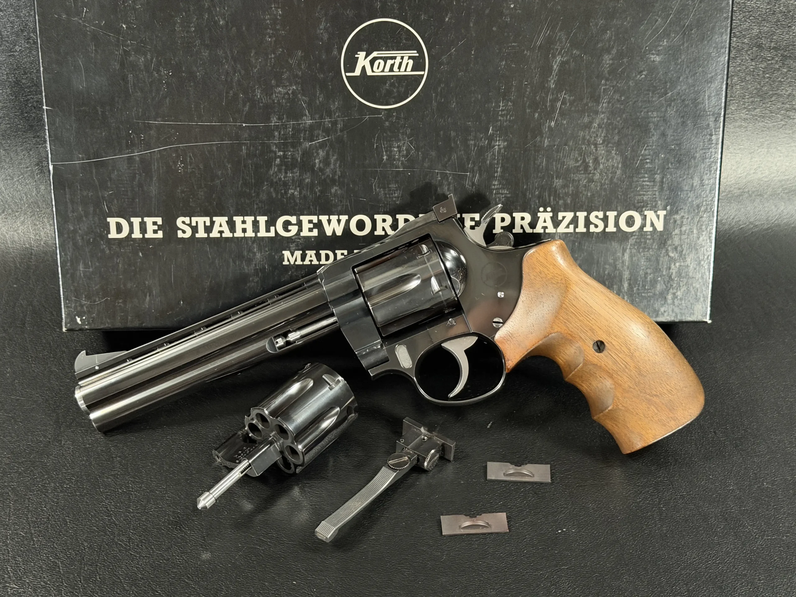 The Korth Ratzeburg Sport 6" Exchange Cylinder Set showcases the distinctive fit and finish associated with early Korth production. This revolver features a 6-inch barrel, a deep high-polish blue finish, and a factory exchange-cylinder configuration for use with both .357 Magnum and 9mm.