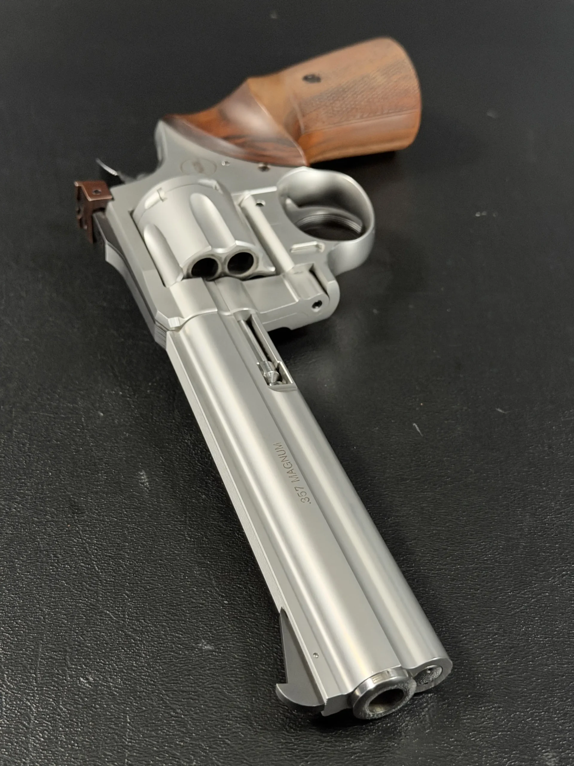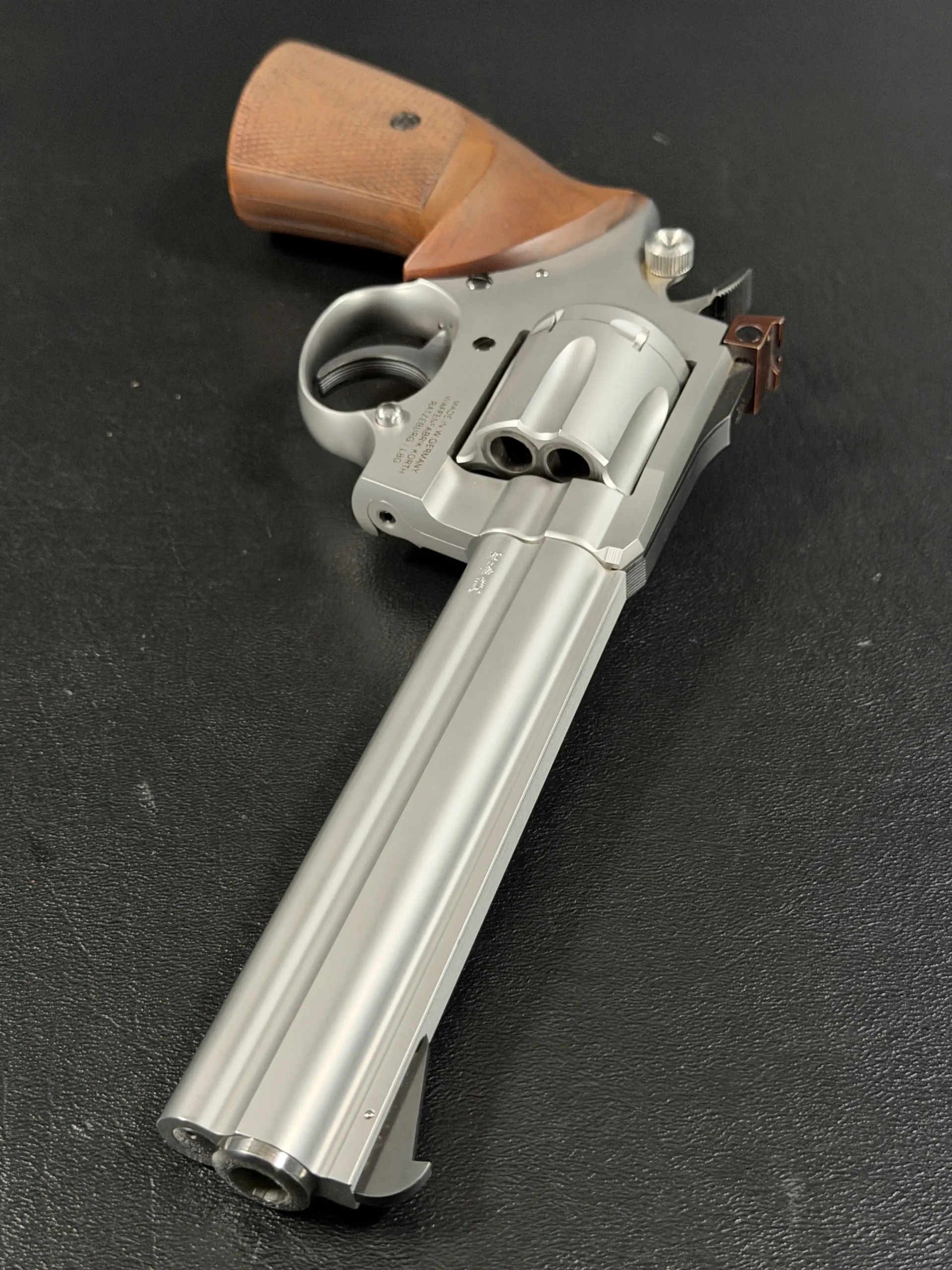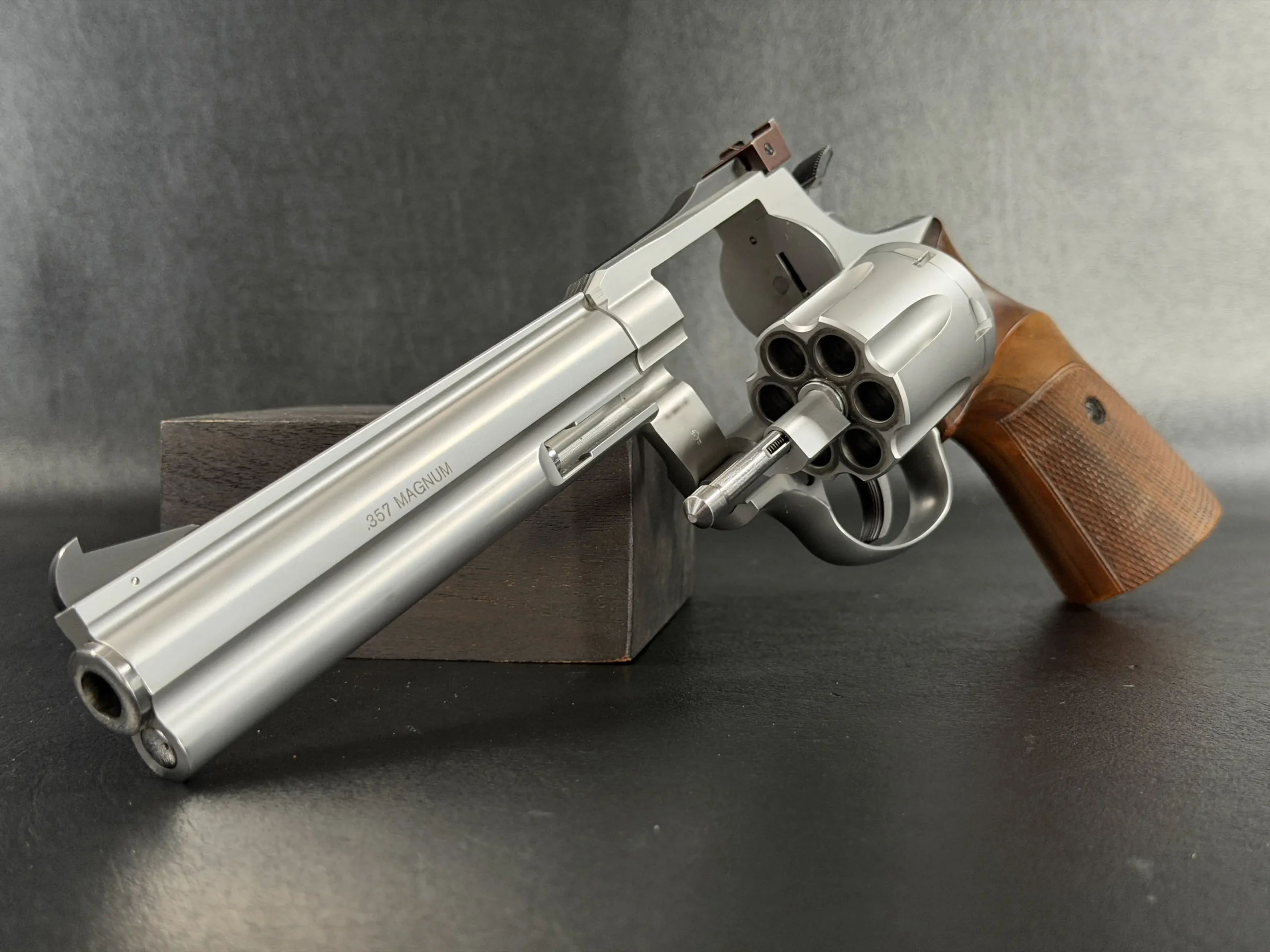 The 6-inch barrel offers a long sight radius and balanced handling, while the satin stainless finish highlights the revolver’s crisp lines and precise machining. Details include a ventilated rib, adjustable rear sight, cylinder fluting, and a crowned muzzle.