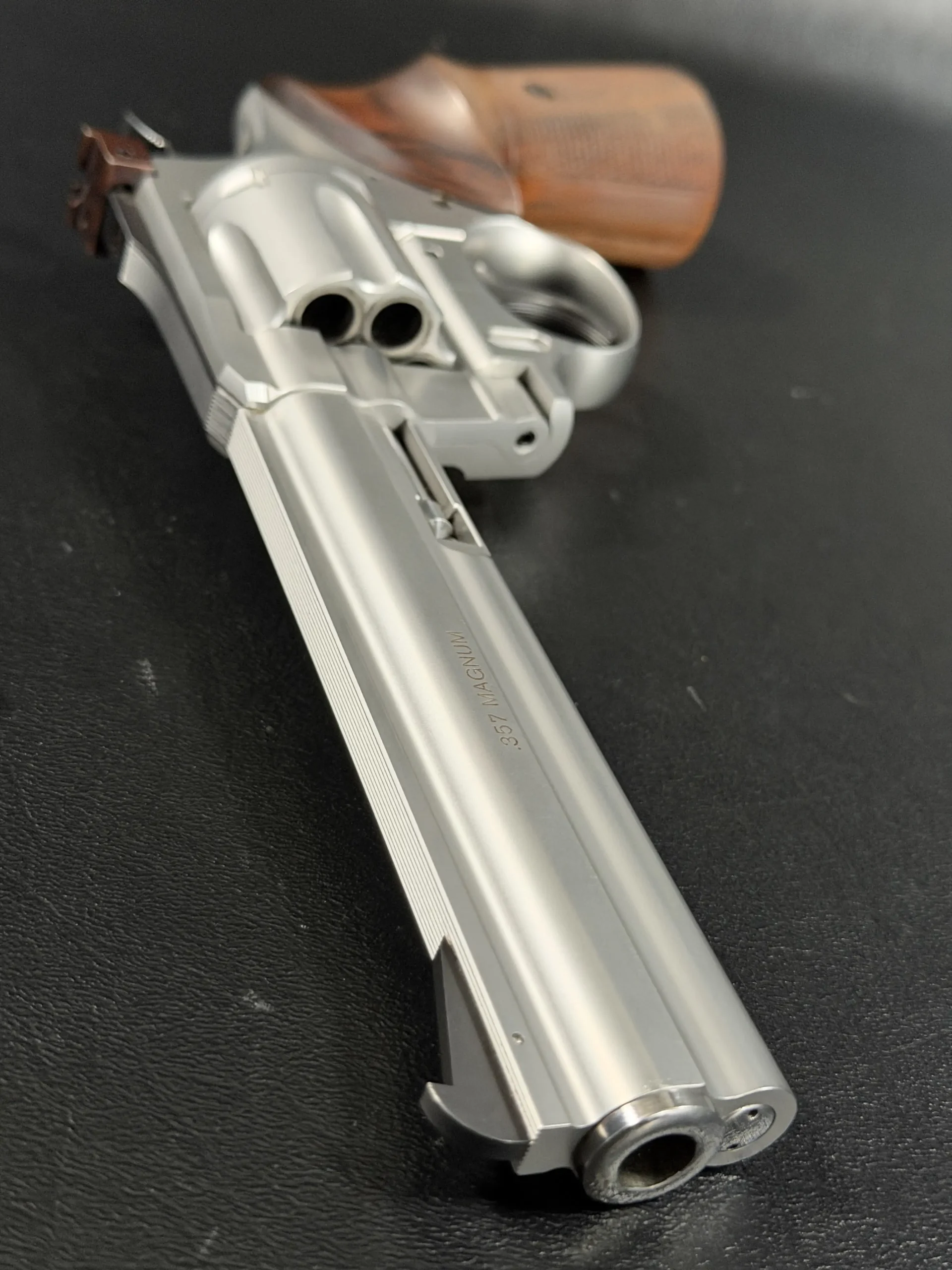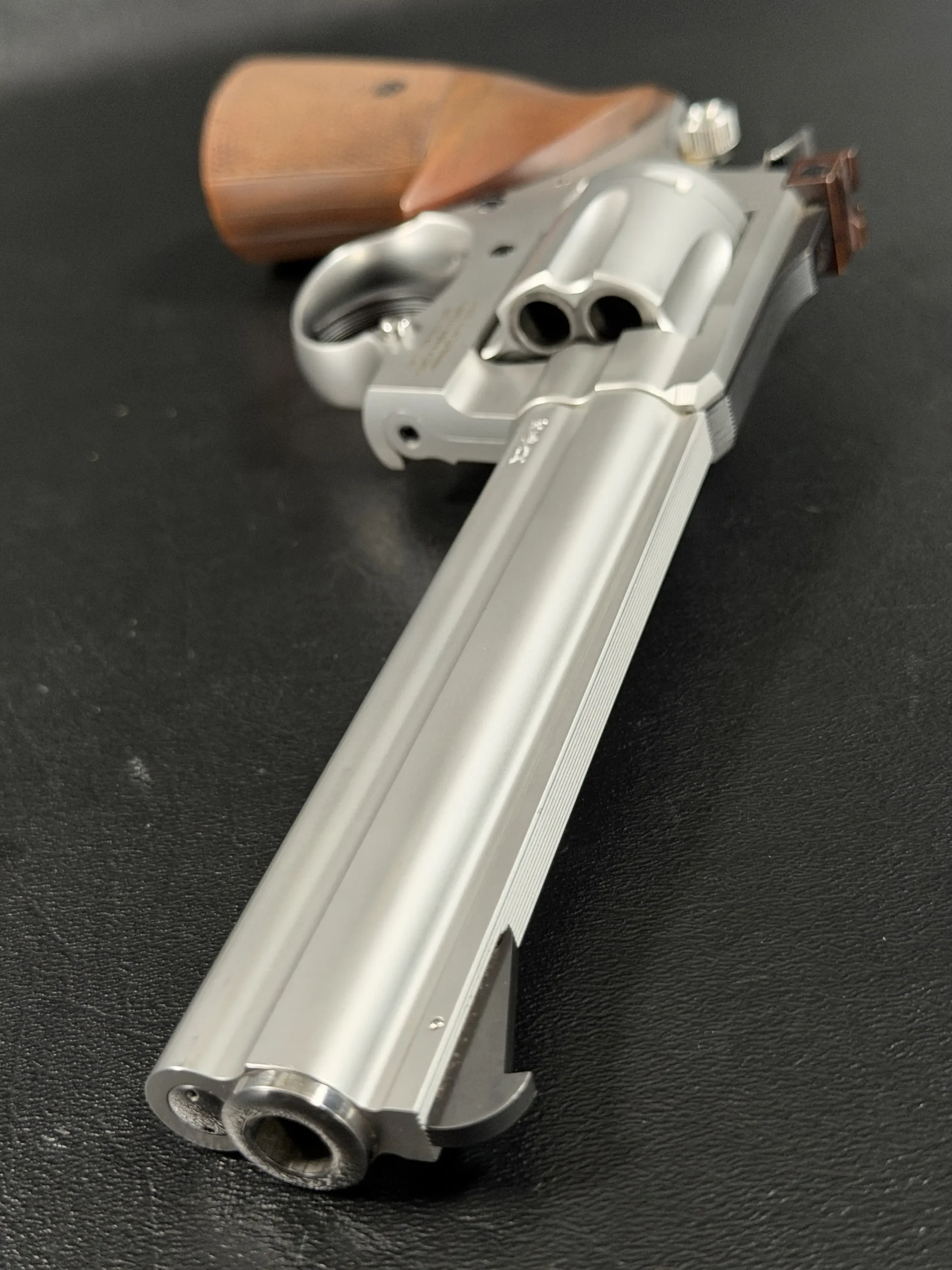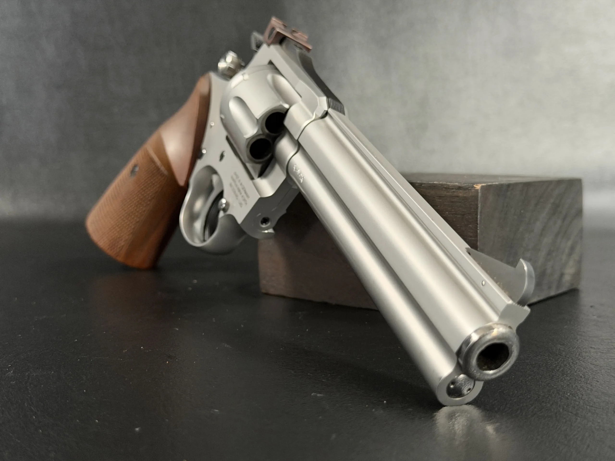 The 6-inch barrel offers a long sight radius and balanced handling, while the satin stainless finish highlights the revolver’s crisp lines and precise machining. Details include a ventilated rib, adjustable rear sight, cylinder fluting, and a crowned muzzle.