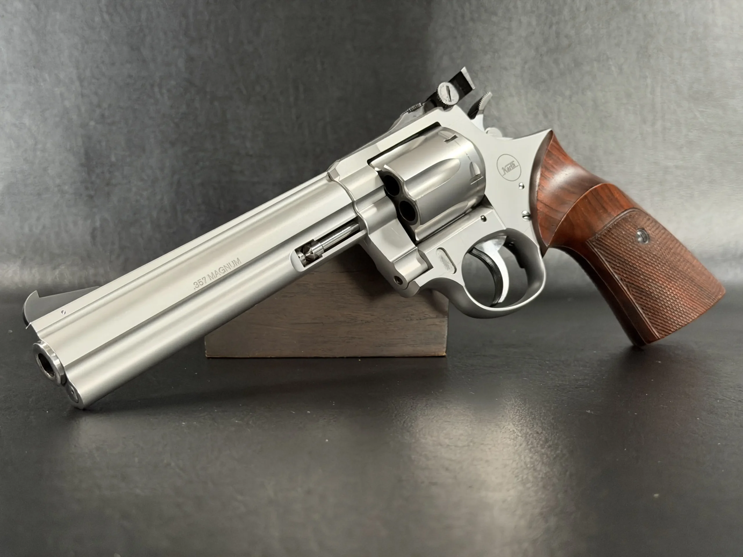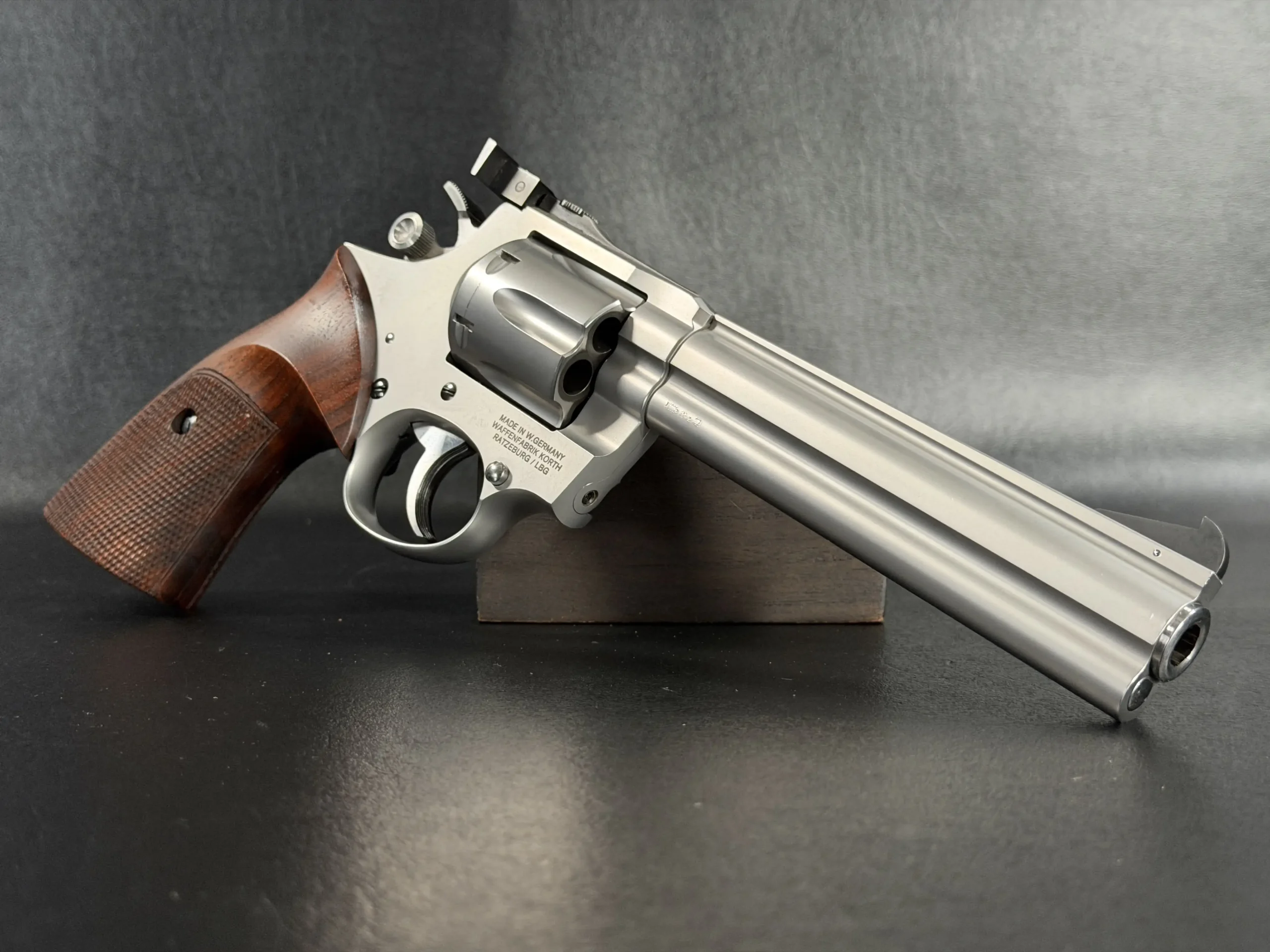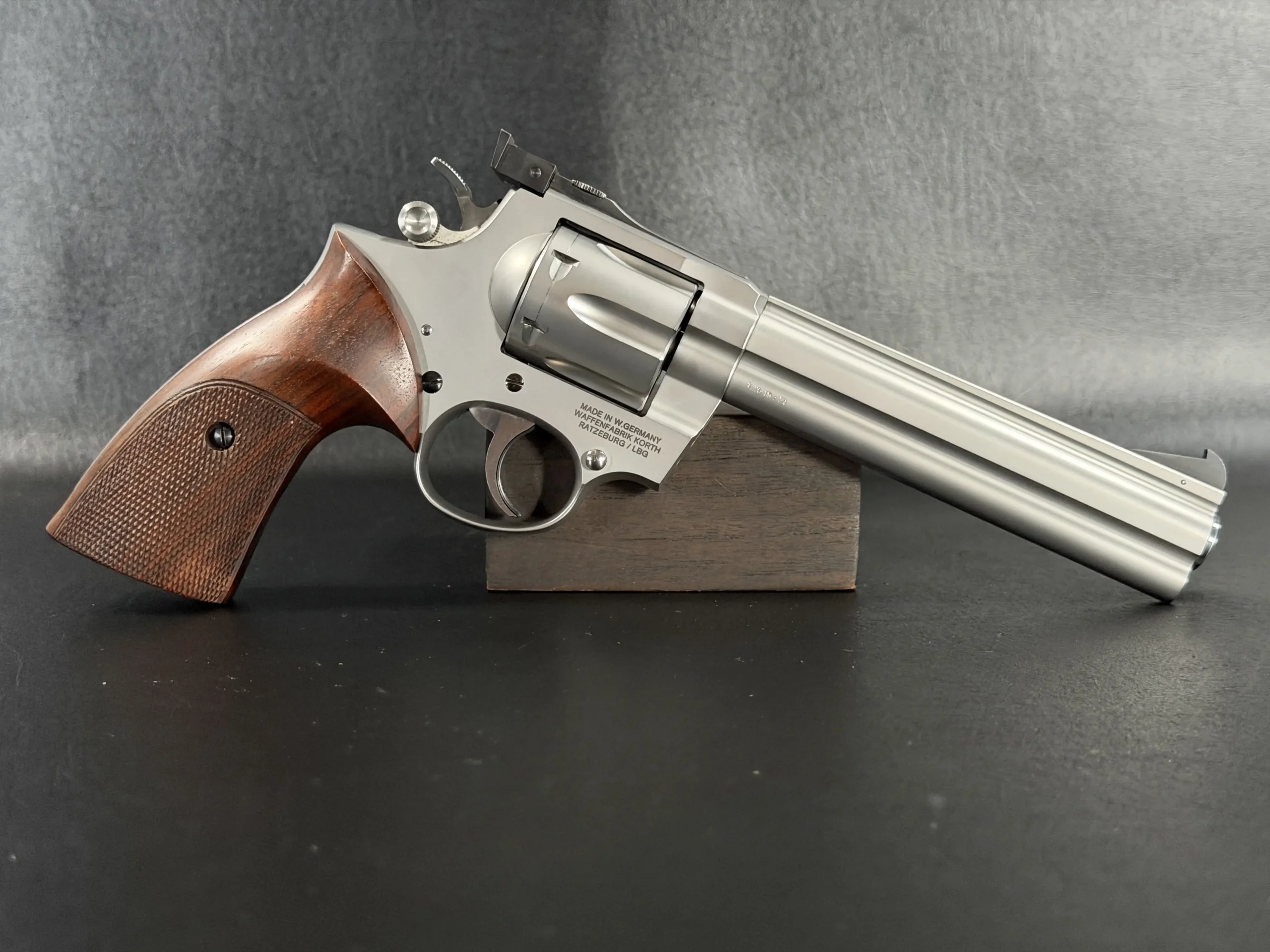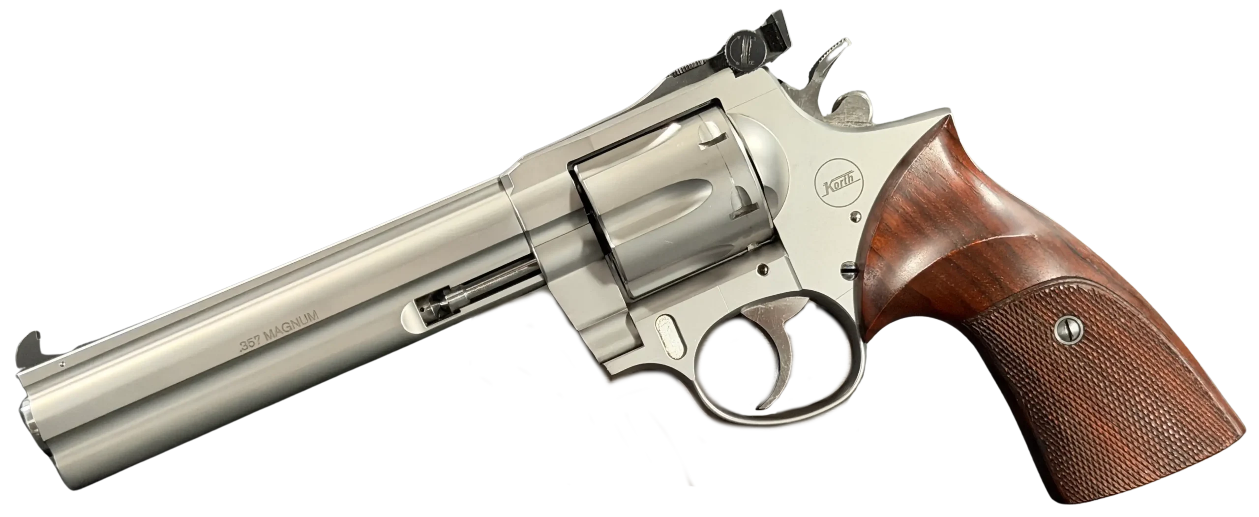 The Korth Ratzeburg Sport Stainless 6 Inch is a .357 Magnum revolver from Korth’s Ratzeburg, West Germany production. Built entirely from stainless steel, it features a satin finish, a 6-inch barrel, a barrel rib, and a full underlug.