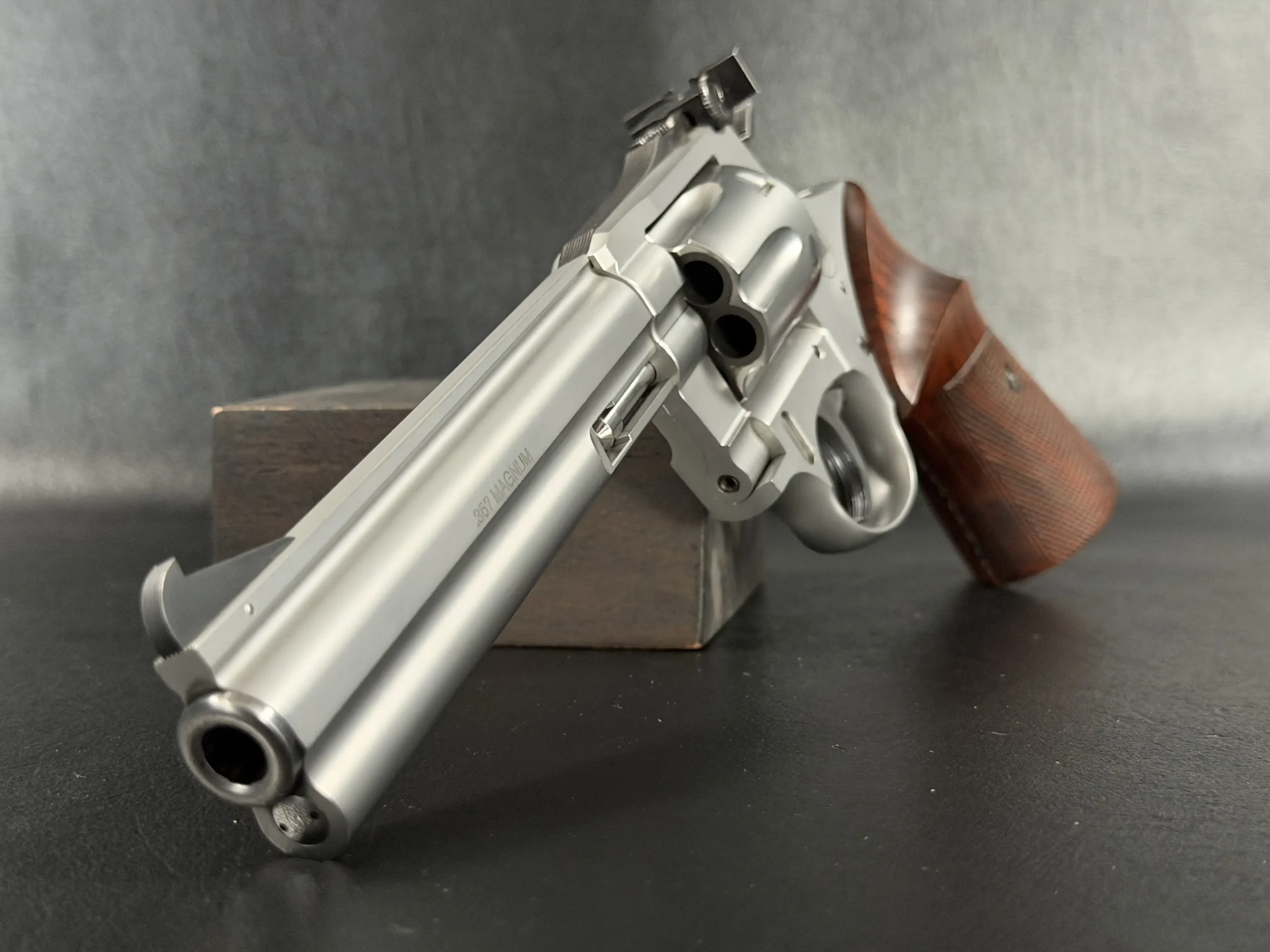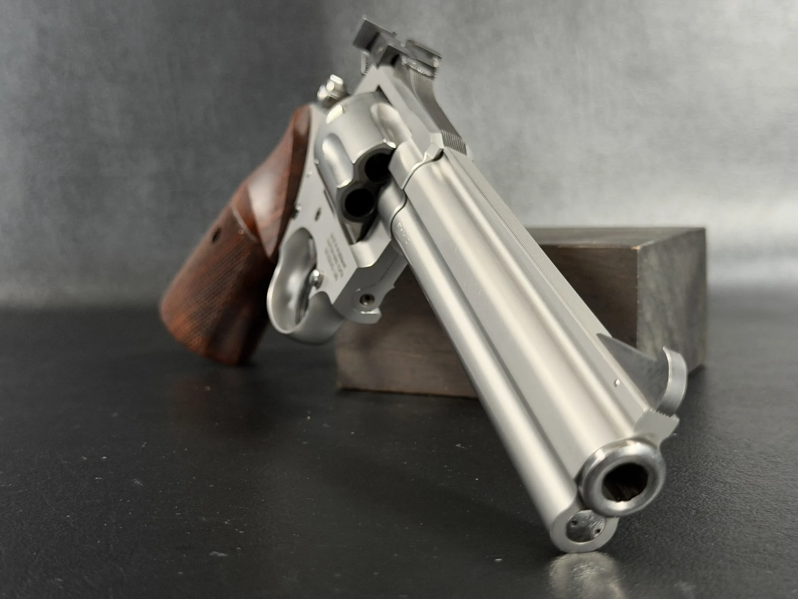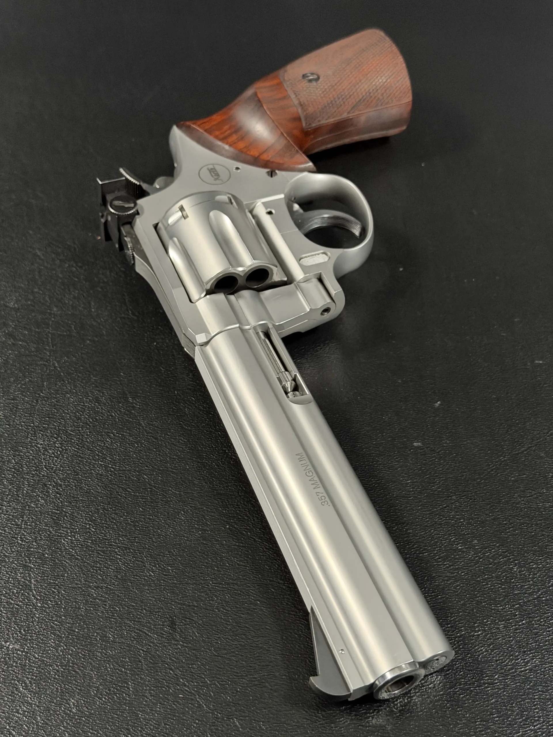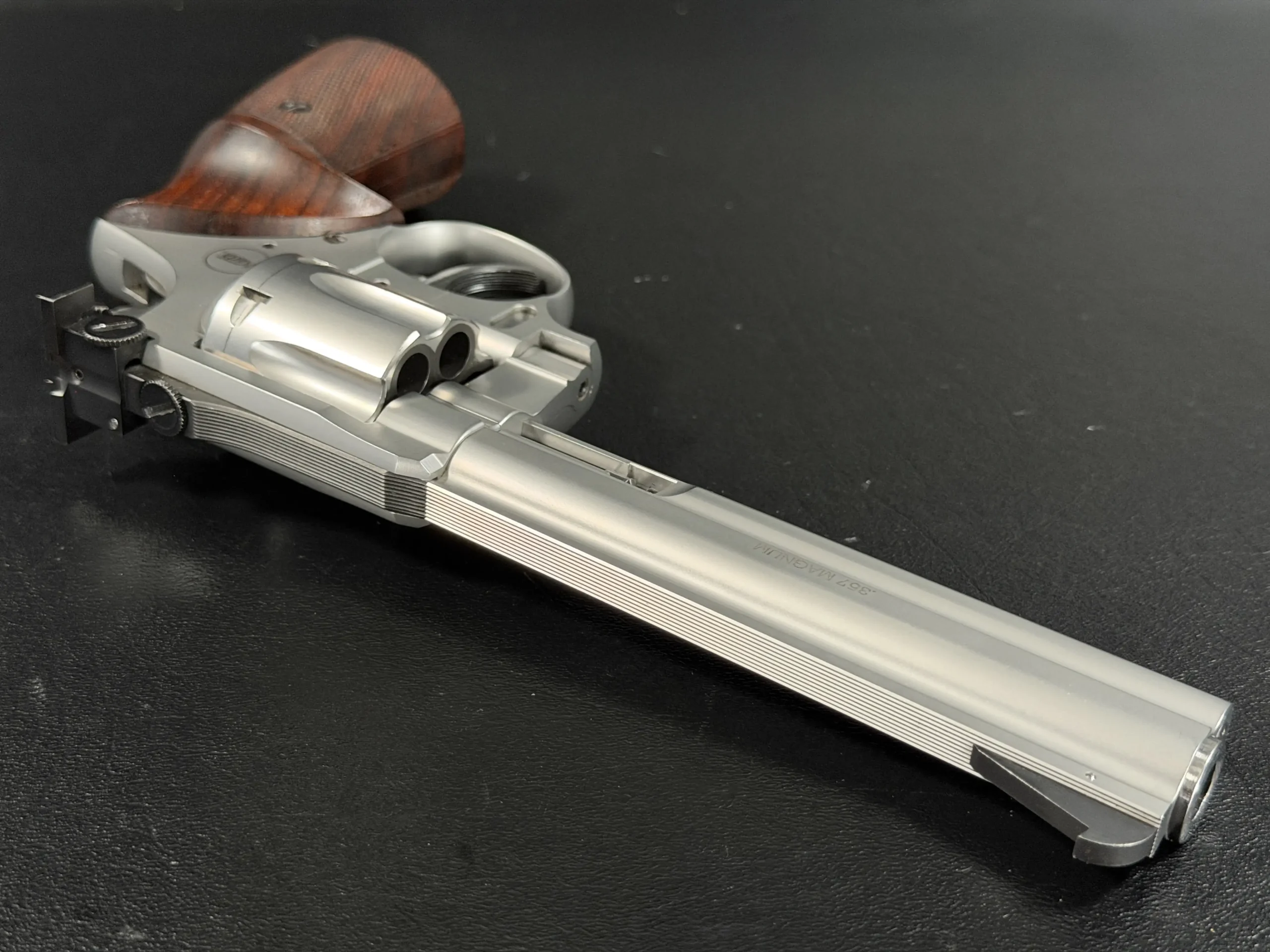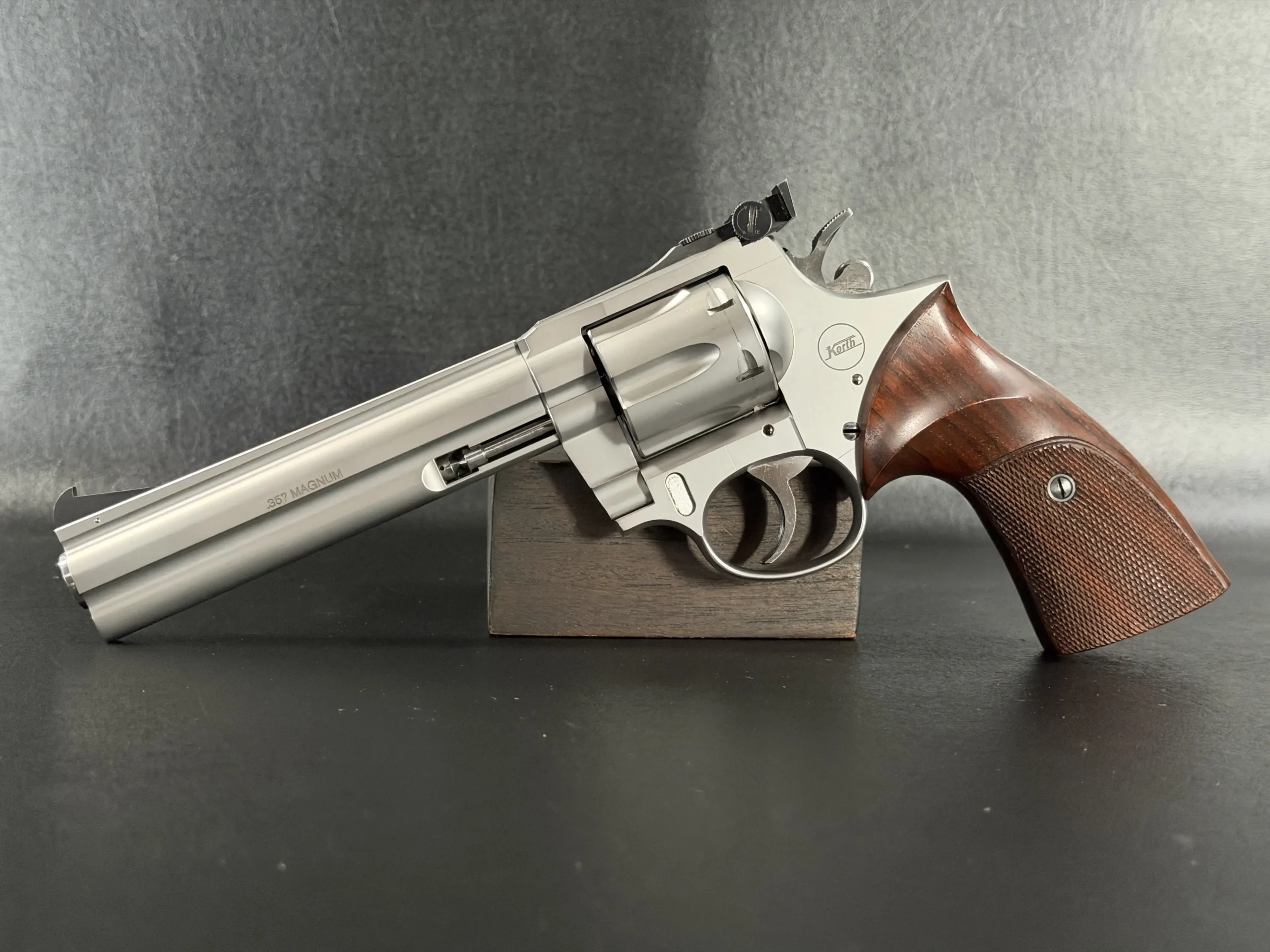 The Korth Ratzeburg Sport Stainless 6 Inch is a .357 Magnum revolver from Korth’s Ratzeburg, West Germany production. Built entirely from stainless steel, it features a satin finish, a 6-inch barrel, a barrel rib, and a full underlug.