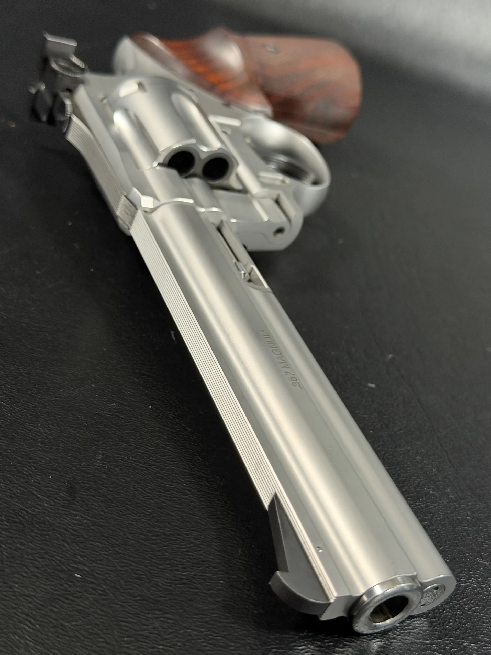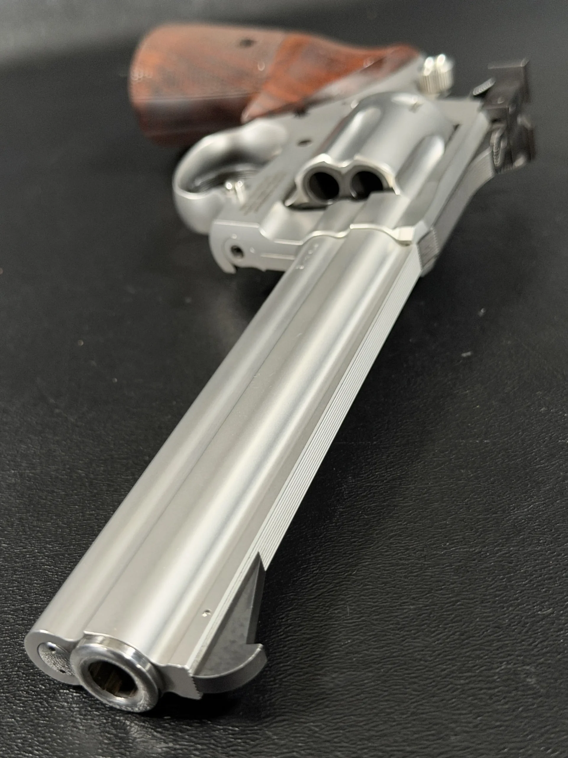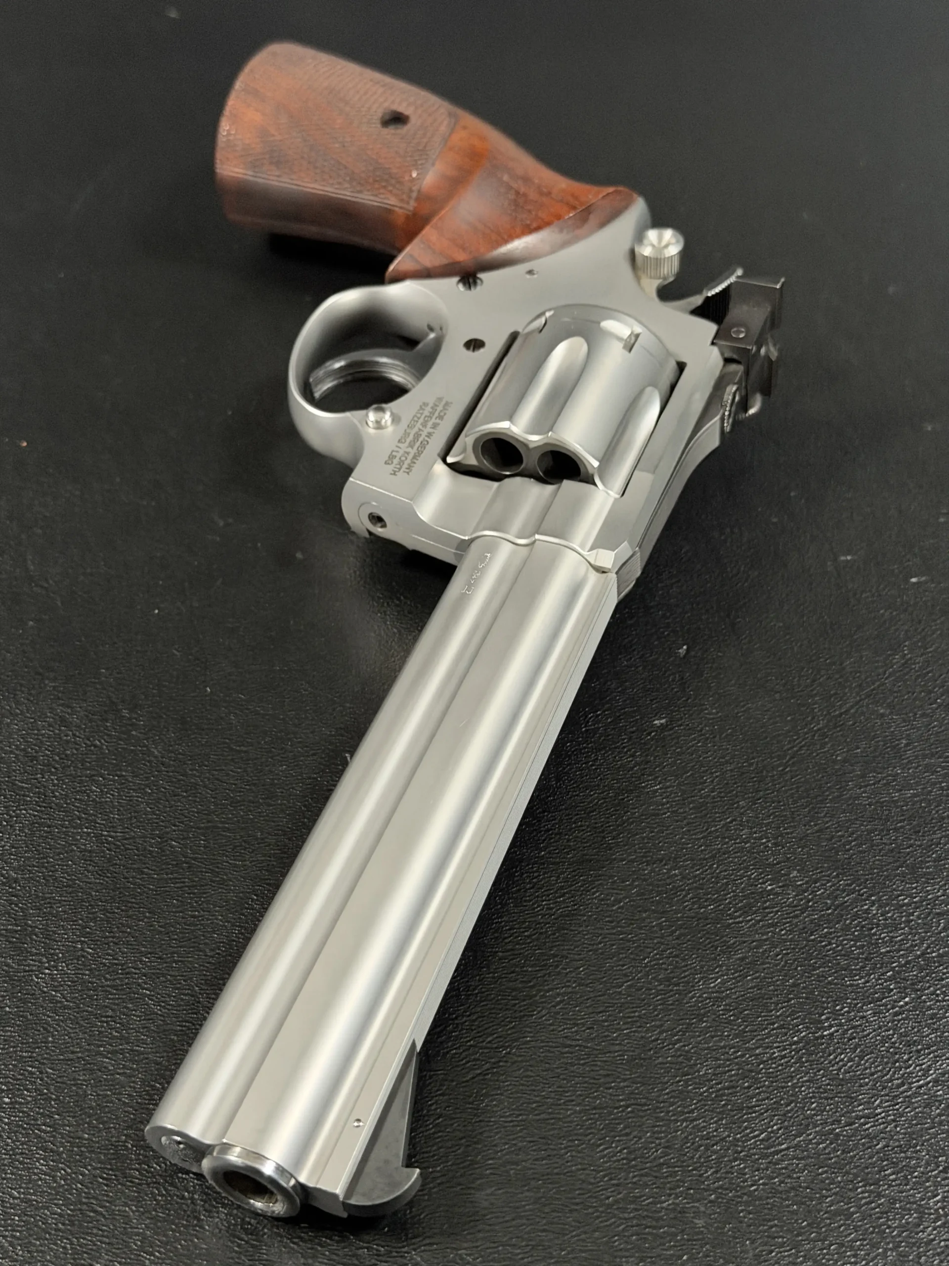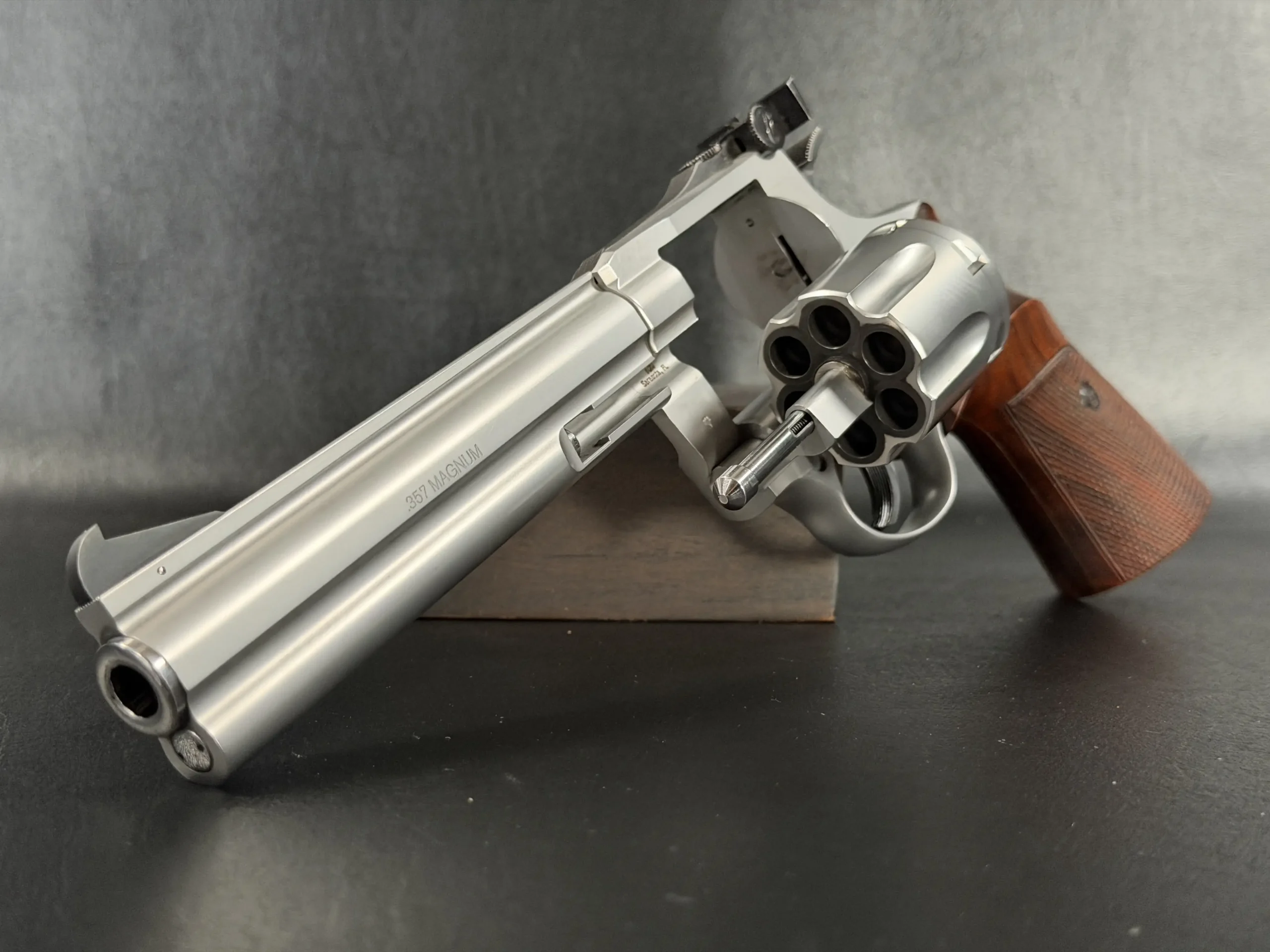 The Korth Ratzeburg Sport Stainless 6 Inch is a .357 Magnum revolver from Korth’s Ratzeburg, West Germany production. Built entirely from stainless steel, it features a satin finish, a 6-inch barrel, a barrel rib, and a full underlug.