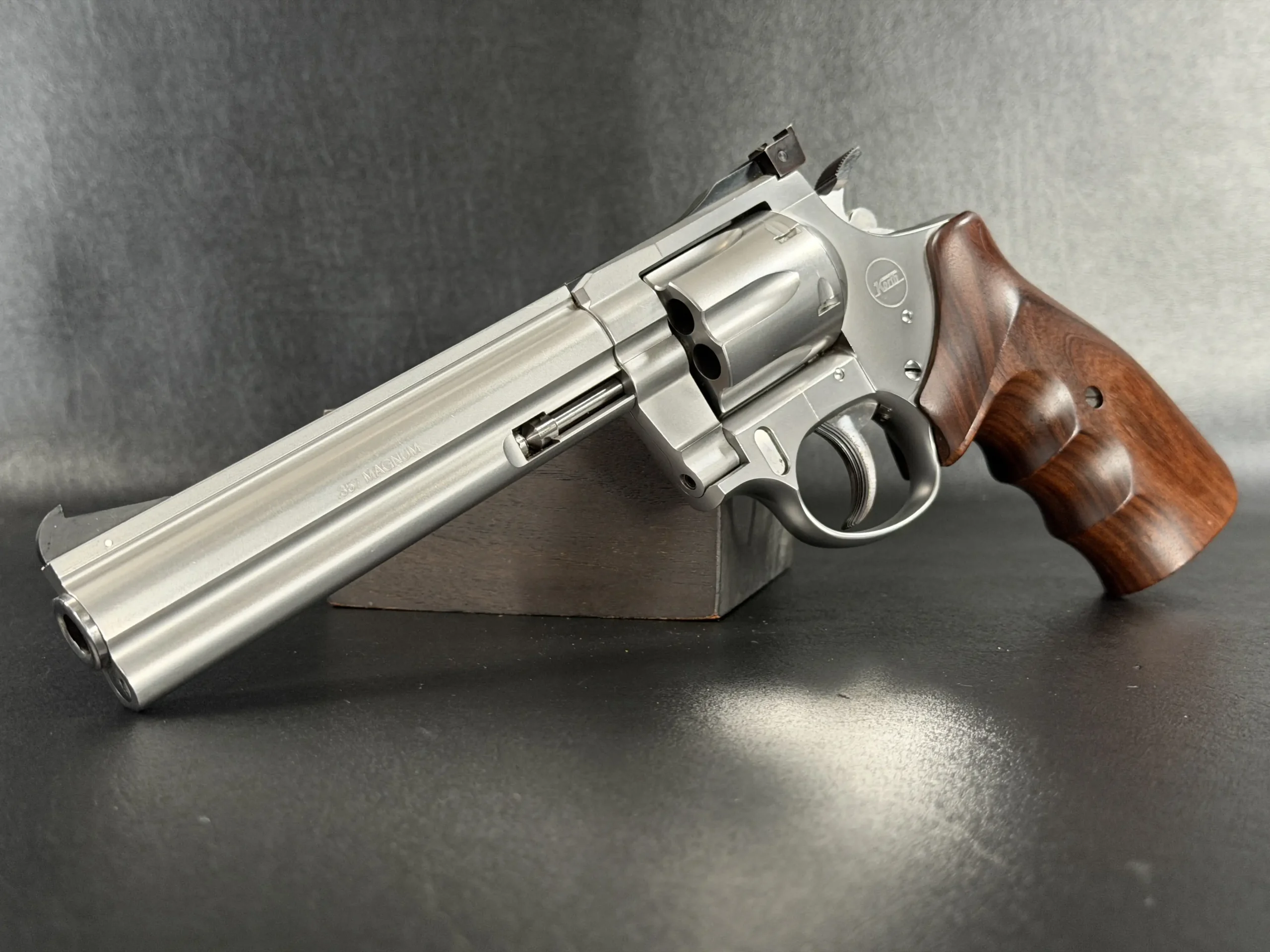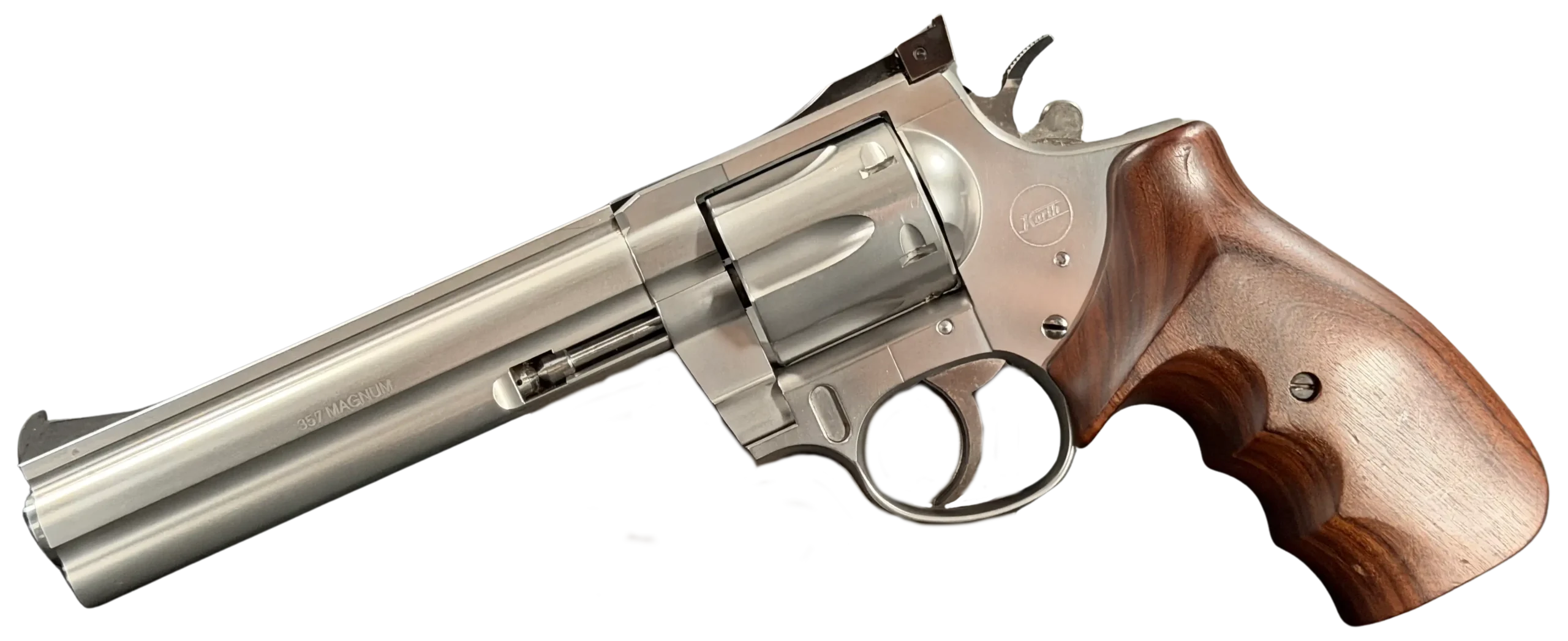 Korth Ratzeburg Sport Stainless revolver chambered in .357 Magnum. This Ratzeburg-era Sport model features a satin stainless finish, adjustable target sights, a full underlug barrel, machined cylinder flutes, and checkered wood grips.