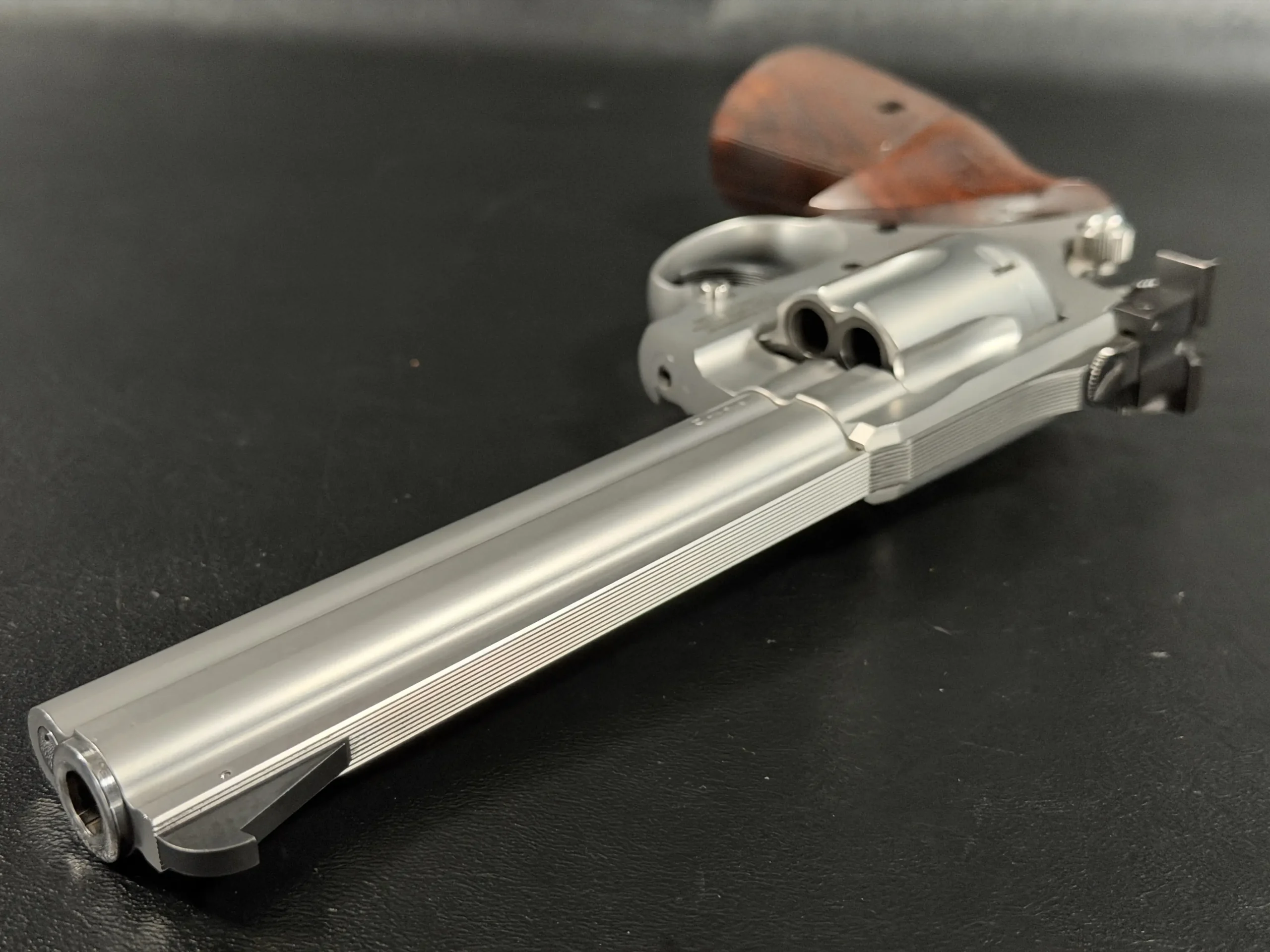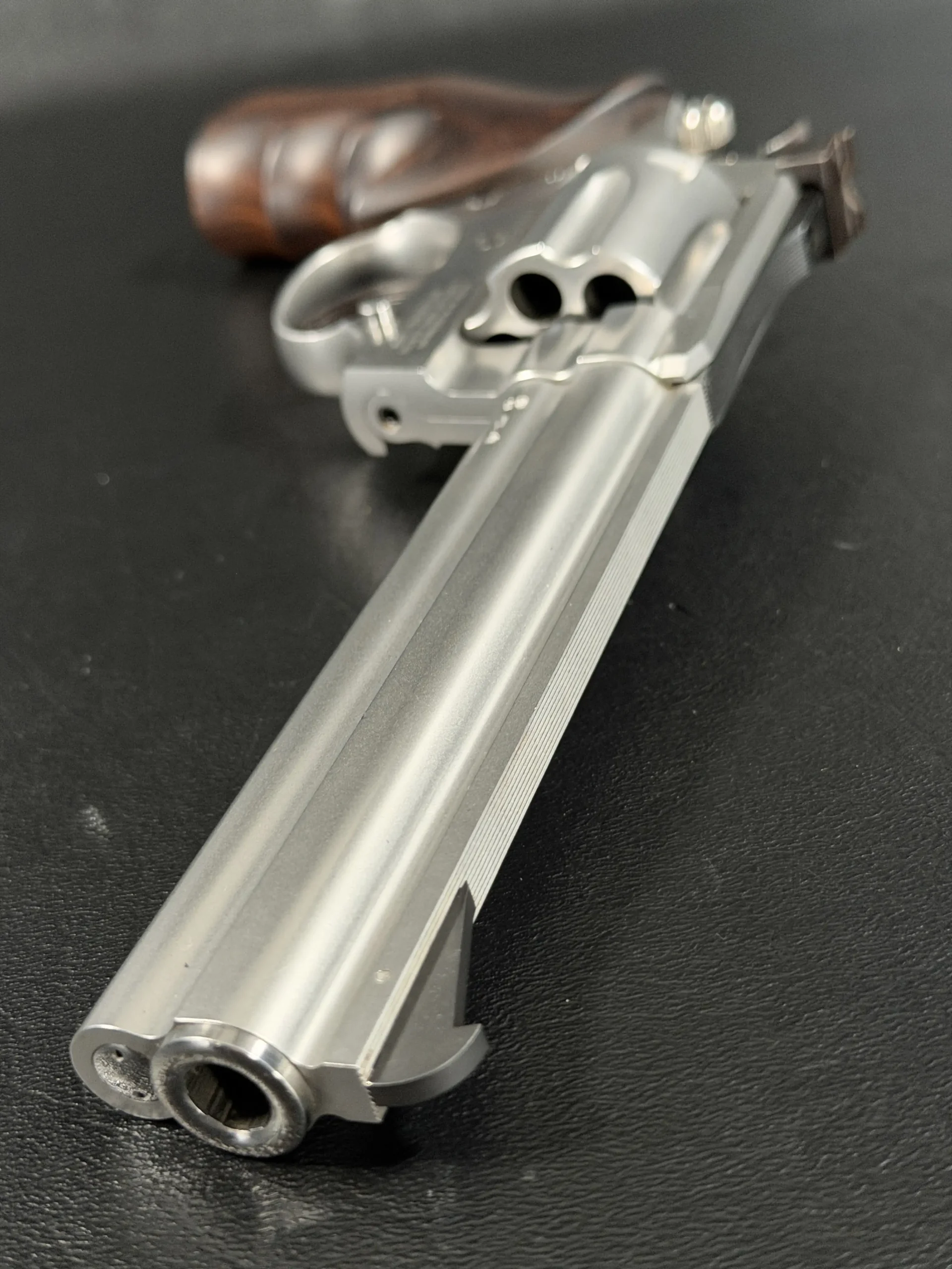 This Sport configuration features a satin stainless finish that complements the revolver’s full underlug barrel and machined cylinder flutes. Adjustable target sights and a precision front blade support the model’s target-oriented design, while checkered wood grips add warmth and contrast to the stainless steel frame.