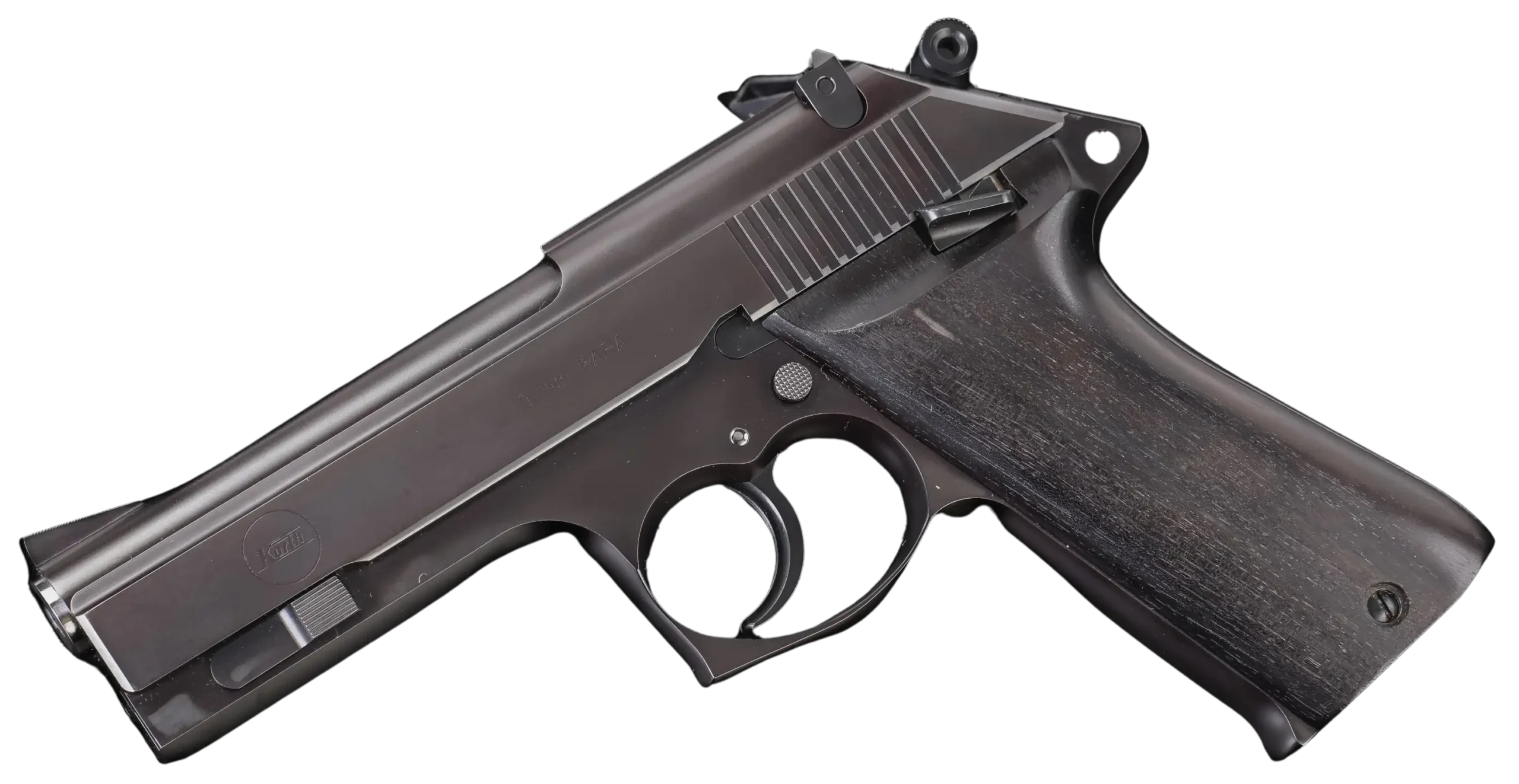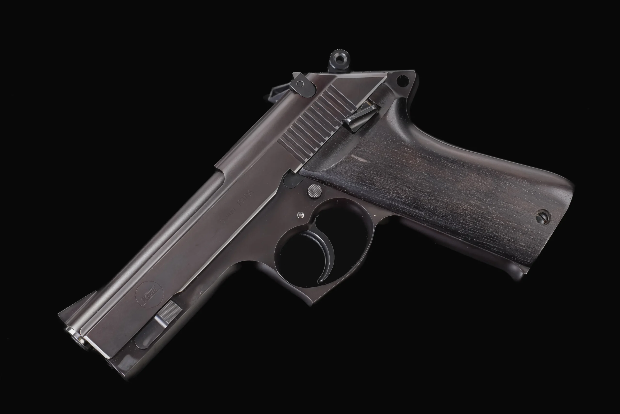Chambered in 9mm, this pistol reflects the precise machining and meticulous fitment associated with Korth. Details such as the slide serrations, frame-to-slide fit, and control surfaces show careful attention throughout the design, while the grip panels add a warm visual contrast to the darker metal finish.