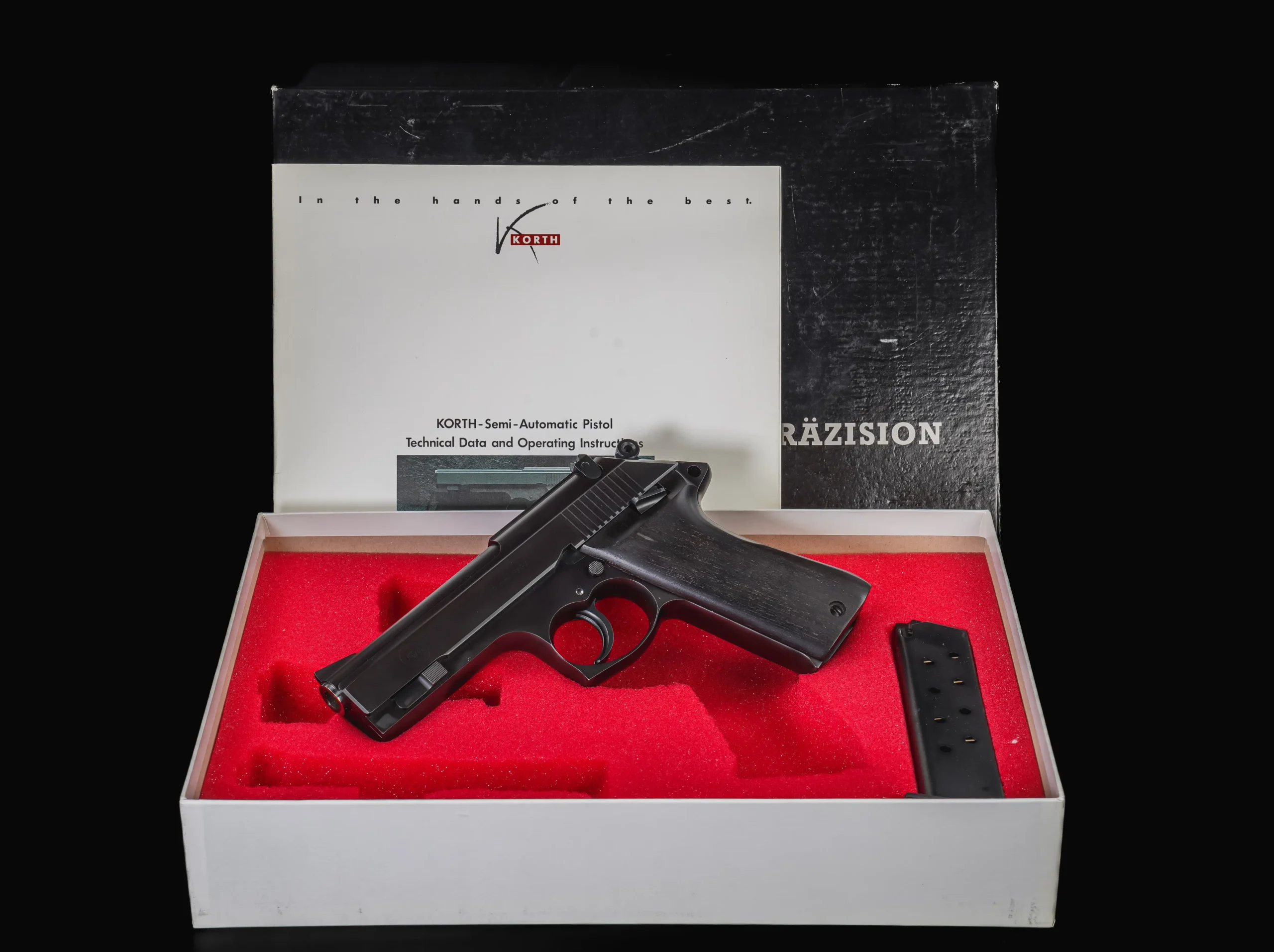 A Korth Semi-Automatic 9mm First Run Edition finished in Black Plasma. This early production example includes its factory case, original documentation, operating materials, and accompanying magazine.