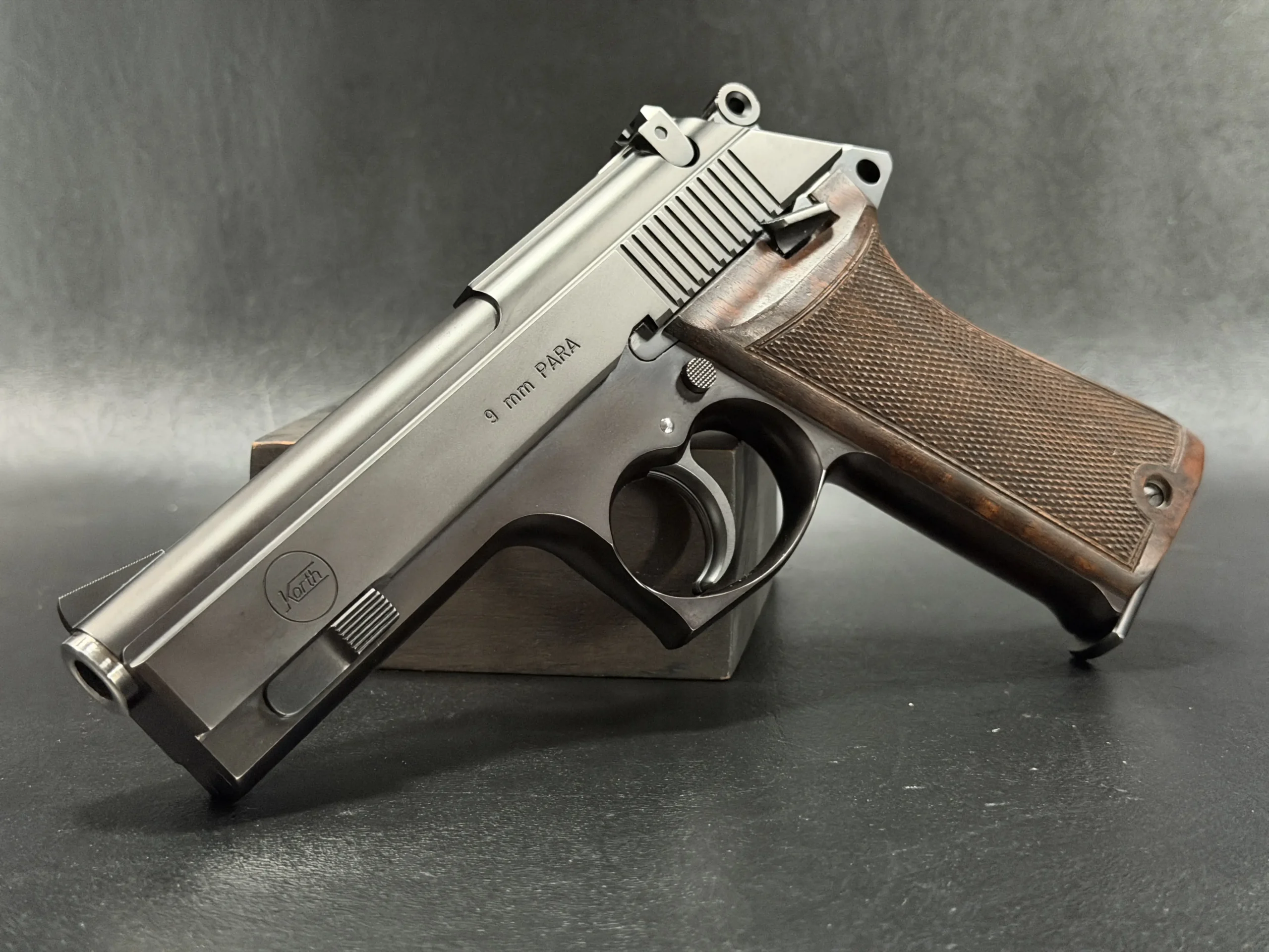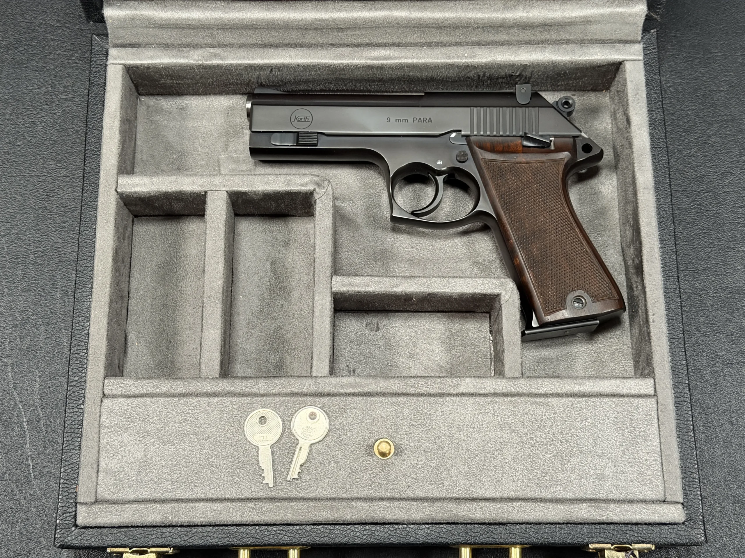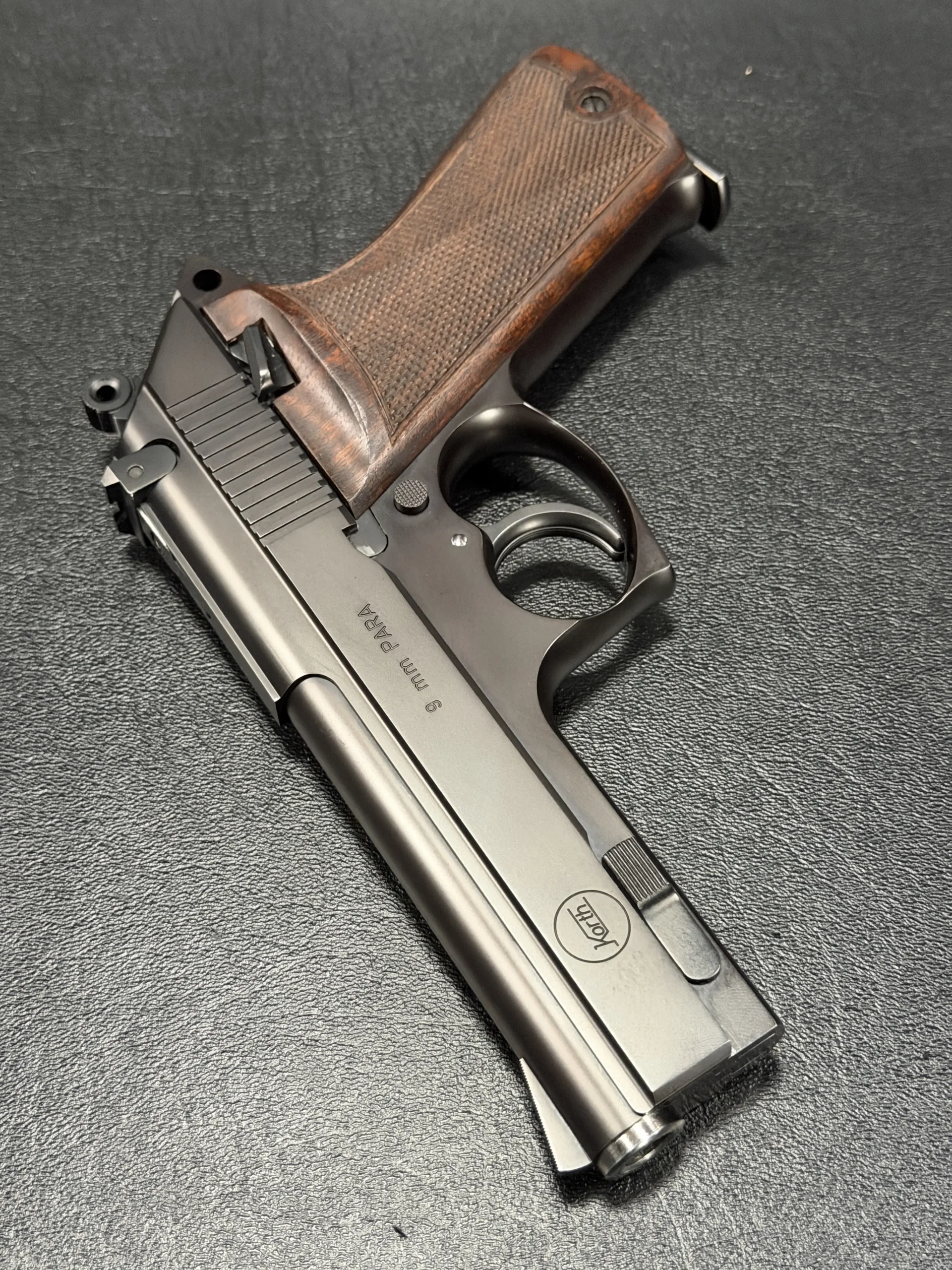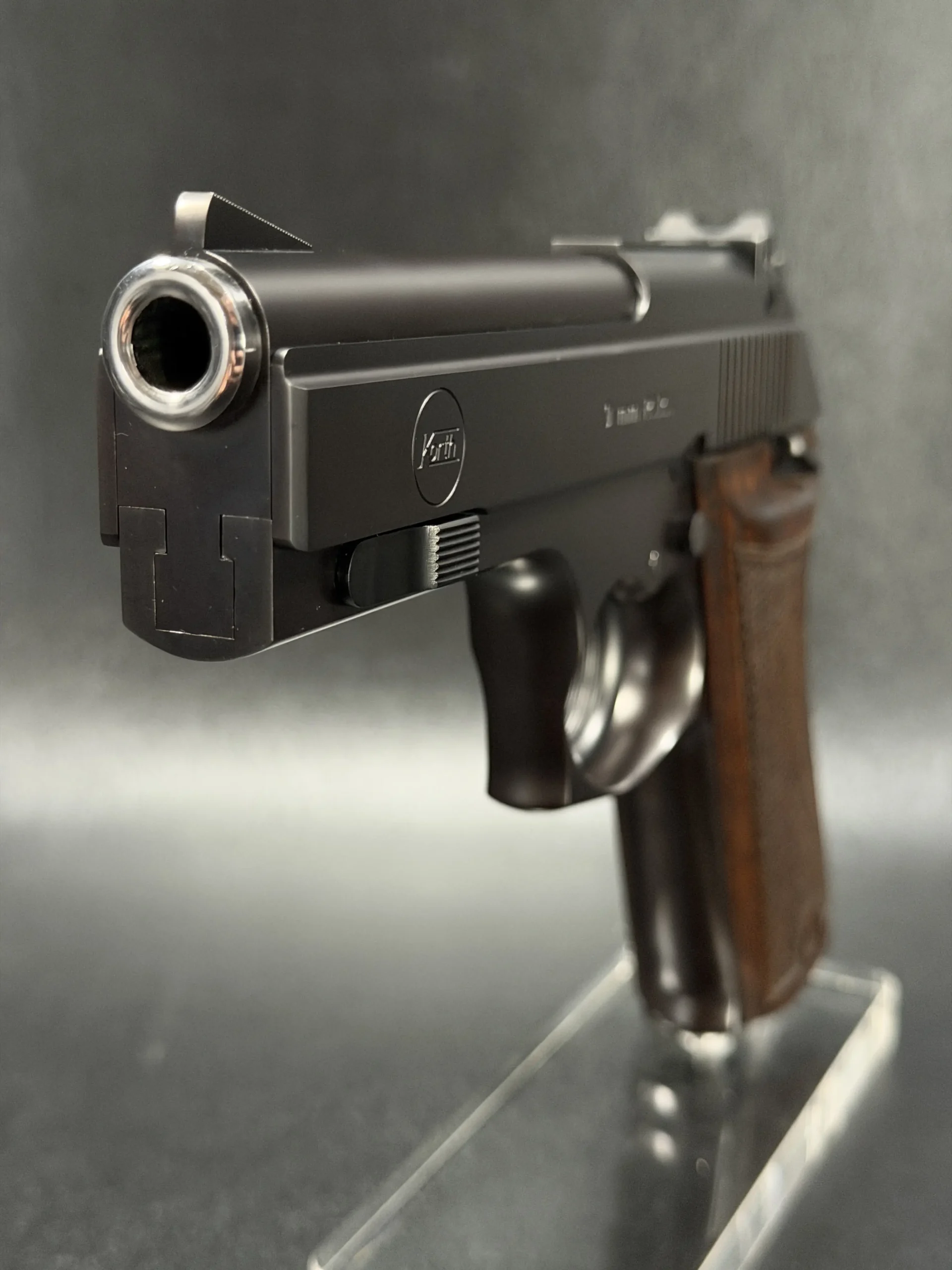 Korth’s early semi-automatic pistols are known for their precise, understated design, and this 9mm example reflects that character beautifully. The pistol features a two-tone finish with a matte blued frame and satin-finished slide, paired with finely checkered walnut grips that add warmth and contrast to the overall presentation.