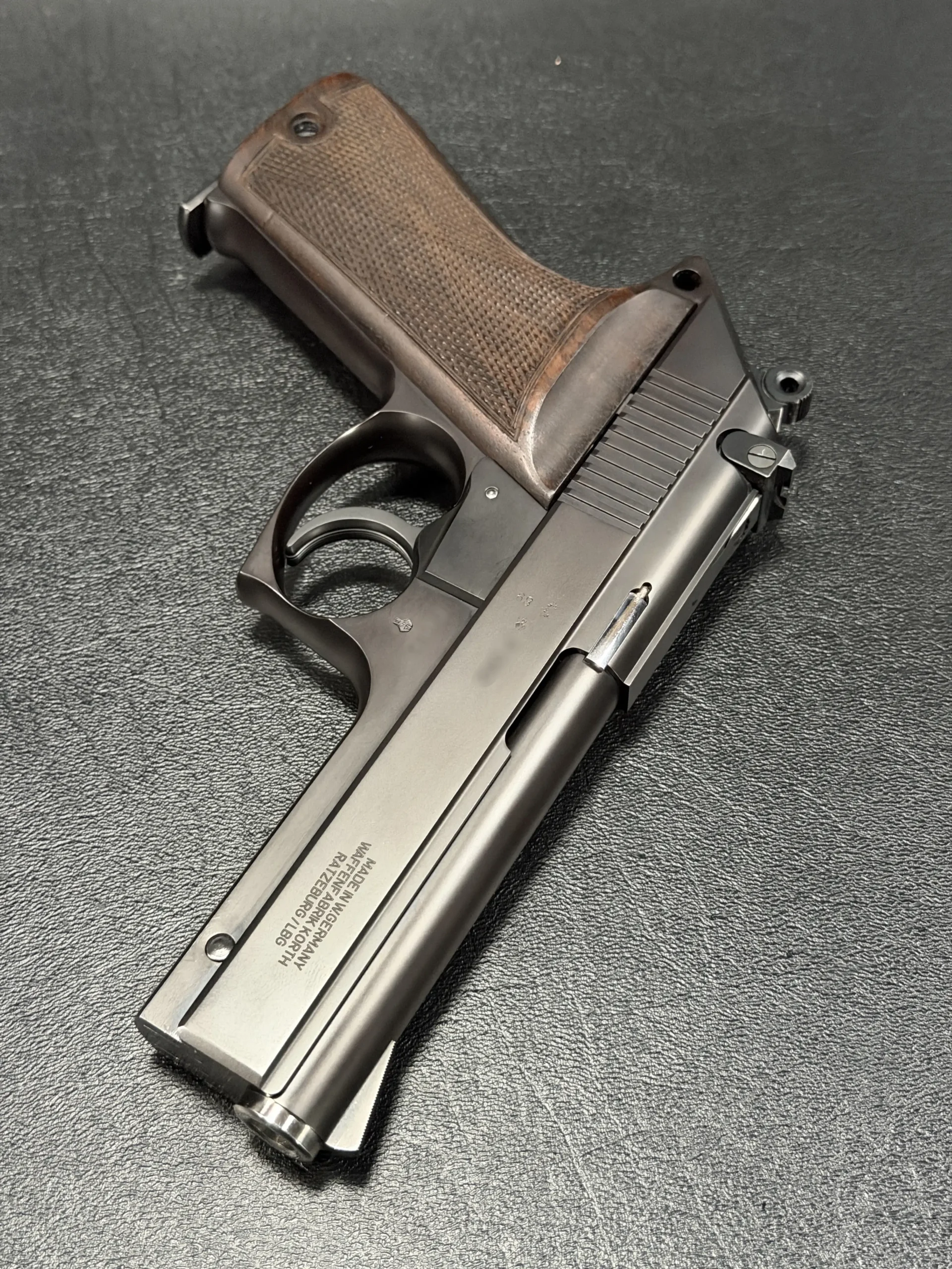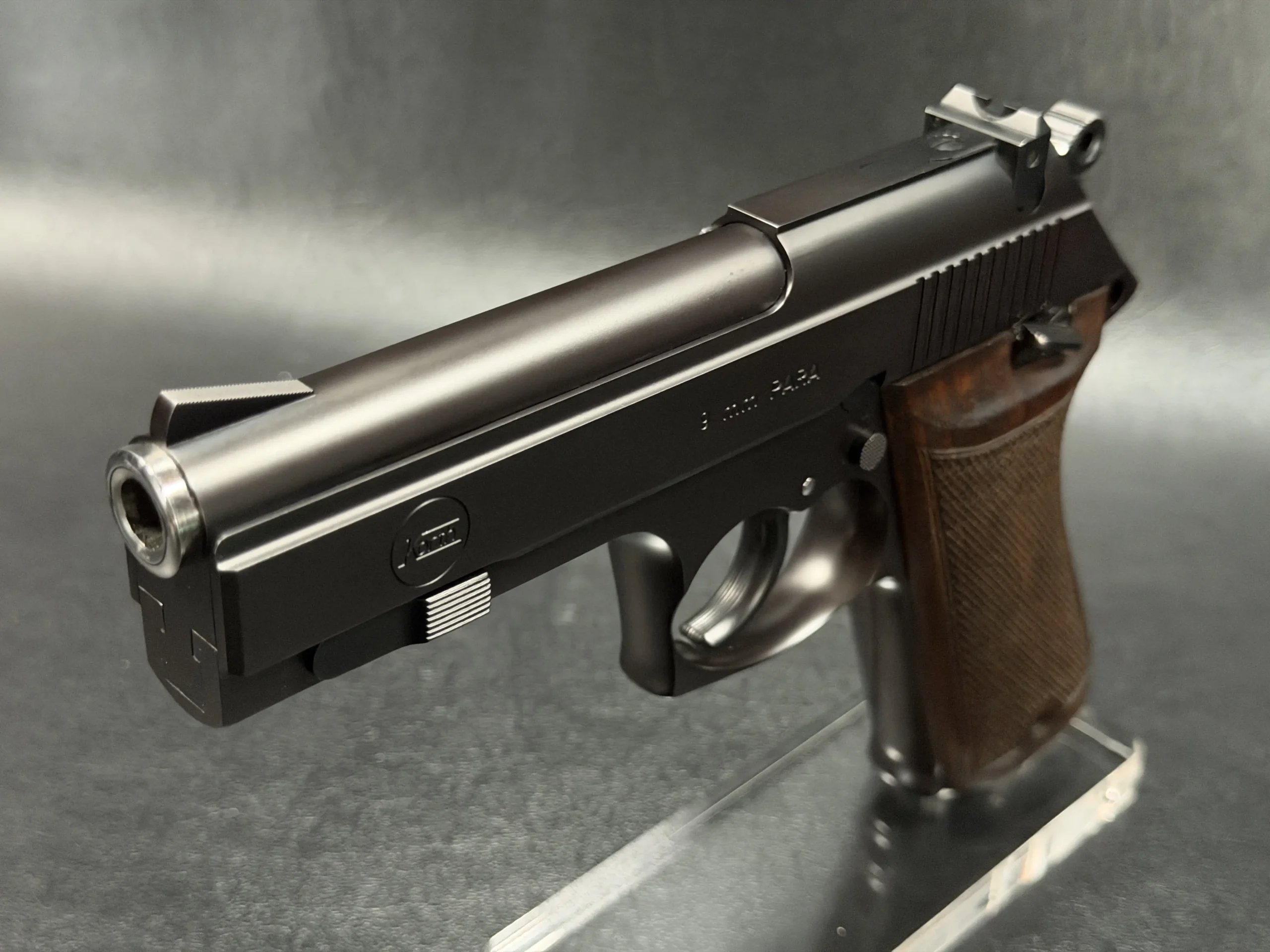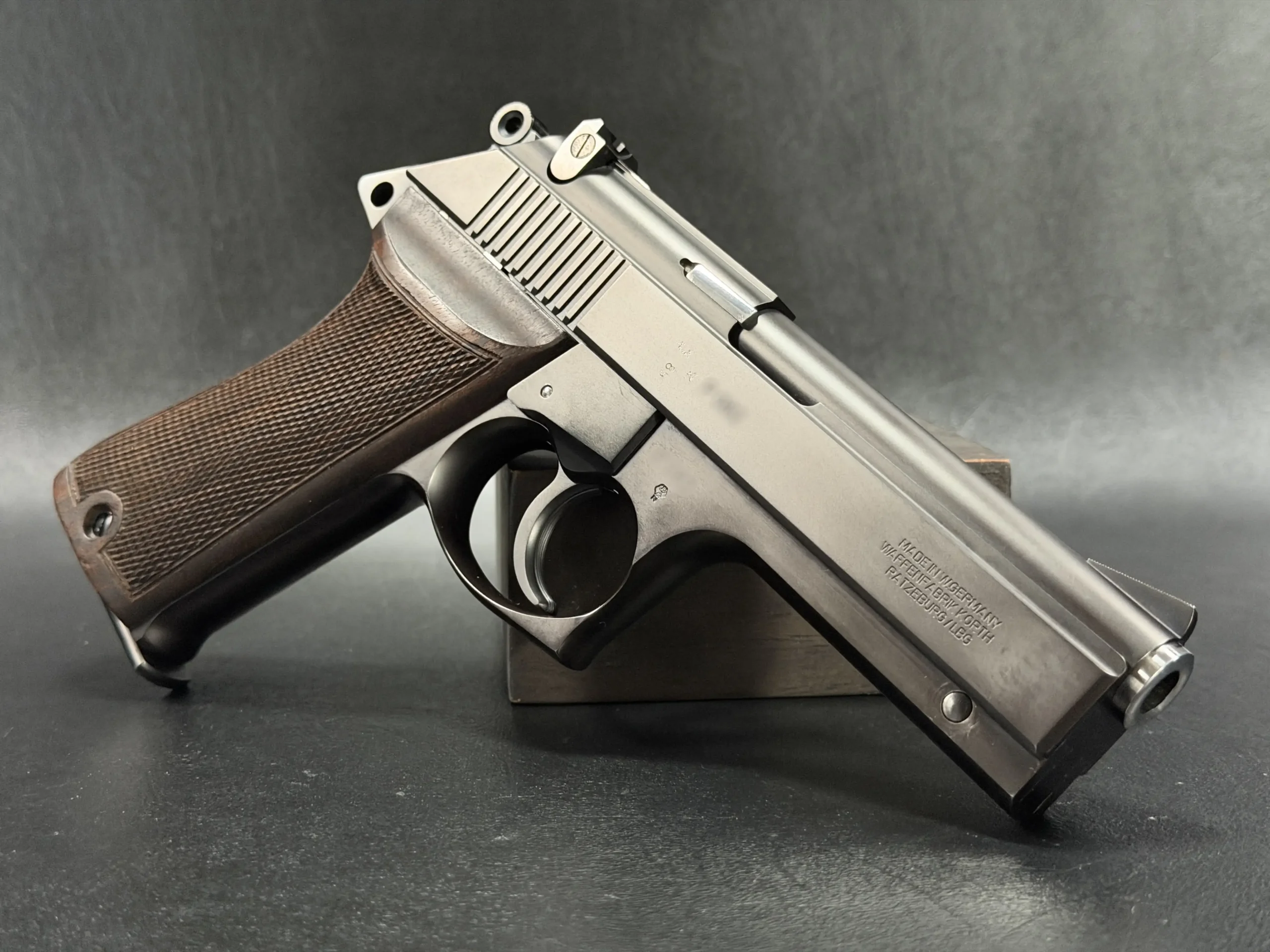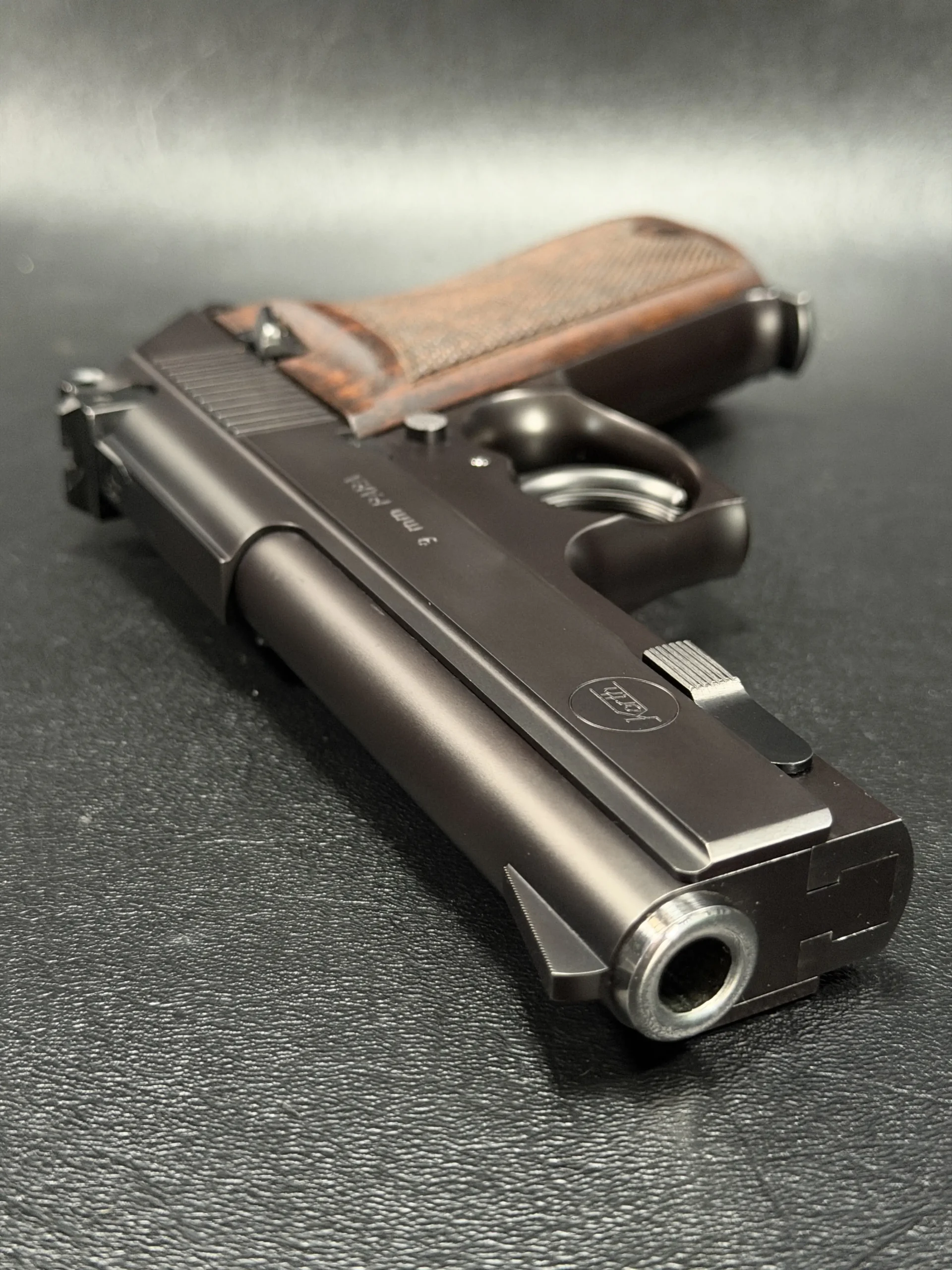 Korth’s early semi-automatic pistols are known for their precise, understated design, and this 9mm example reflects that character beautifully. The pistol features a two-tone finish with a matte blued frame and satin-finished slide, paired with finely checkered walnut grips that add warmth and contrast to the overall presentation.