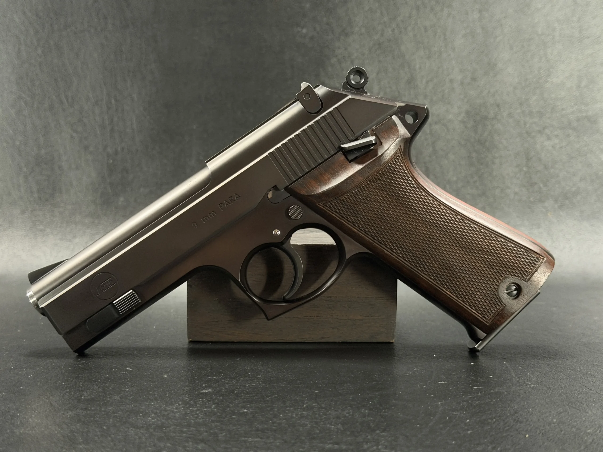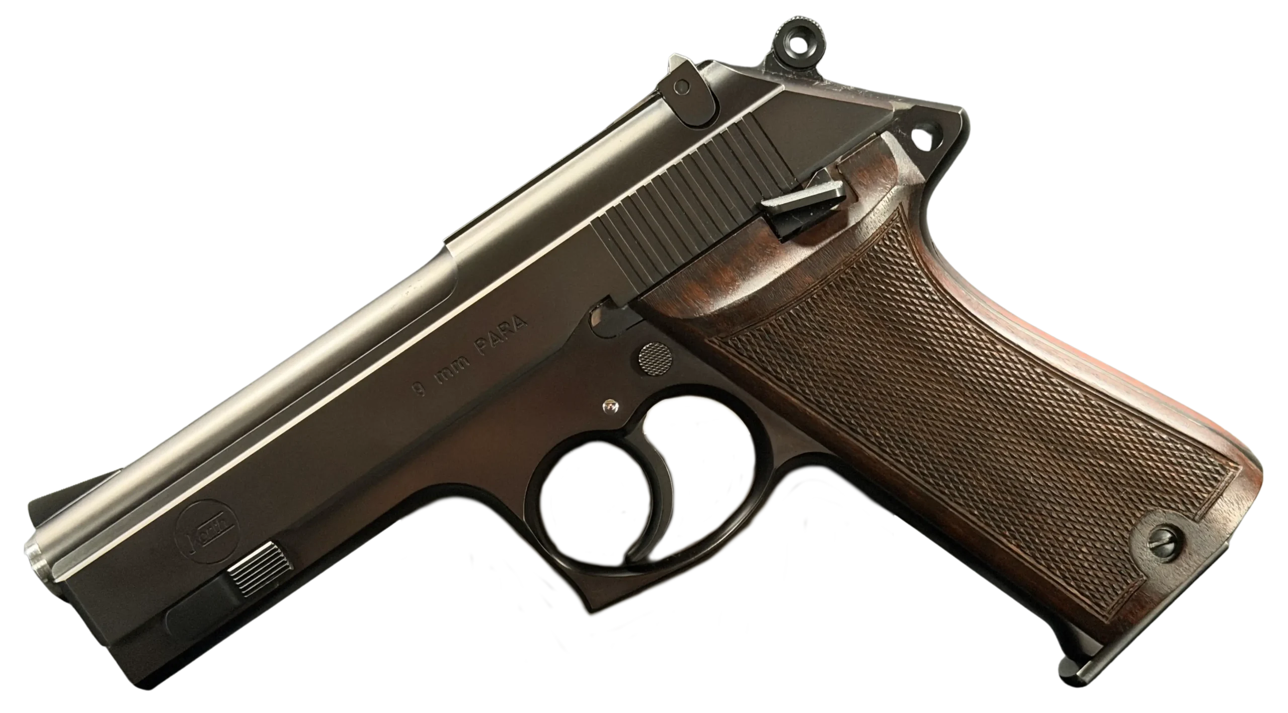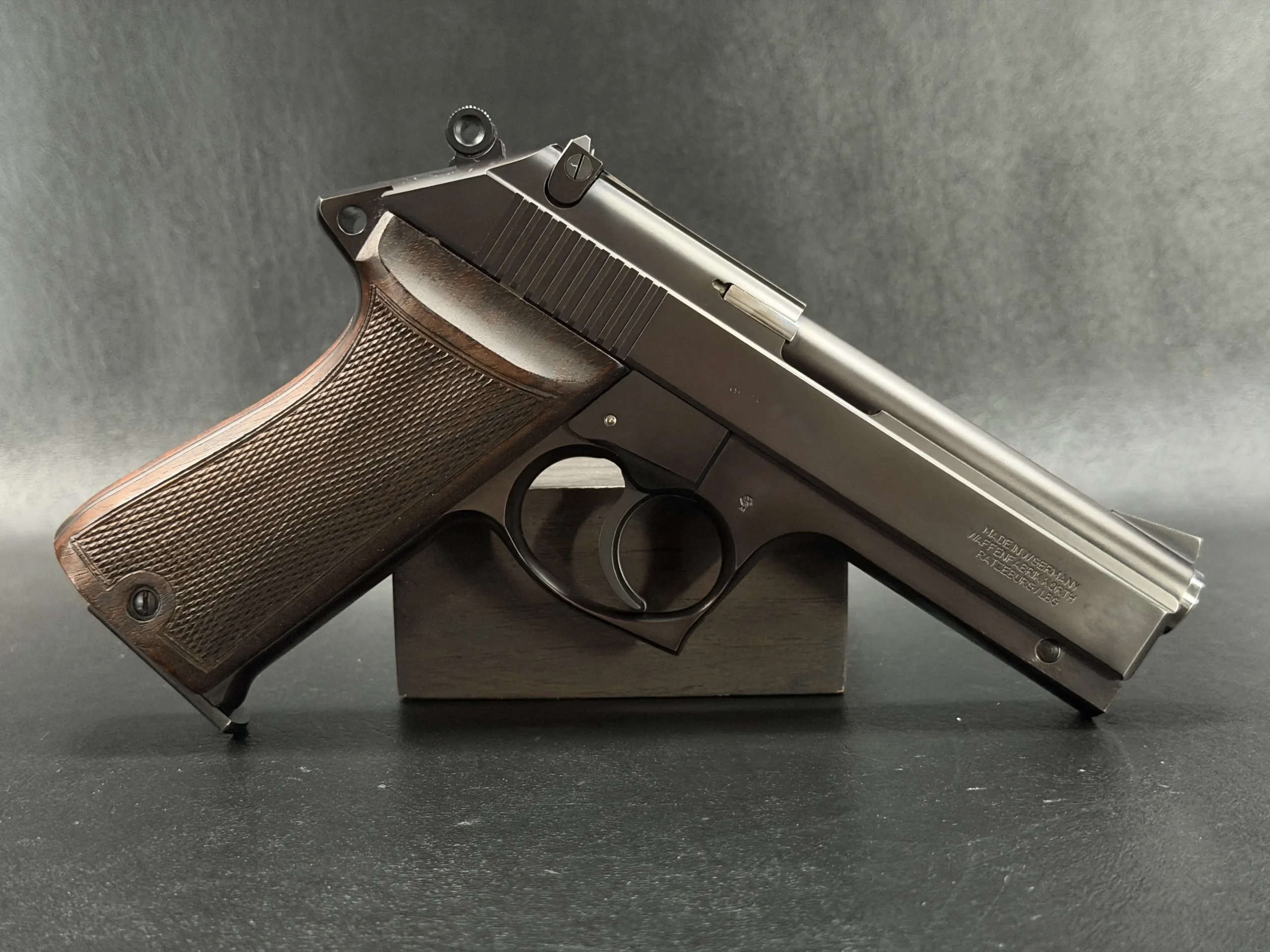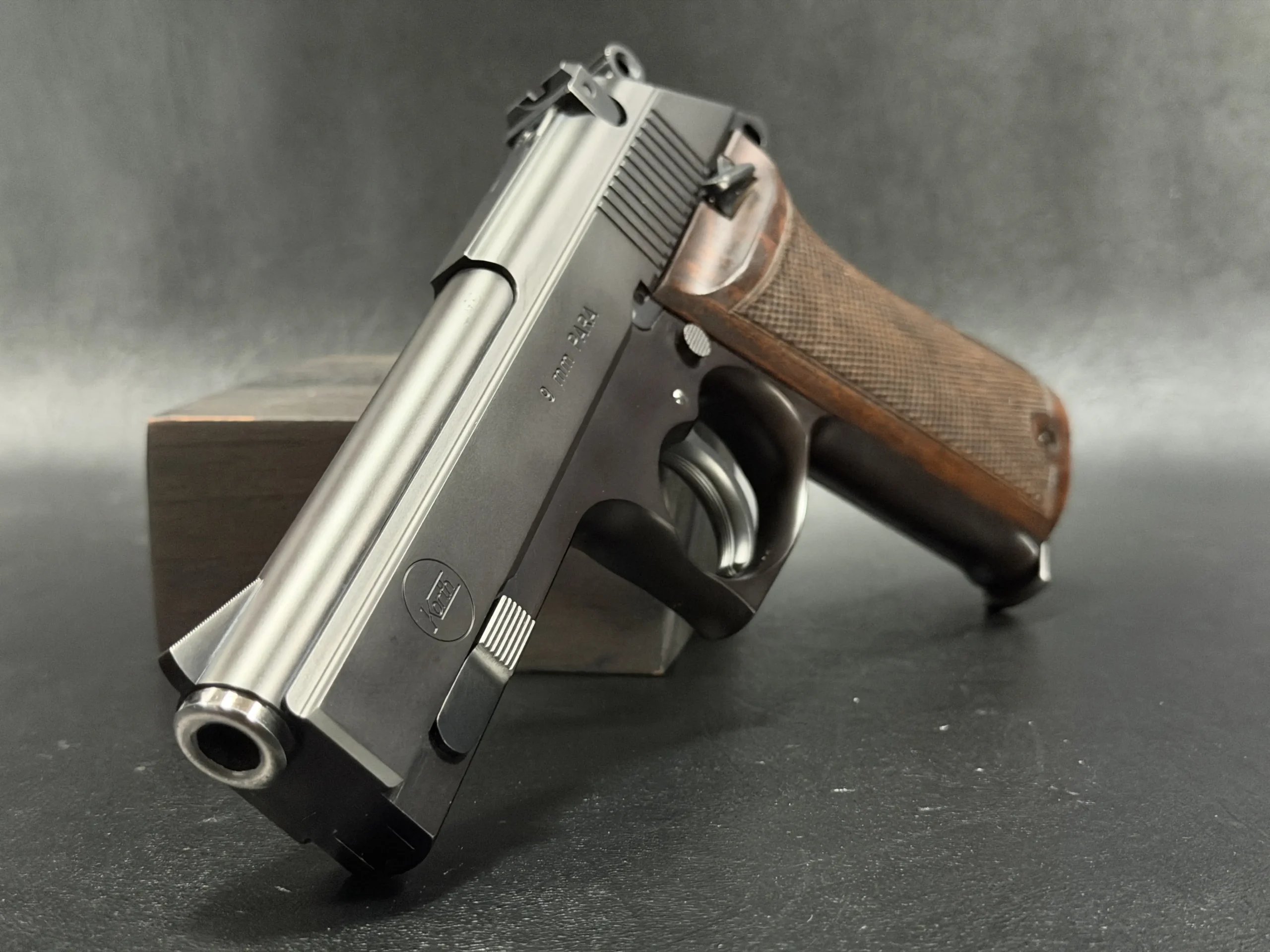 Korth’s early semi-automatic pistols are known for their precise, understated design, and this 9mm example reflects that character beautifully. The pistol features a two-tone finish with a matte blued frame and satin-finished slide, paired with finely checkered walnut grips that add warmth and contrast to the overall presentation.