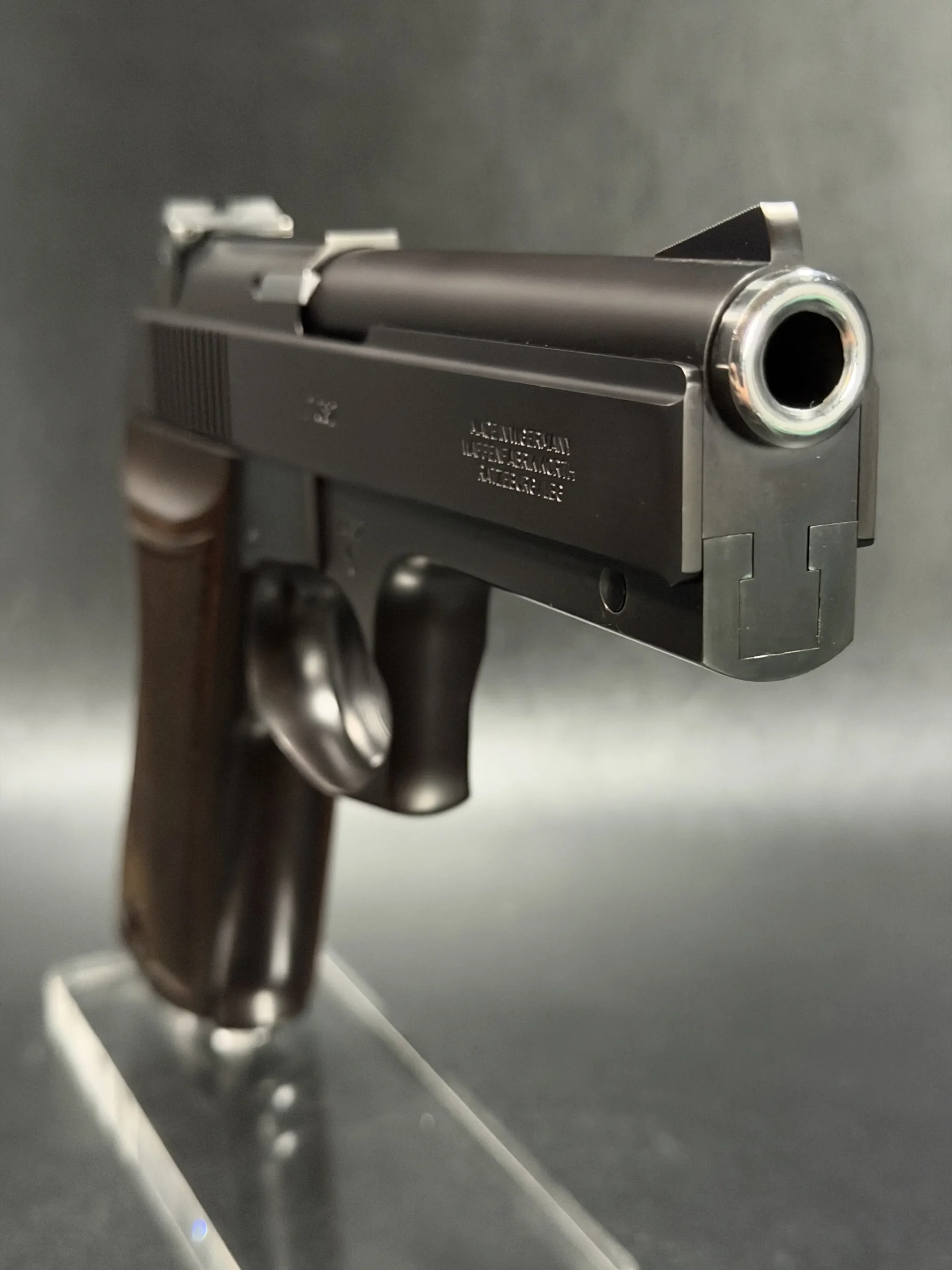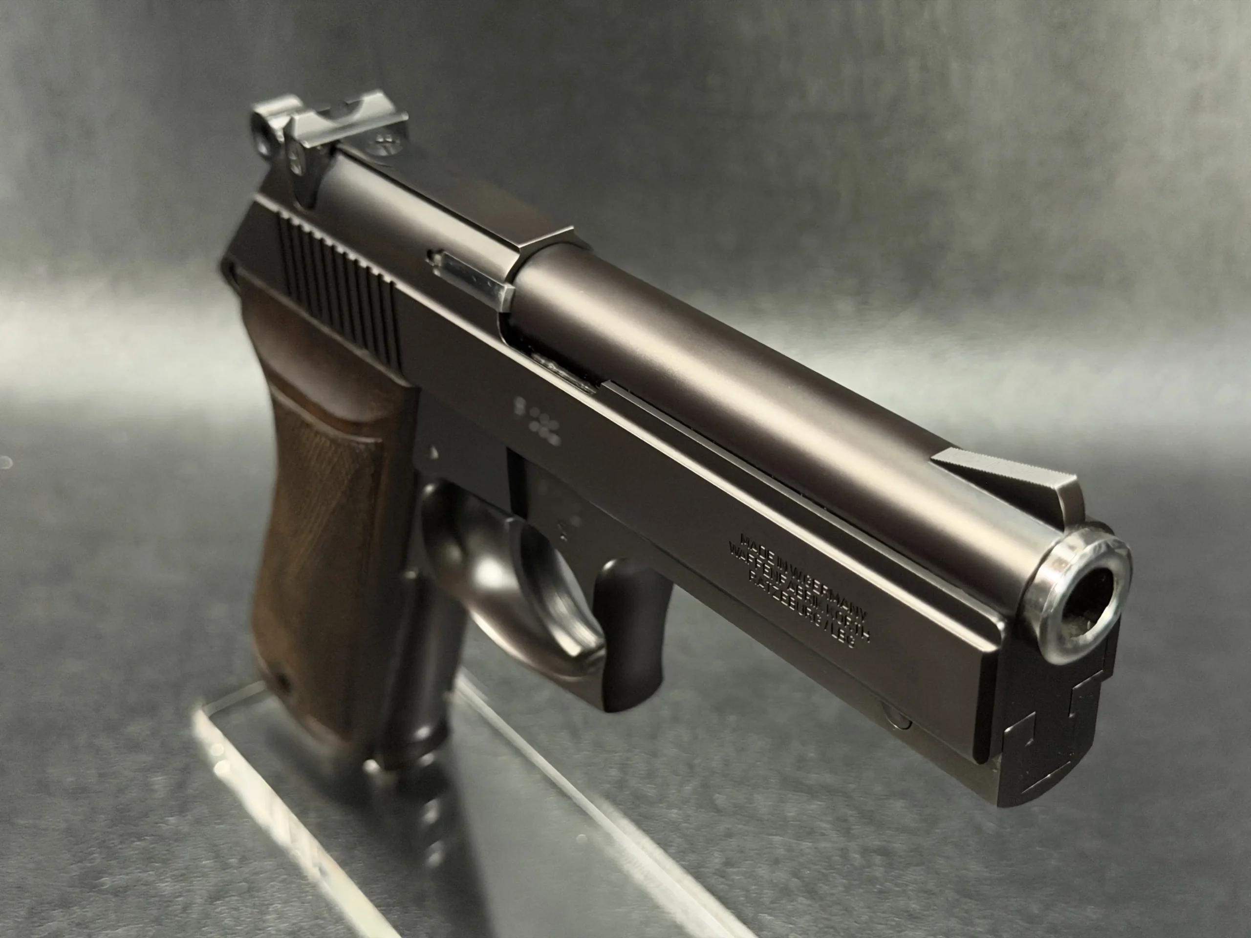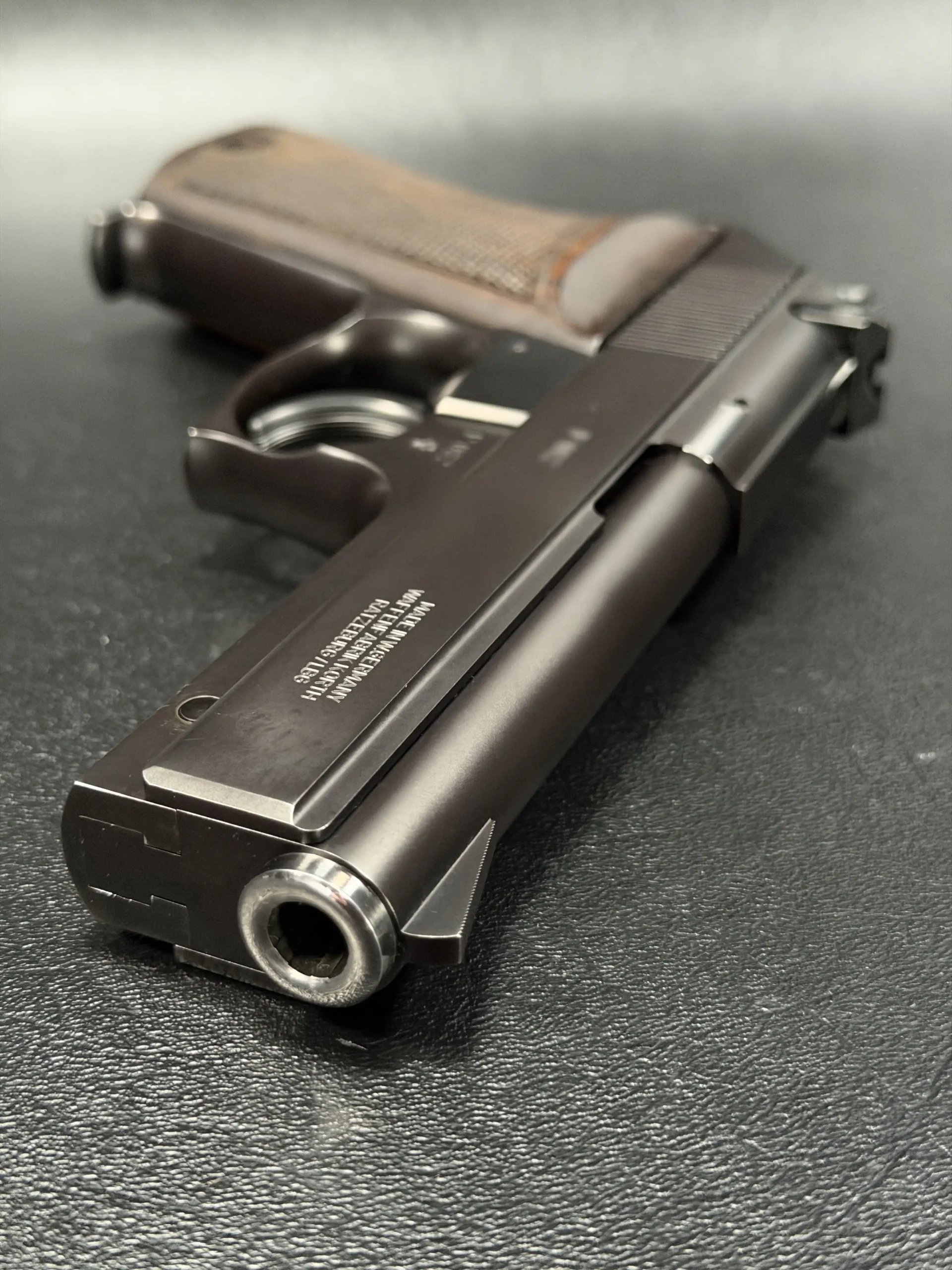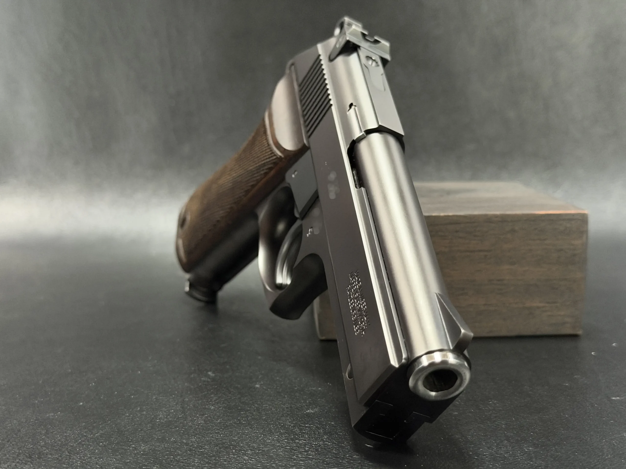 Korth’s early semi-automatic pistols are known for their precise, understated design, and this 9mm example reflects that character beautifully. The pistol features a two-tone finish with a matte blued frame and satin-finished slide, paired with finely checkered walnut grips that add warmth and contrast to the overall presentation.