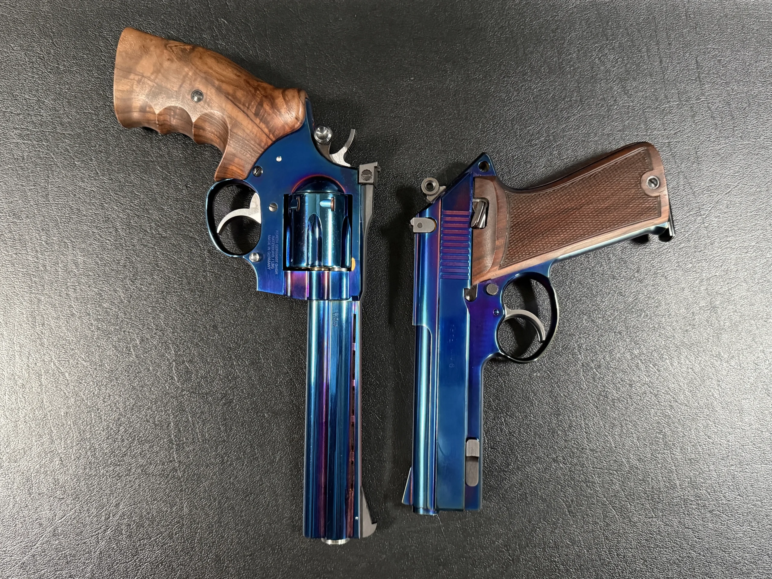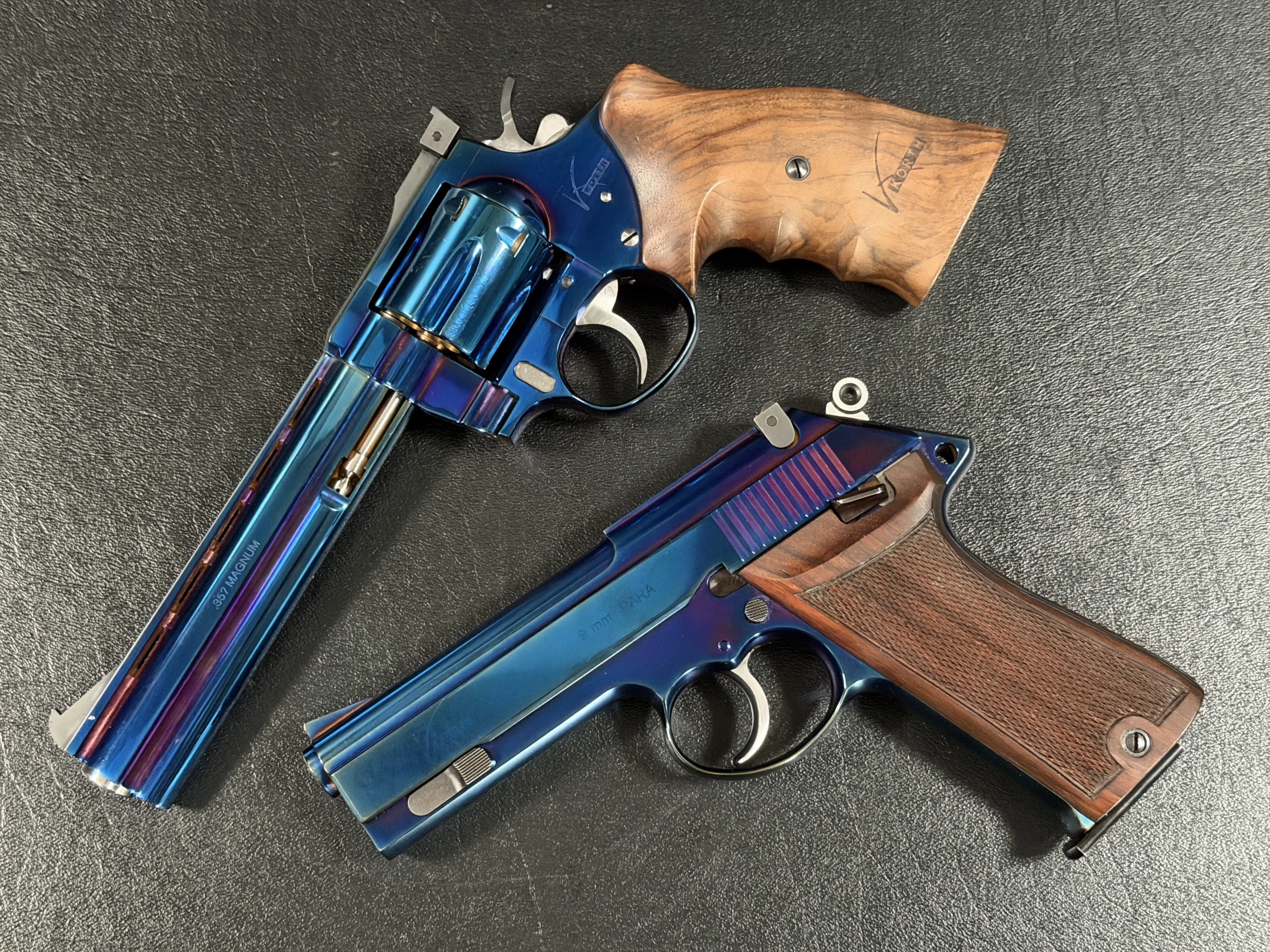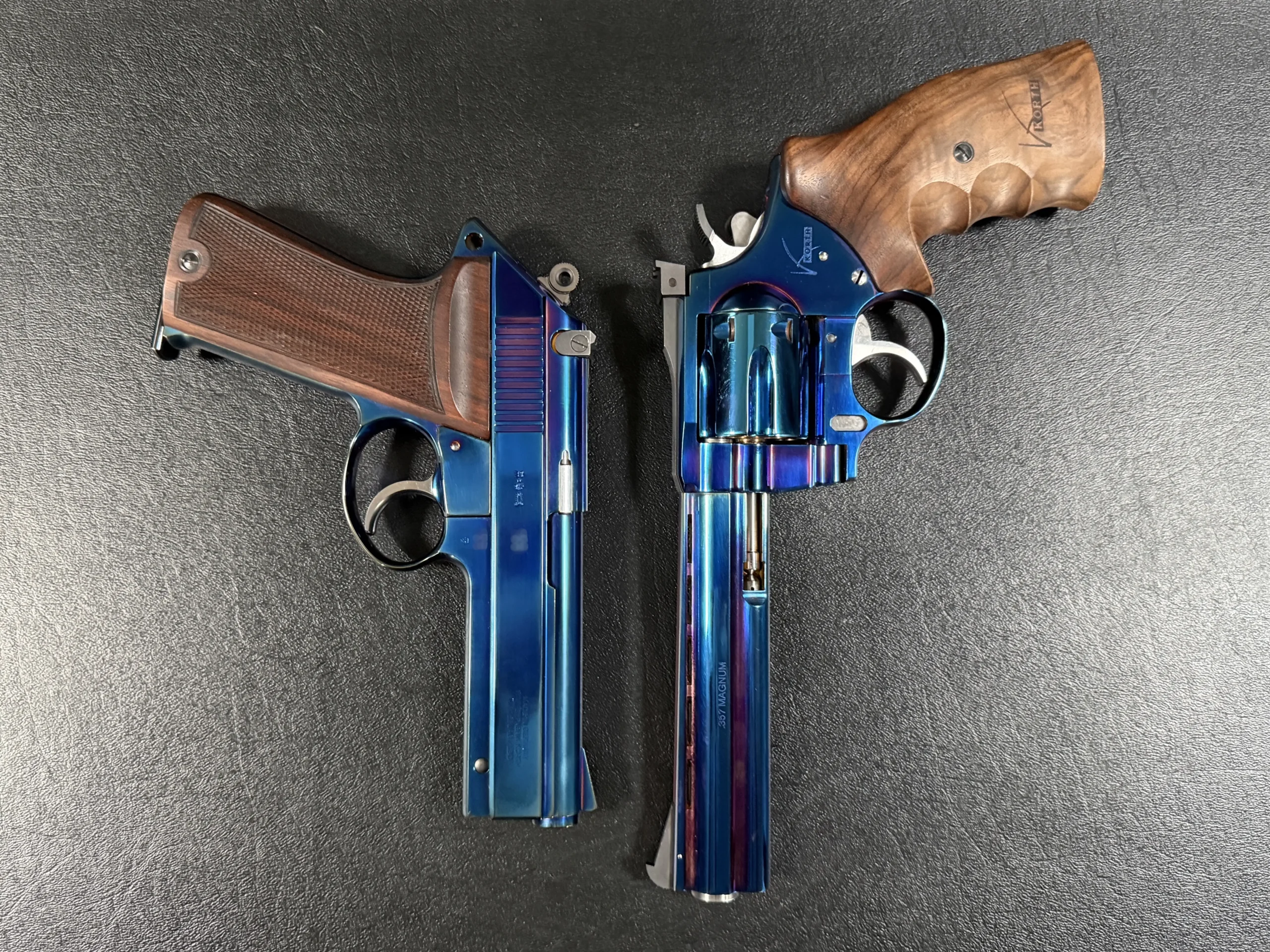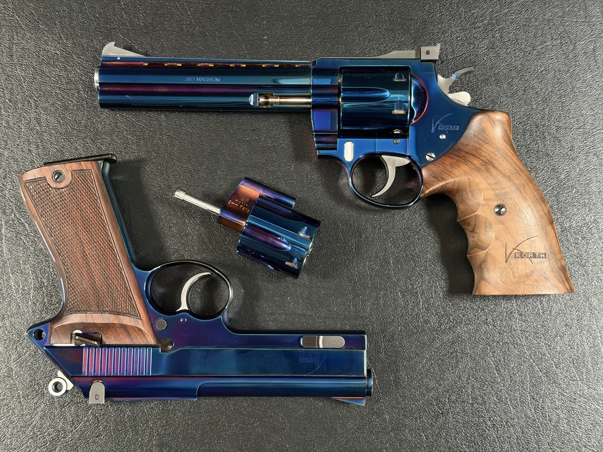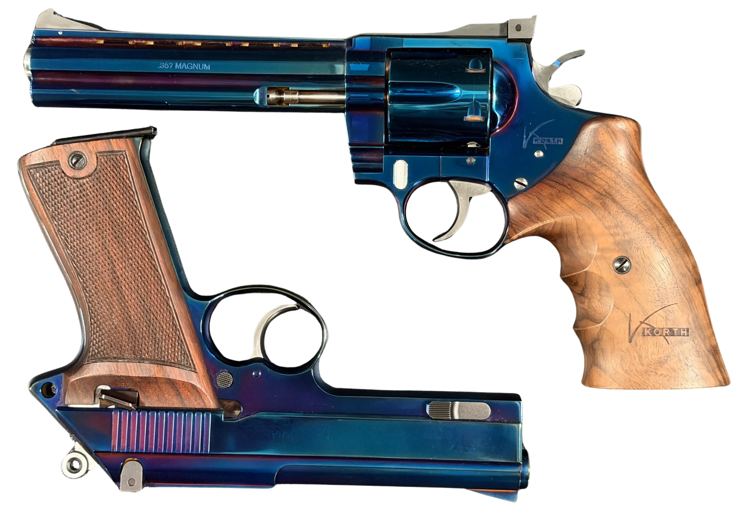 This matched Korth set pairs a 9mm semi-automatic pistol with a .357 Magnum revolver, both finished in Korth’s Blue Plasma treatment. The finish presents a deep, color-shifting appearance with tones of sapphire, violet, and steel, giving the two firearms a cohesive and highly distinctive look.