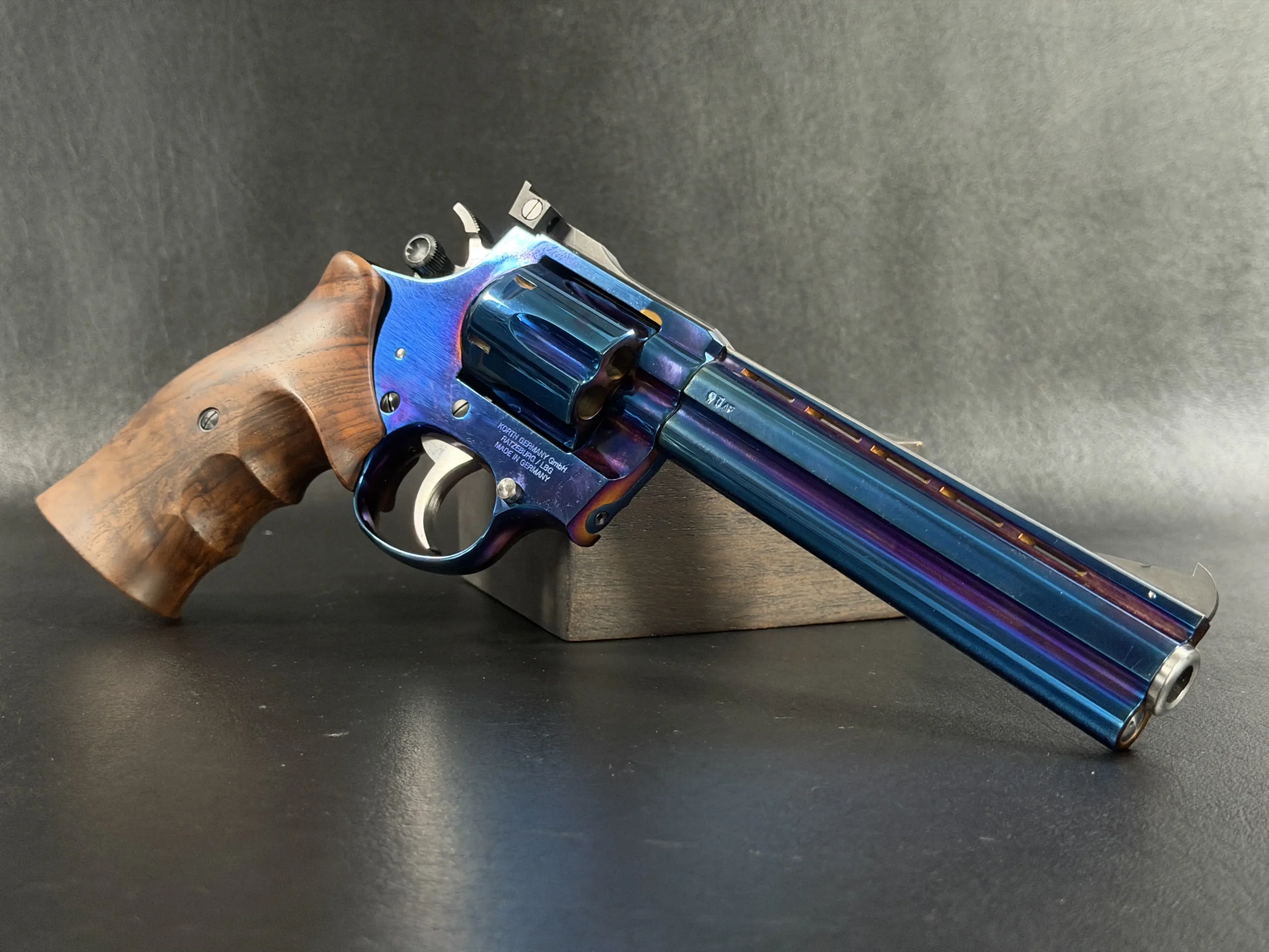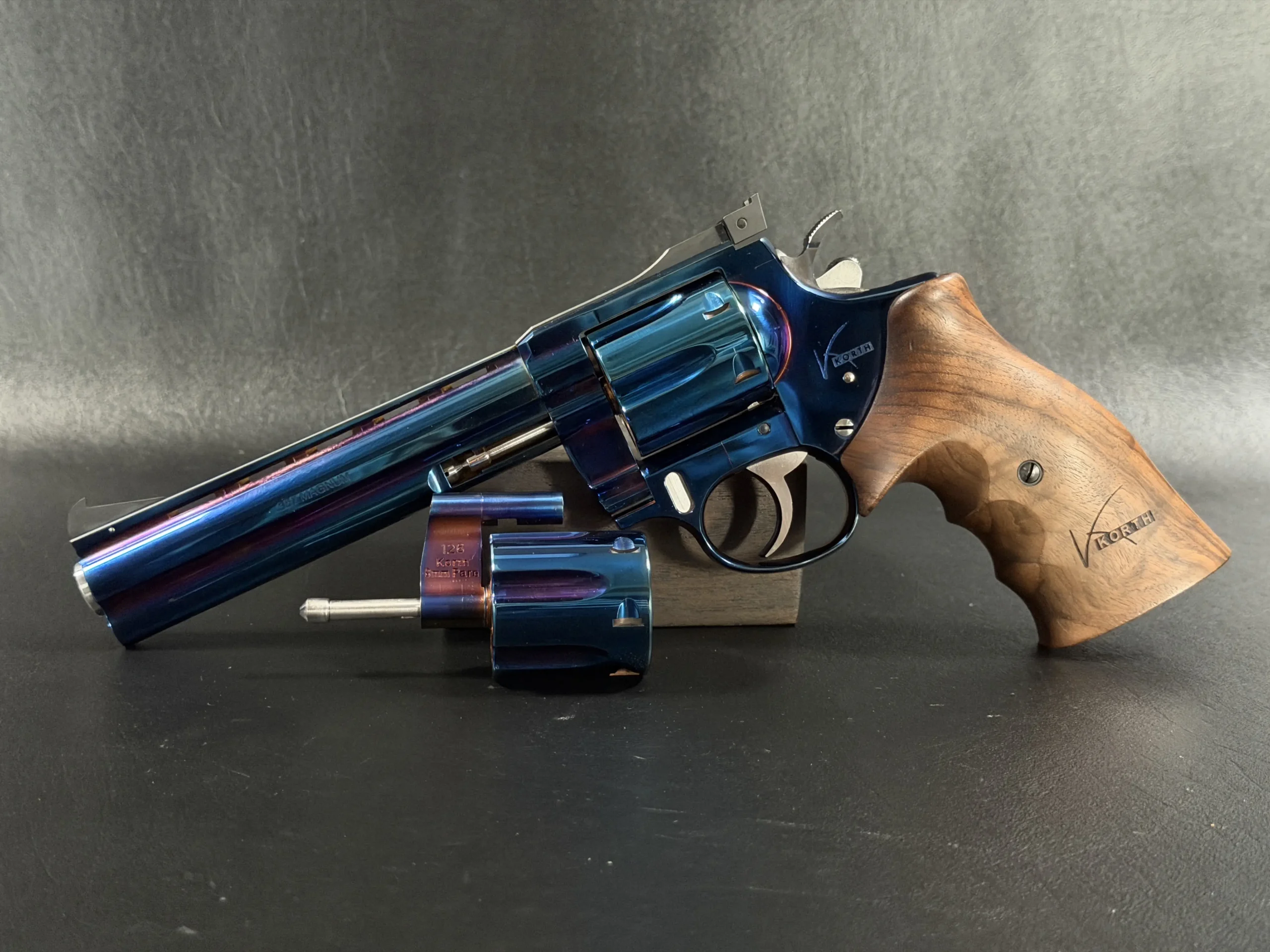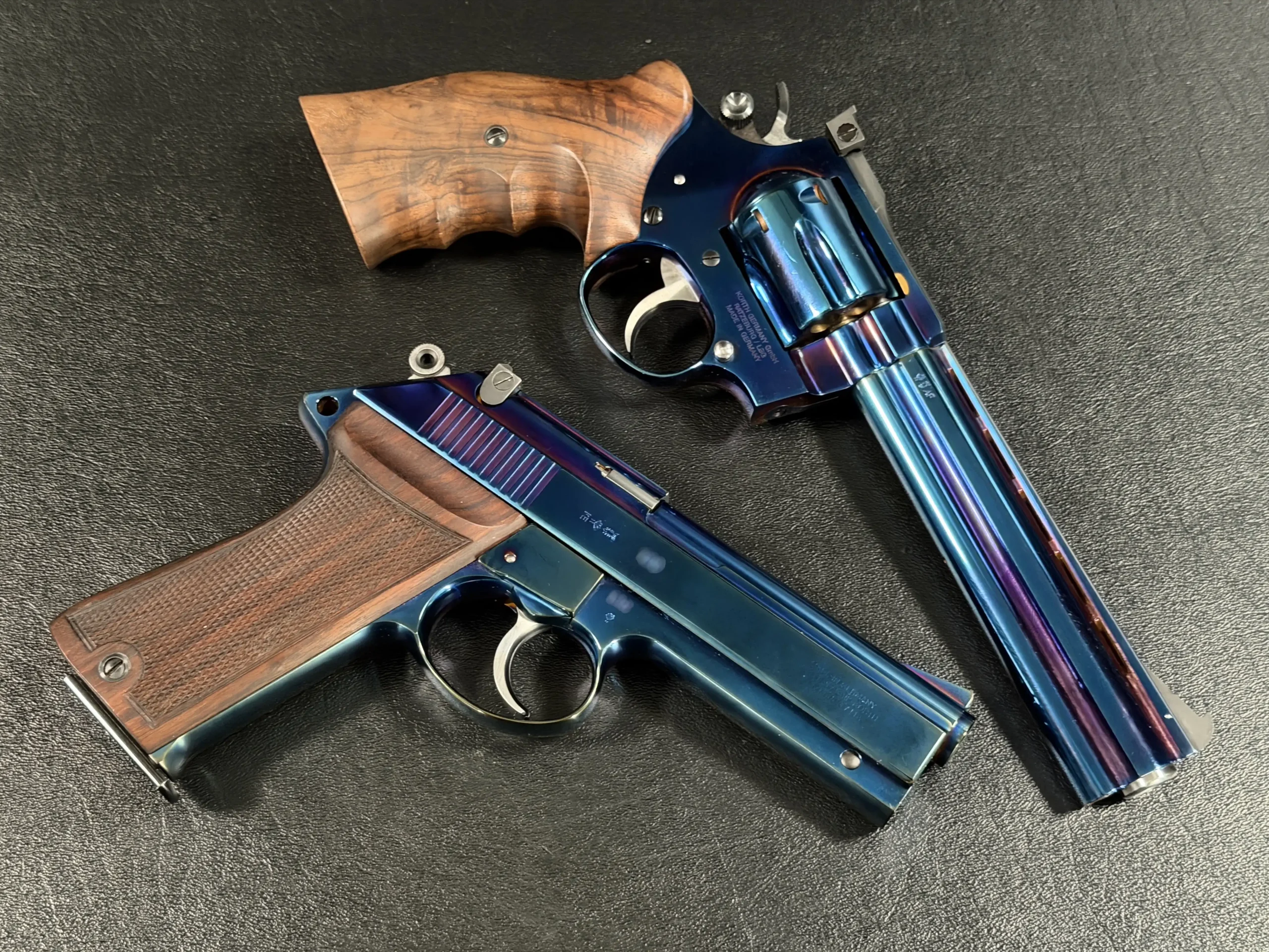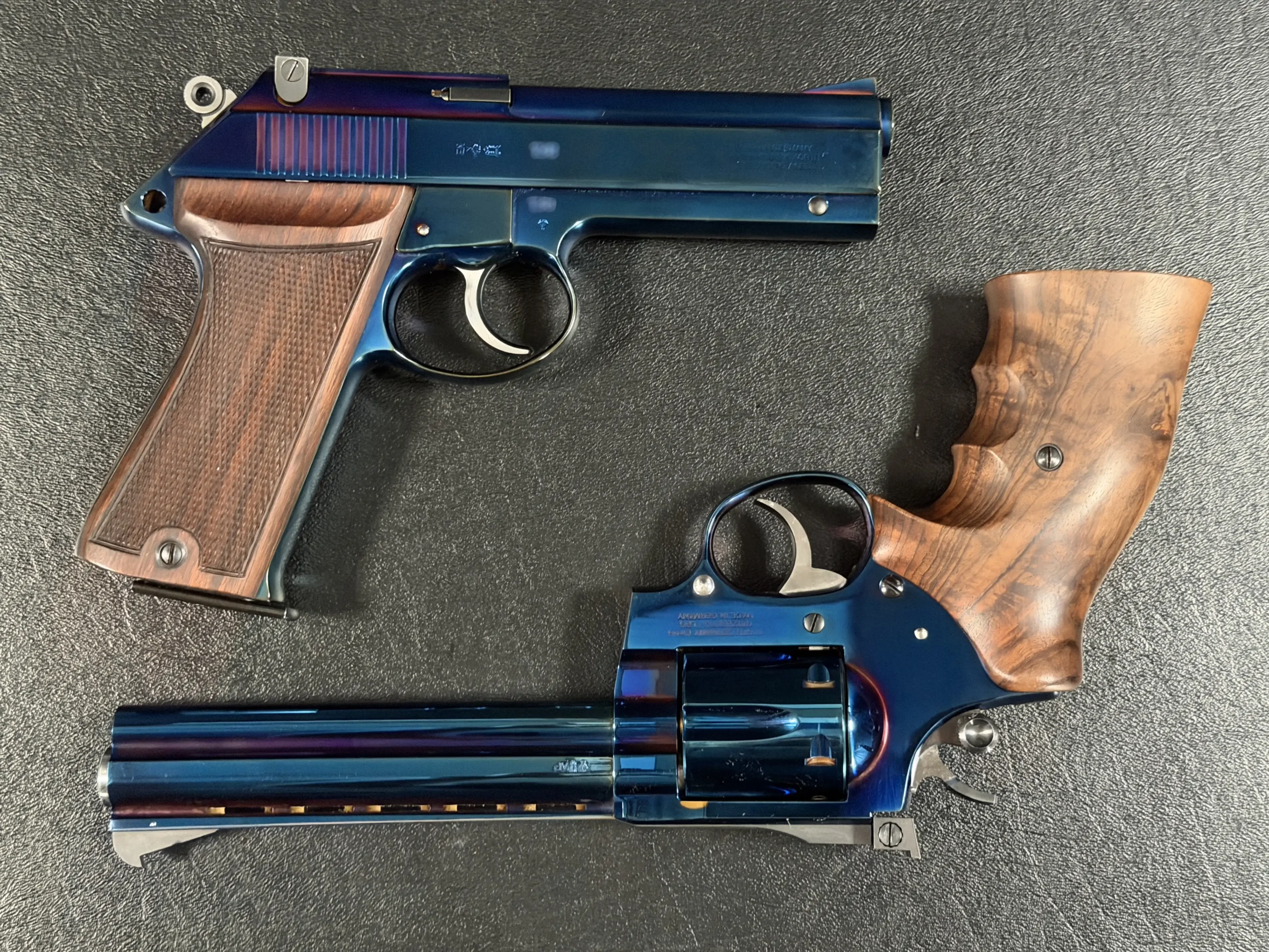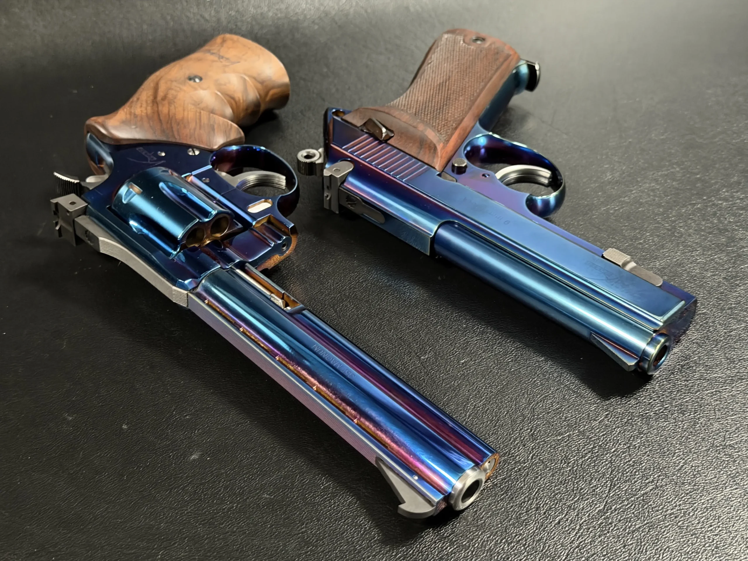 This matched Korth set pairs a 9mm semi-automatic pistol with a .357 Magnum revolver, both finished in Korth’s Blue Plasma treatment. The finish presents a deep, color-shifting appearance with tones of sapphire, violet, and steel, giving the two firearms a cohesive and highly distinctive look.