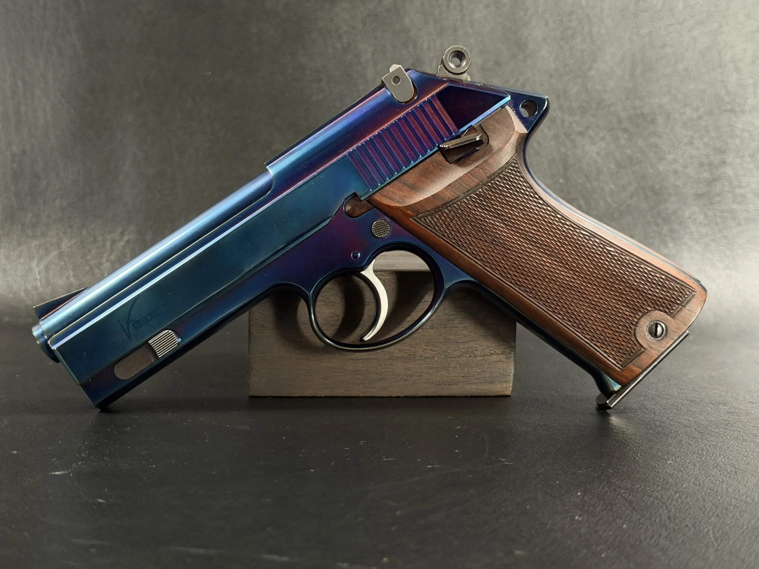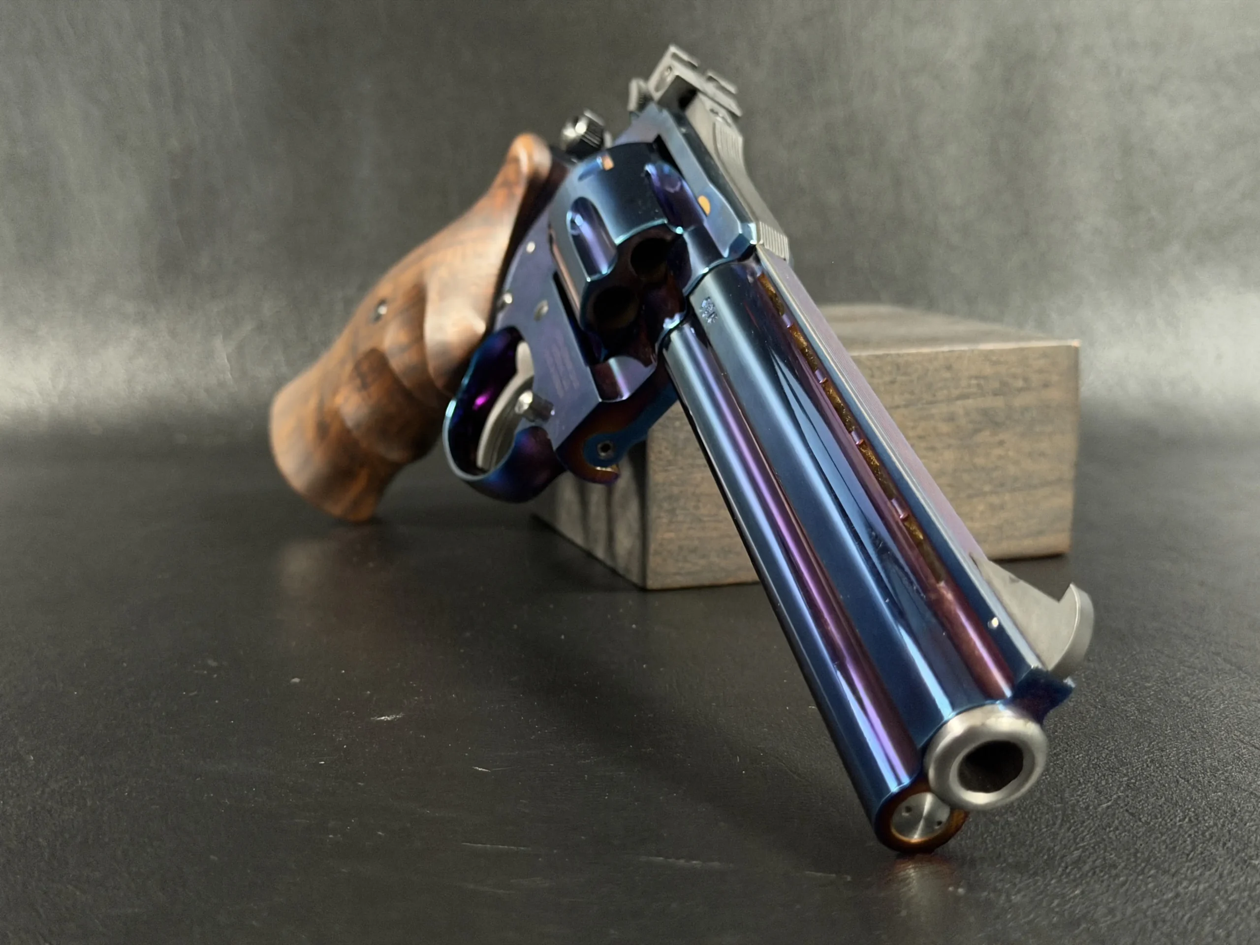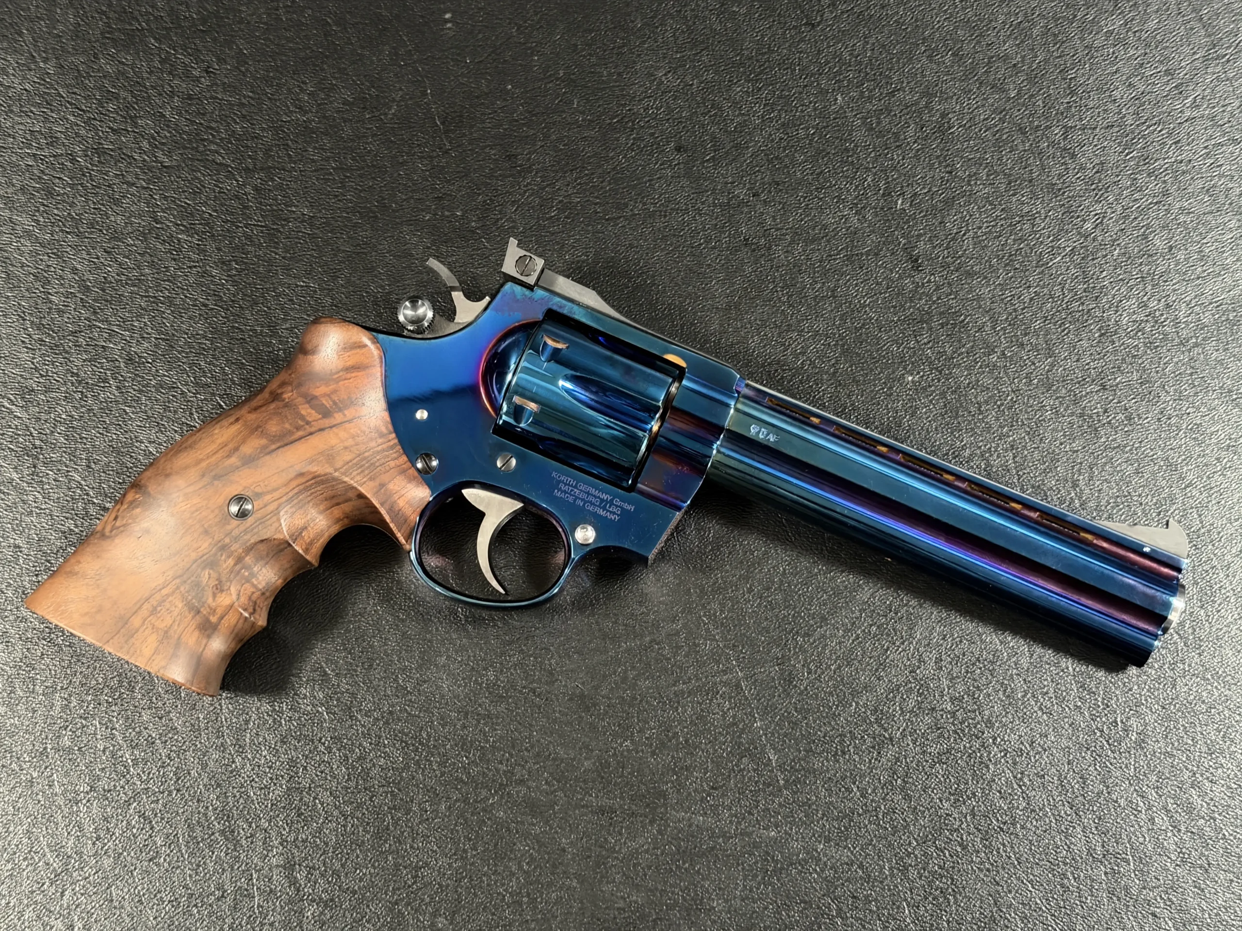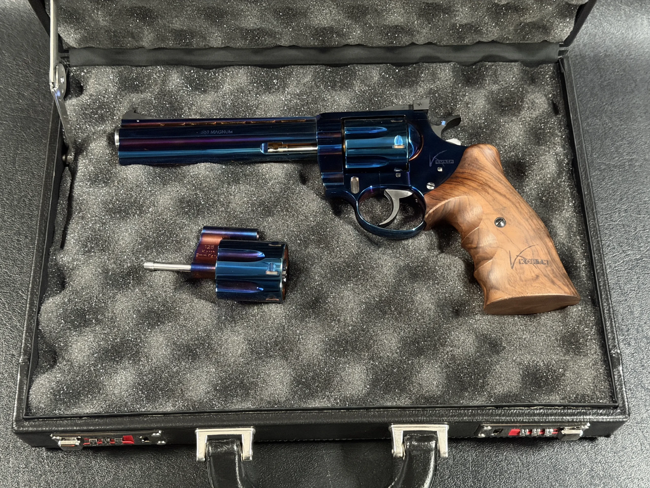 This matched Korth set pairs a 9mm semi-automatic pistol with a .357 Magnum revolver, both finished in Korth’s Blue Plasma treatment. The finish presents a deep, color-shifting appearance with tones of sapphire, violet, and steel, giving the two firearms a cohesive and highly distinctive look.