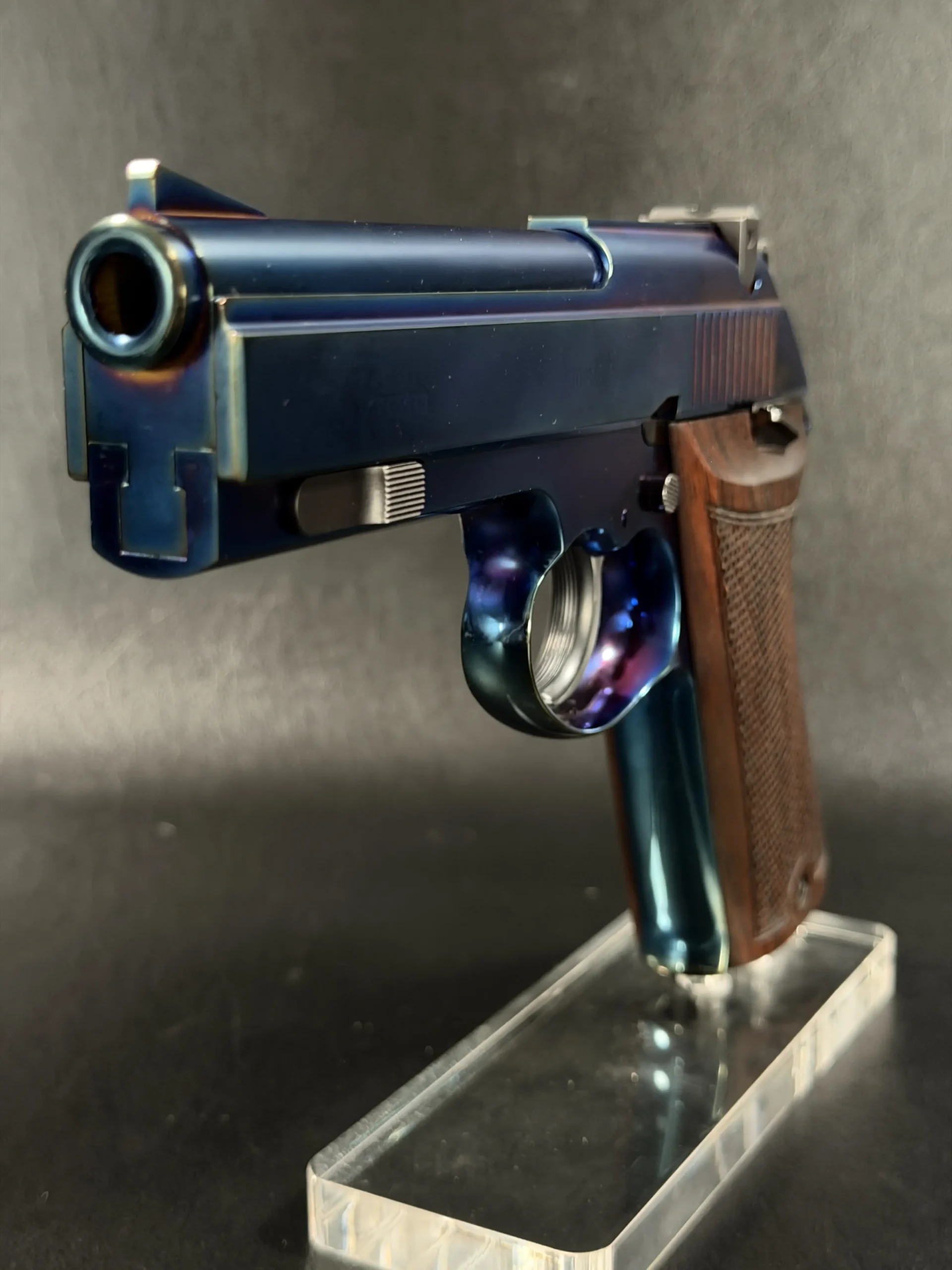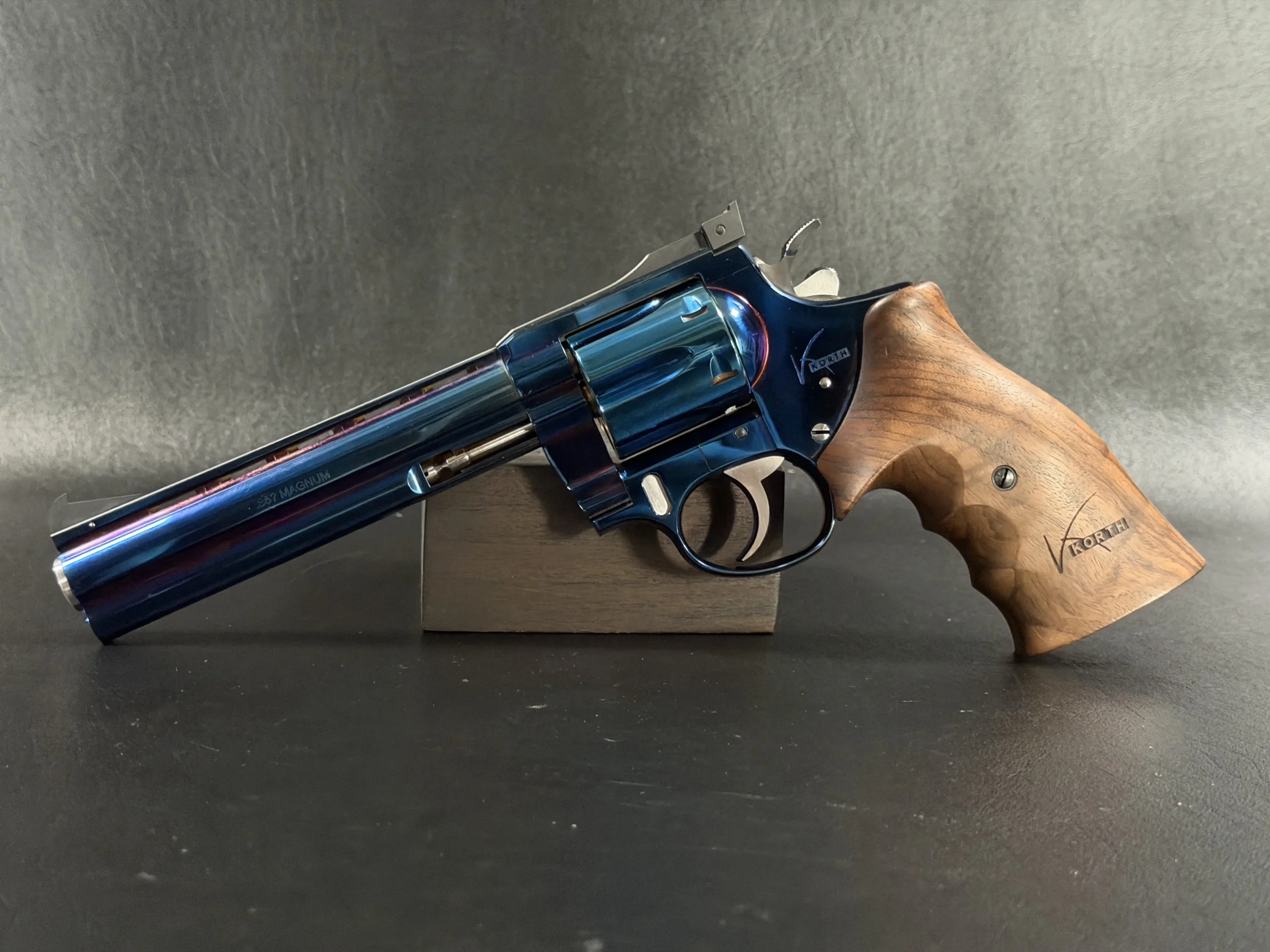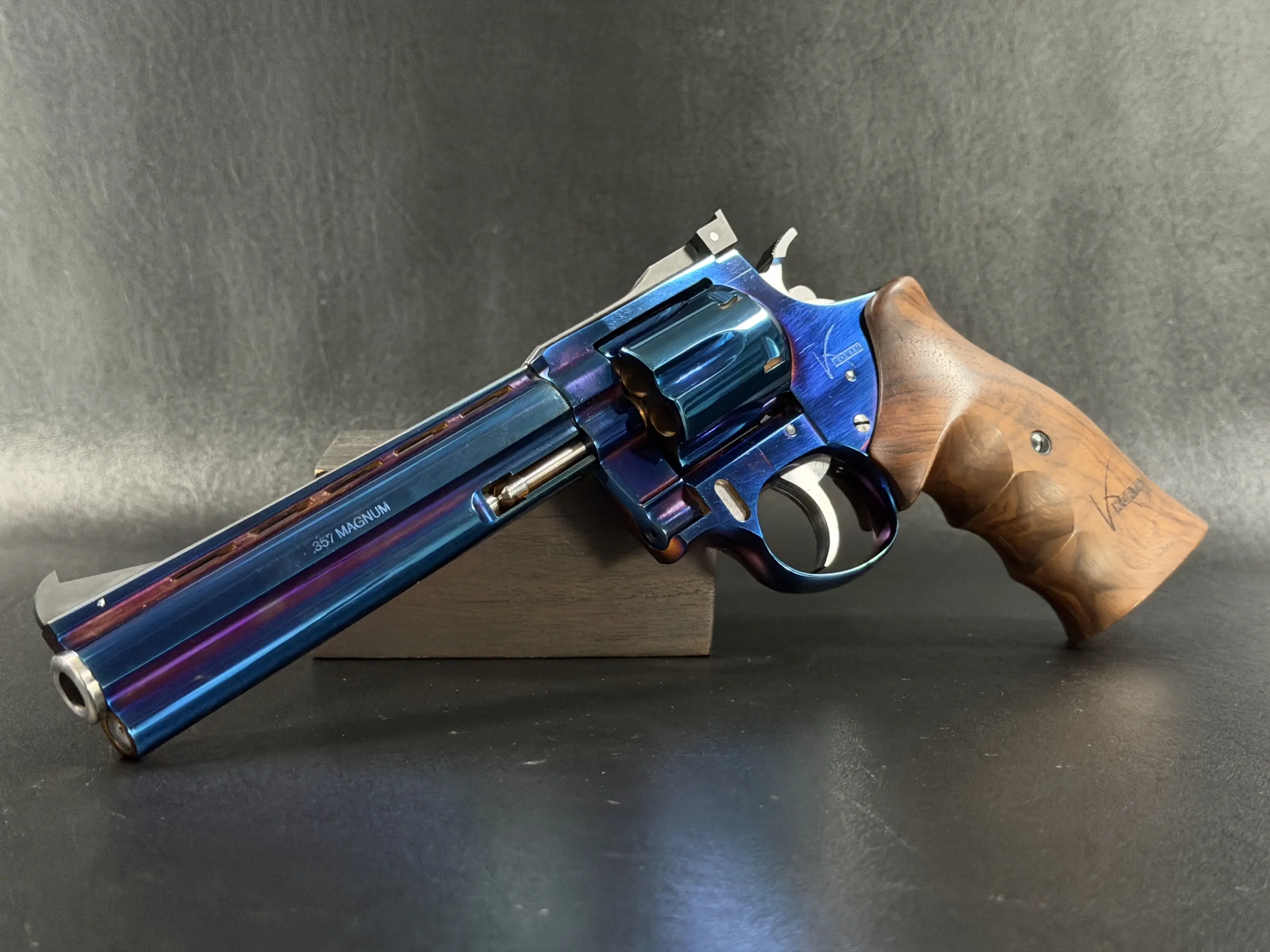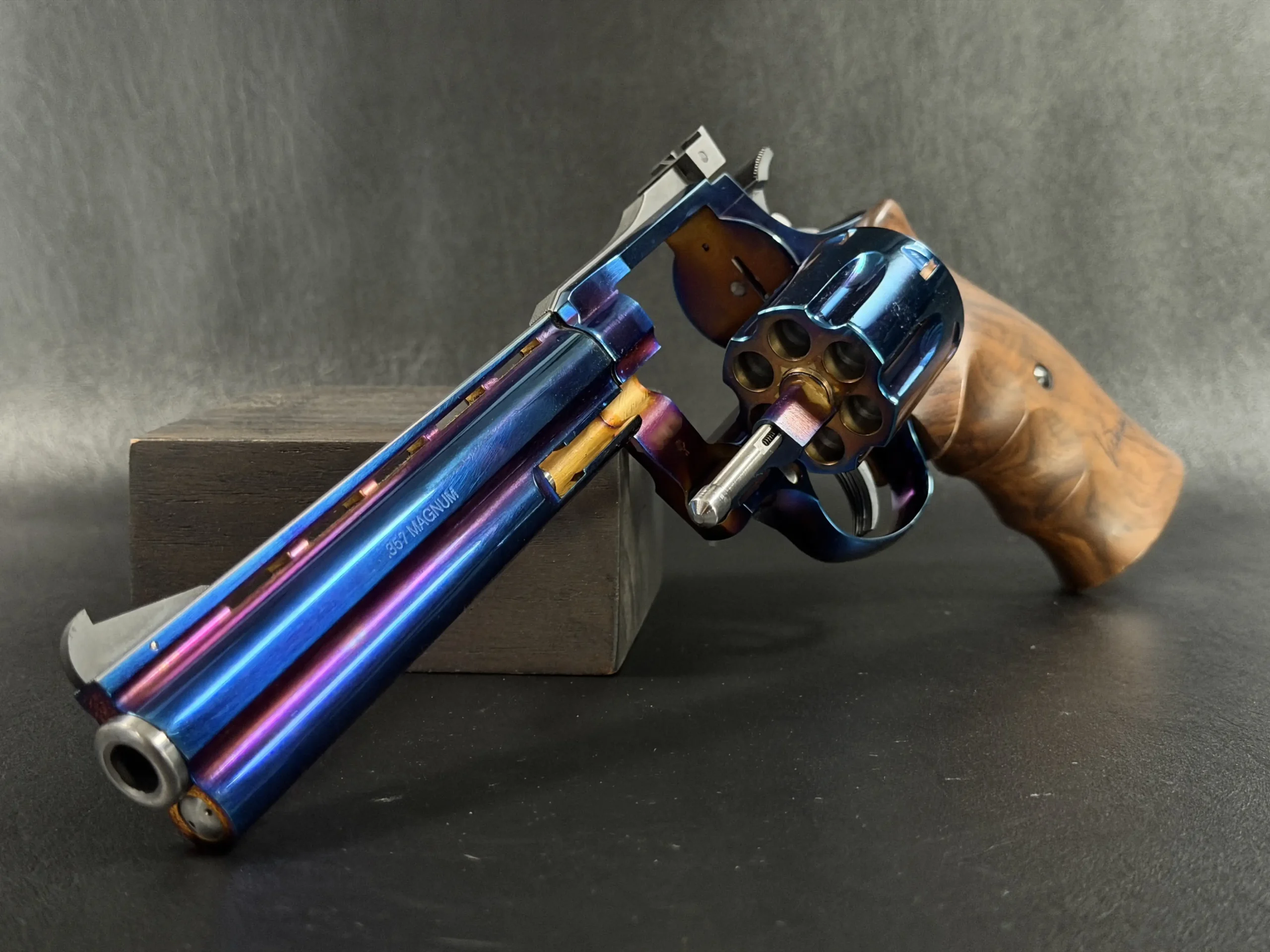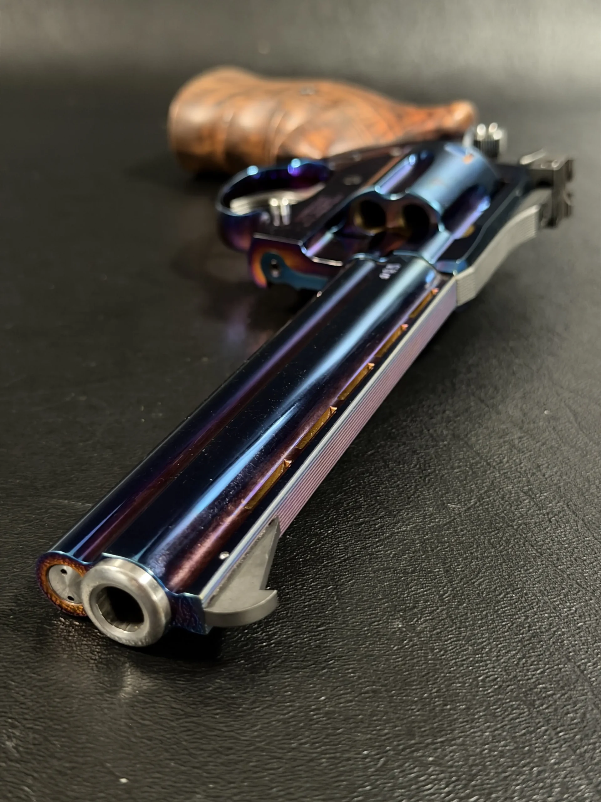 This matched Korth set pairs a 9mm semi-automatic pistol with a .357 Magnum revolver, both finished in Korth’s Blue Plasma treatment. The finish presents a deep, color-shifting appearance with tones of sapphire, violet, and steel, giving the two firearms a cohesive and highly distinctive look.
