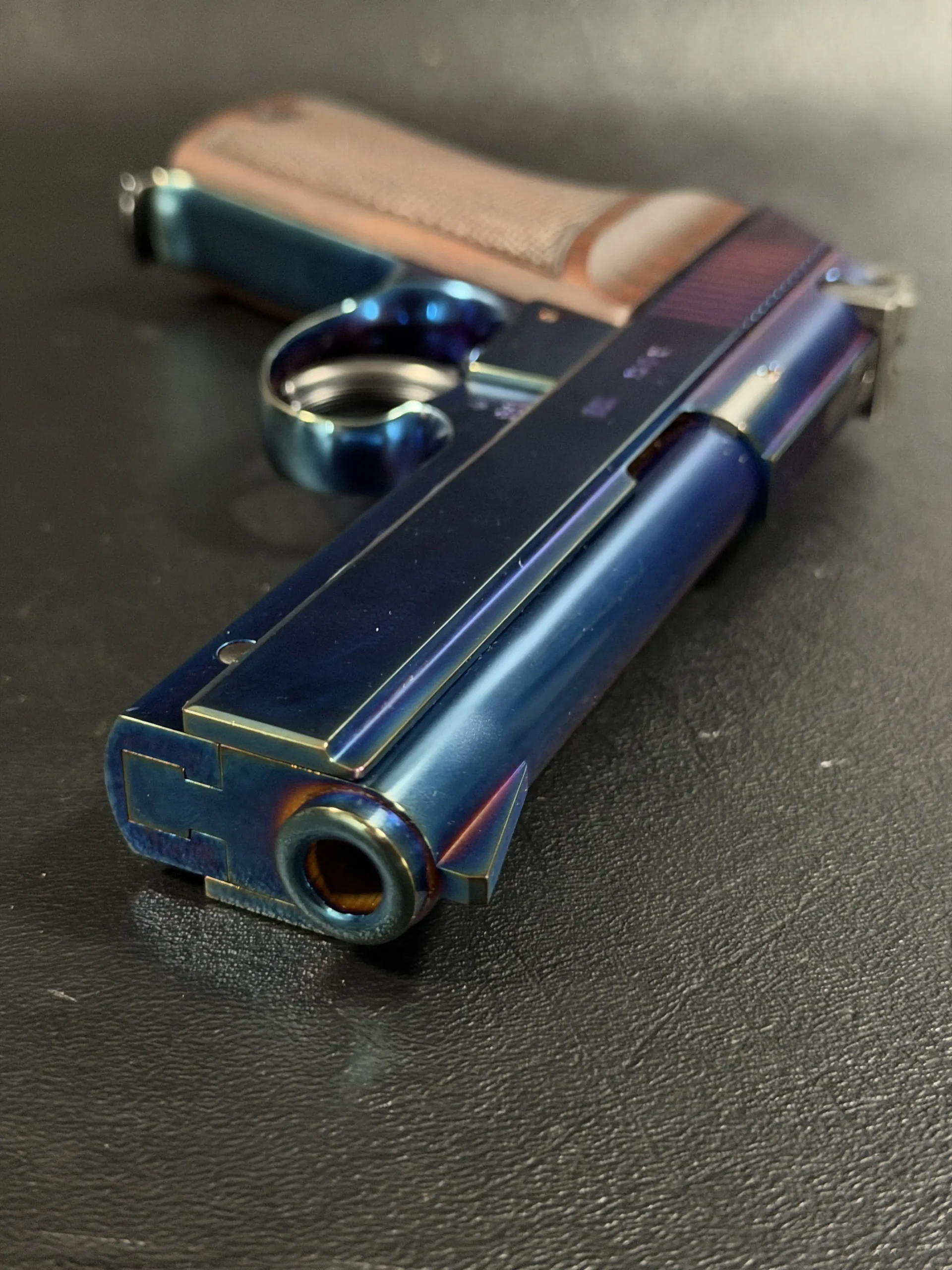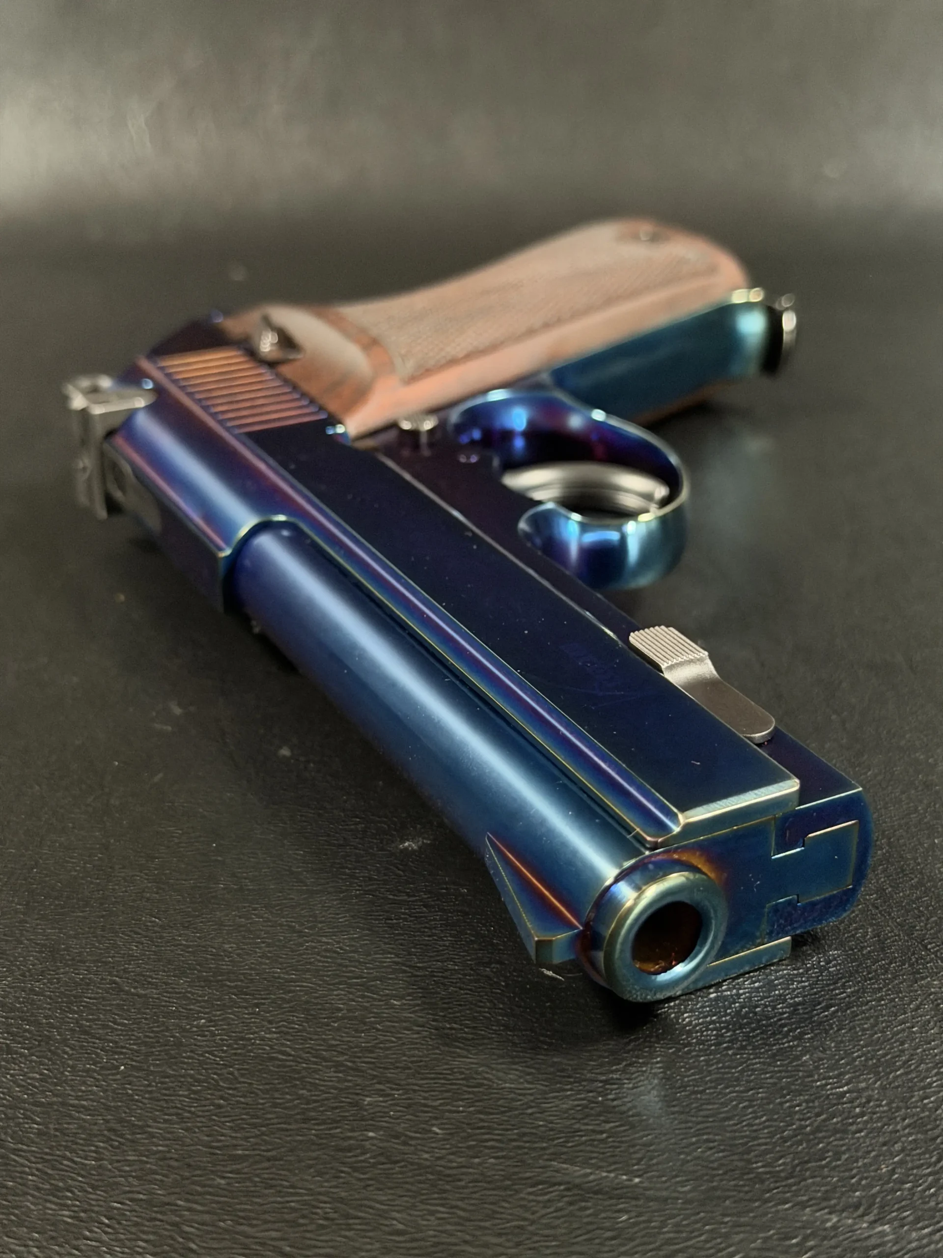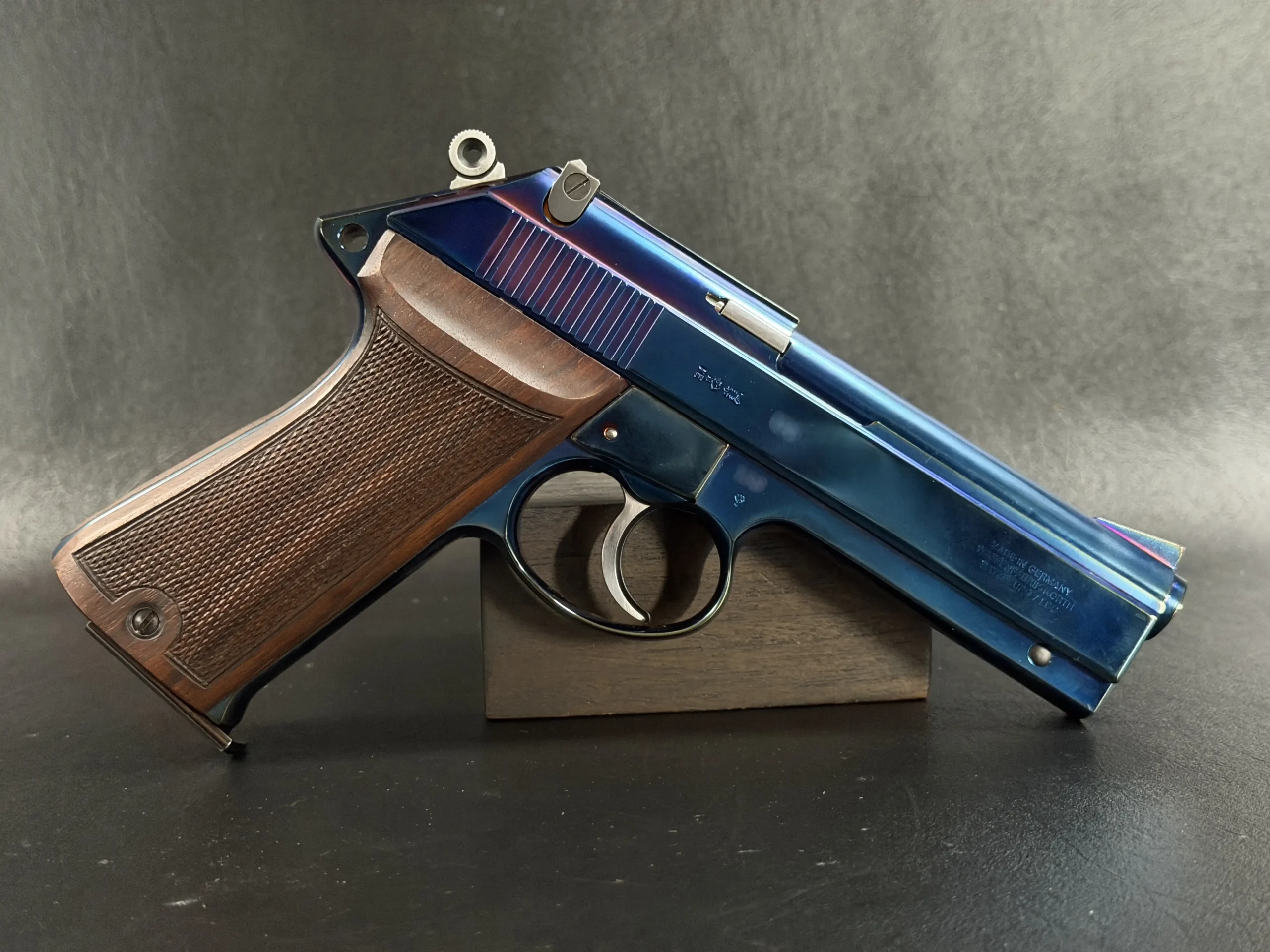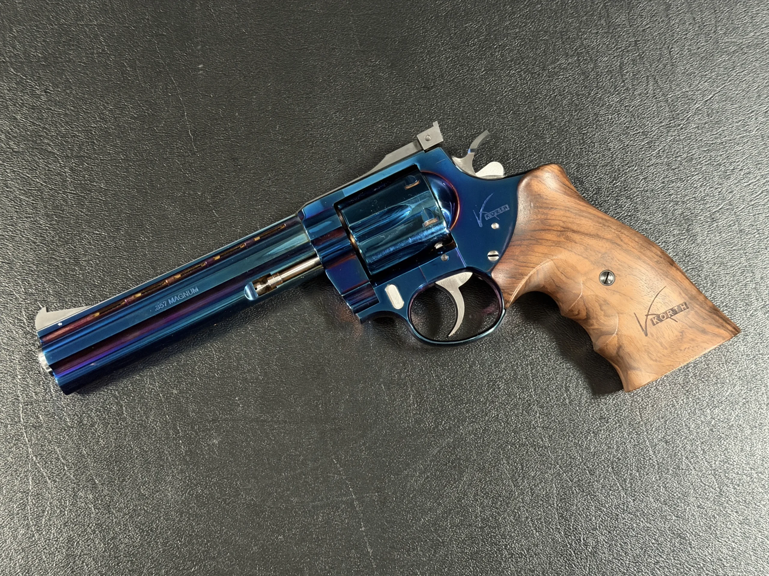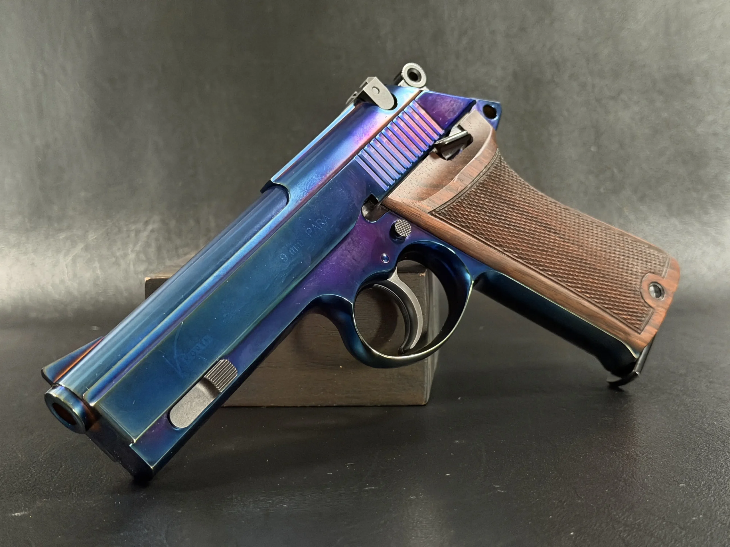 This matched Korth set pairs a 9mm semi-automatic pistol with a .357 Magnum revolver, both finished in Korth’s Blue Plasma treatment. The finish presents a deep, color-shifting appearance with tones of sapphire, violet, and steel, giving the two firearms a cohesive and highly distinctive look.