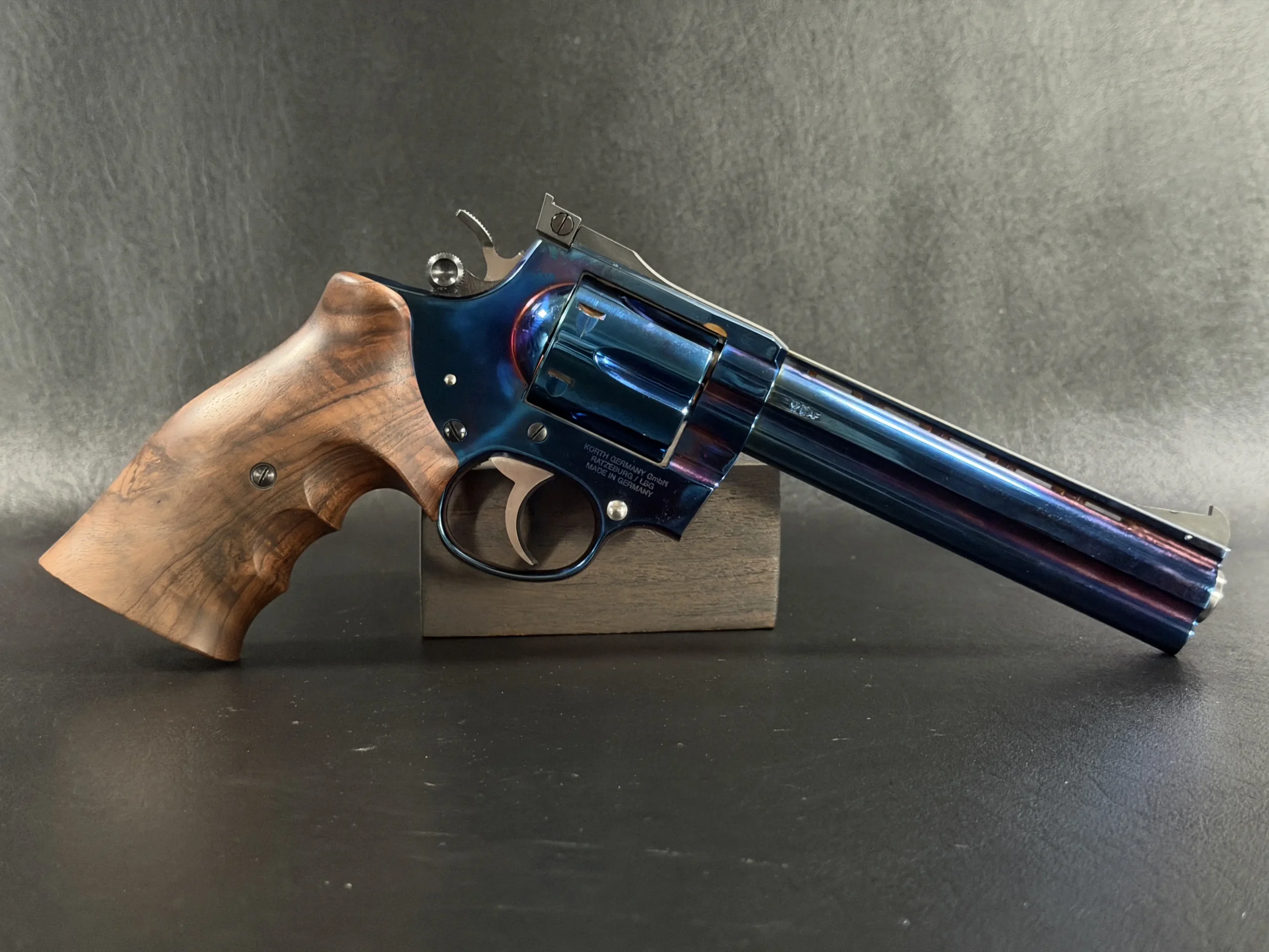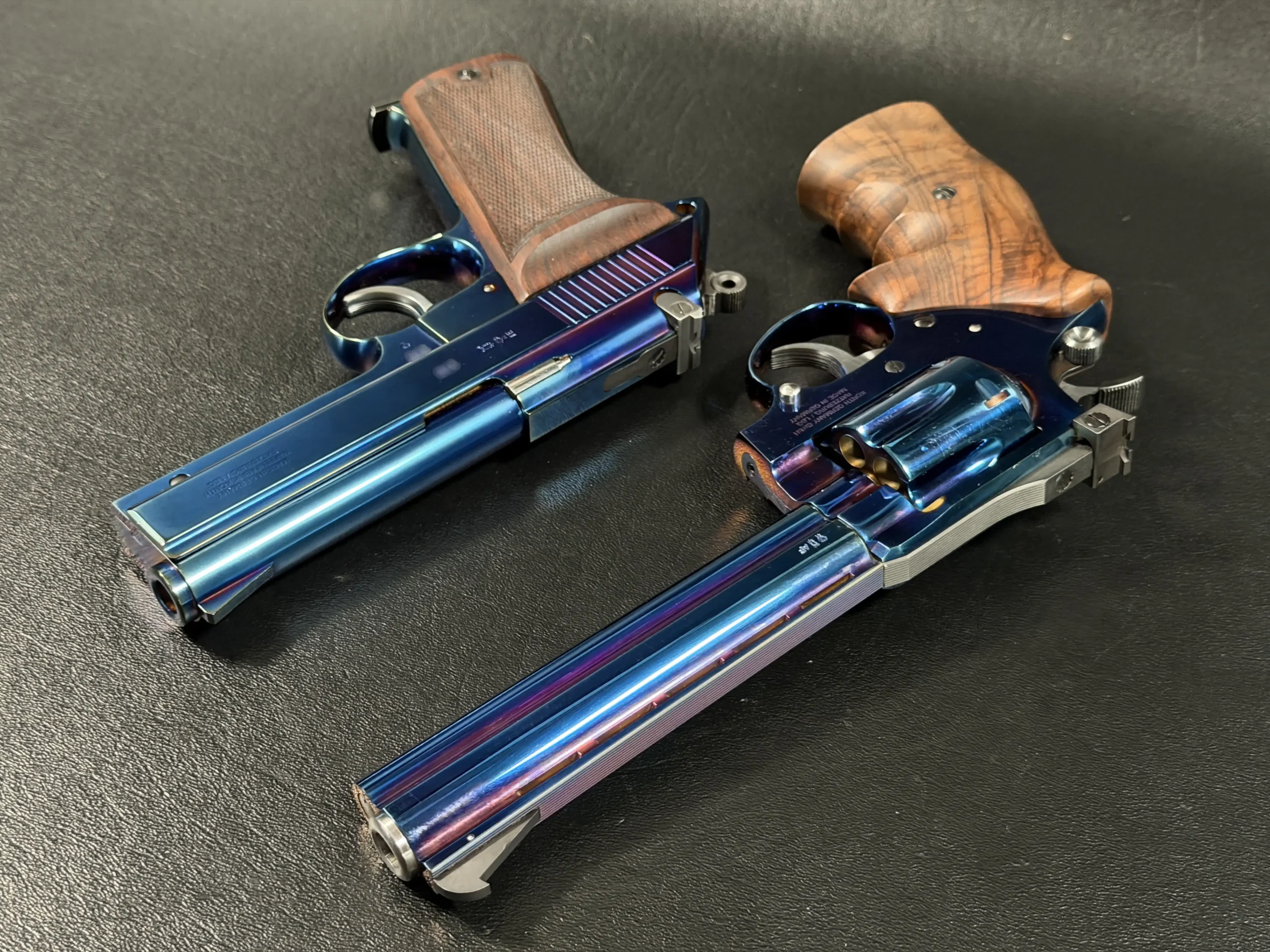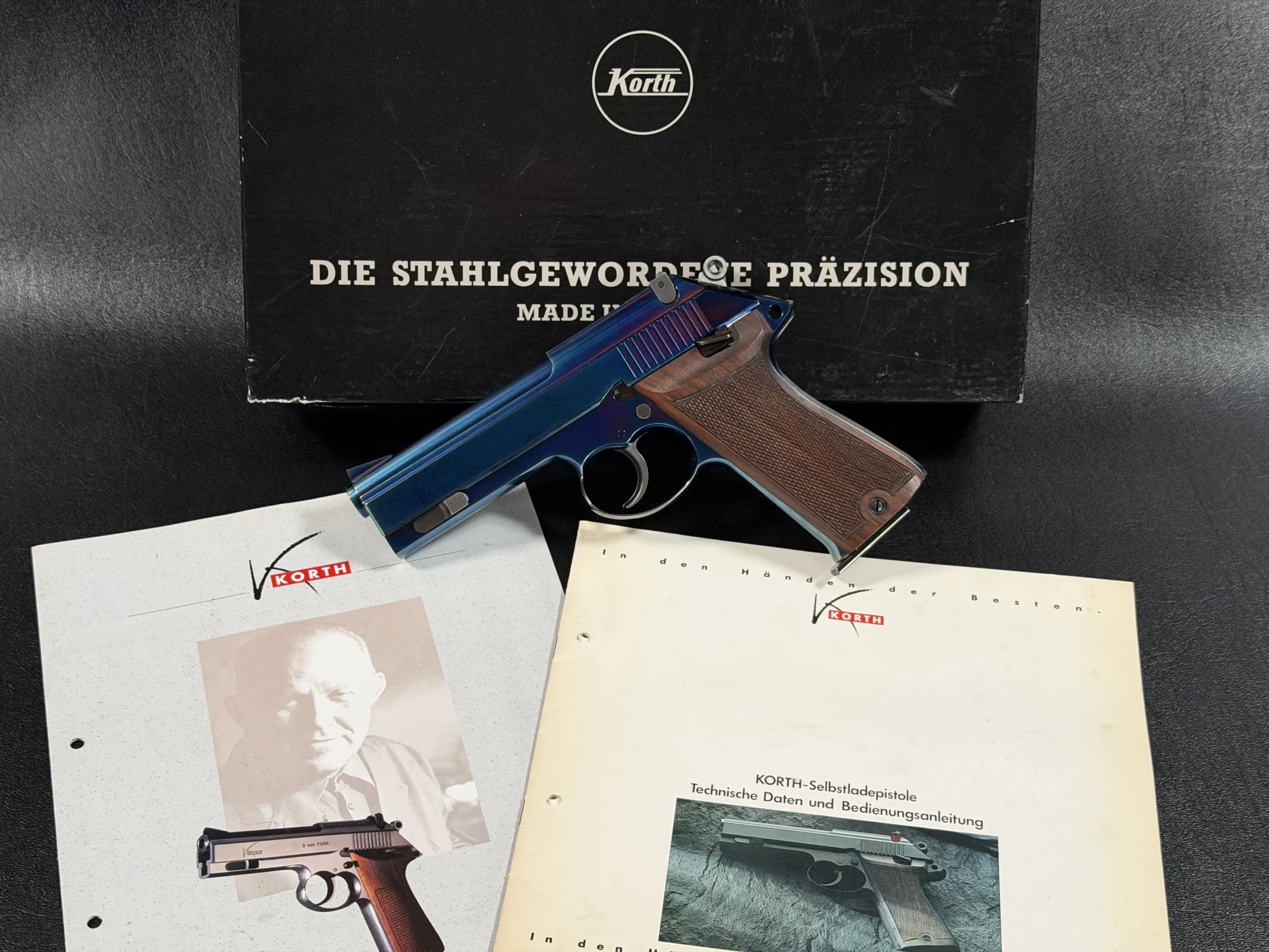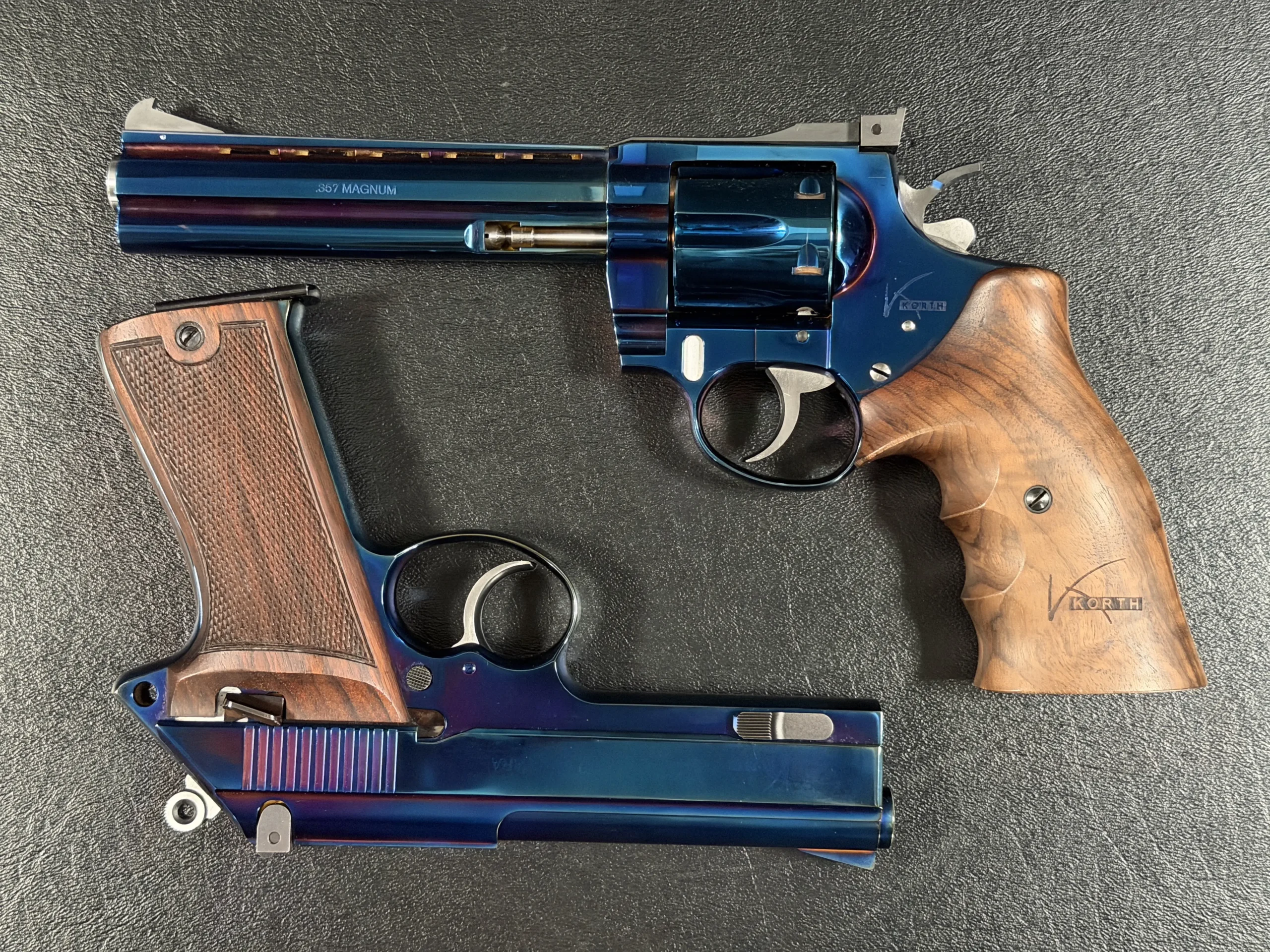 Together, the pistol, revolver, and matching exchange cylinder create a unified presentation that highlights Korth’s signature design language and attention to detail. This is a striking two-gun set with strong visual continuity across its major components.