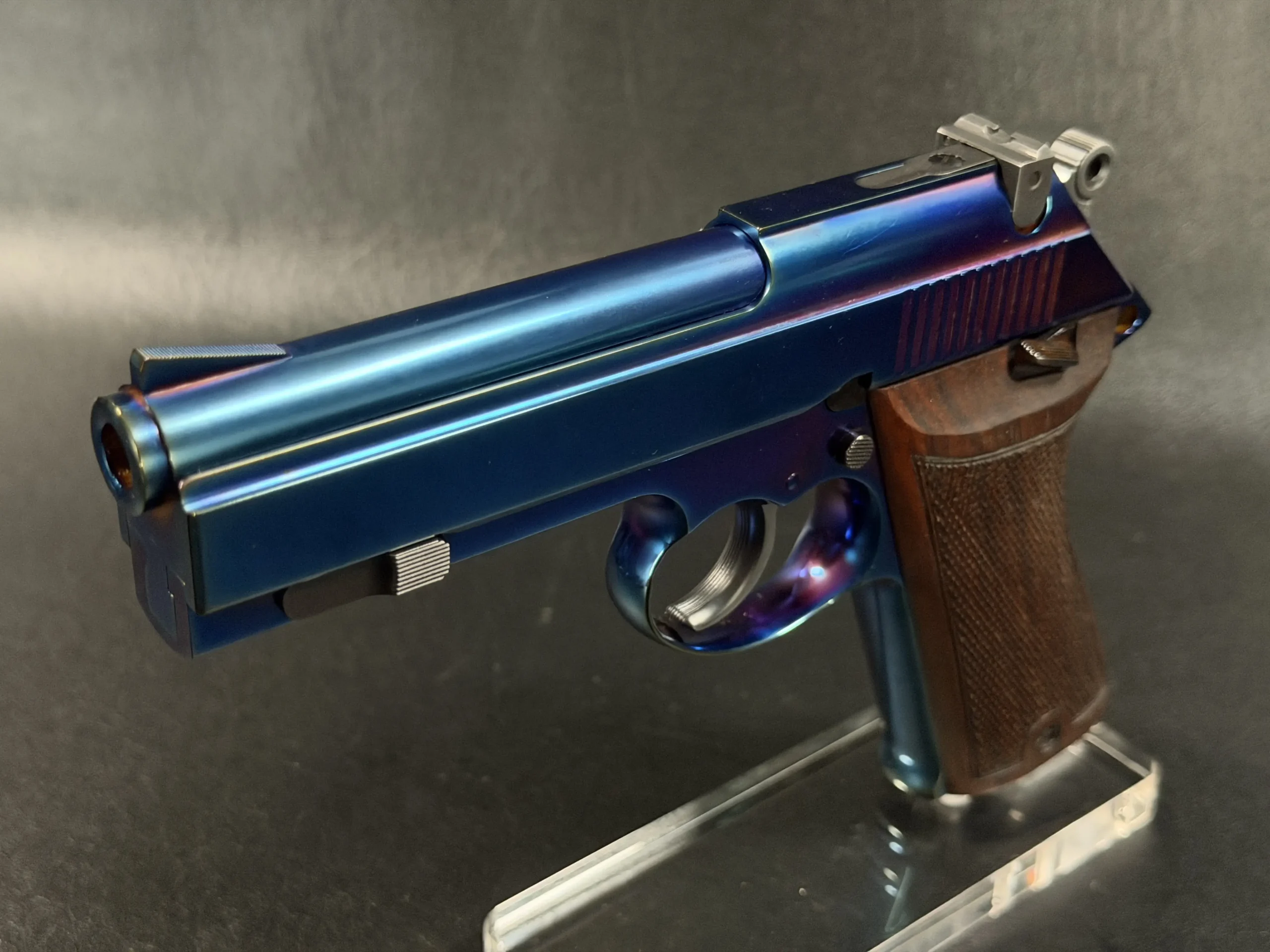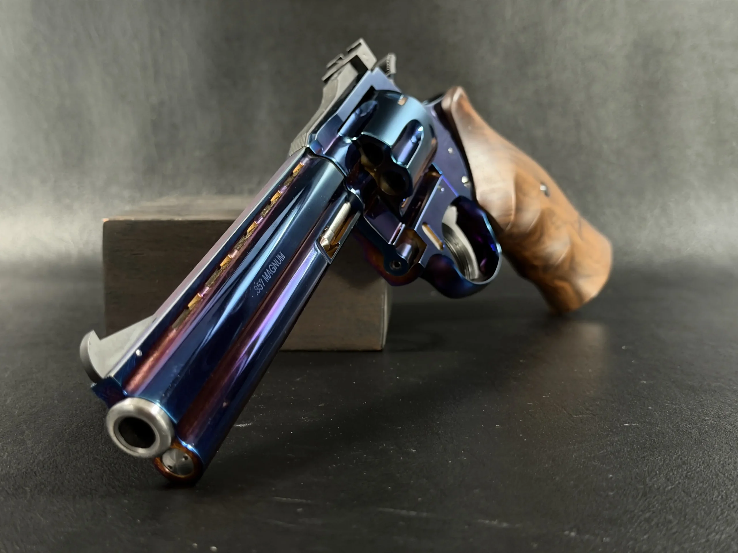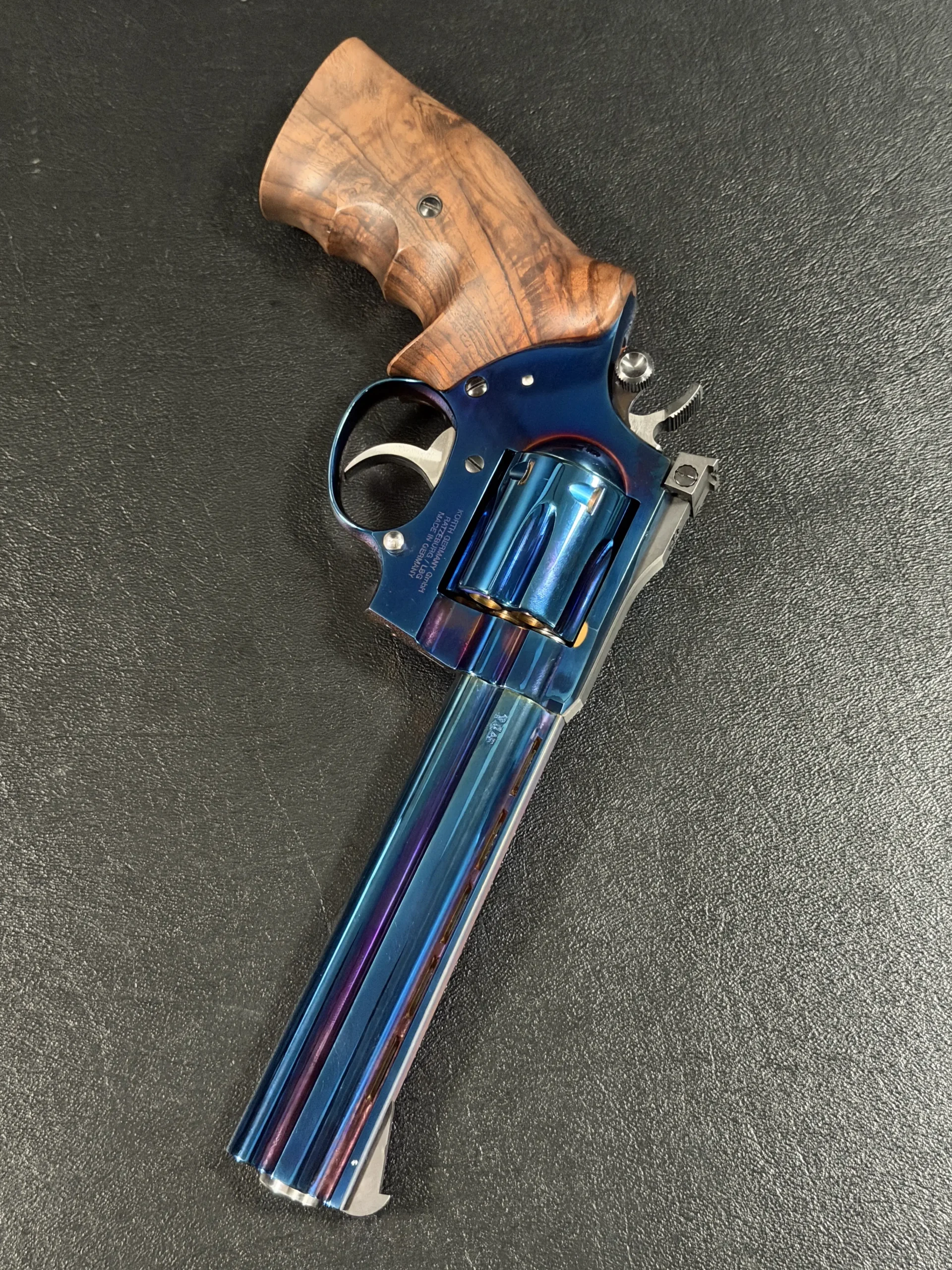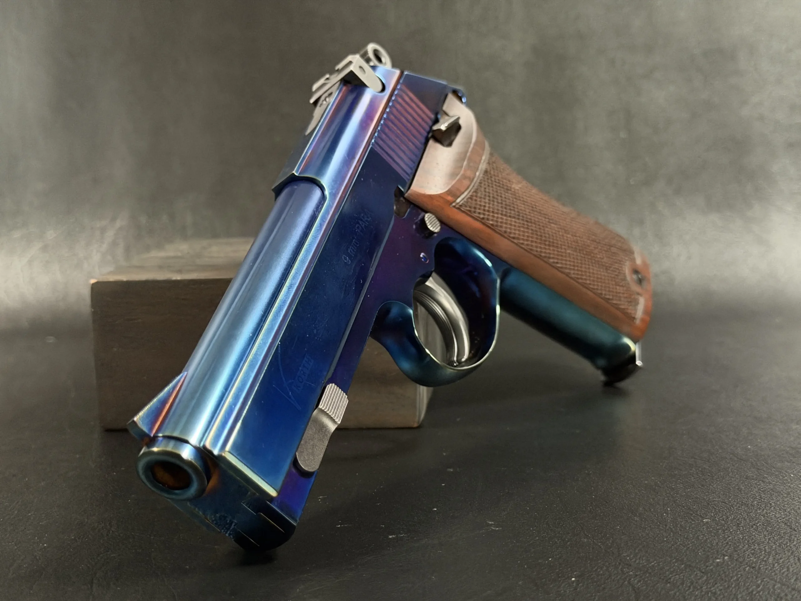 The semi-automatic pistol features classic checkered wood grips that contrast beautifully with the reflective Blue Plasma finish. The revolver is fitted with a long barrel and a walnut grip, and it includes a factory 9mm exchange cylinder finished to match the set.