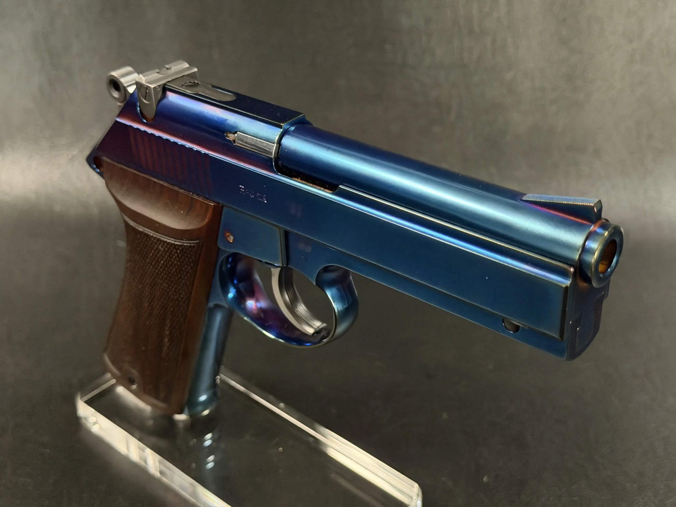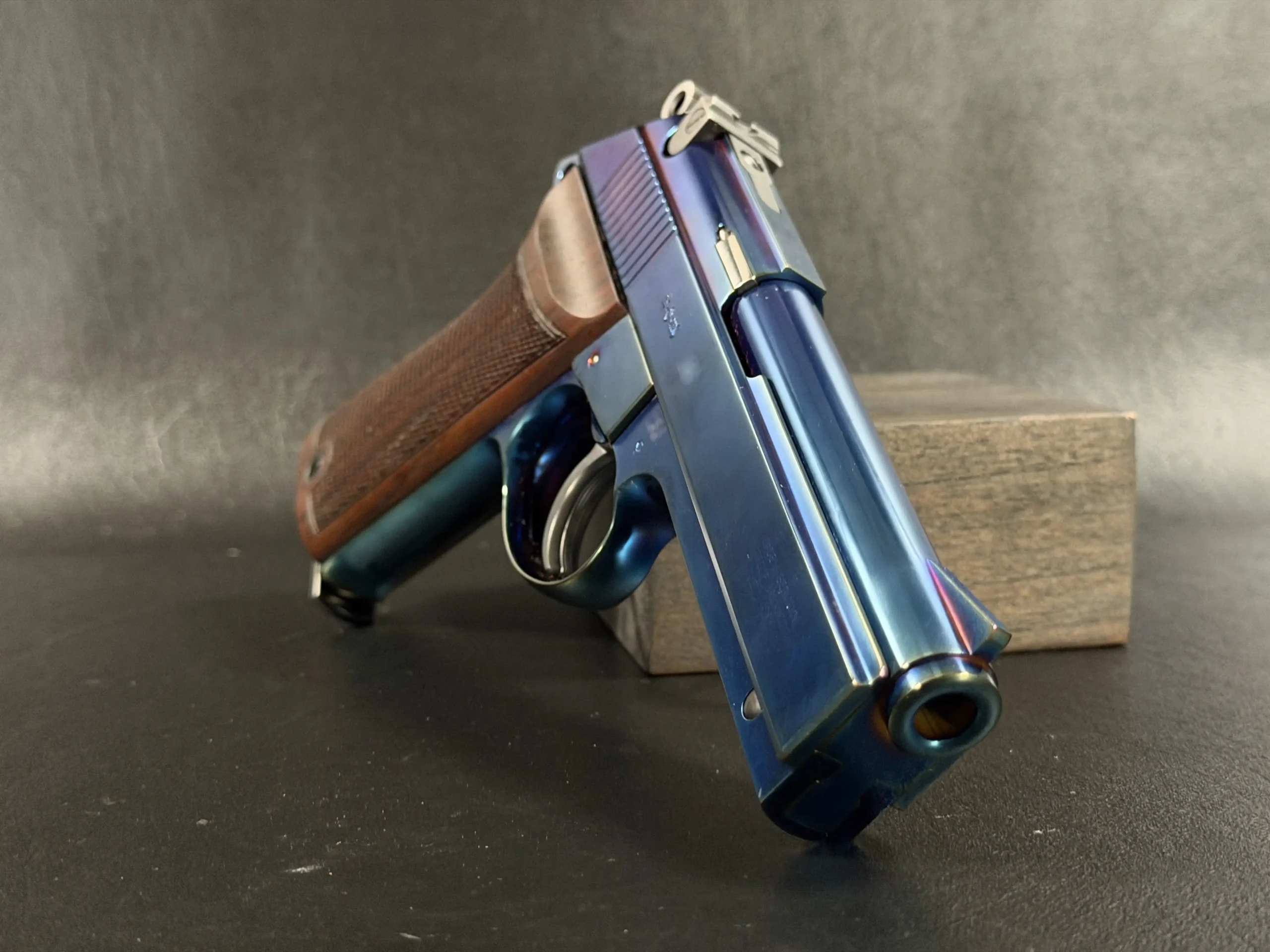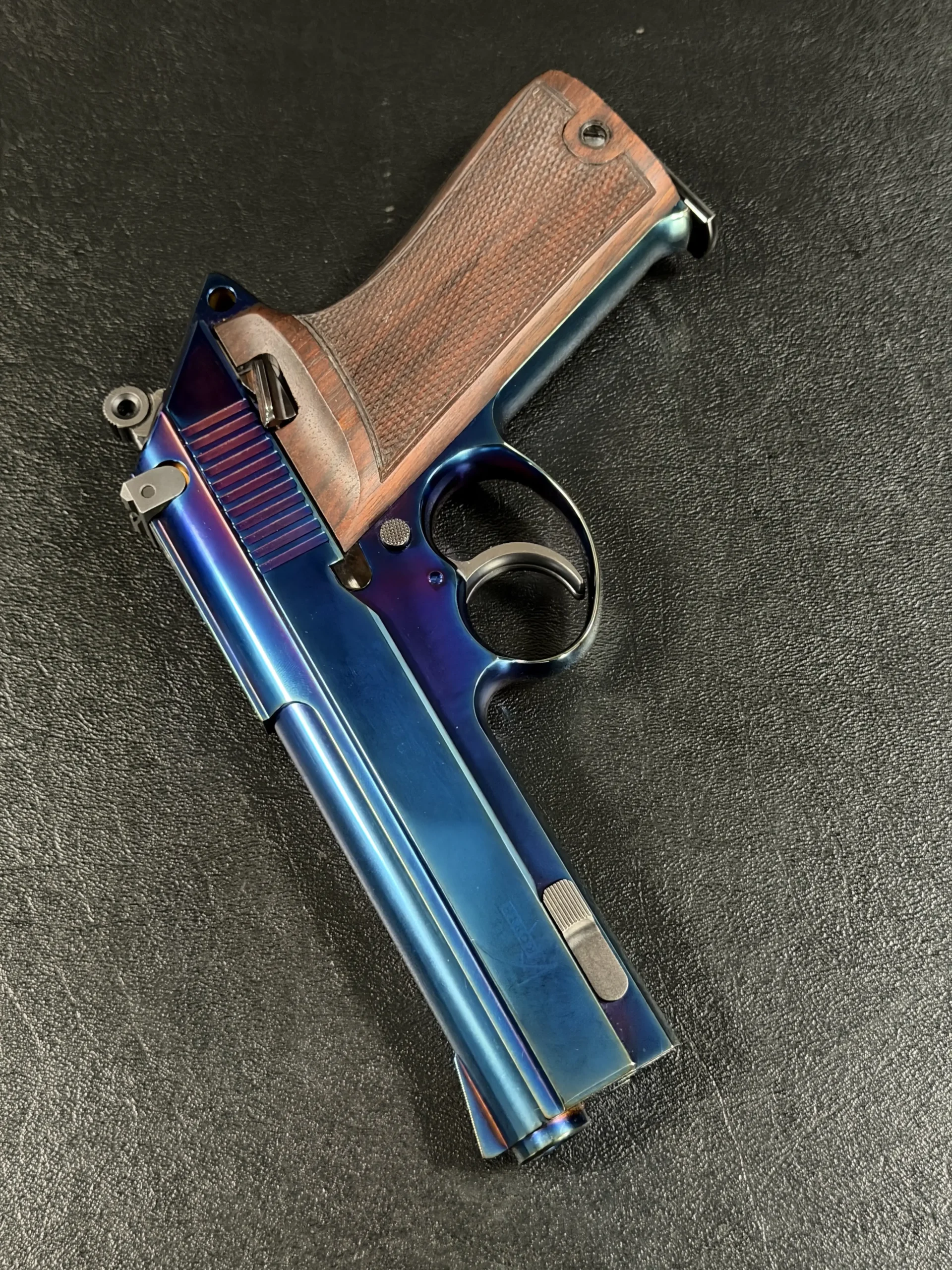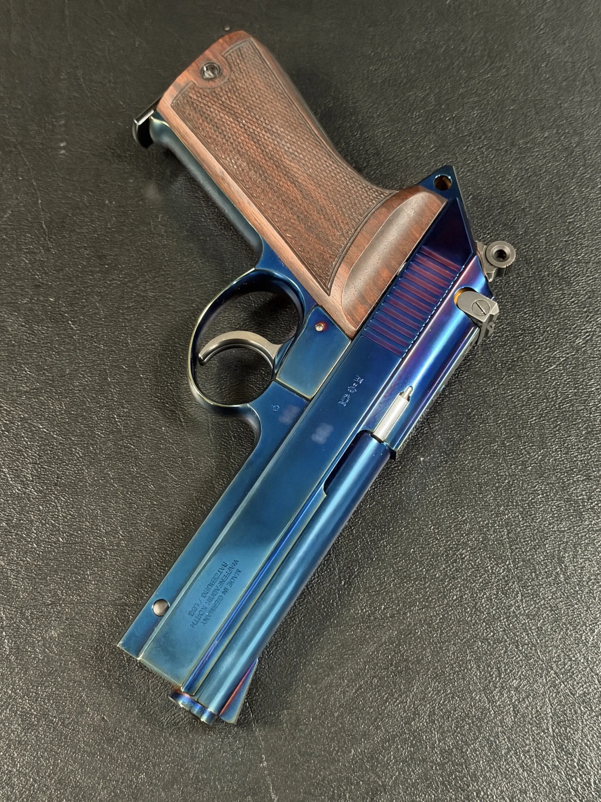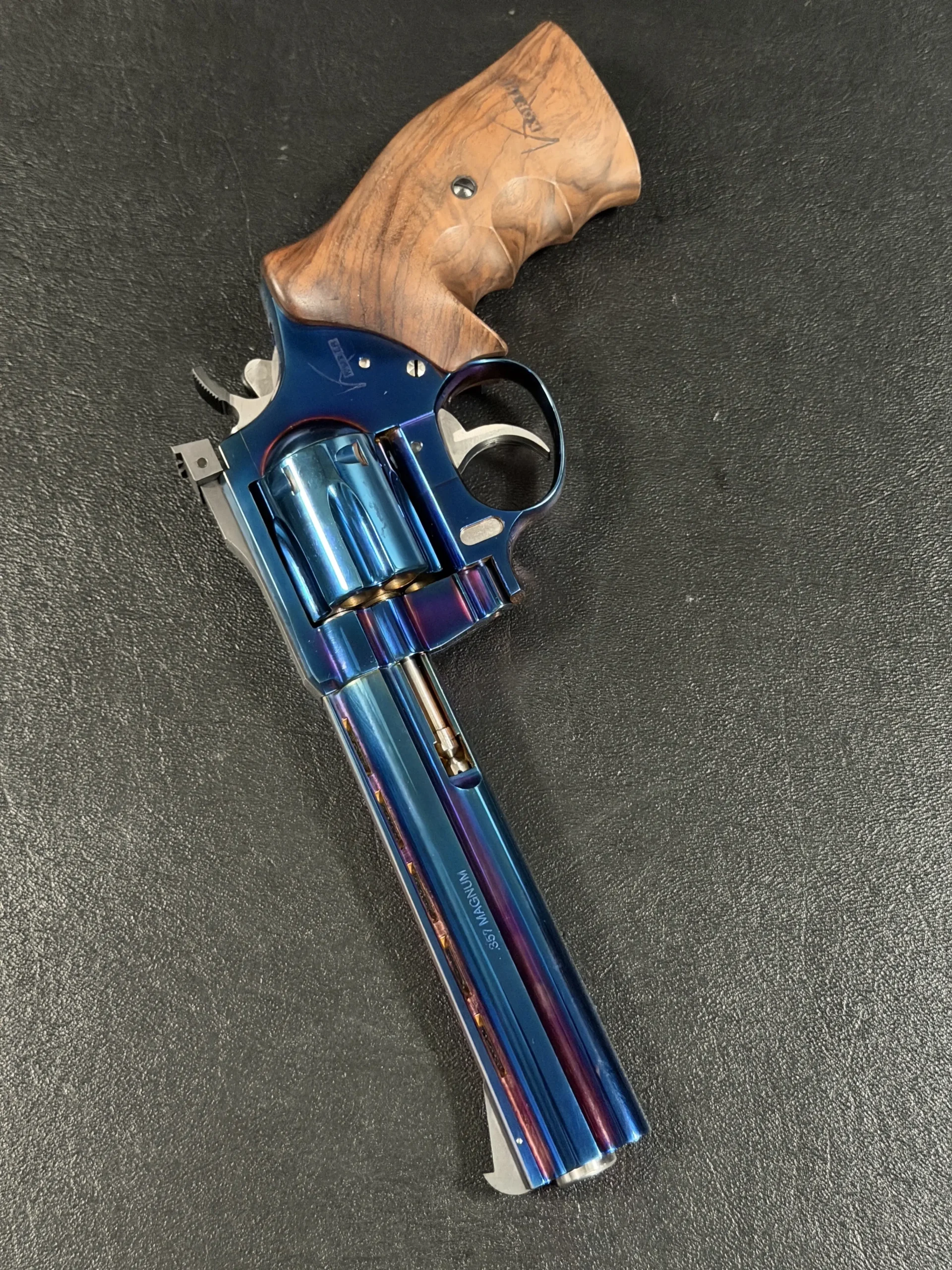 The semi-automatic pistol features classic checkered wood grips that contrast beautifully with the reflective Blue Plasma finish. The revolver is fitted with a long barrel and a walnut grip, and it includes a factory 9mm exchange cylinder finished to match the set.