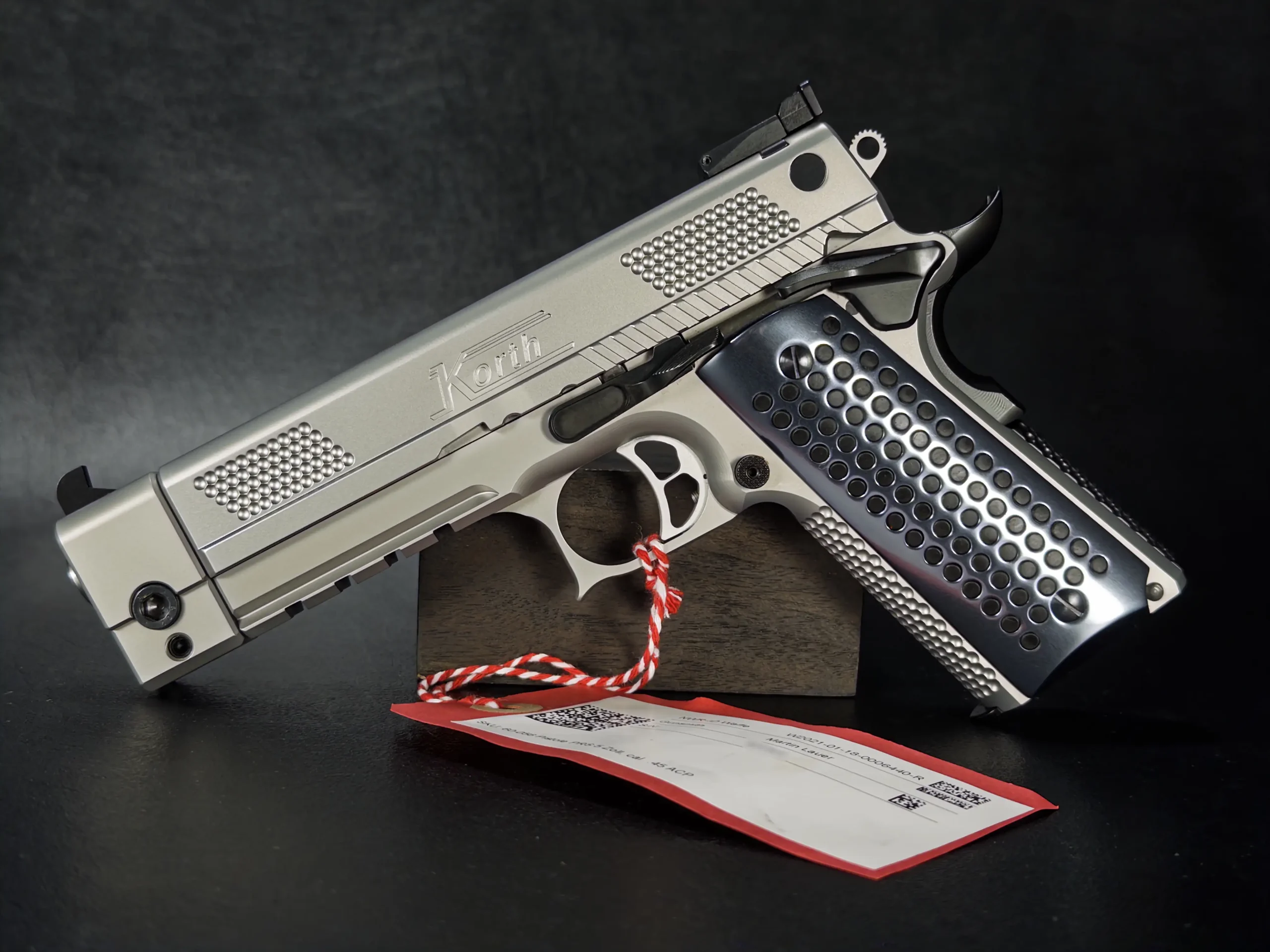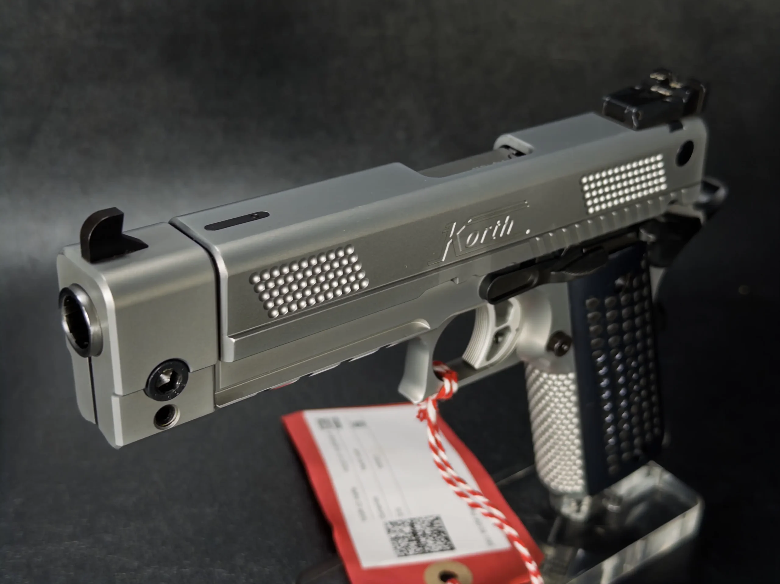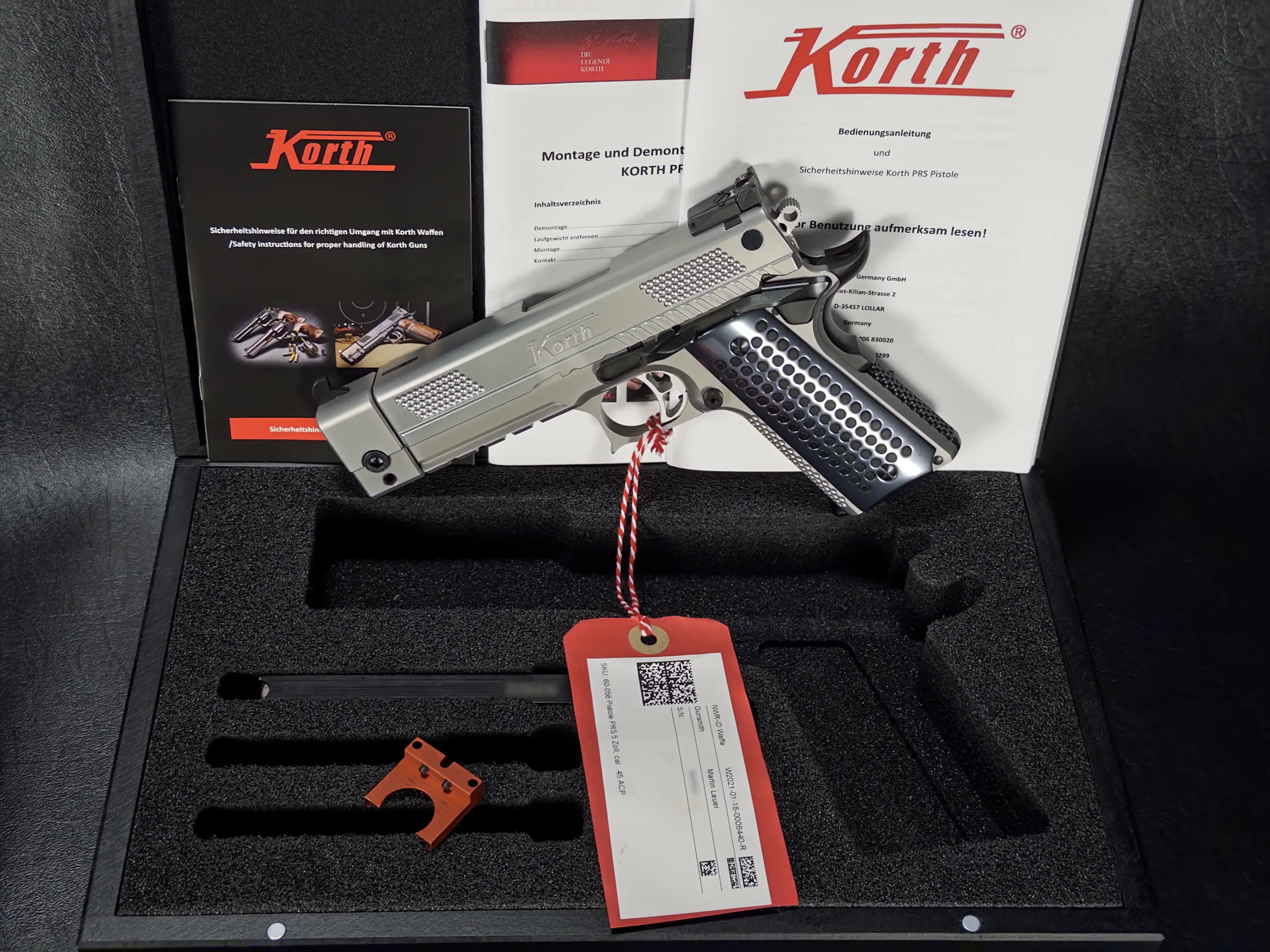 The Korth Stainless PRS 5″ is a stainless steel pistol chambered in .45 ACP, built with the precise machining and distinctive design language the brand is known for. Its all-stainless construction gives the pistol a substantial, balanced feel, while the 5-inch match-grade barrel offers a longer sight radius.