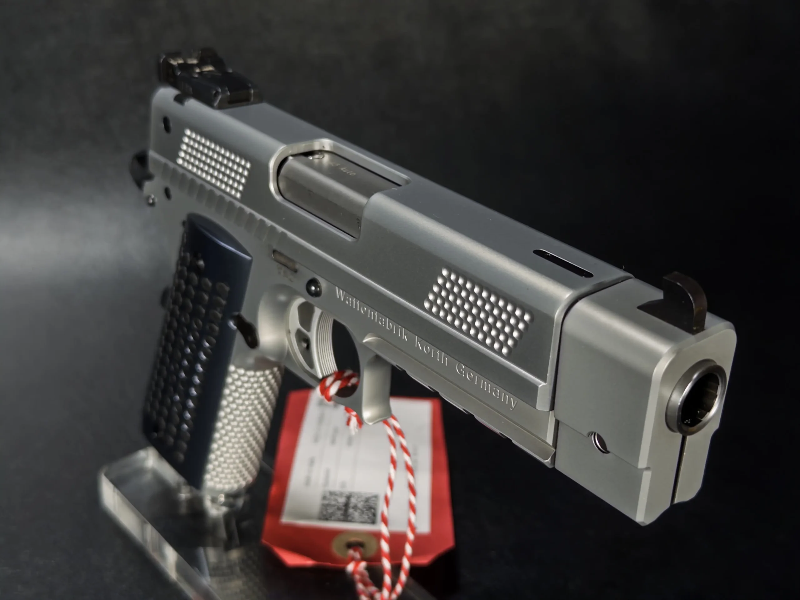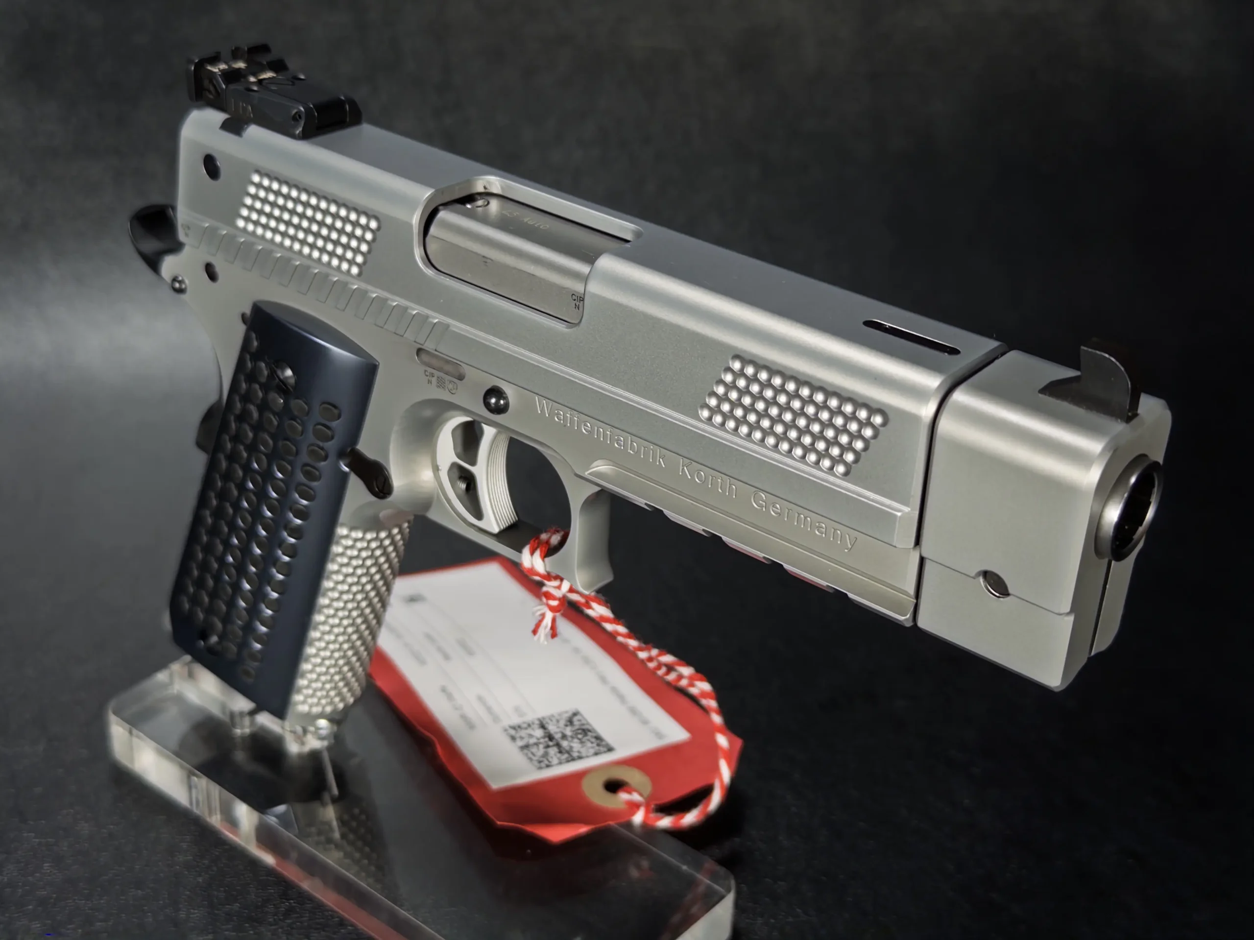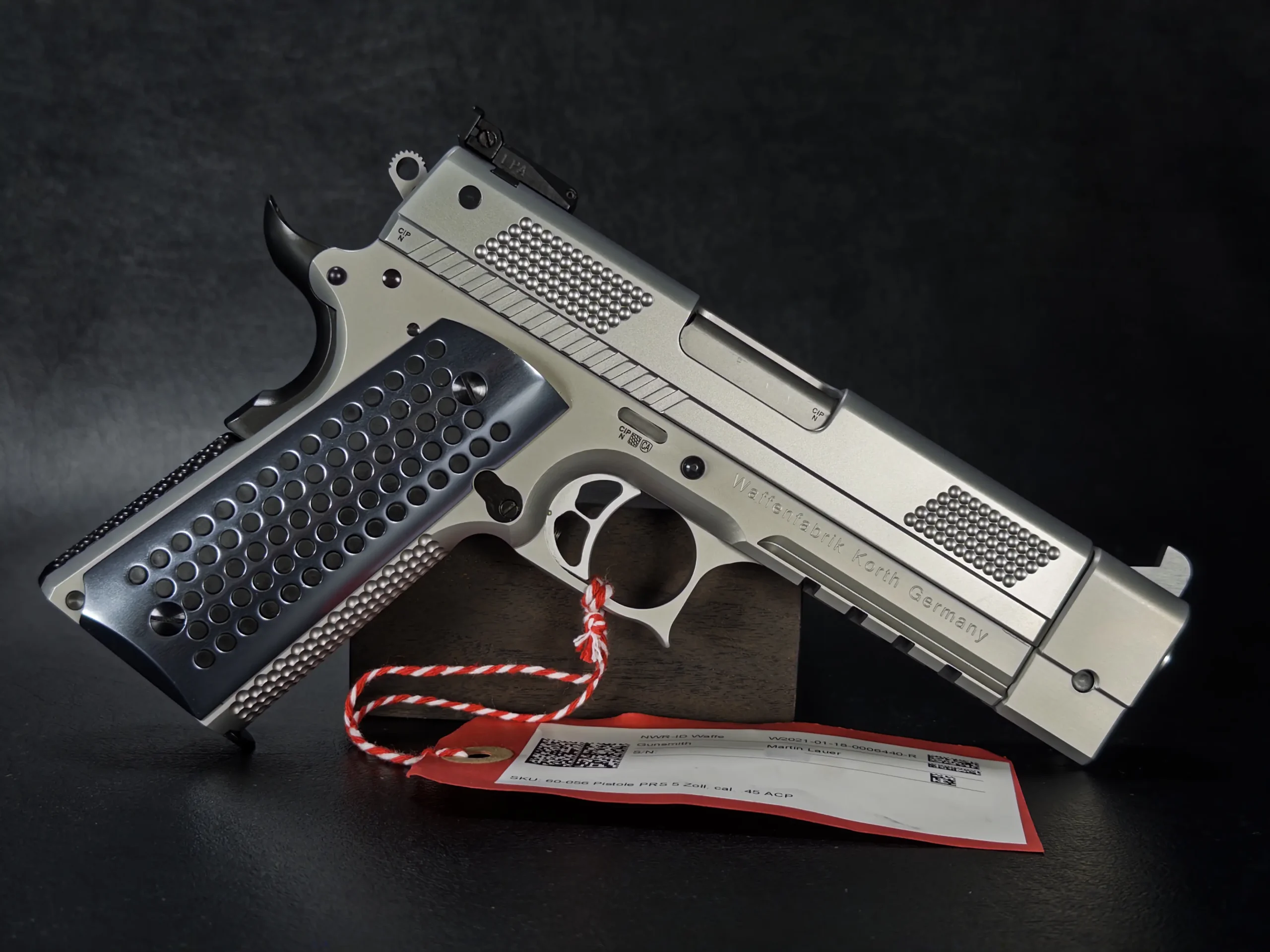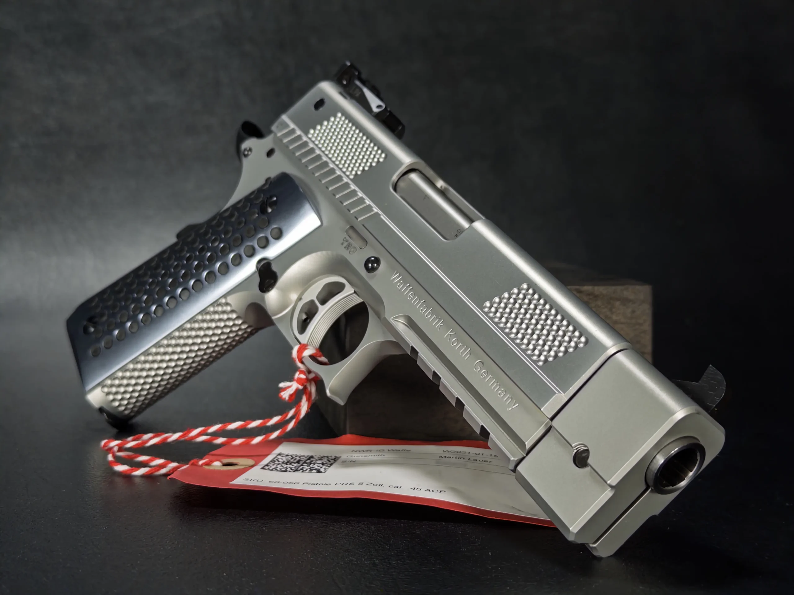 The Korth Stainless PRS 5″ is a stainless steel pistol chambered in .45 ACP, built with the precise machining and distinctive design language the brand is known for. Its all-stainless construction gives the pistol a substantial, balanced feel, while the 5-inch match-grade barrel offers a longer sight radius.