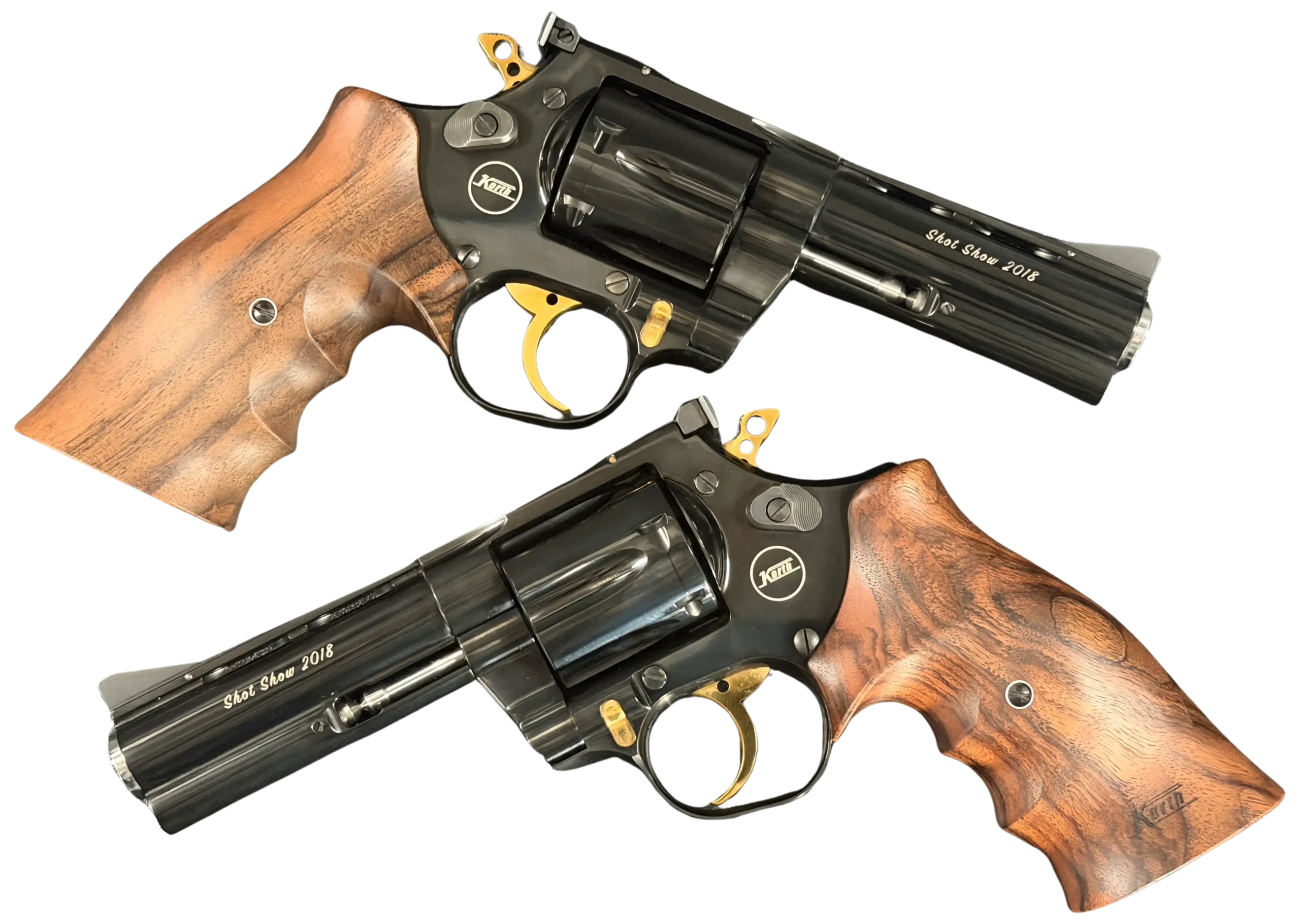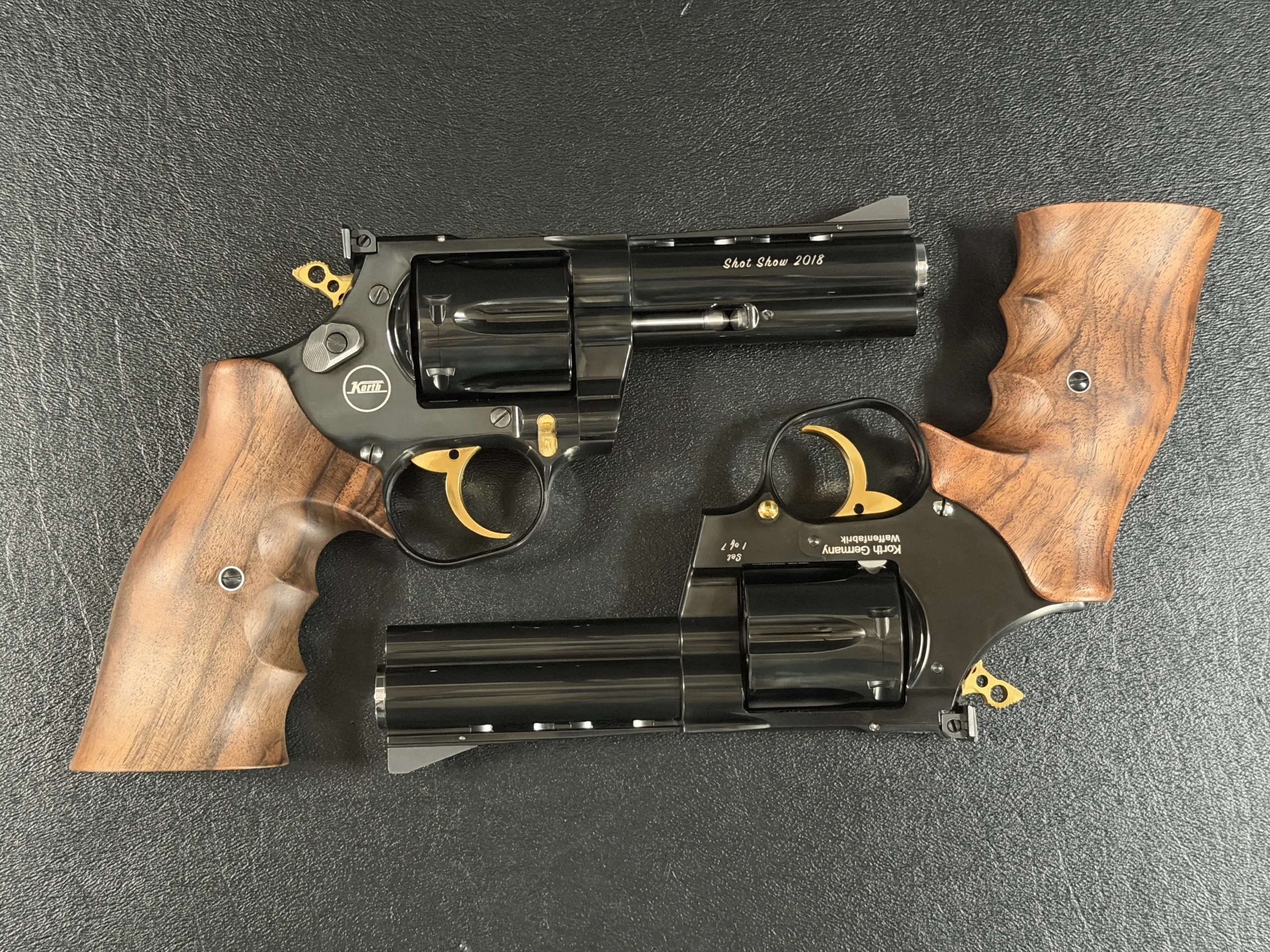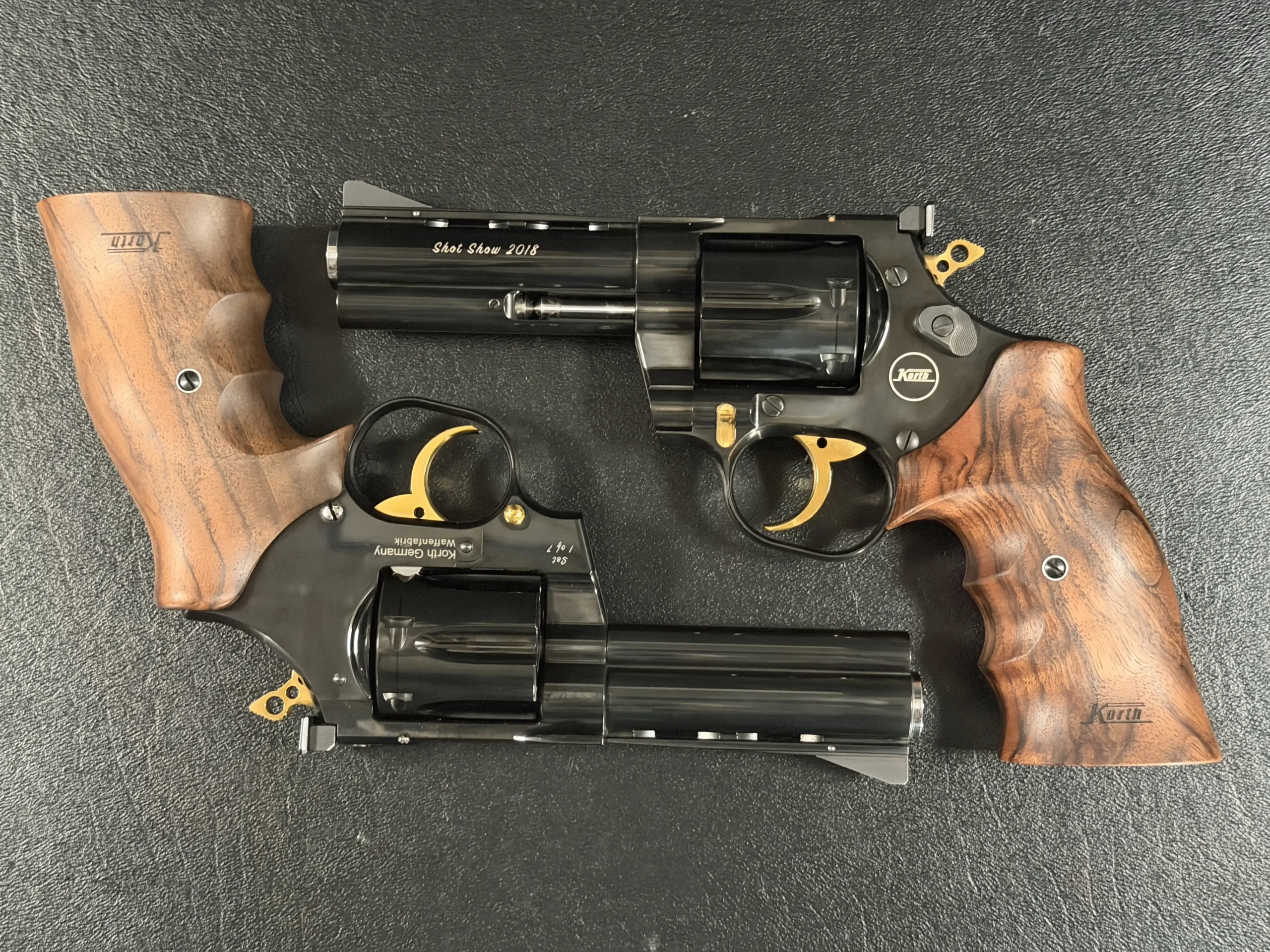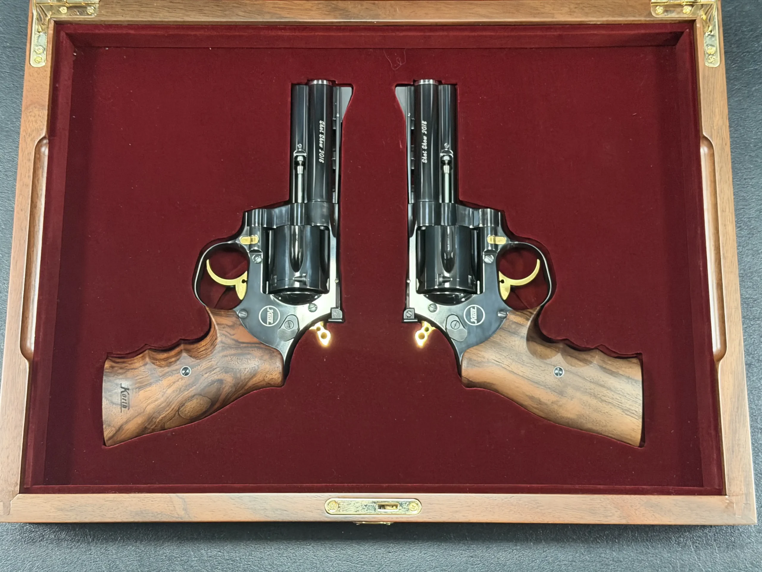 A matched pair of Korth revolvers created for SHOT Show 2018, the “Twins” Set is chambered in .357 Magnum and finished as a coordinated presentation duo. Deep black metalwork, gold-tone accents, figured walnut grips, and a fitted wood display case complete the set.