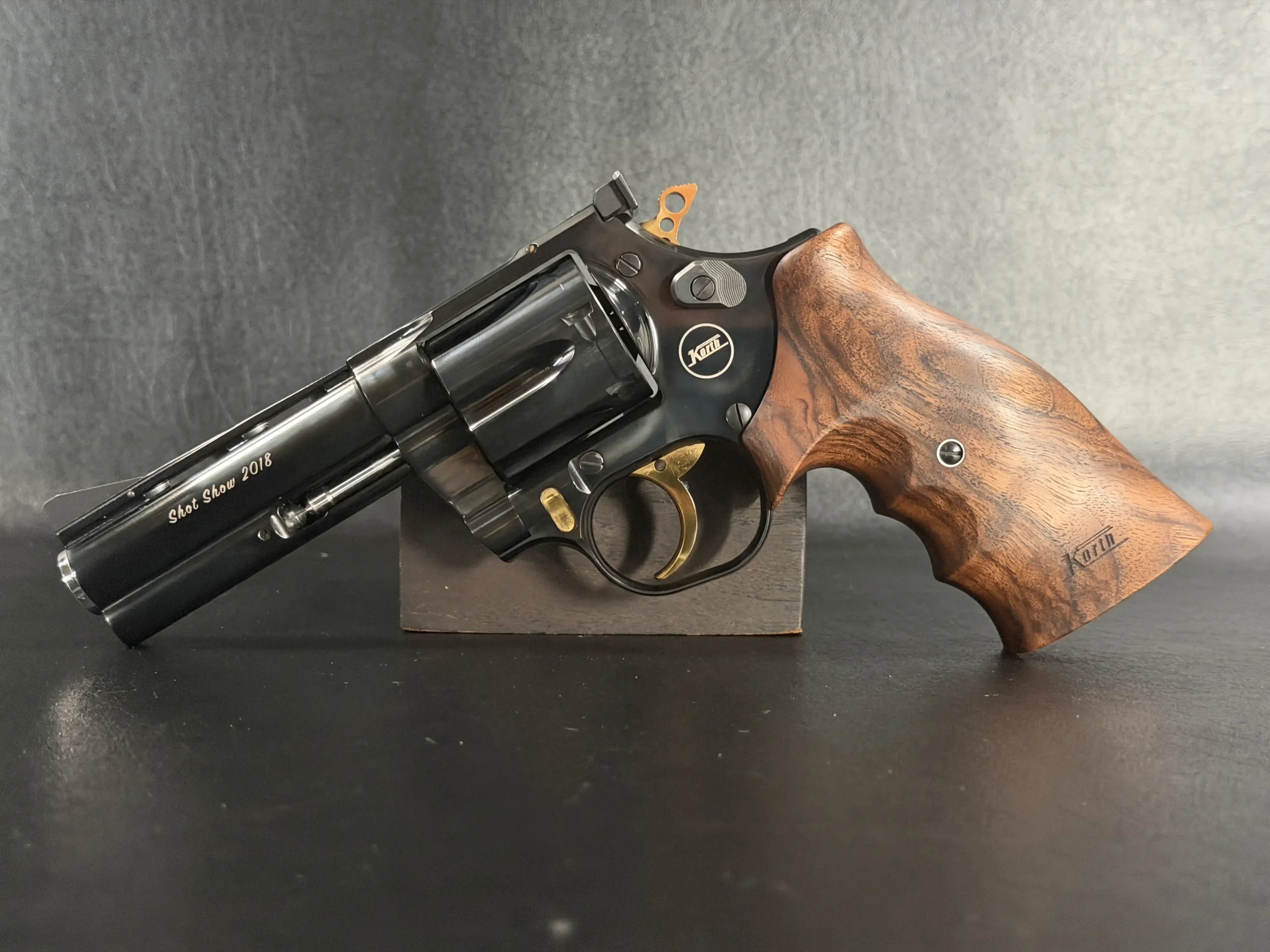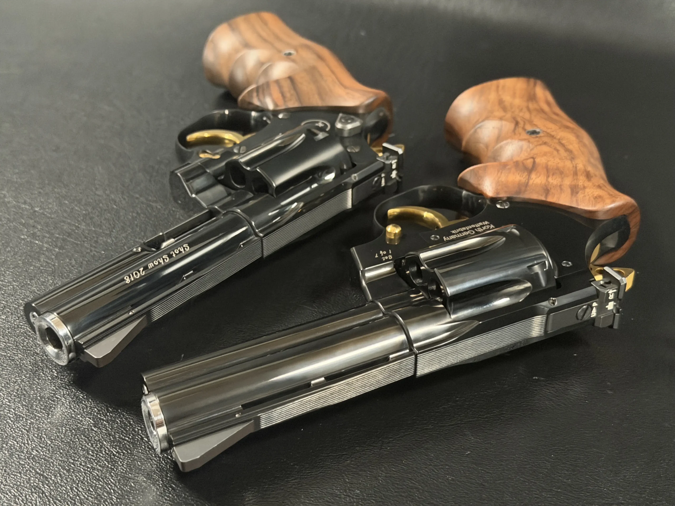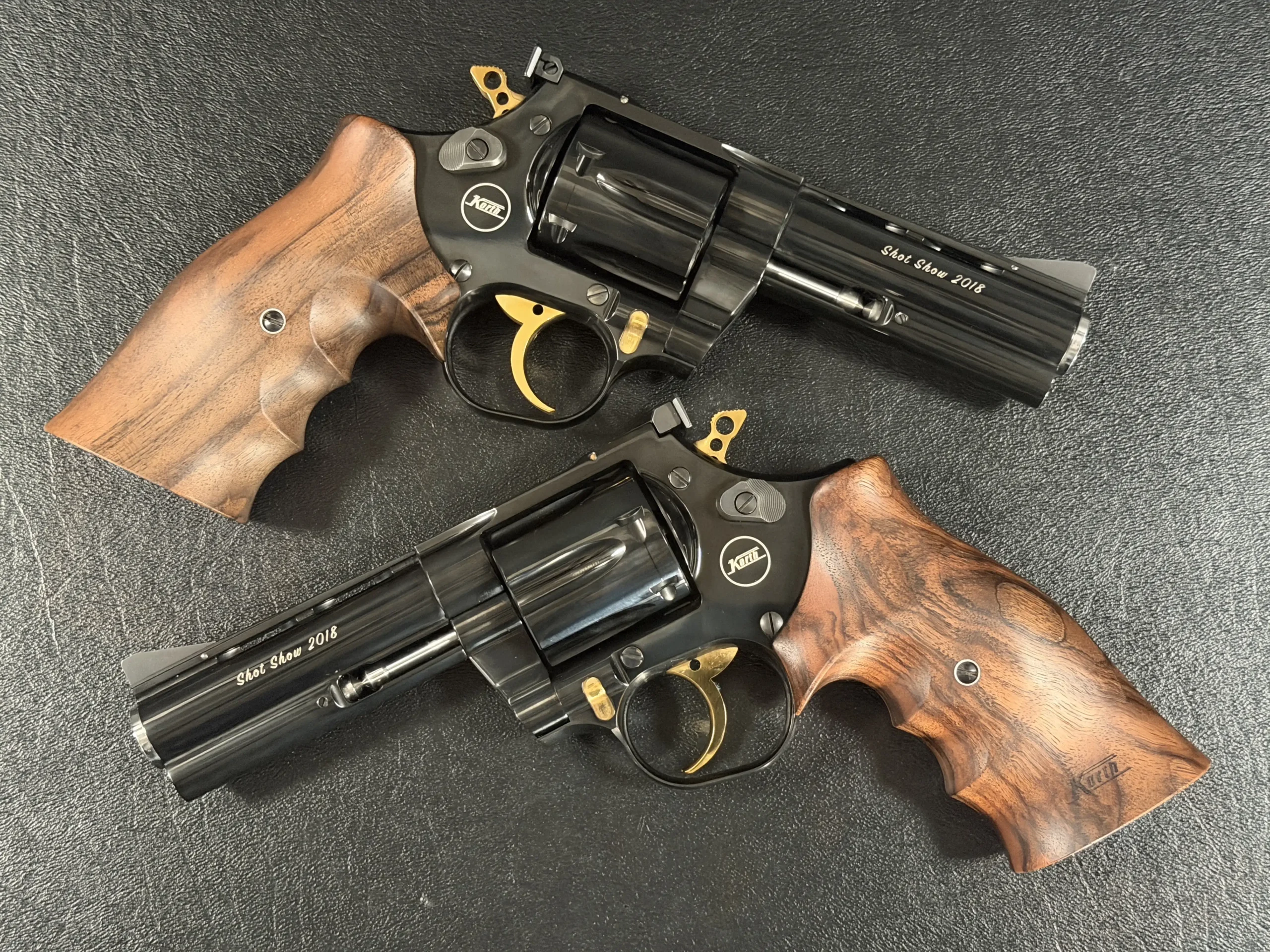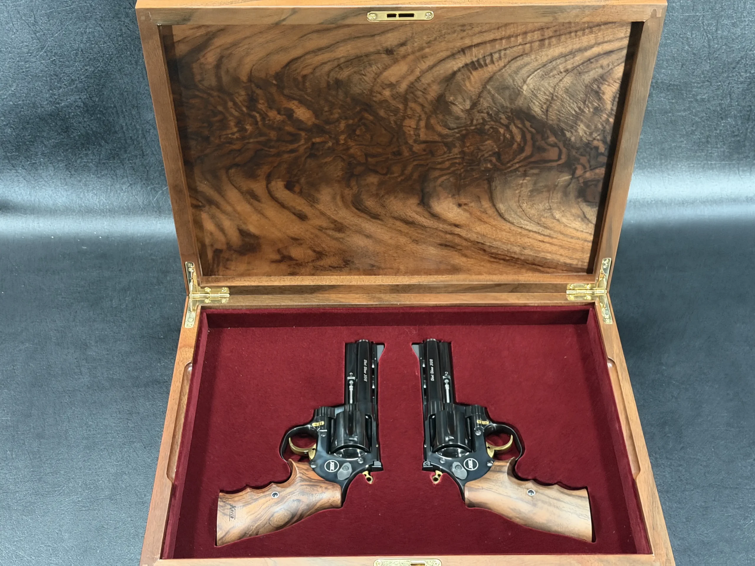 A matched pair of Korth revolvers created for SHOT Show 2018, the “Twins” Set is chambered in .357 Magnum and finished as a coordinated presentation duo. Deep black metalwork, gold-tone accents, figured walnut grips, and a fitted wood display case complete the set.