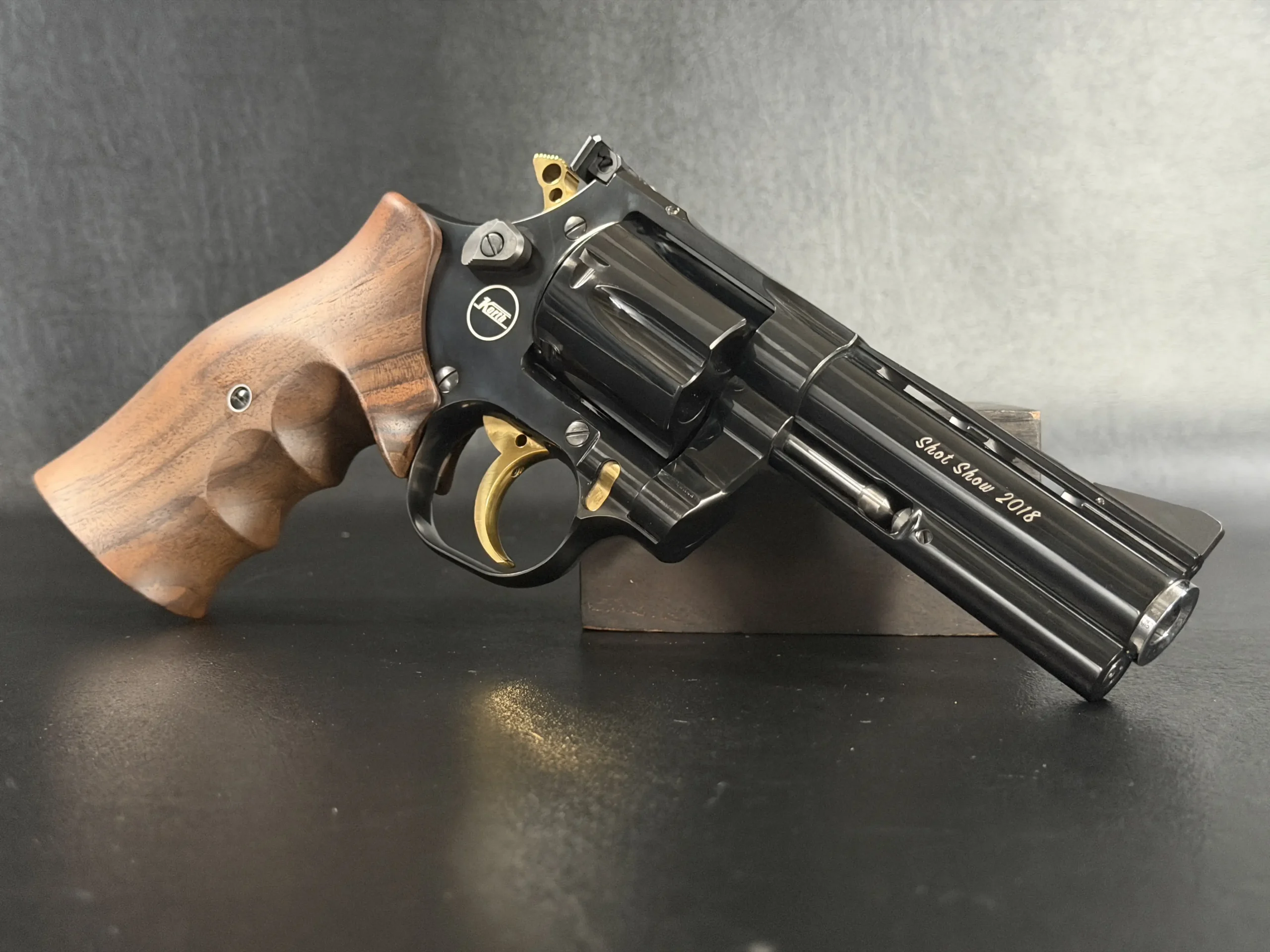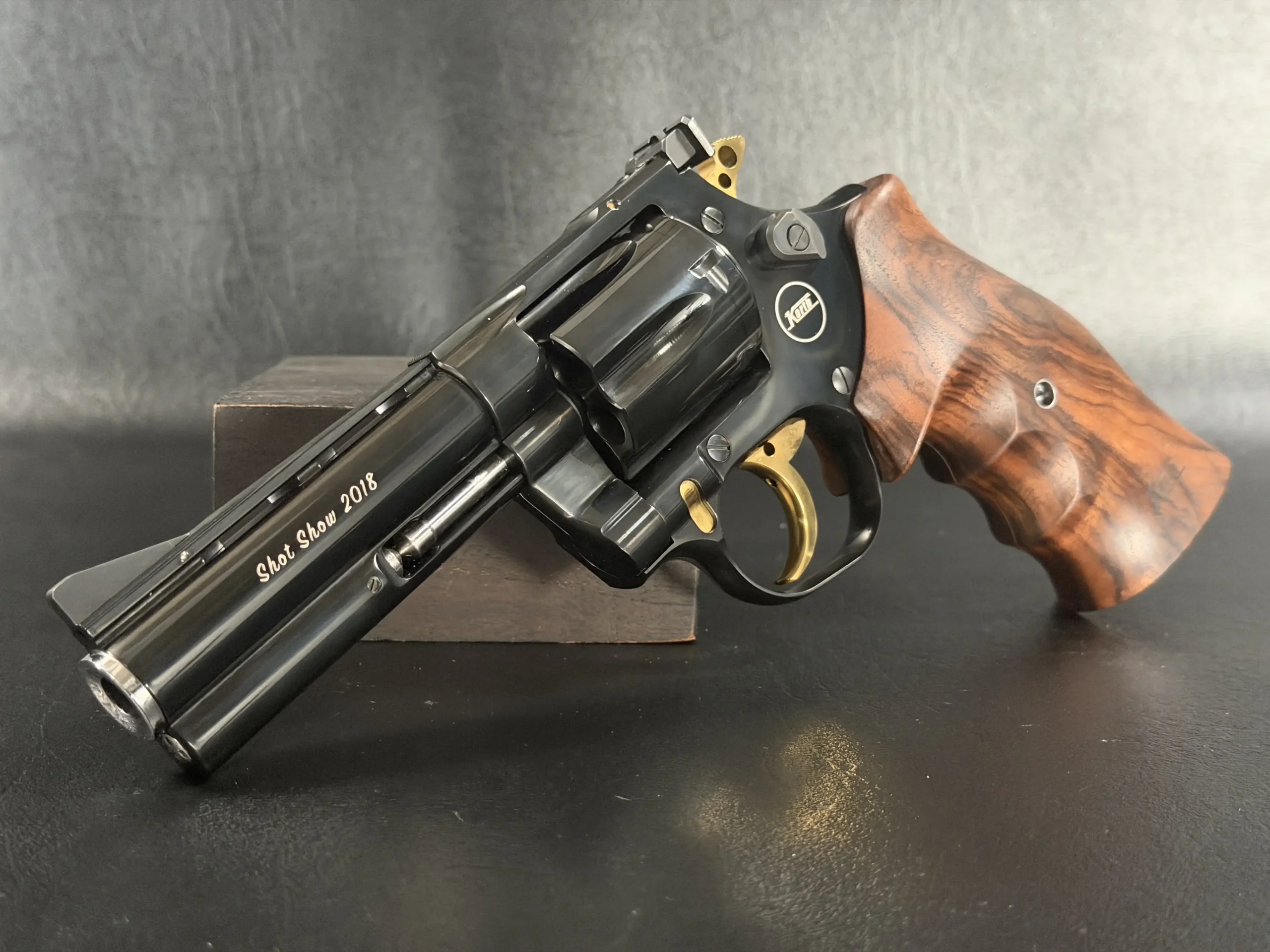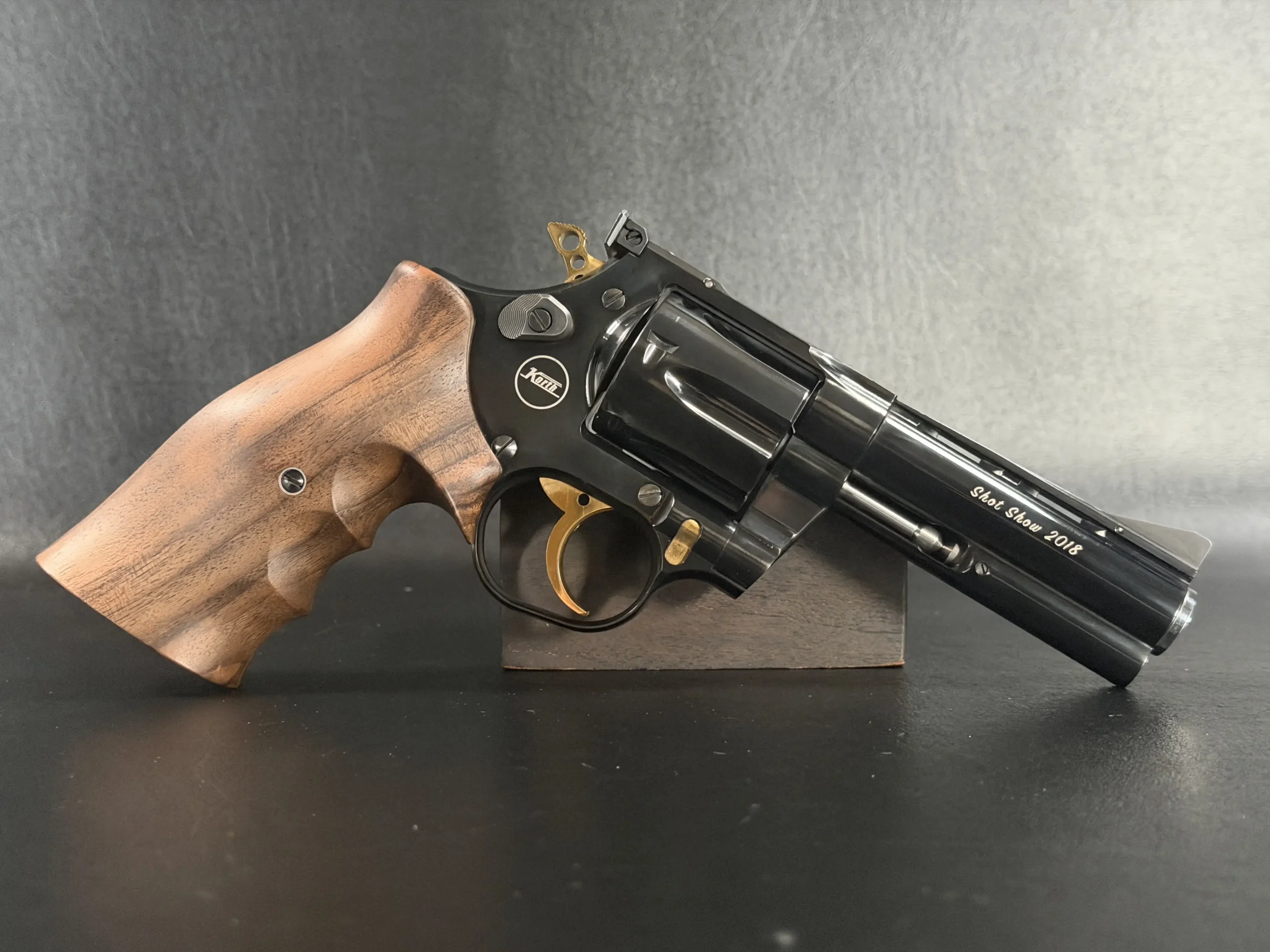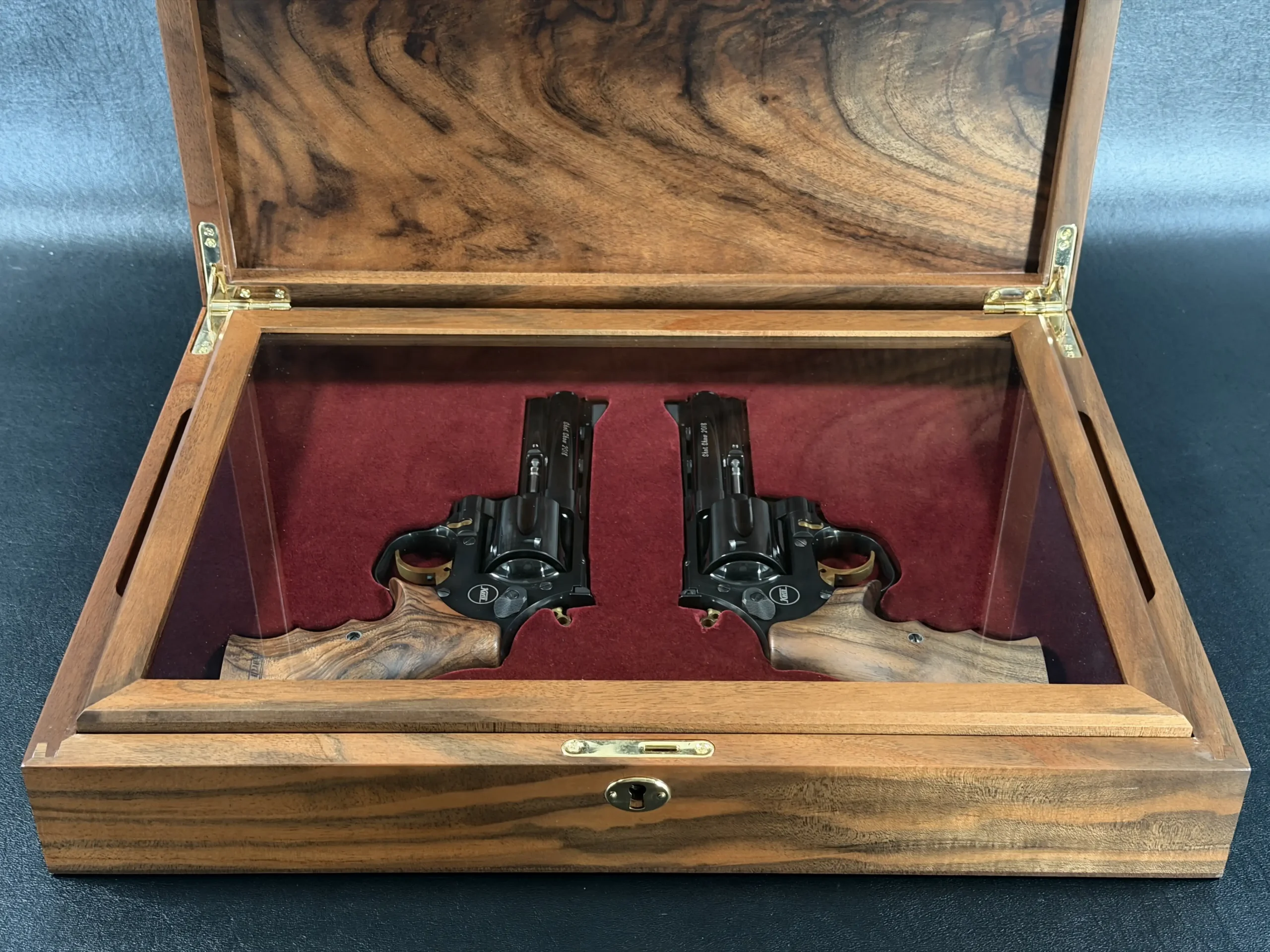 A matched pair of Korth revolvers created for SHOT Show 2018, the “Twins” Set is chambered in .357 Magnum and finished as a coordinated presentation duo. Deep black metalwork, gold-tone accents, figured walnut grips, and a fitted wood display case complete the set.