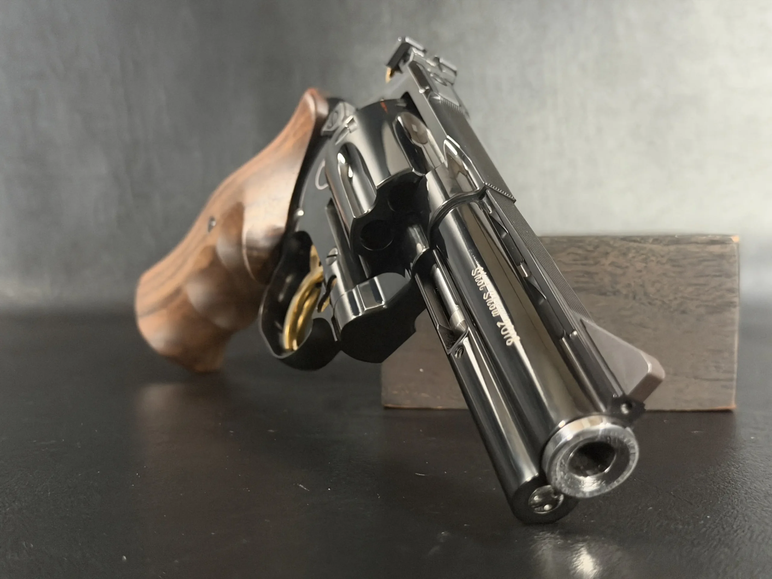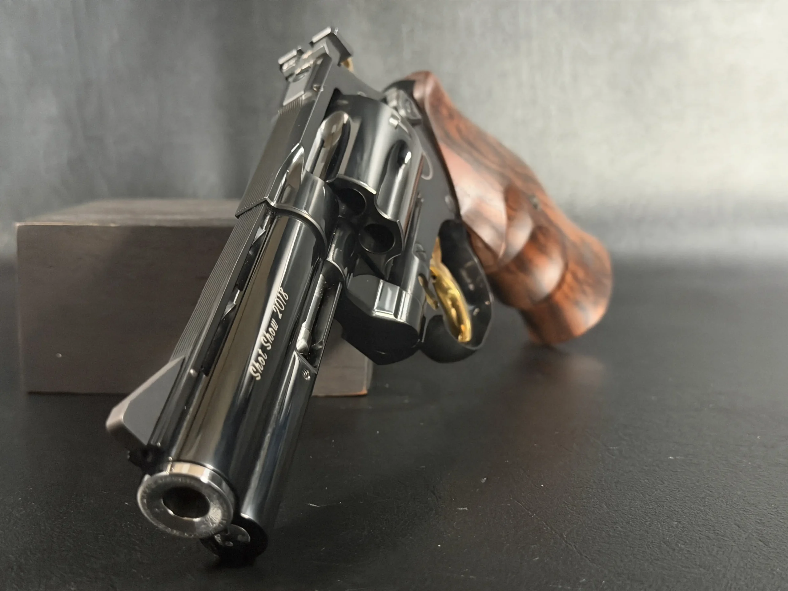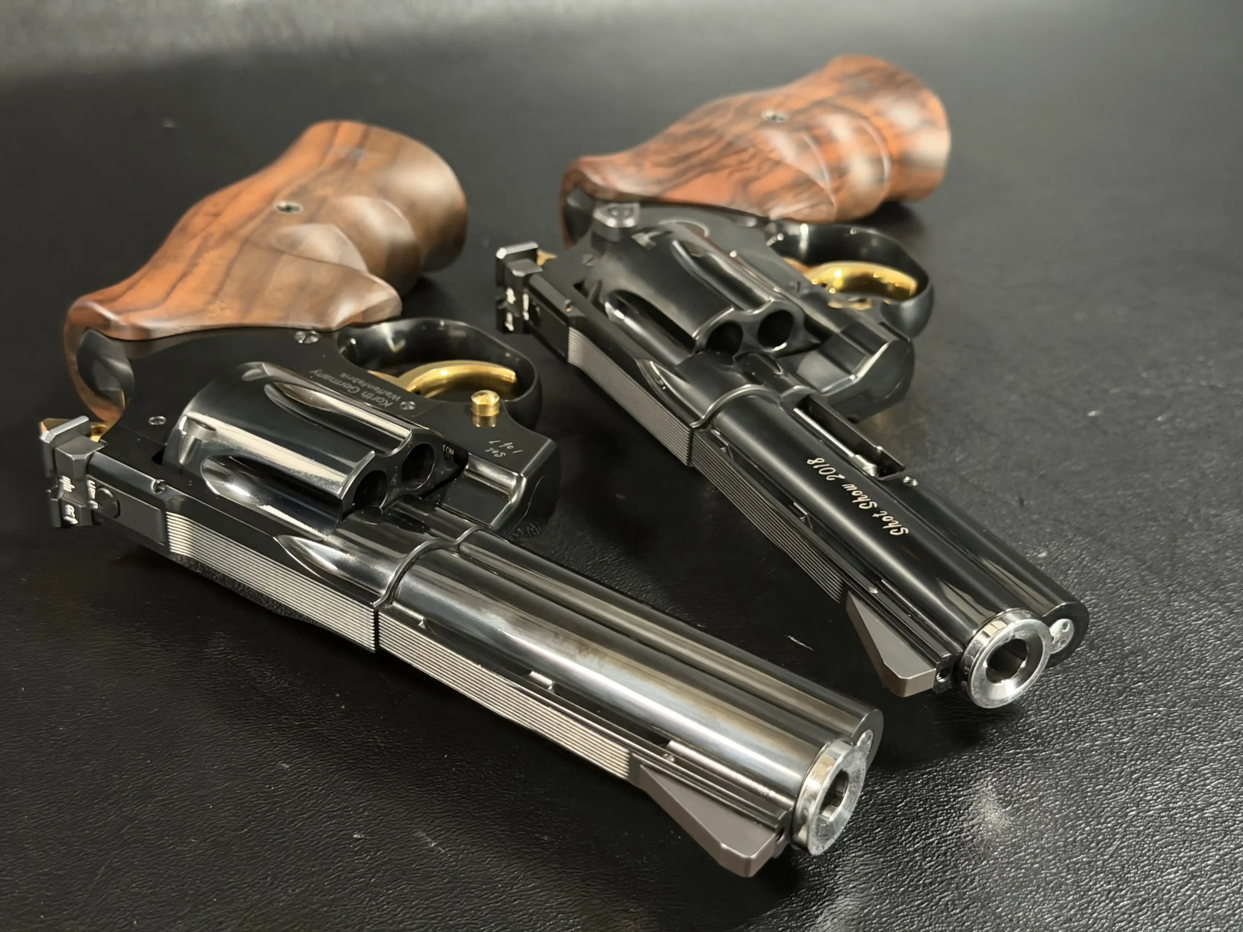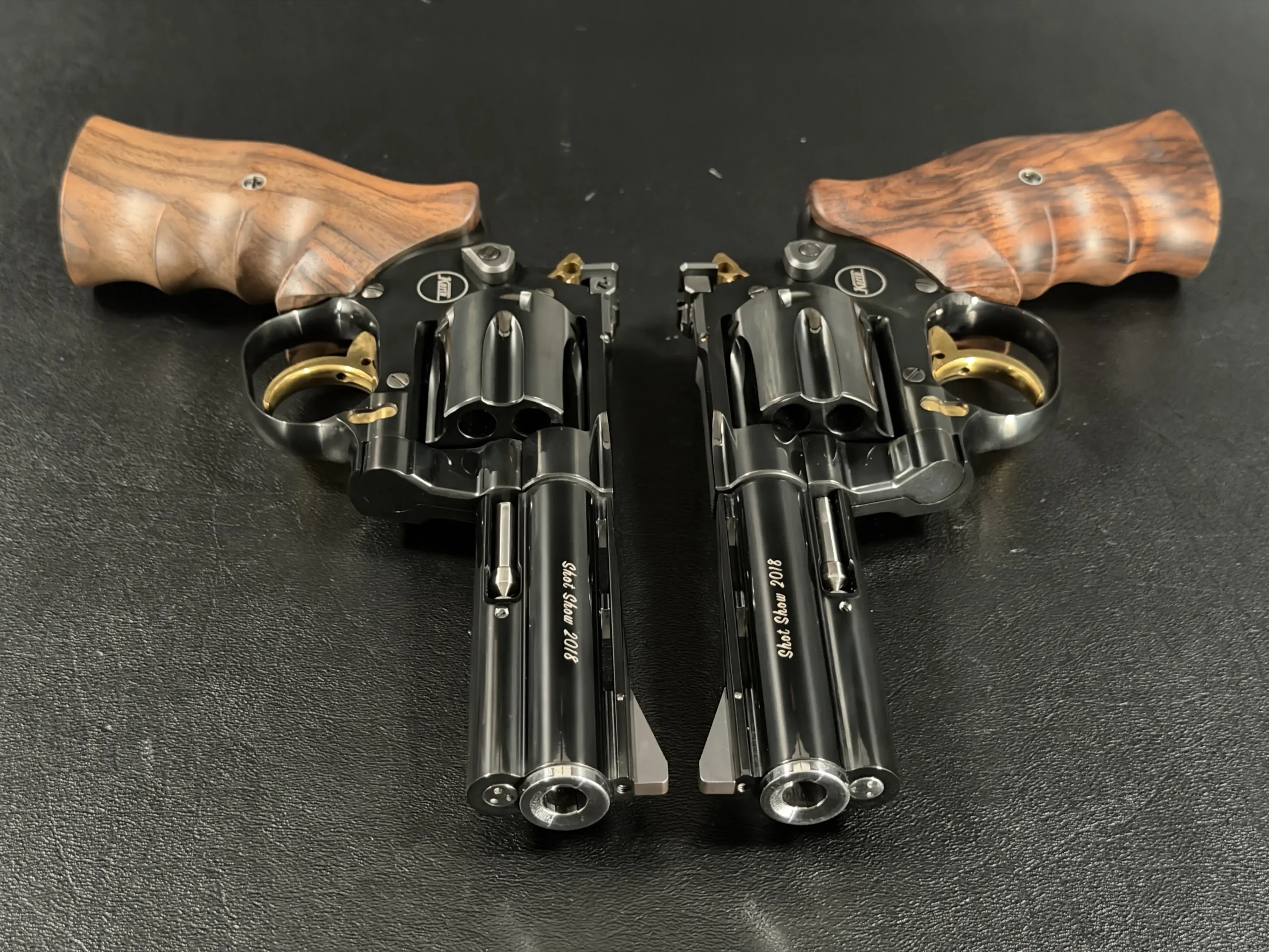 The barrels are marked “SHOT Show 2018,” tying the set directly to its exhibition presentation. Together, the coordinated finish, mirrored styling, and careful detailing create a unified display that reads as a complete set rather than two separate revolvers.