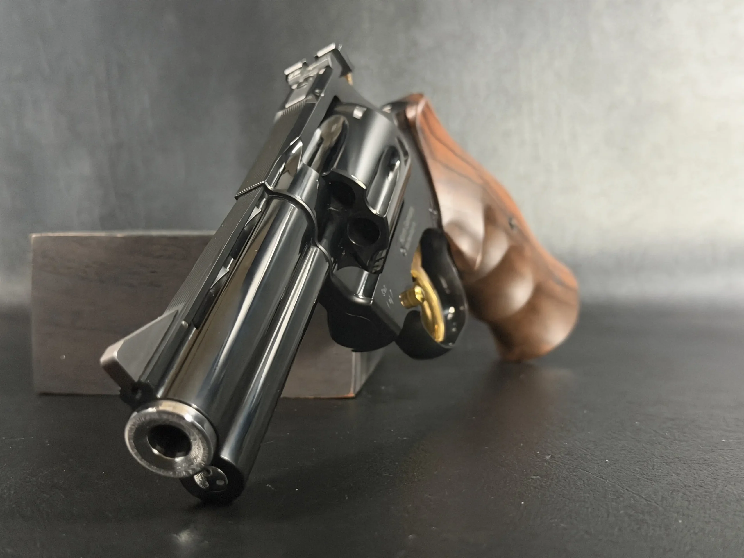 Each revolver features a deep black high-luster finish accented by gold-tone details on the triggers and select controls. Finely figured walnut grips with ergonomic finger grooves add warmth and contrast, with complementary grain patterns that reinforce the matched-set concept while giving each revolver its own visual identity.