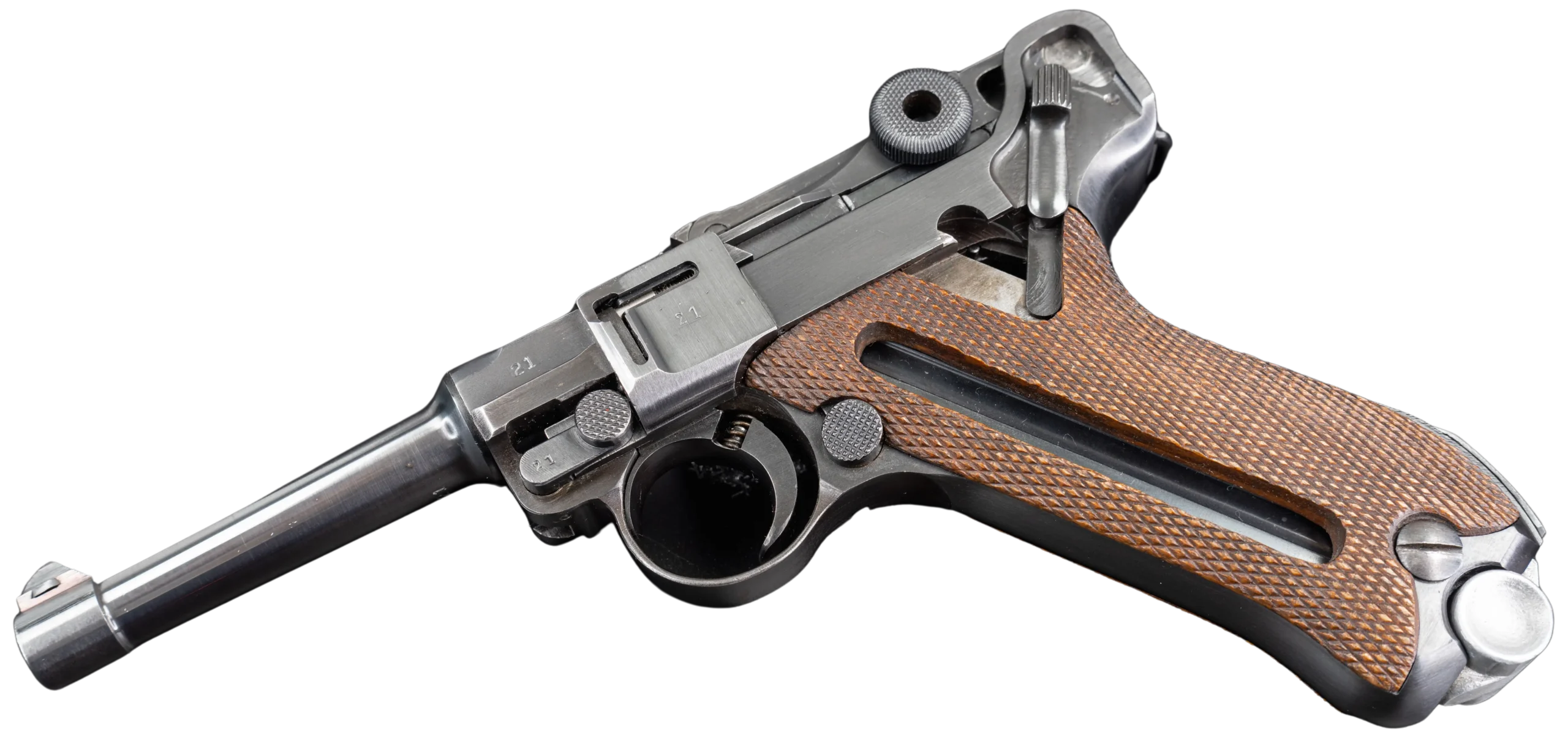 A Mauser Factory Cutaway Luger chambered in 9mm, created to display the internal mechanics of the P.08 toggle-lock system. Cleanly sectioned to reveal key components and their interaction, it offers strong appeal as both a study piece and a display firearm.