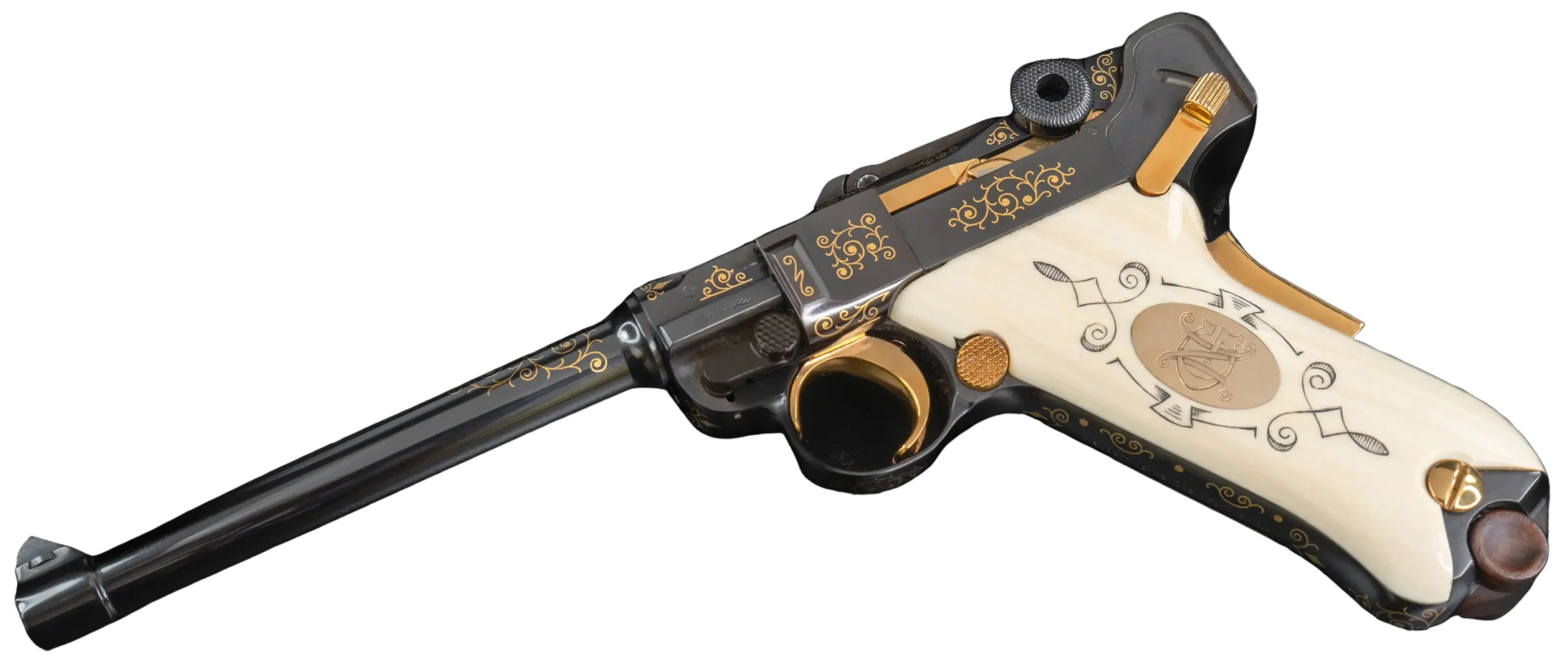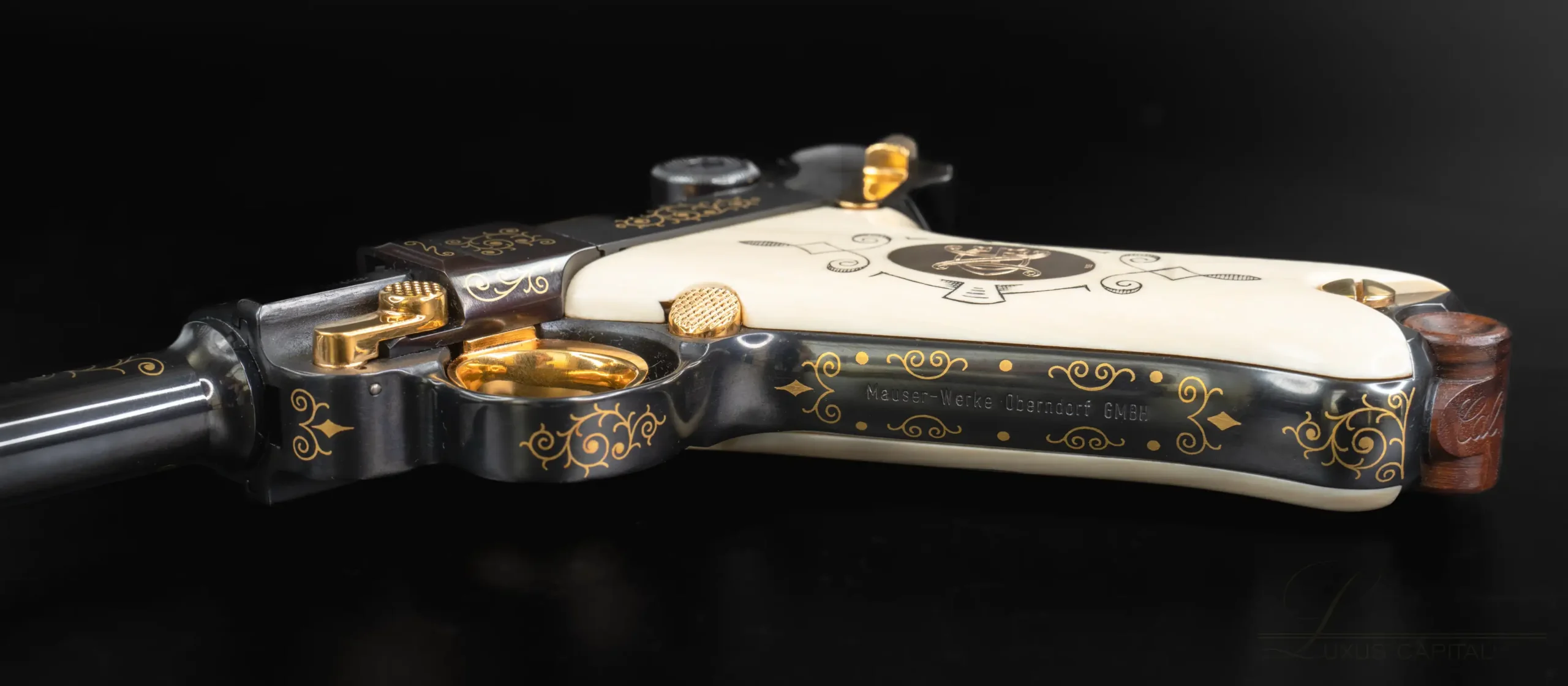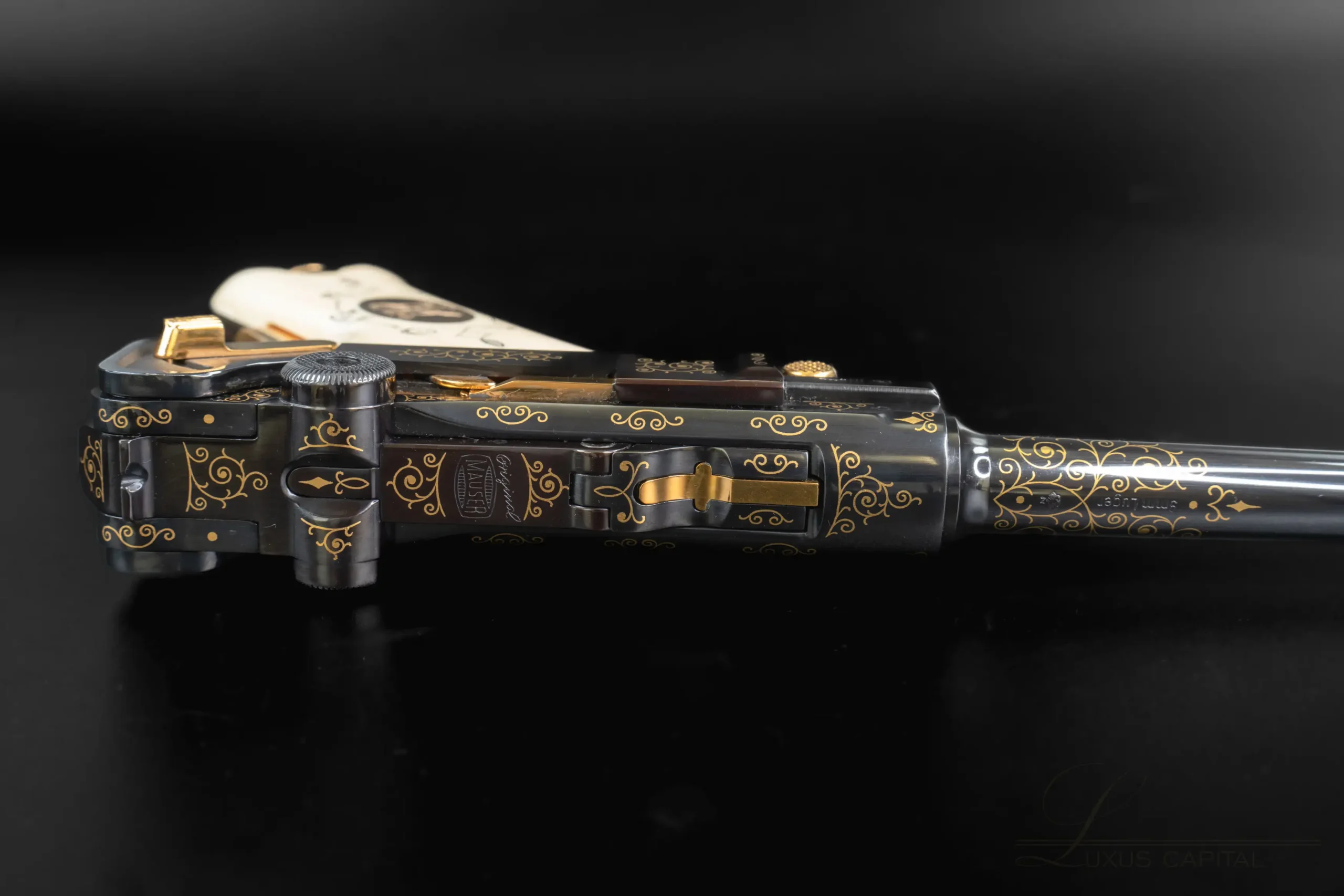 Ivory-tone grips add another distinctive element, finely polished and decorated with delicate scrollwork and a central medallion motif. The top of the toggle bears the Mauser banner, while additional decorative accents continue along the barrel and frame flats, giving the piece a fully realized presentation look.
