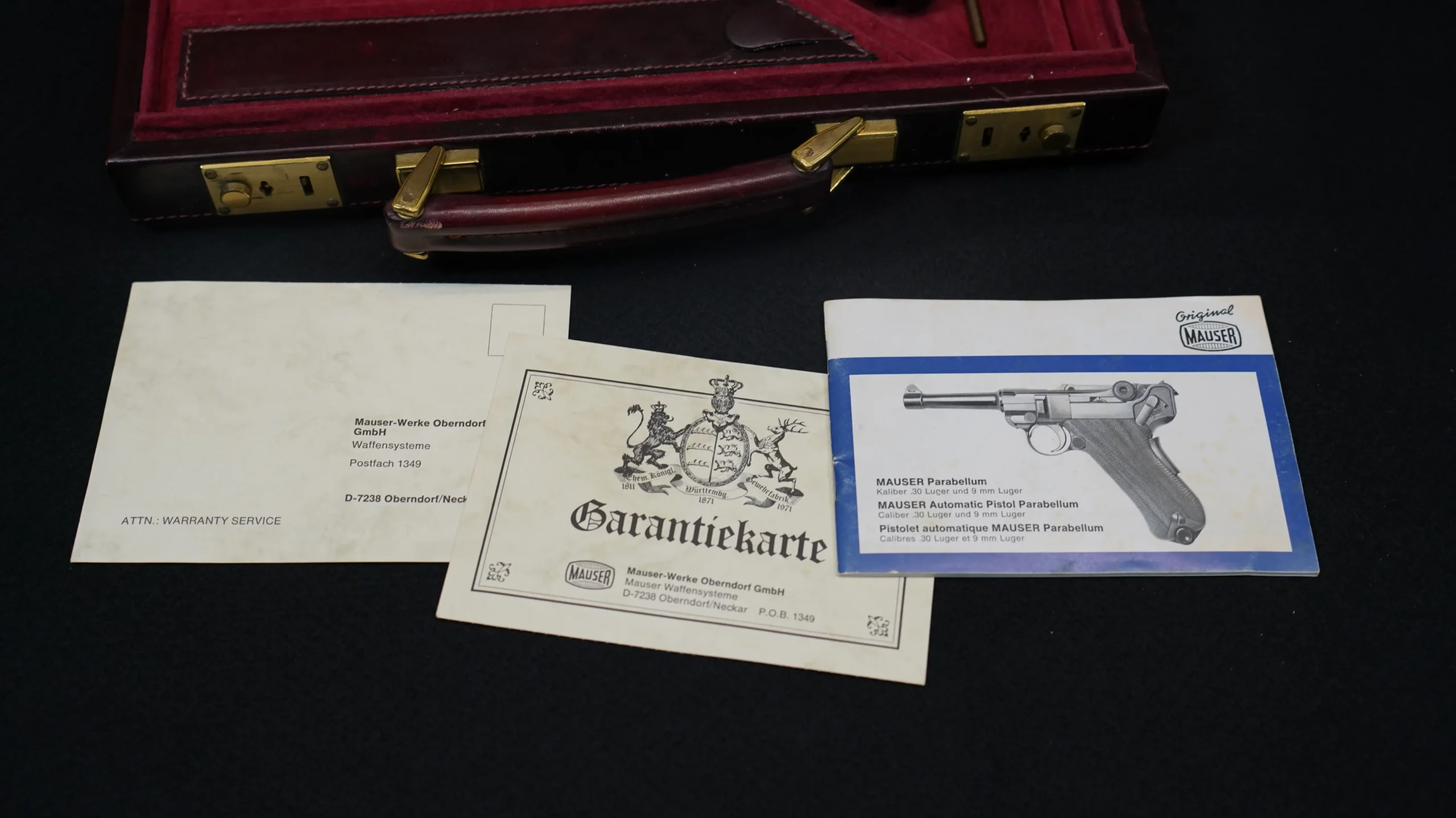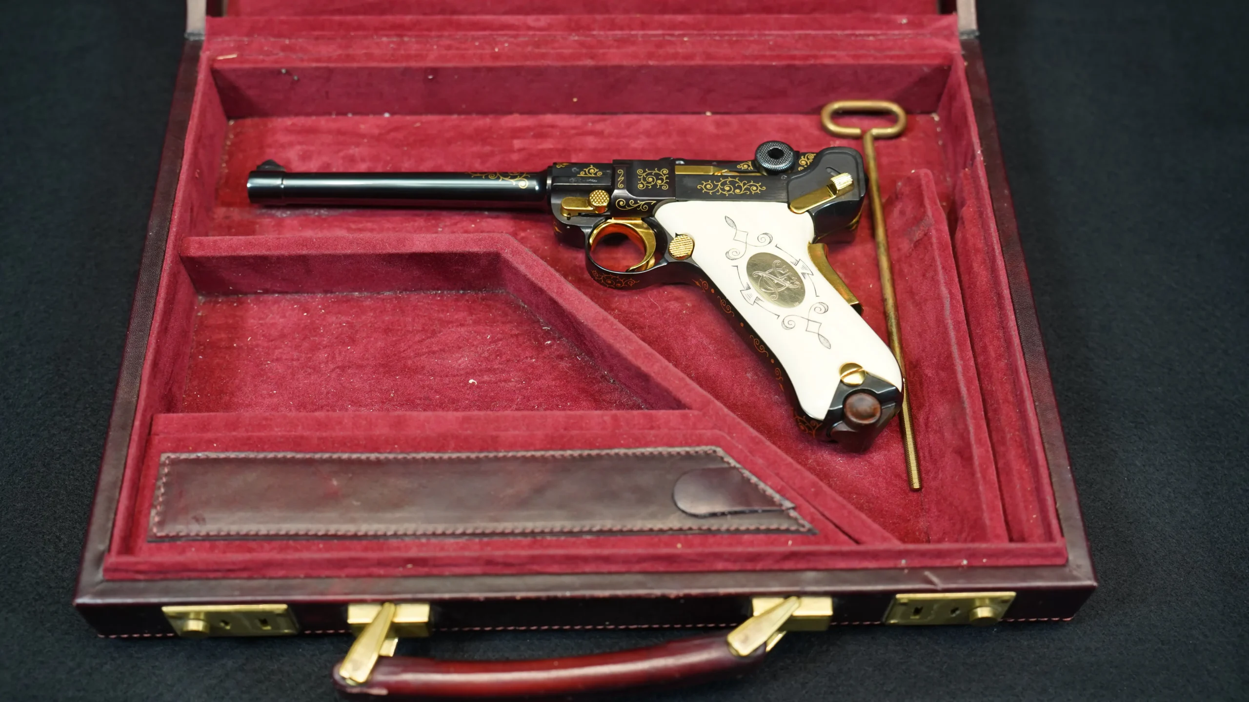 An exhibition case with rich red lining accompanies the pistol, along with period documentation and Mauser literature connected to the IWA OutdoorClassics tribute theme. Altogether, this piece brings together classic Luger design, Mauser styling, and exhibition-level decorative treatment in a highly distinctive presentation.