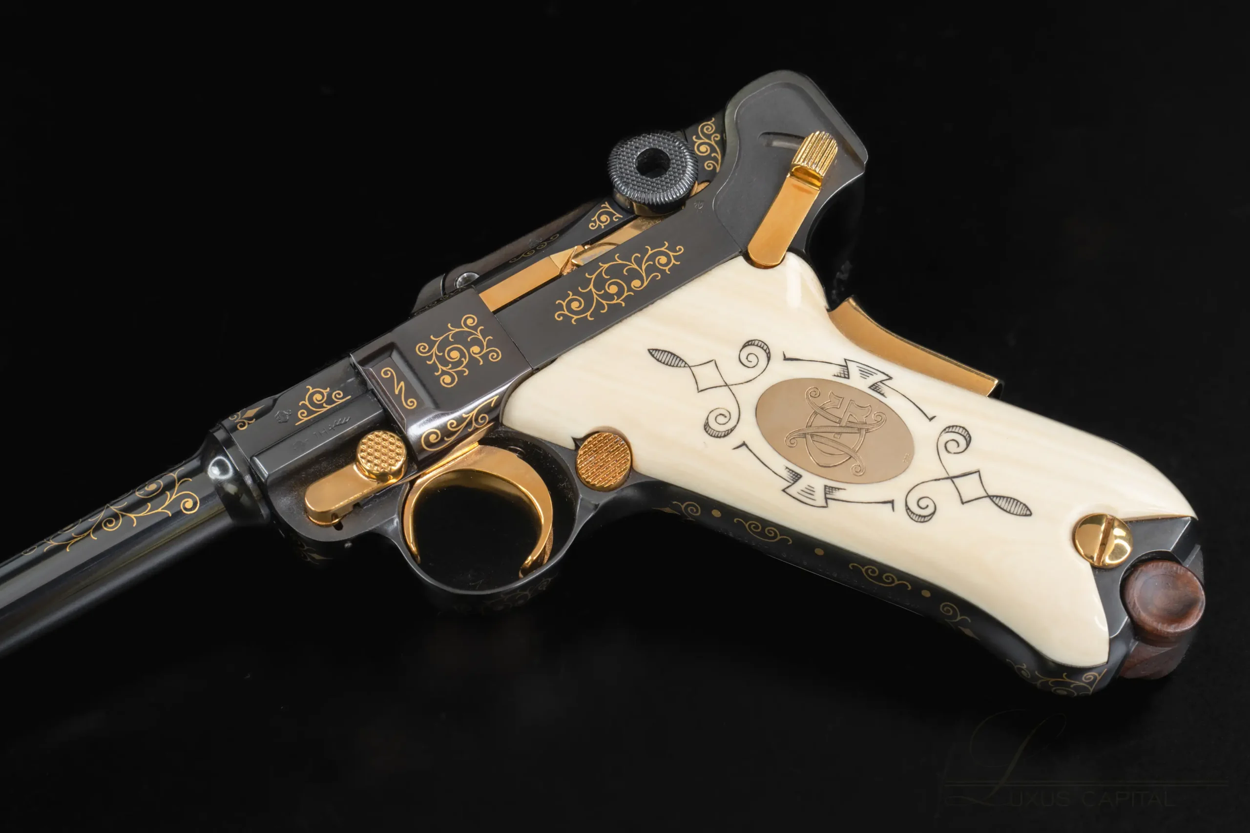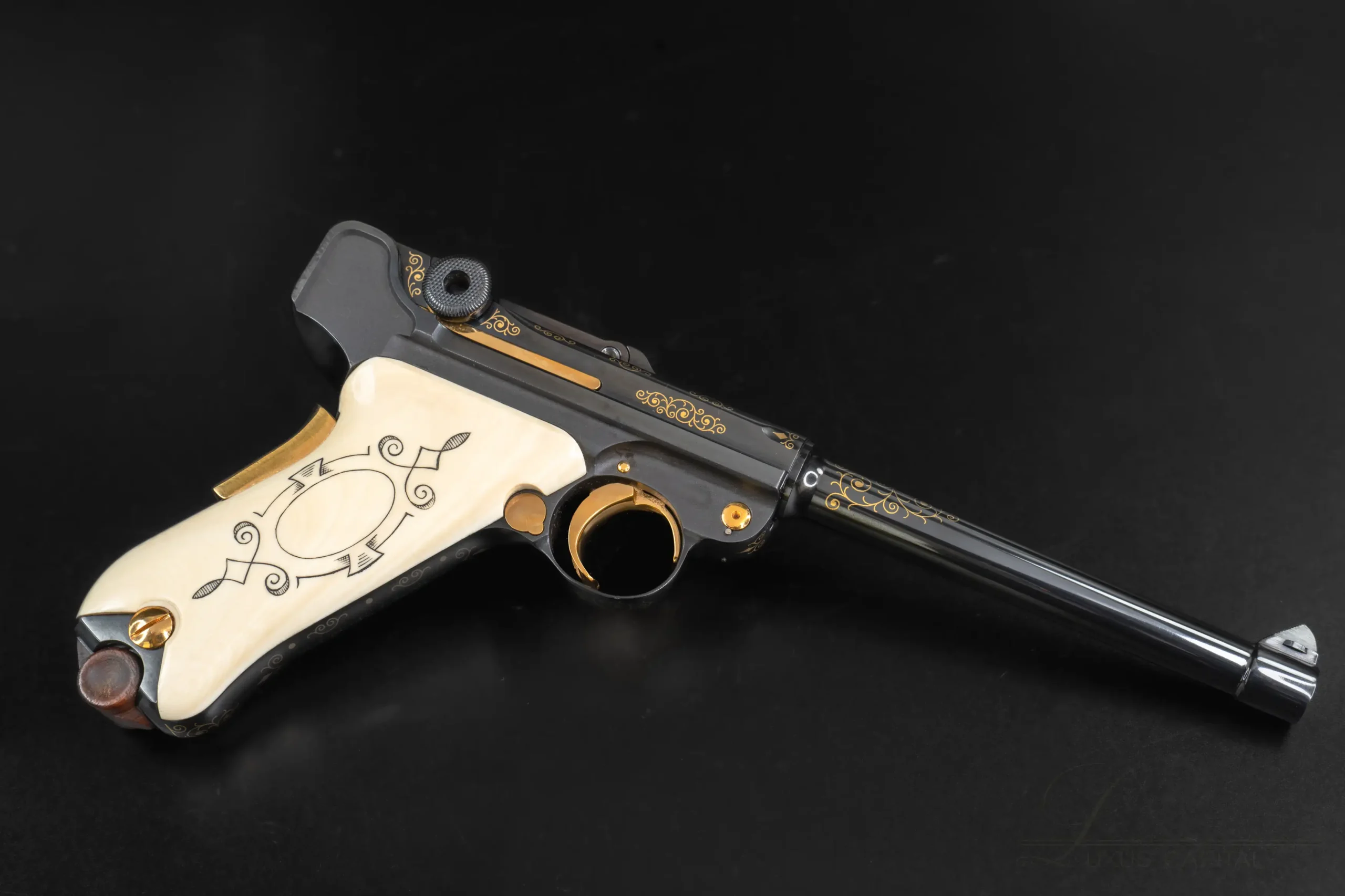 A tribute to the IWA OutdoorClassics exhibition, this Mauser IWA Luger Parabellum is chambered in 7.65mm and fitted with a 4-inch barrel. It features a high-polish blue finish, extensive gold scroll engraving, ivory-tone grips with a medallion motif, and an exhibition case with documentation and Mauser literature.