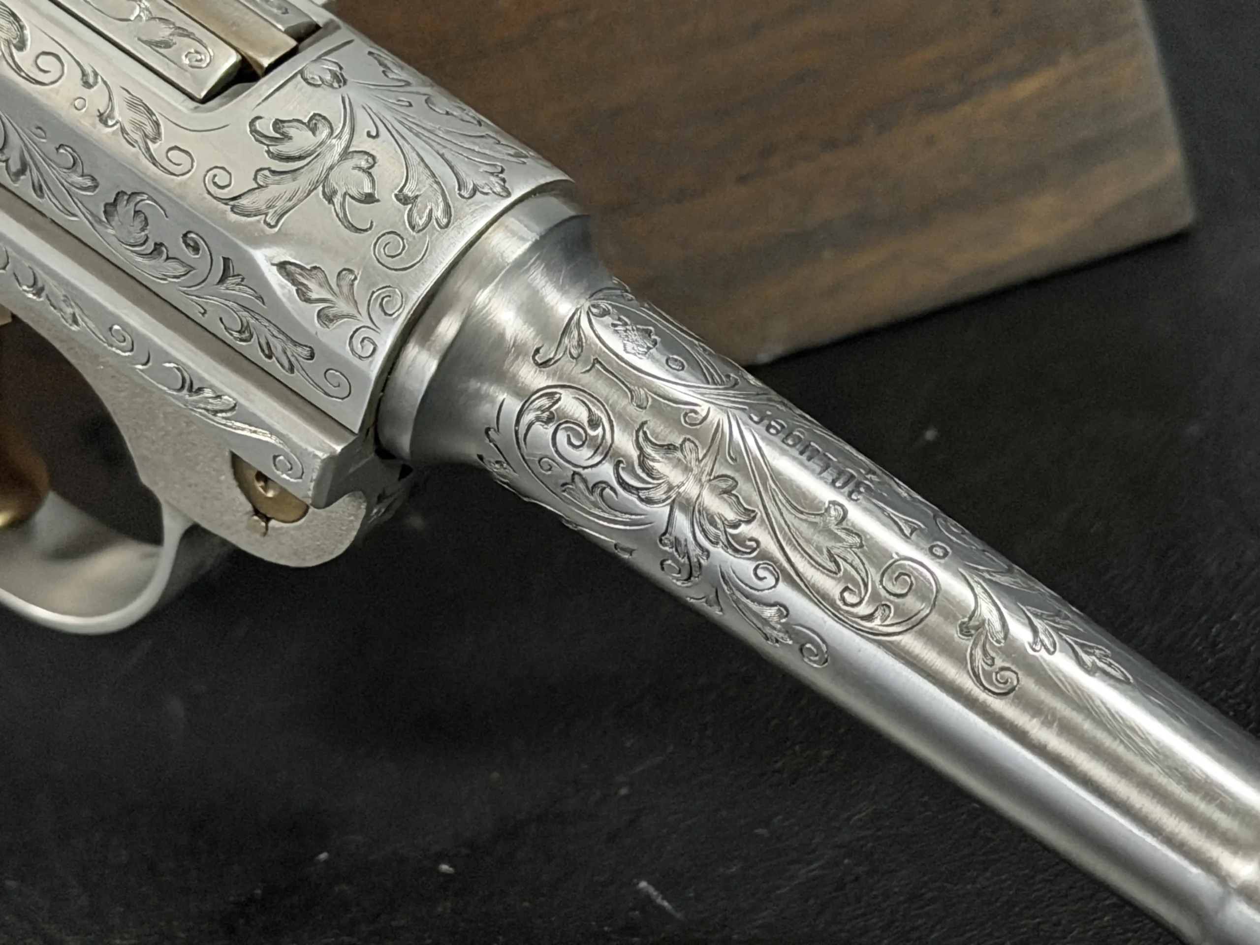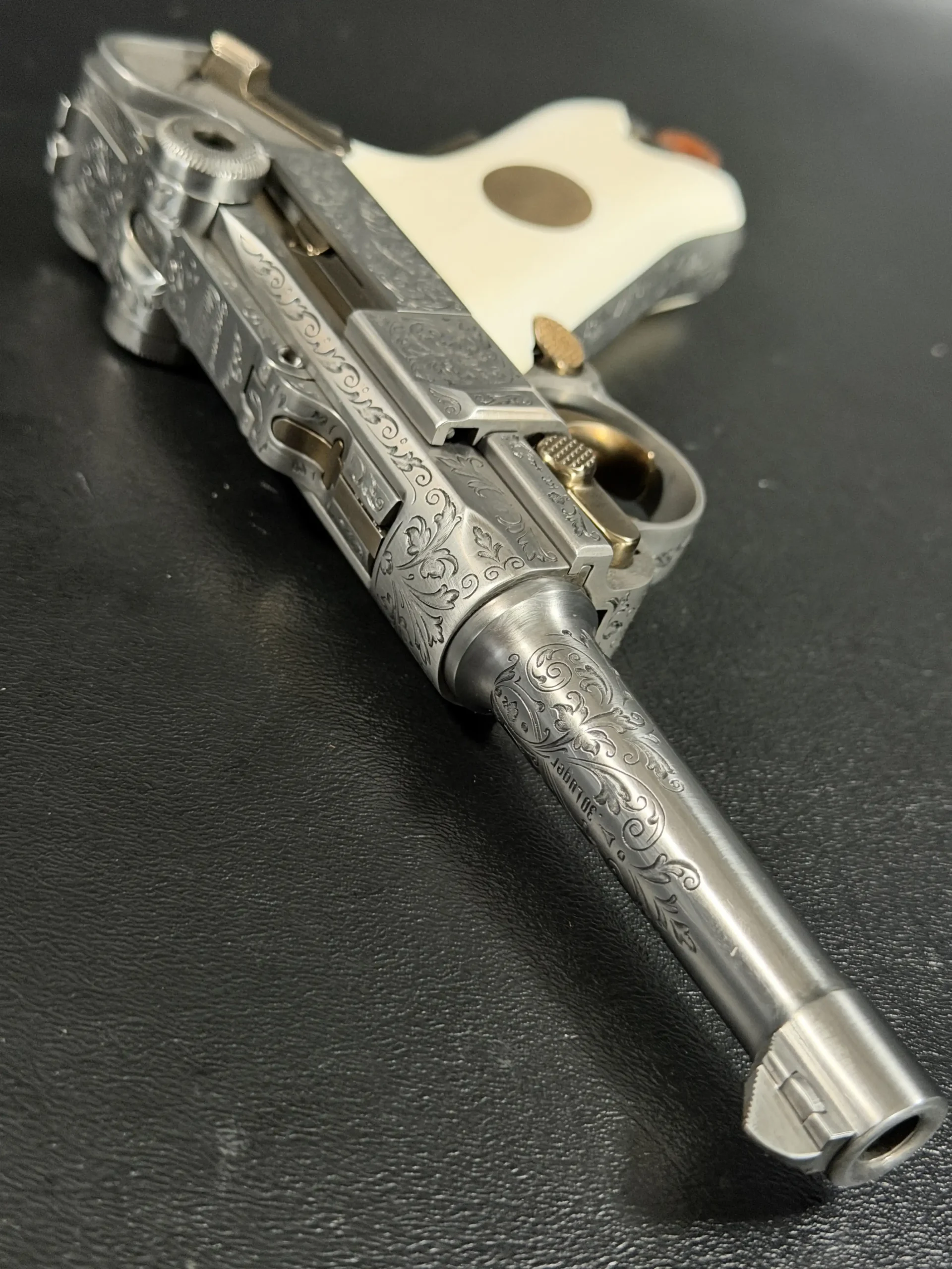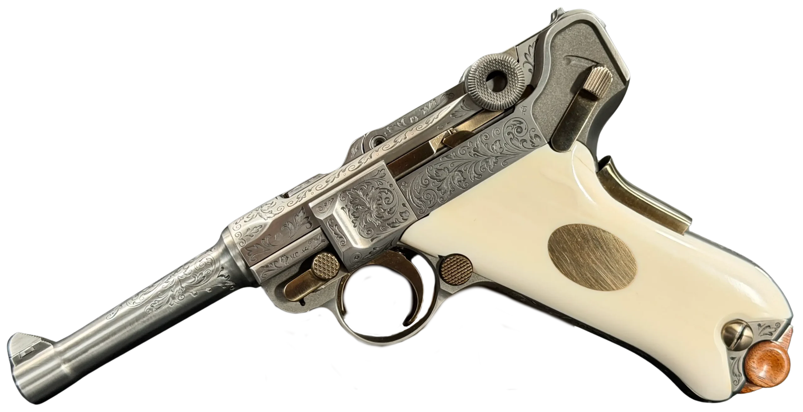 Created as a commemorative tribute to the 1984 IWA OutdoorClassics exhibition in Germany, this Mauser P08 brings together the classic Luger form with exhibition-style presentation. Chambered in 7.65mm Parabellum, it follows the familiar European commercial configuration associated with the platform’s early heritage.
