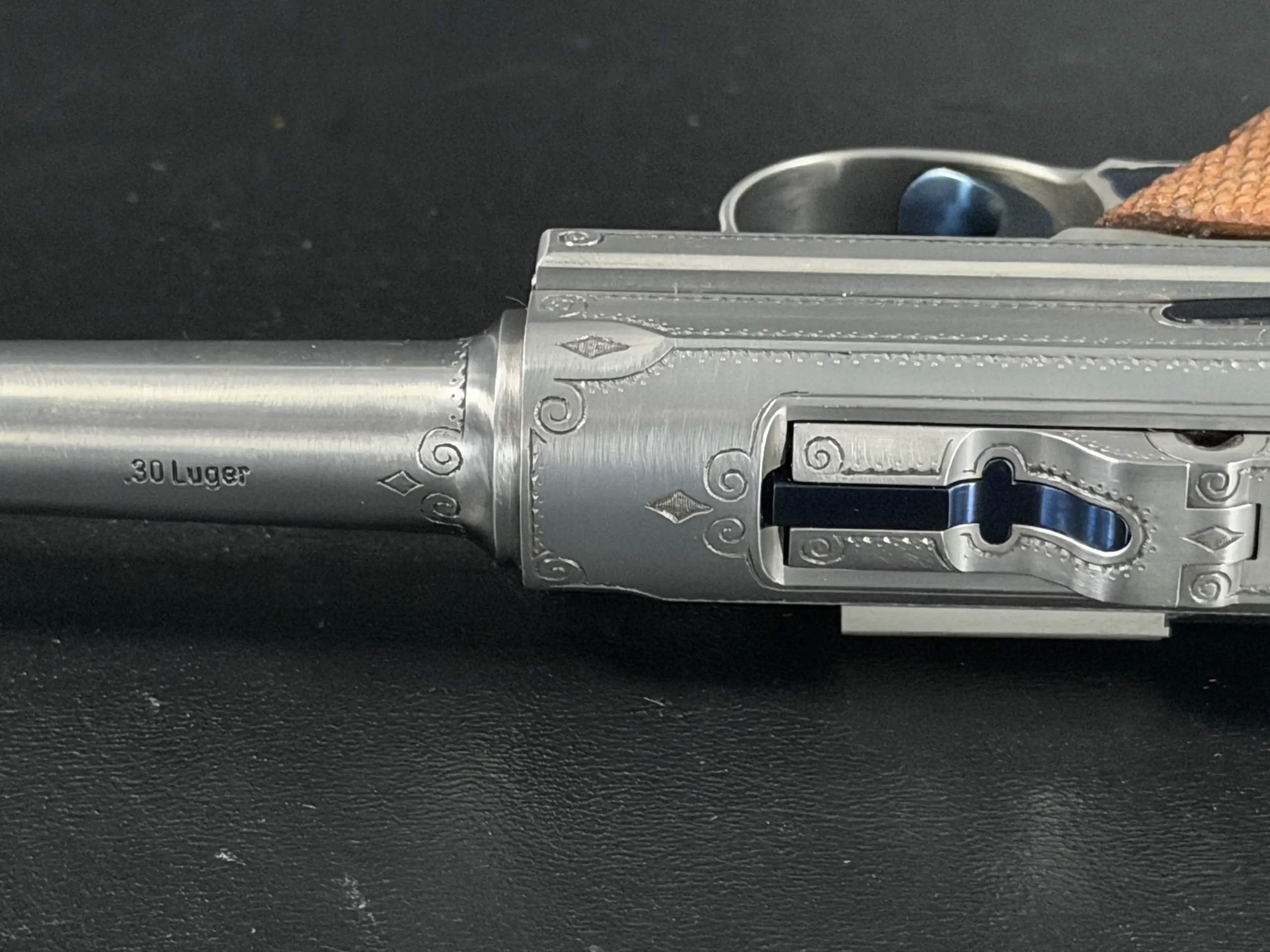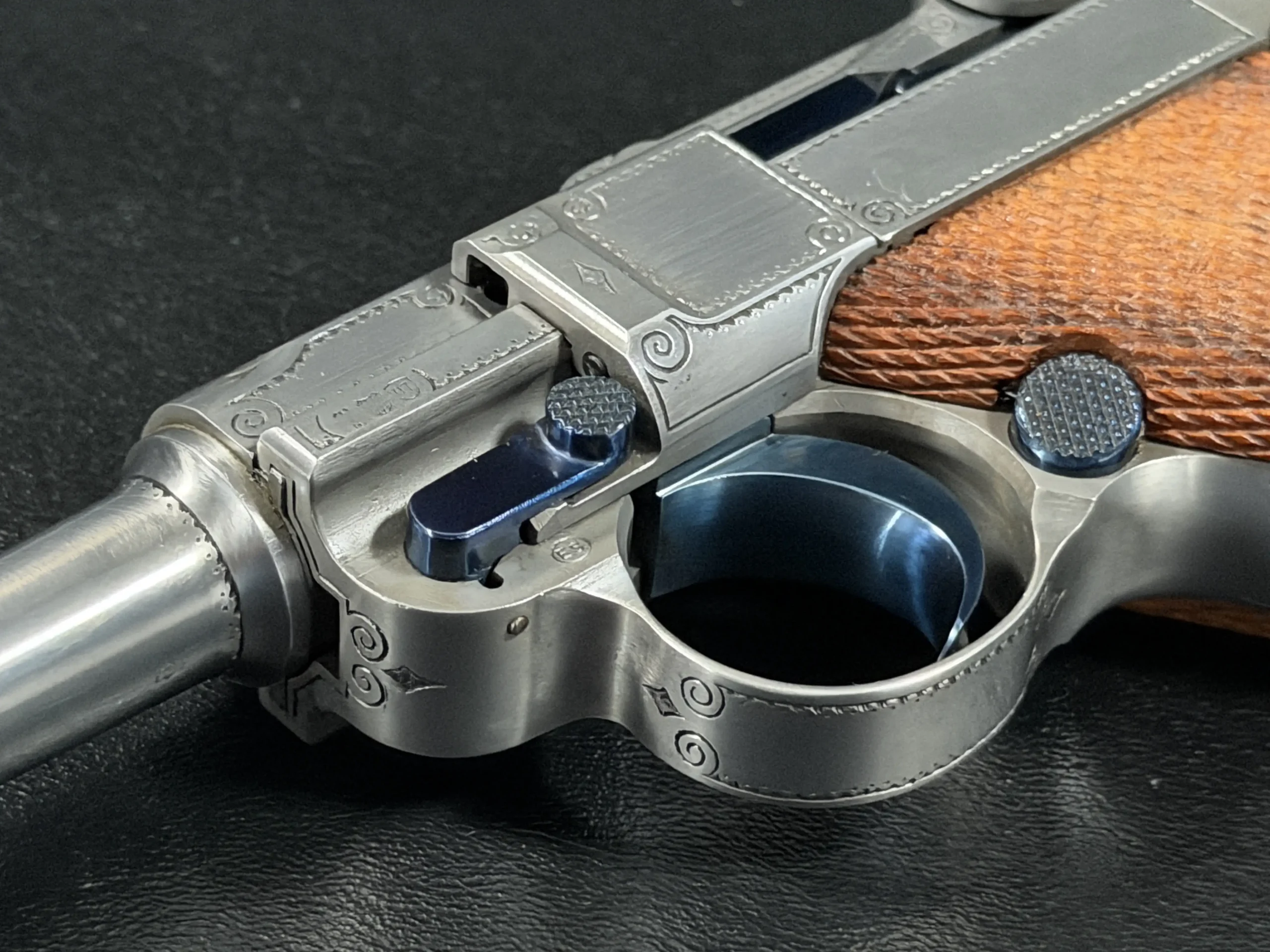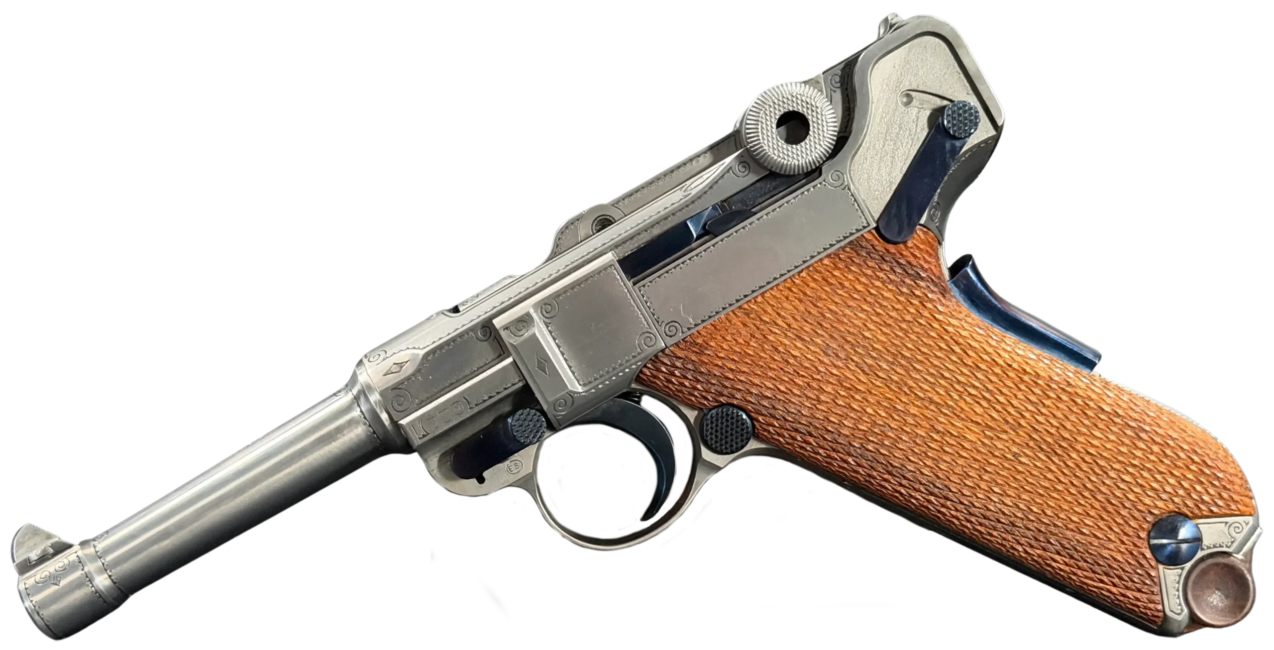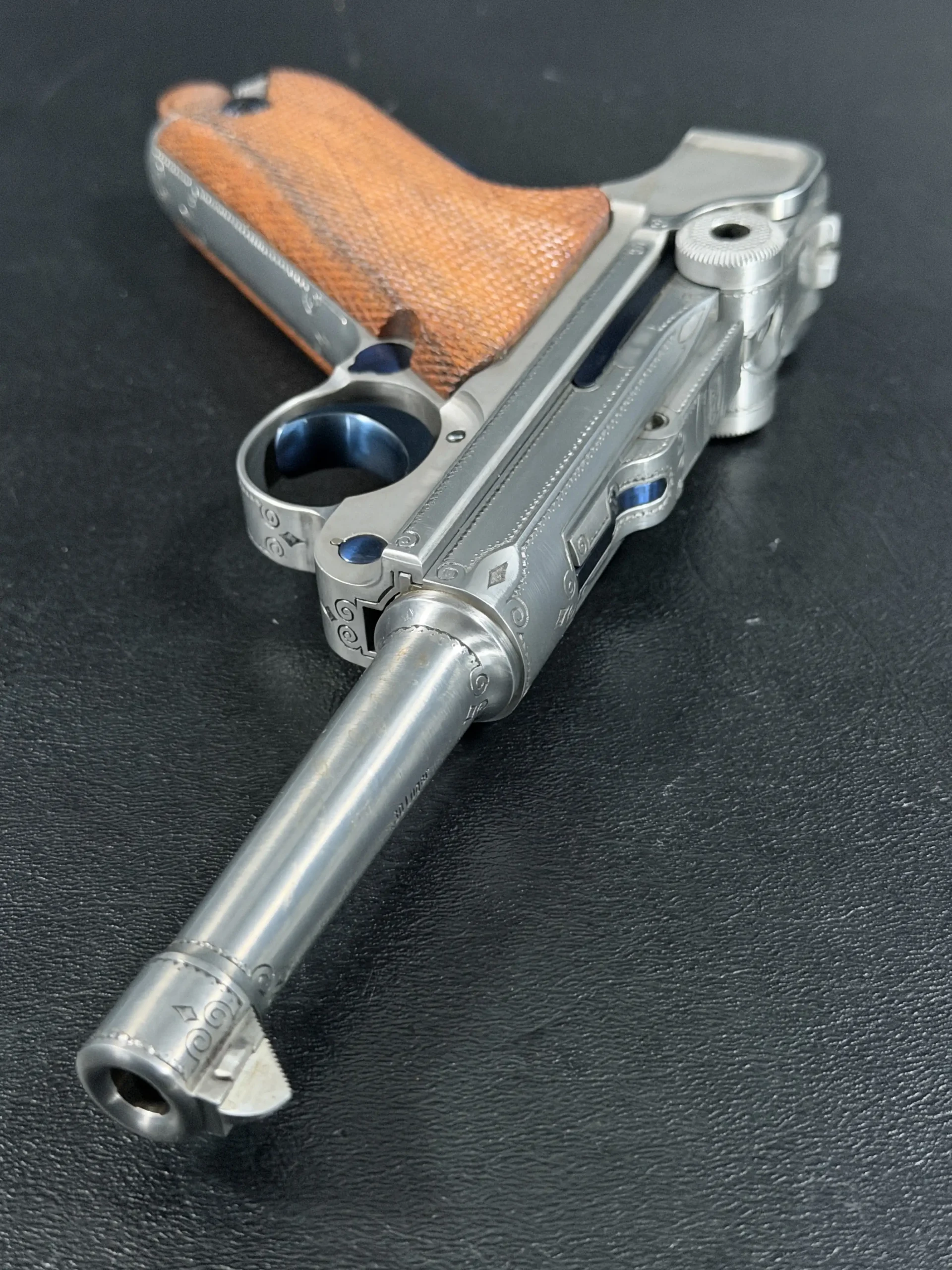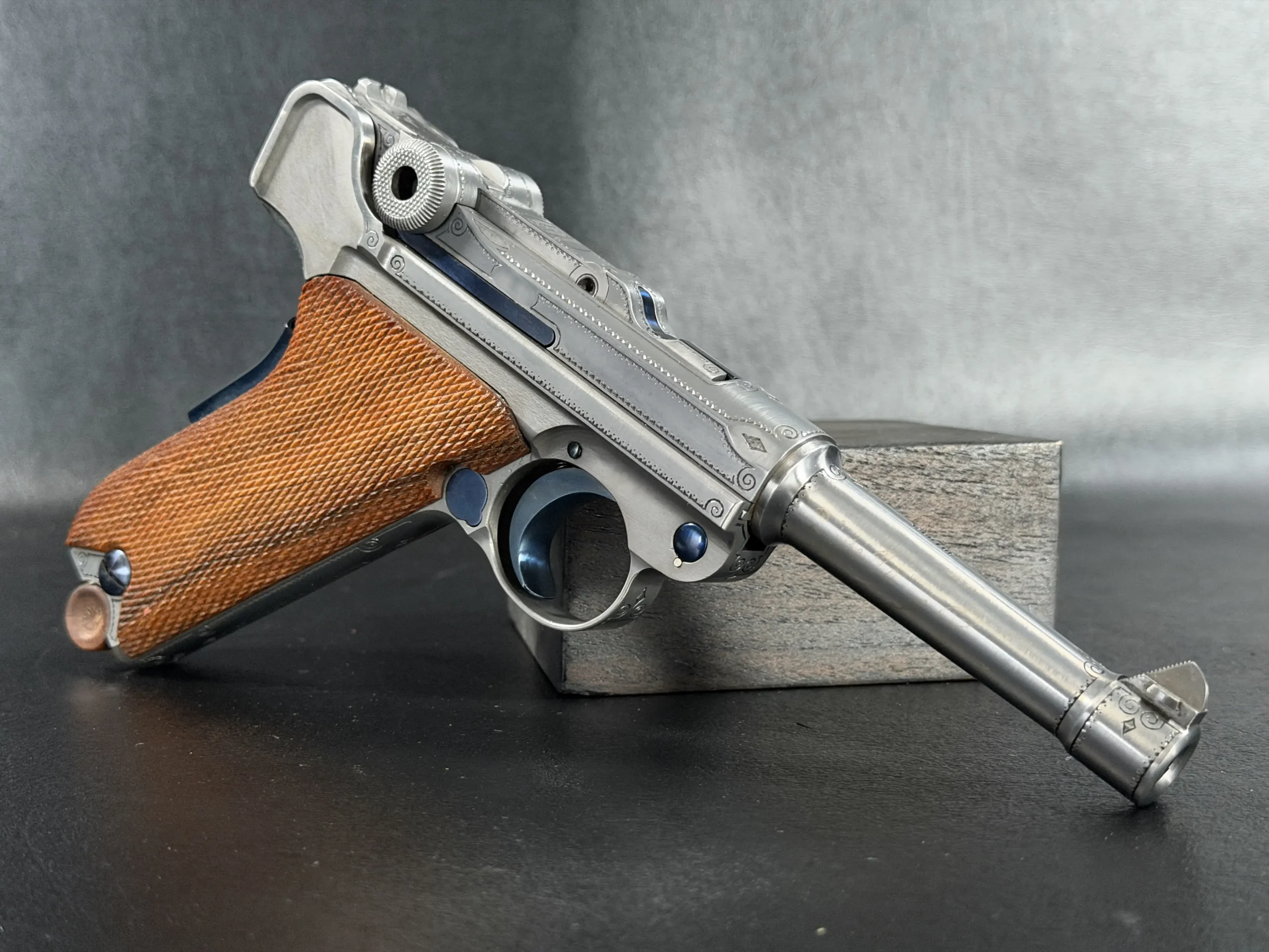 This presentation-oriented example pairs the classic P08 profile with refined decorative engraving. Delicate scrollwork frames the receiver, side plate, and barrel extension, while fine border work and small geometric accents highlight the lines of the pistol without overwhelming its form.