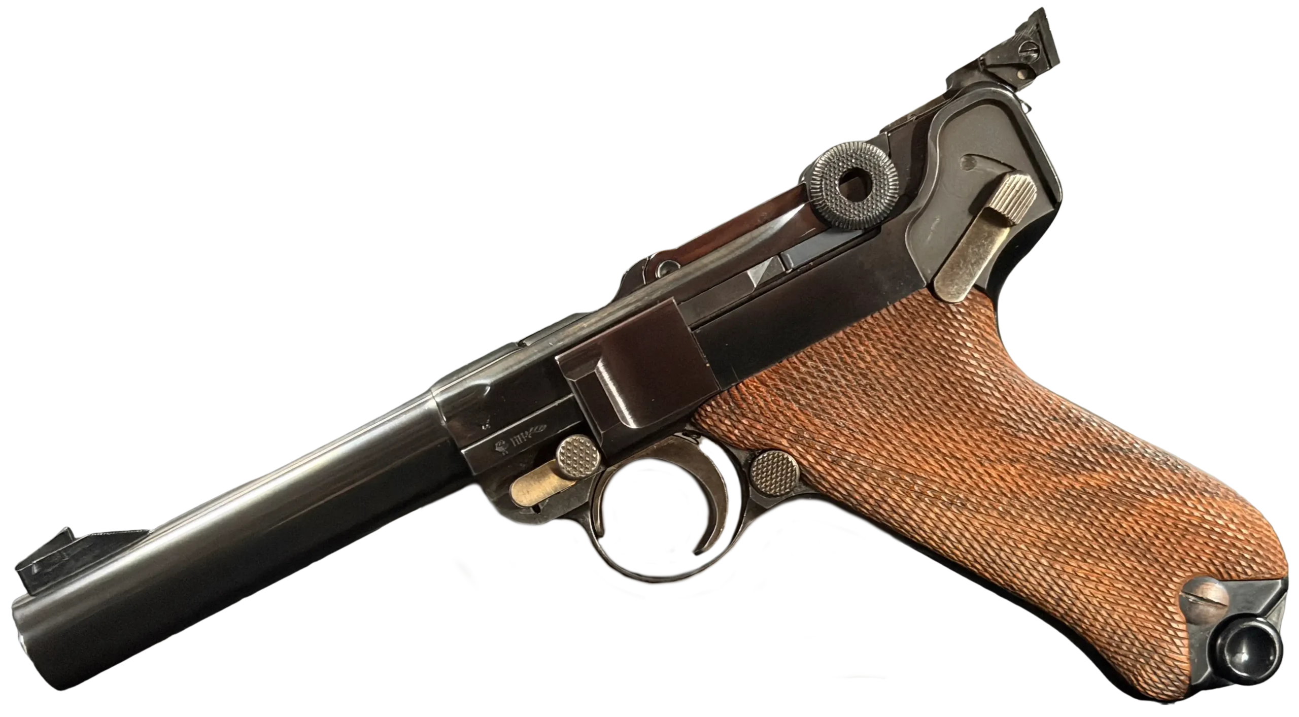 The Mauser Parabellum Sport 9mm is a long-barreled, target-oriented Luger with an adjustable rear sight, classic toggle-lock action, and checkered wood grips. Finished in deep blued steel, it blends traditional Parabellum styling with a sport-focused configuration.