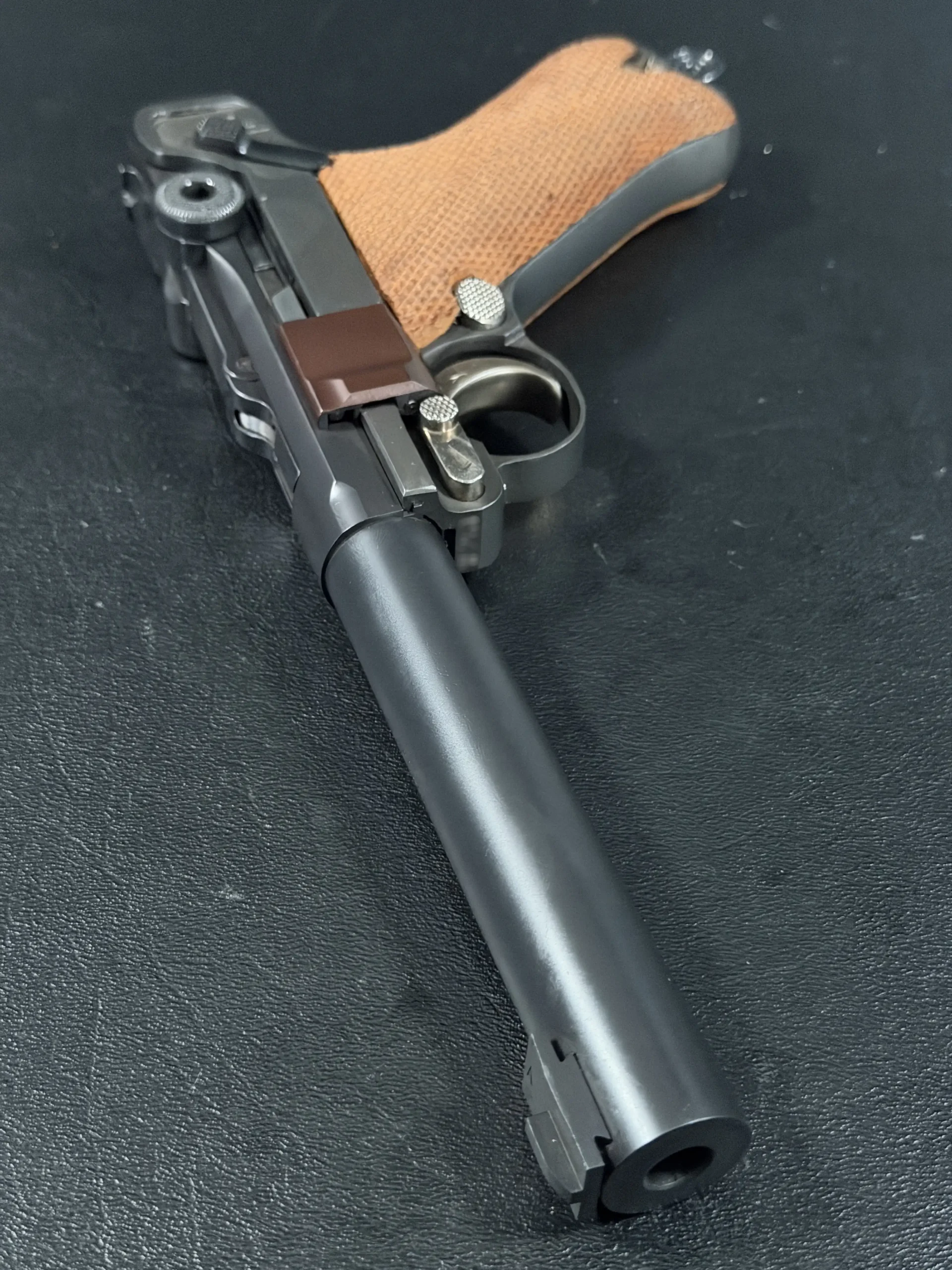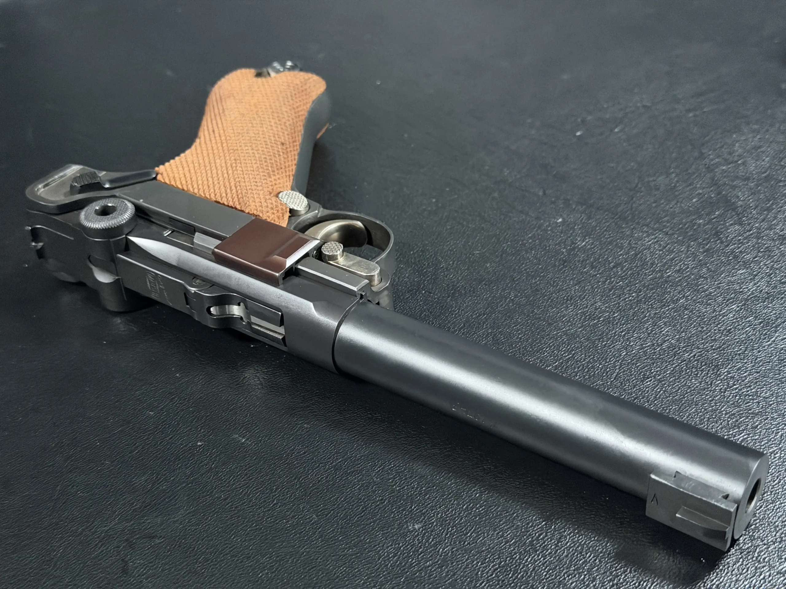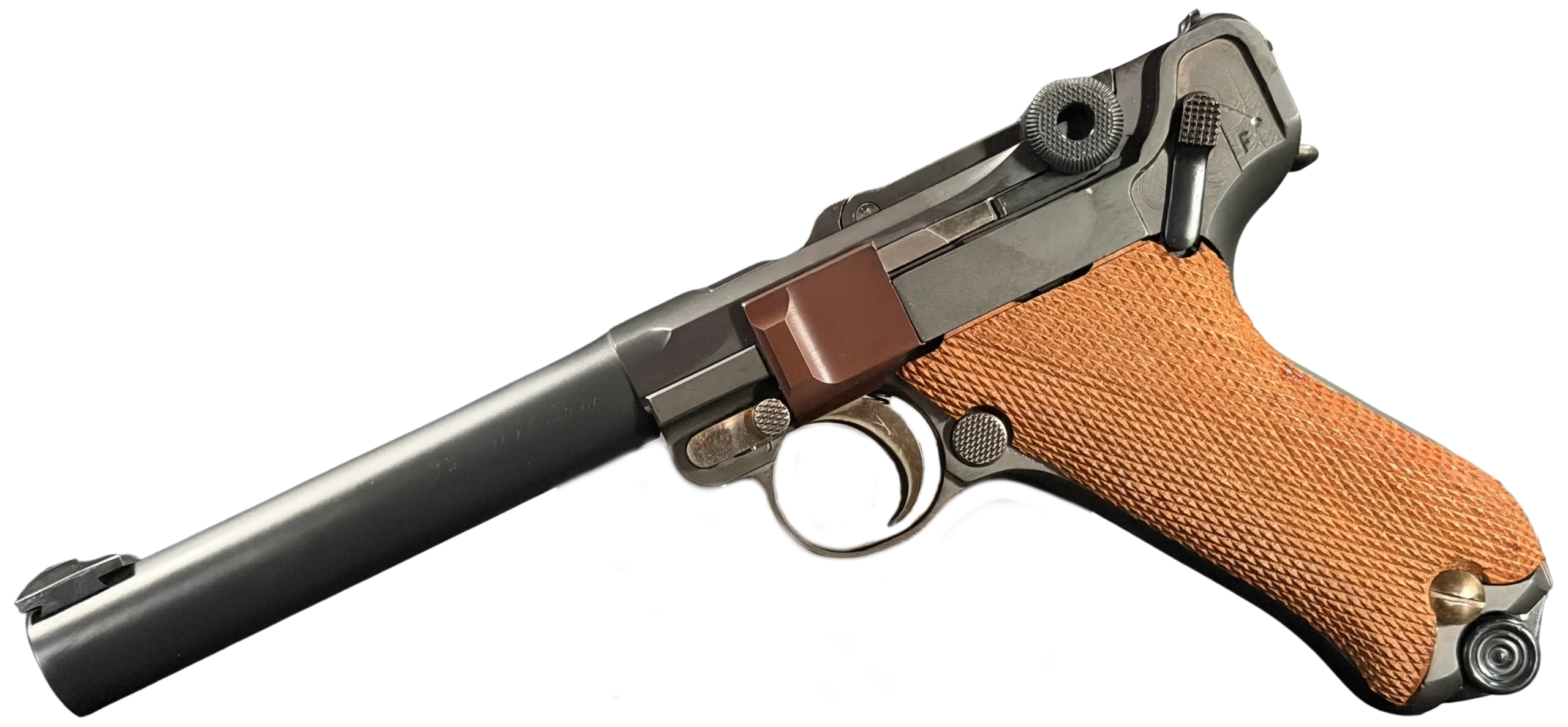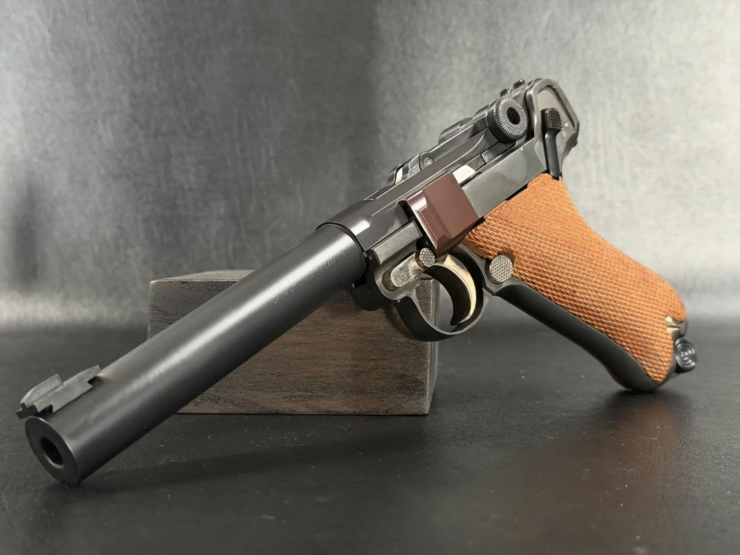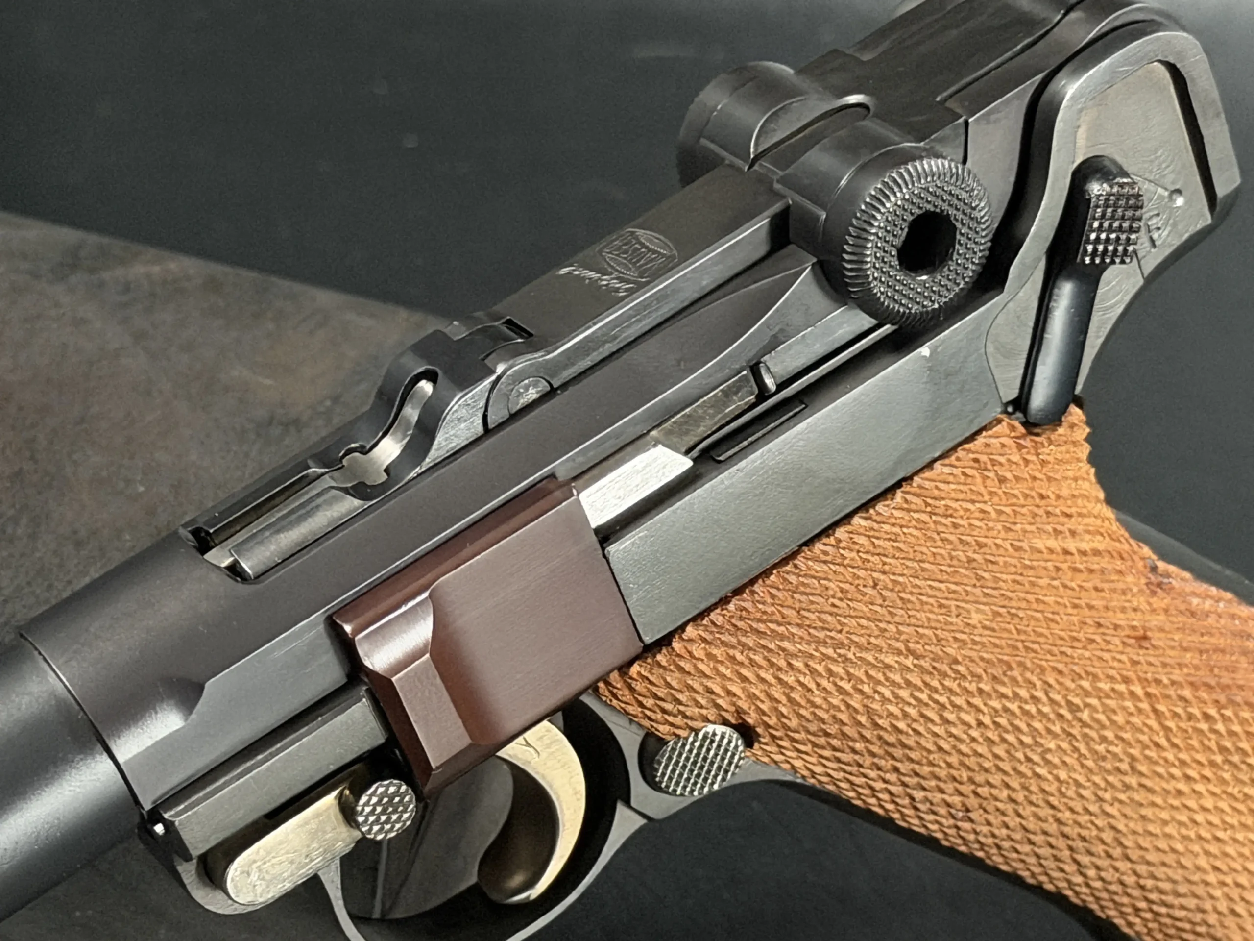At its core, the pistol retains the renowned toggle-lock action of the Parabellum. The exposed mechanism remains one of the platform’s defining features, pairing precise movement with the unmistakable visual identity that has long made the design so recognizable.