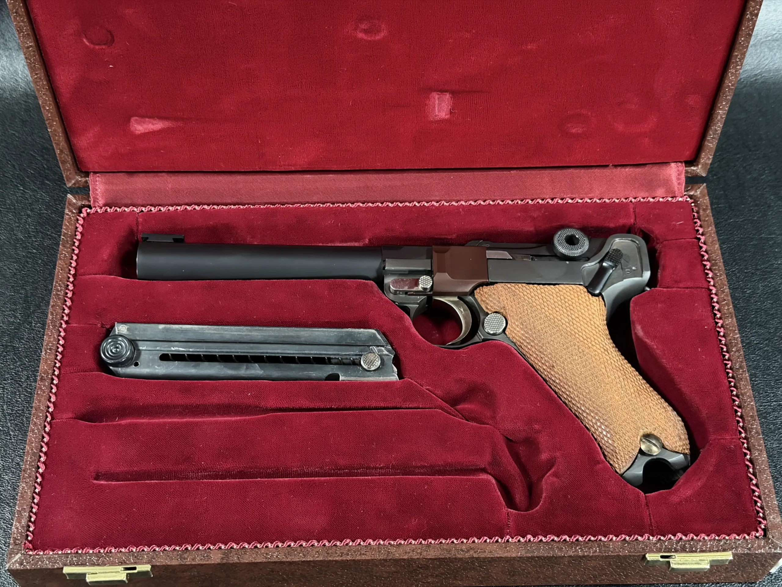 The Mauser Parabellum Sport is a 9mm target-configured Luger variant with an elongated barrel, target-style sights, and finely checkered walnut grips. Paired with a fitted presentation case, it offers the classic Parabellum toggle-lock design in a refined sporting format.