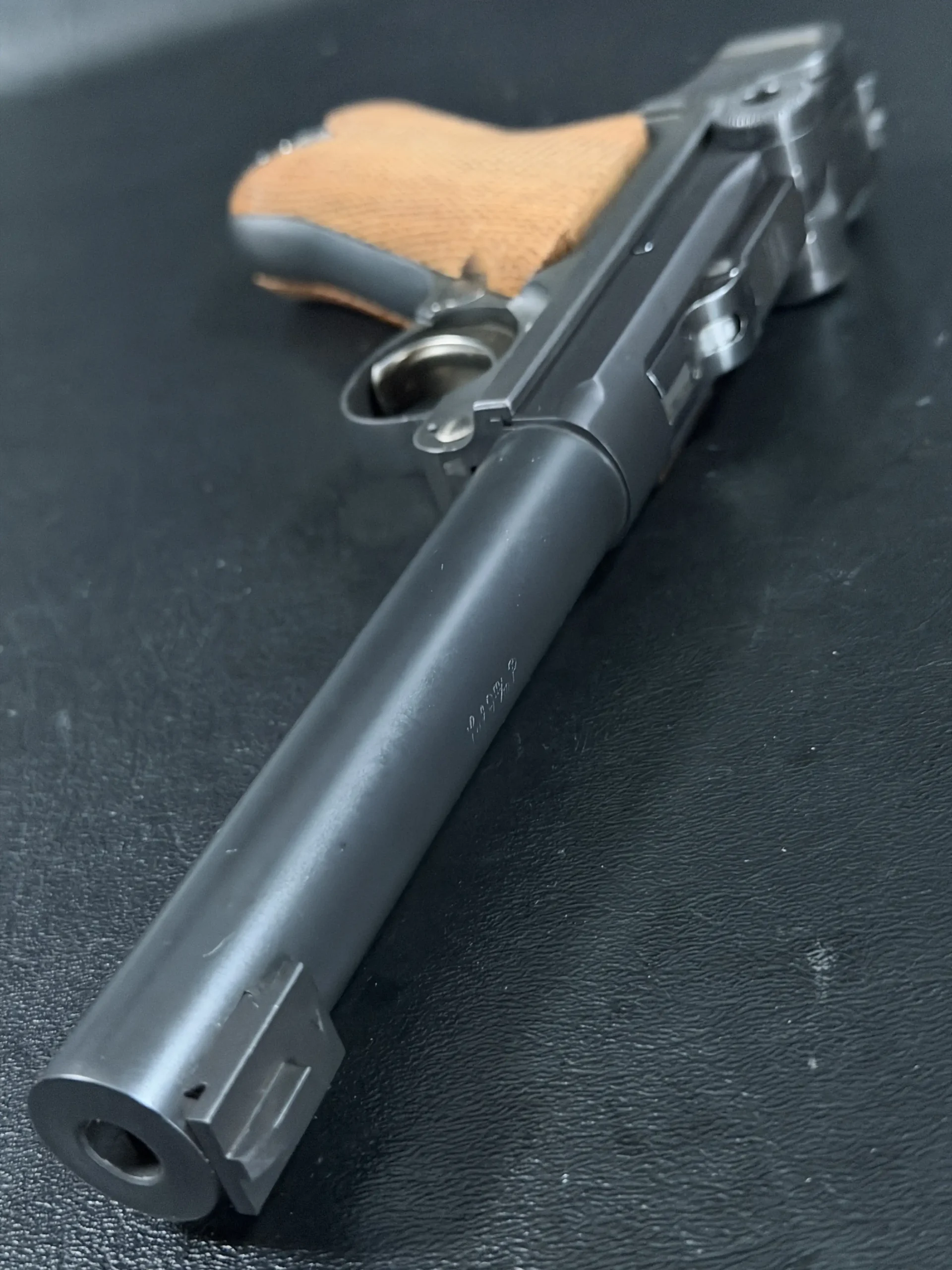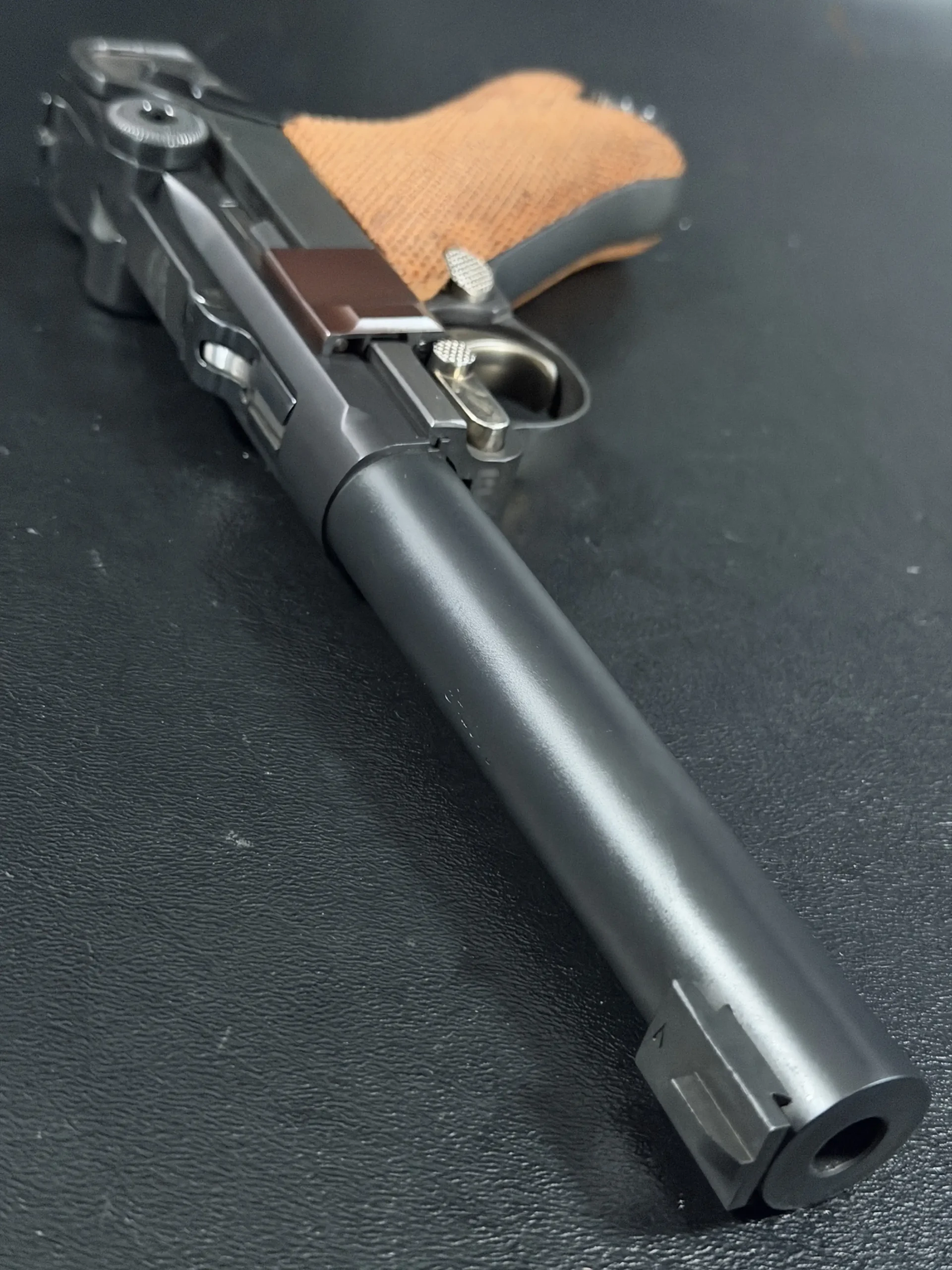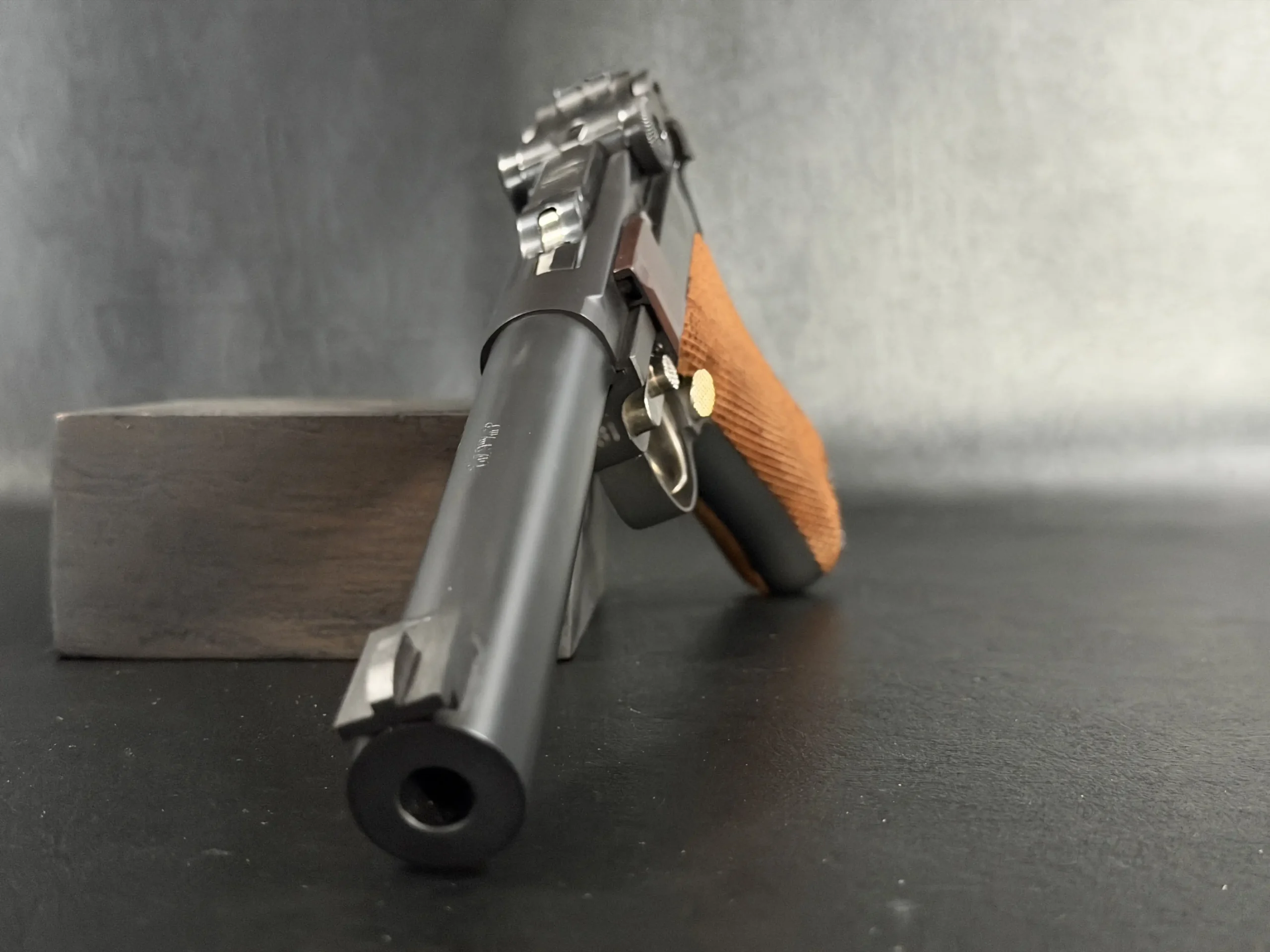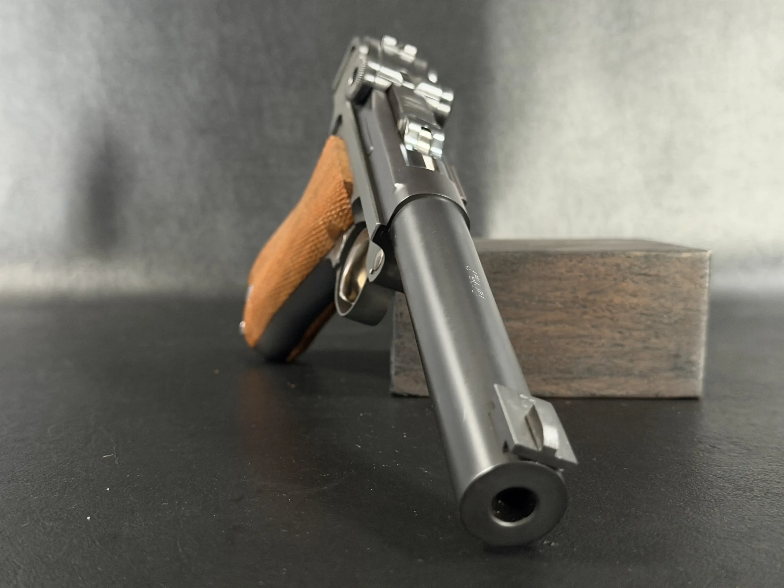 An elongated barrel gives the pistol its unmistakable profile and contributes to the extended sight radius and balanced feel associated with this model. The subdued metal finish is complemented by finely checkered walnut grips, adding warmth and visual contrast while maintaining a clean, purposeful appearance.