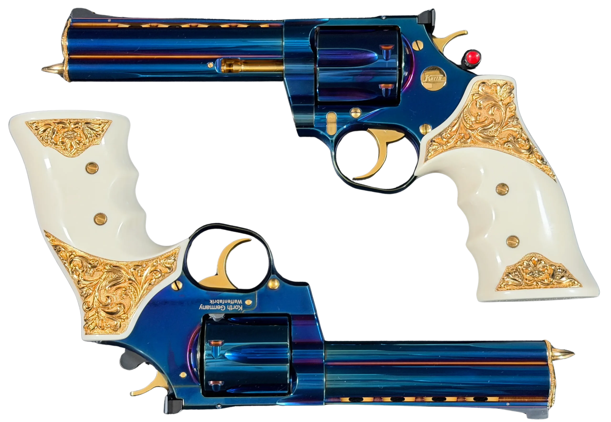 A matched pair of Mueller Murgenthal Korth revolvers chambered in .357 Magnum, created as a unified set that brings together Korth Waffenfabrik craftsmanship with decorative elements honoring Mueller Murgenthal.