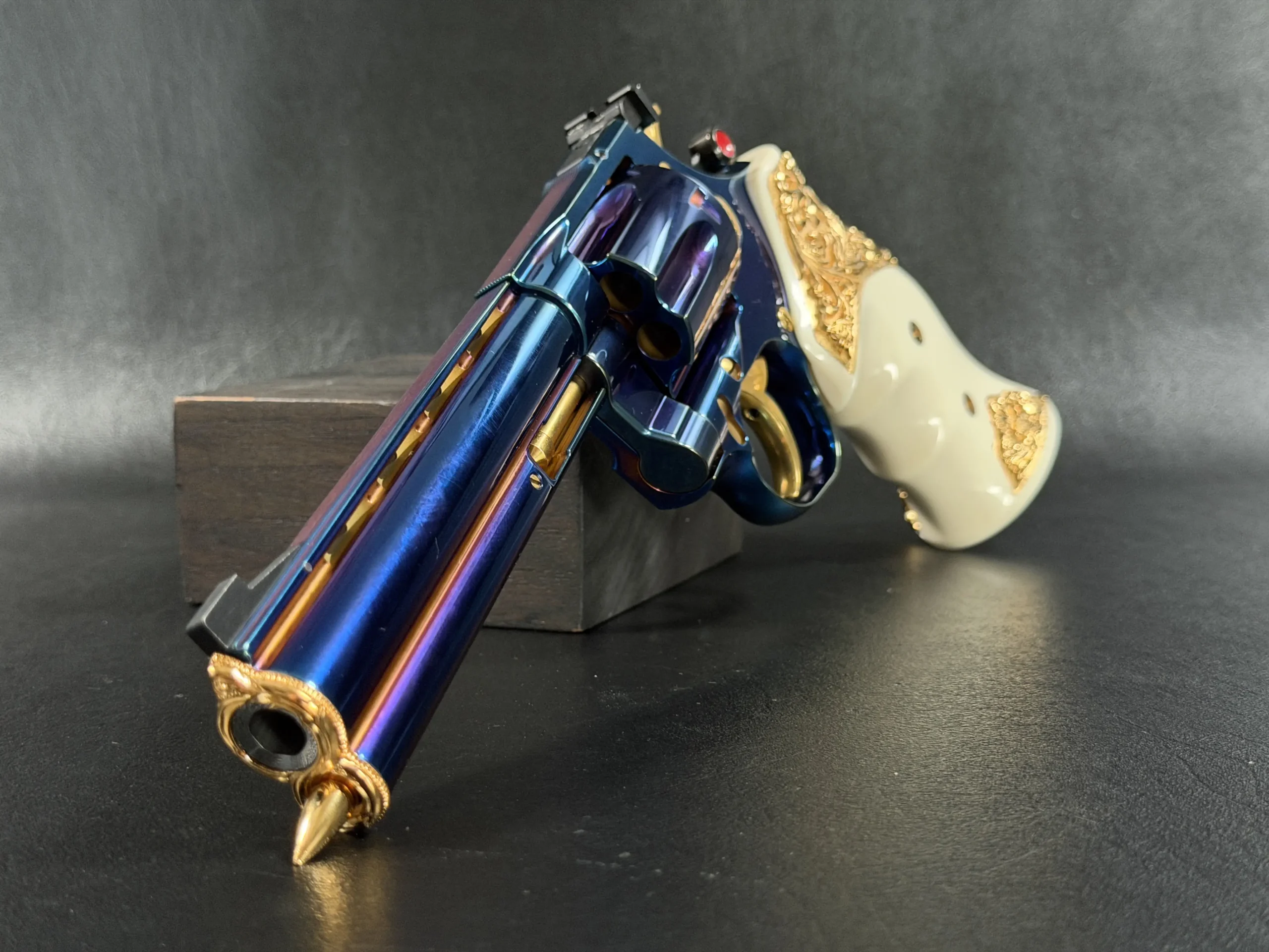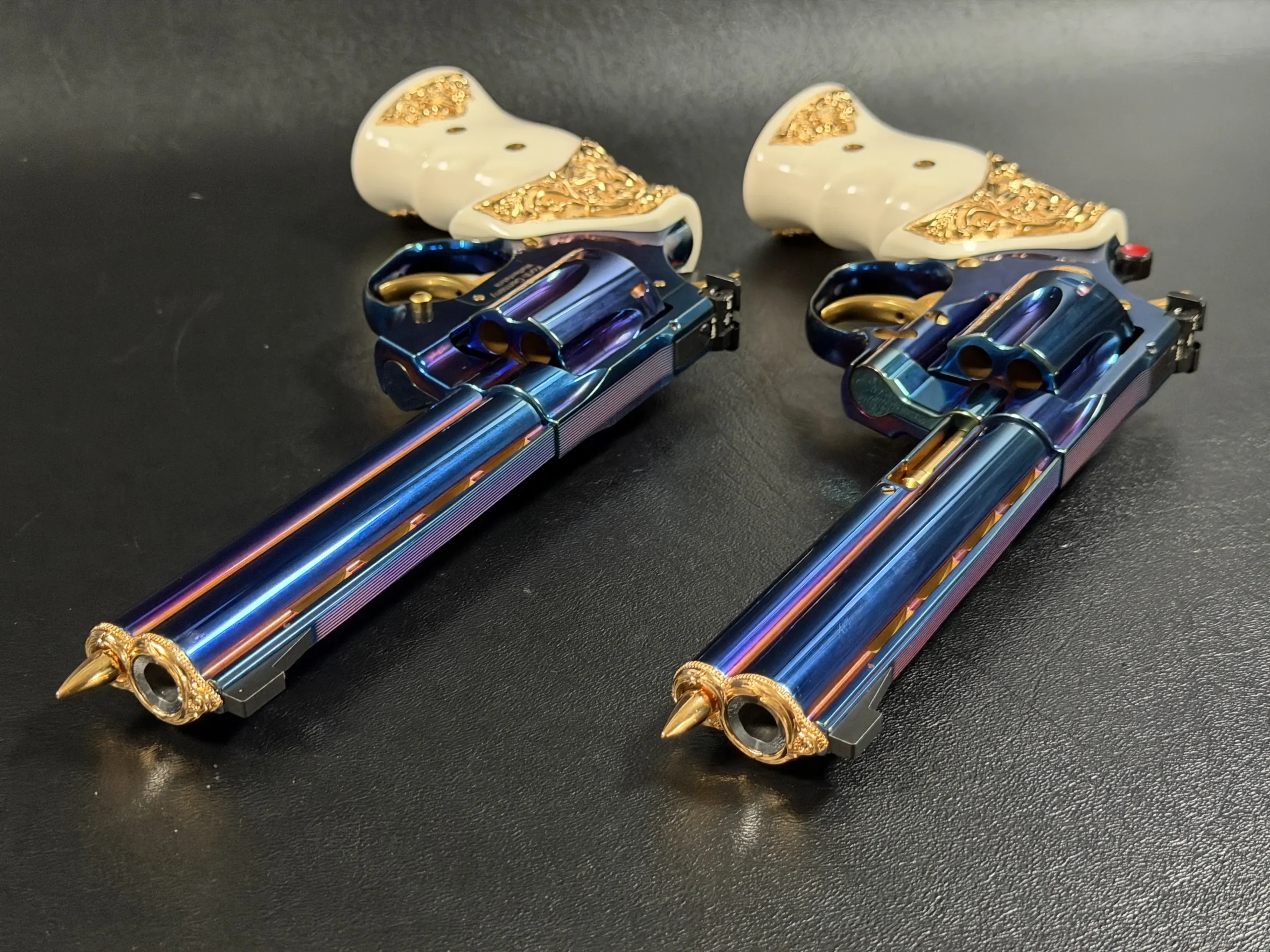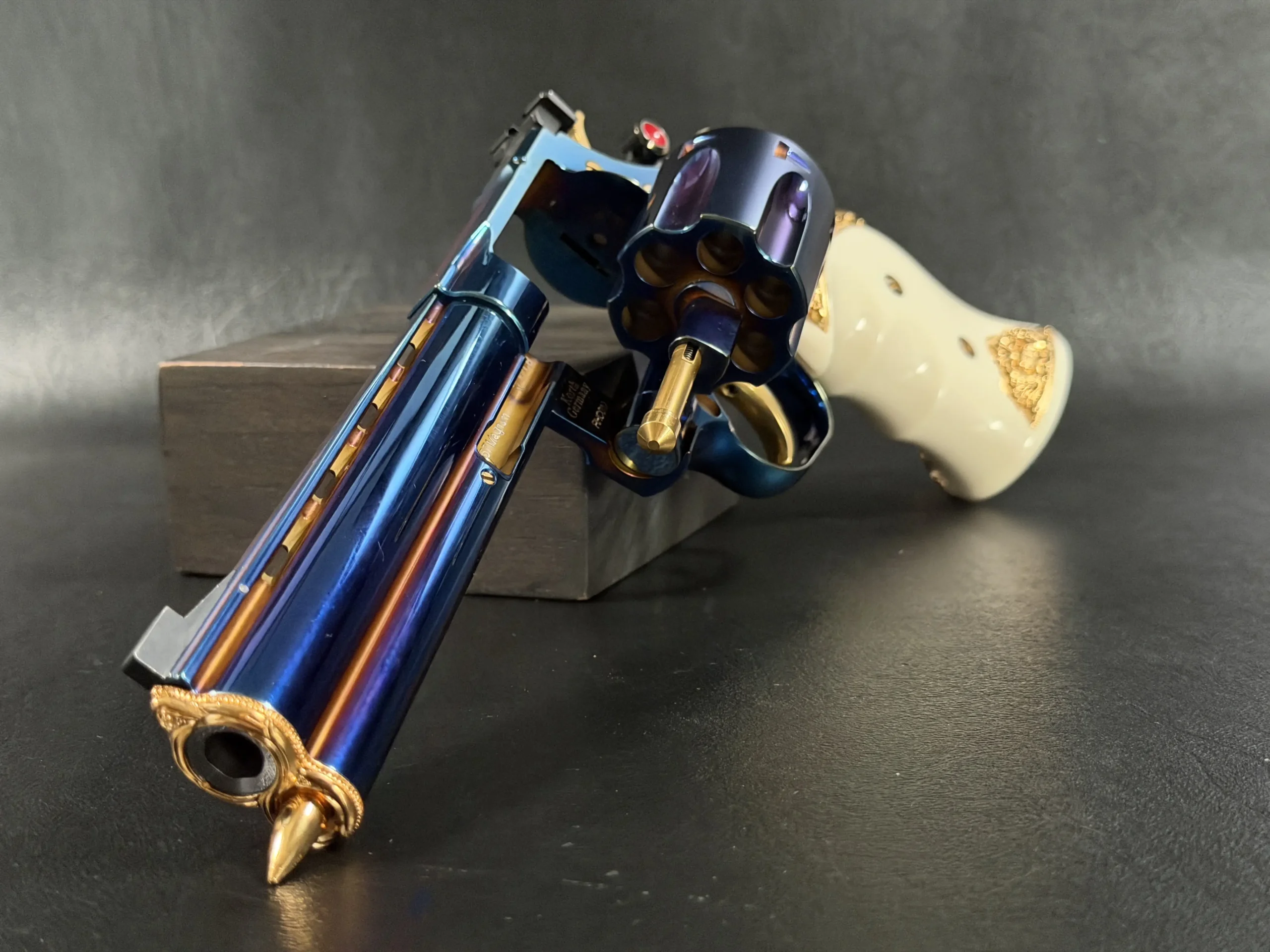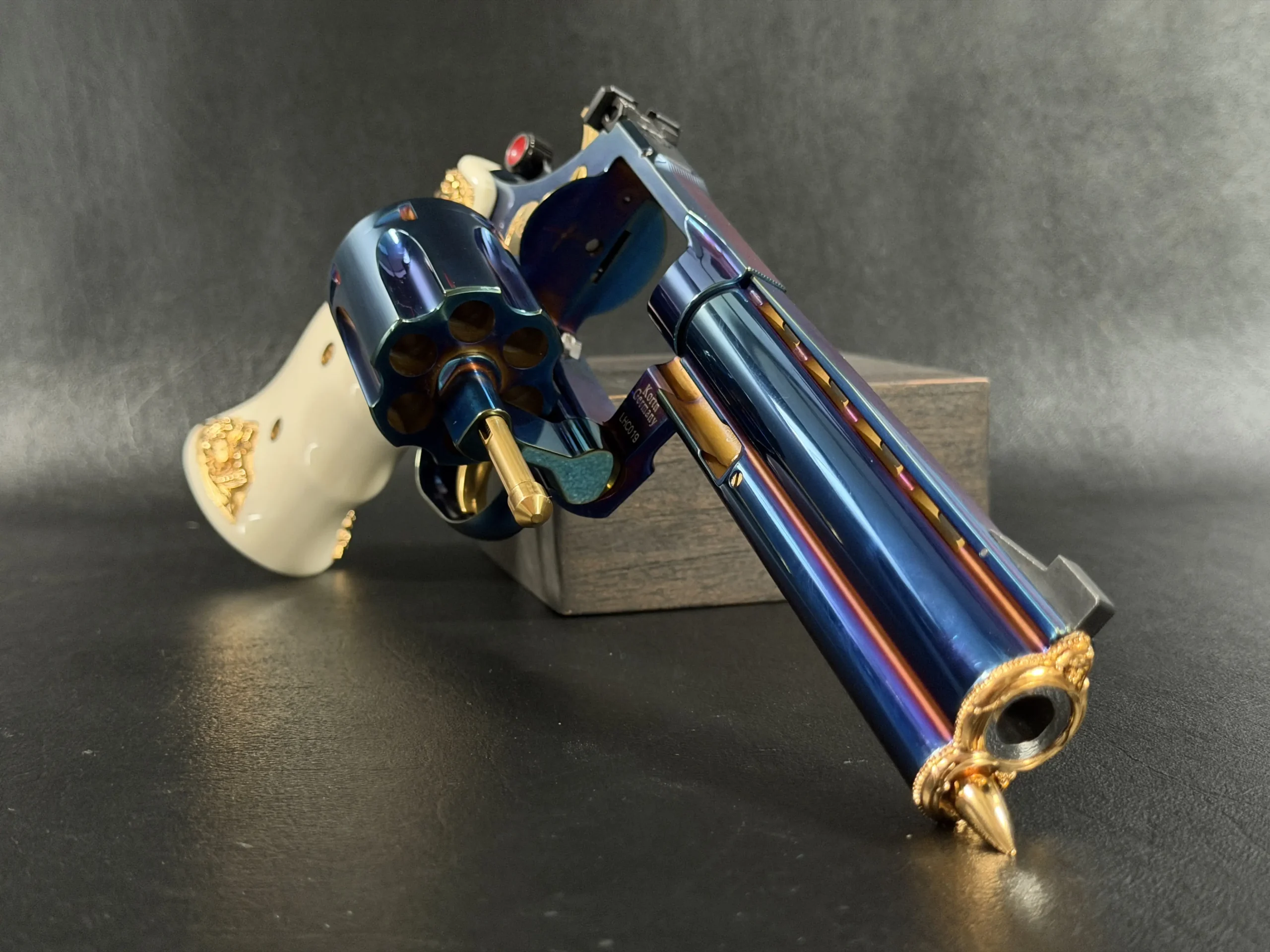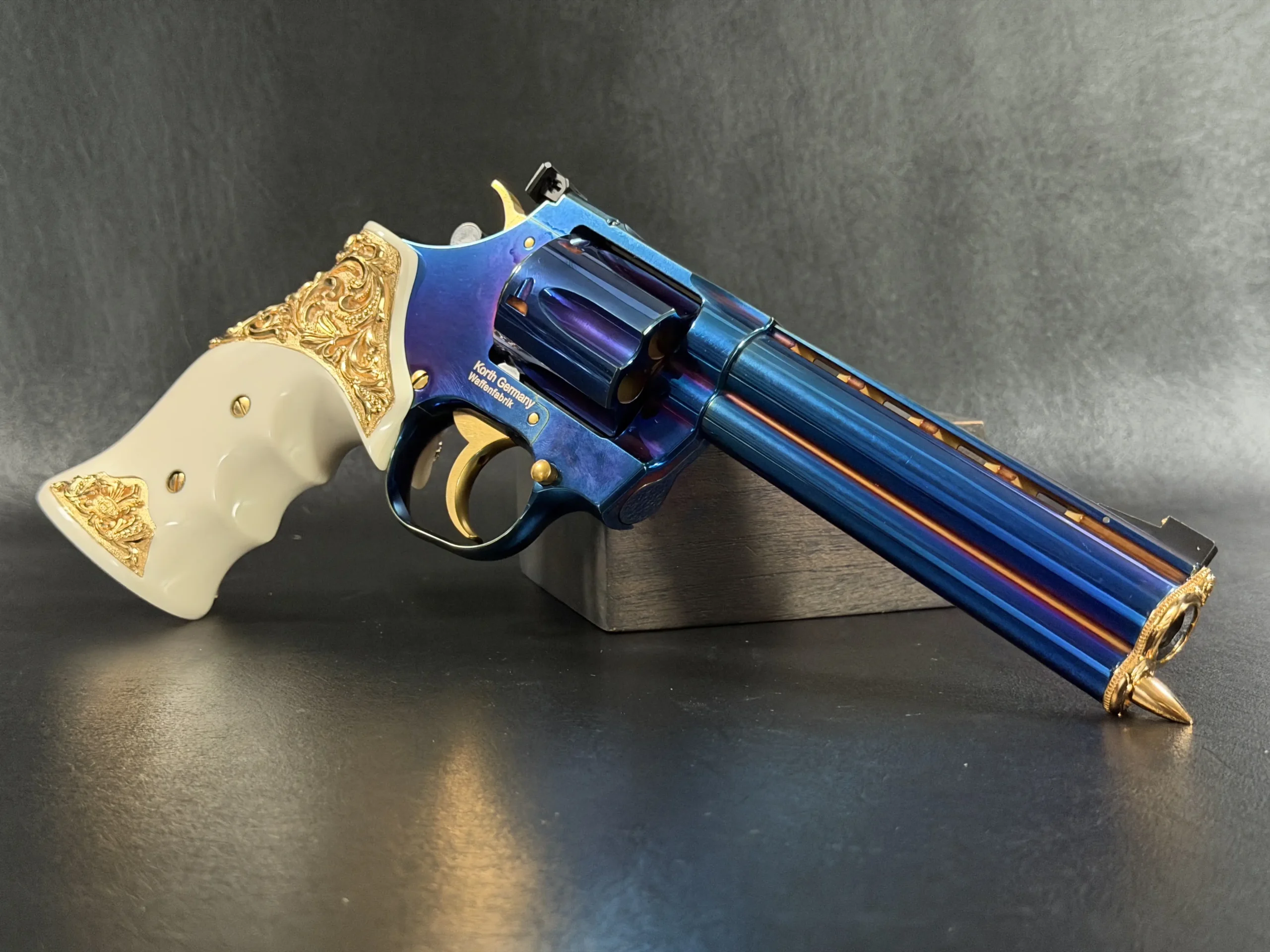 A matched pair of Mueller Murgenthal Korth revolvers chambered in .357 Magnum, finished with plasma-blue steel, gold accents, scroll engraving, and ivory-tone sculpted grips. The set is presented in a custom hardwood display case and includes a Certificate of Authenticity for the Mueller Murgenthal Model edition.