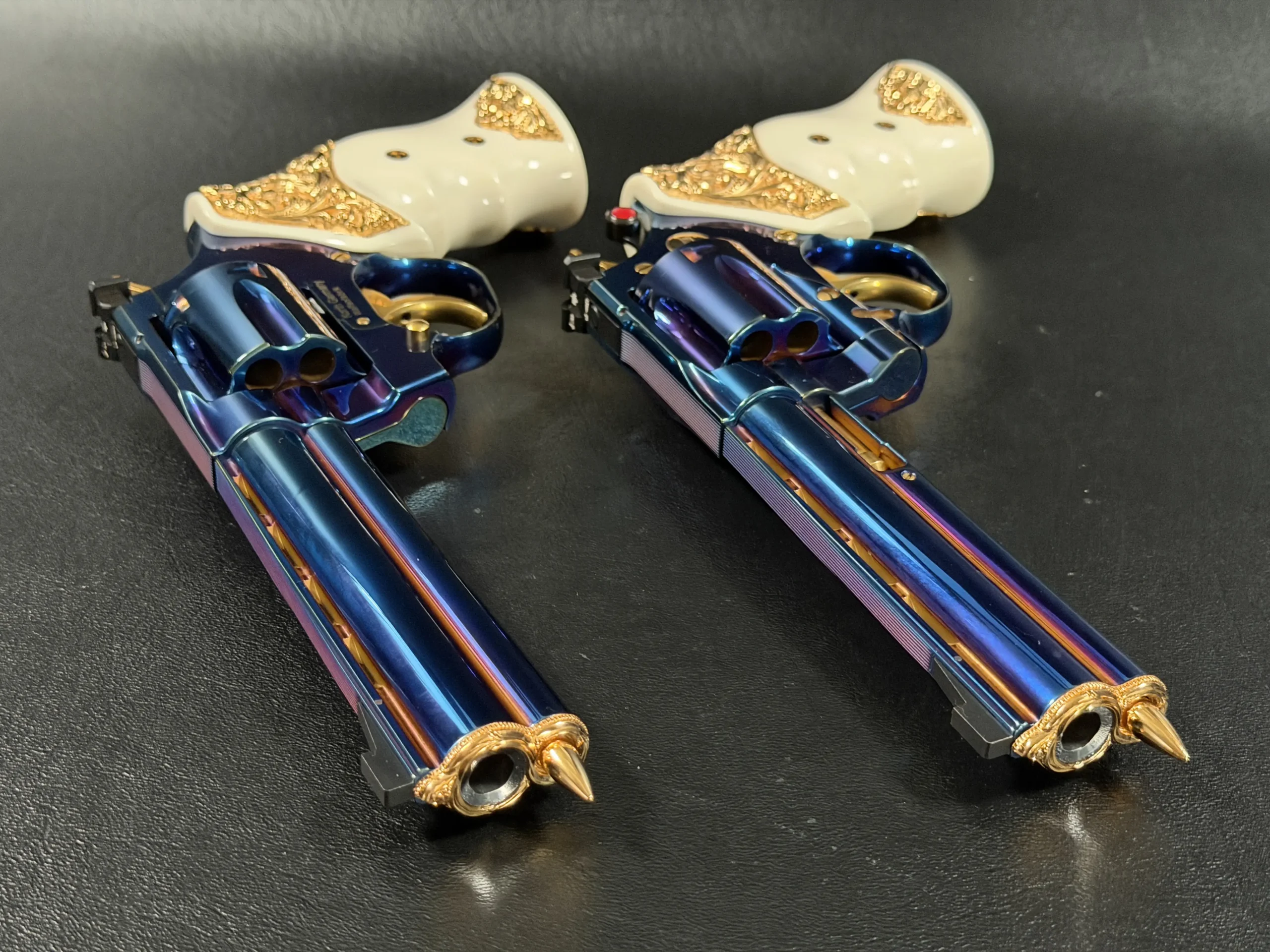 Each revolver features a deep plasma-blue finish, gold accents, ornate scrollwork, and ivory-tone sculpted grips with raised hand-engraved embellishments. The pair shares a mirrored presentation and coordinated detailing that gives the set a cohesive visual identity.