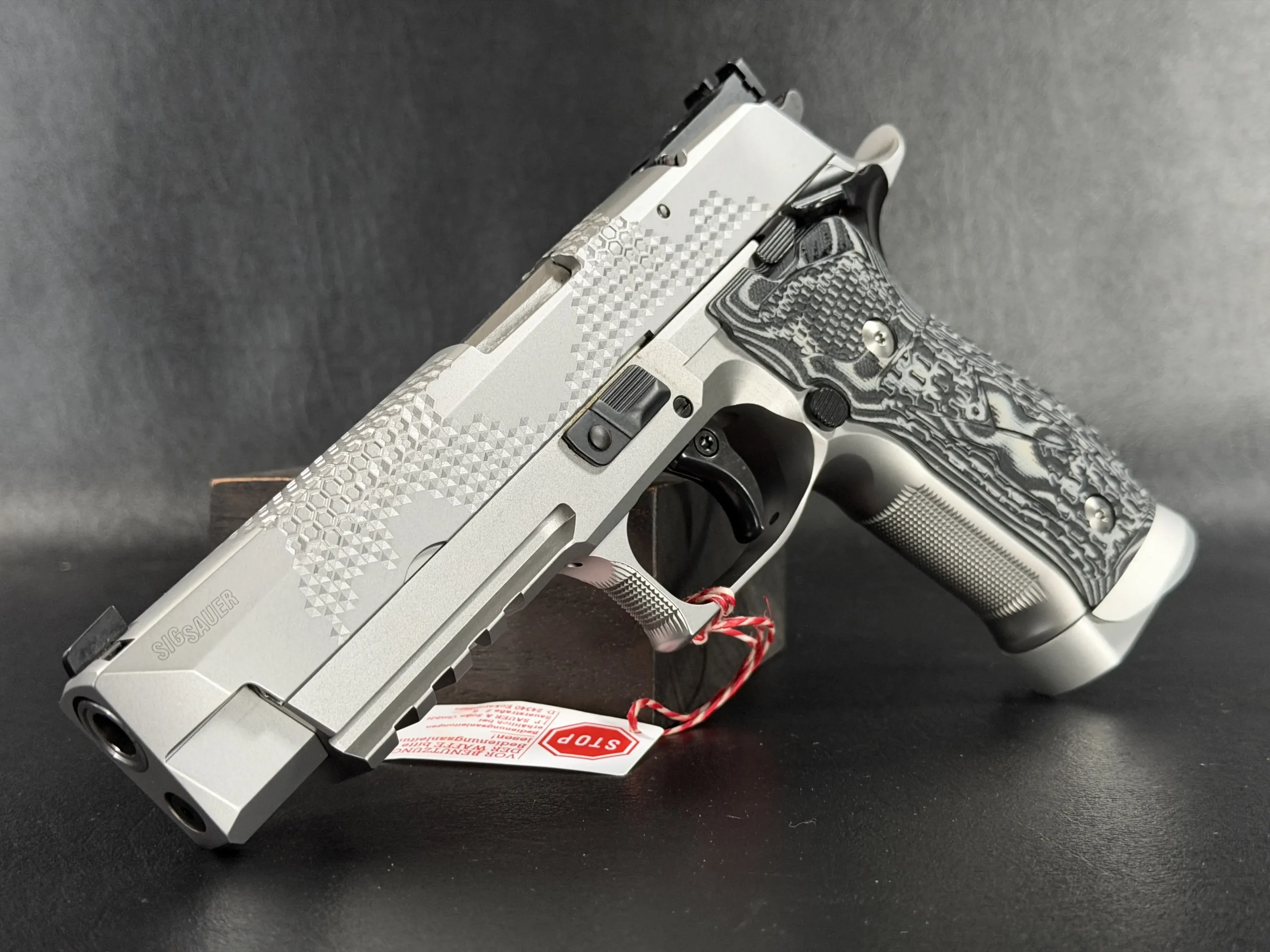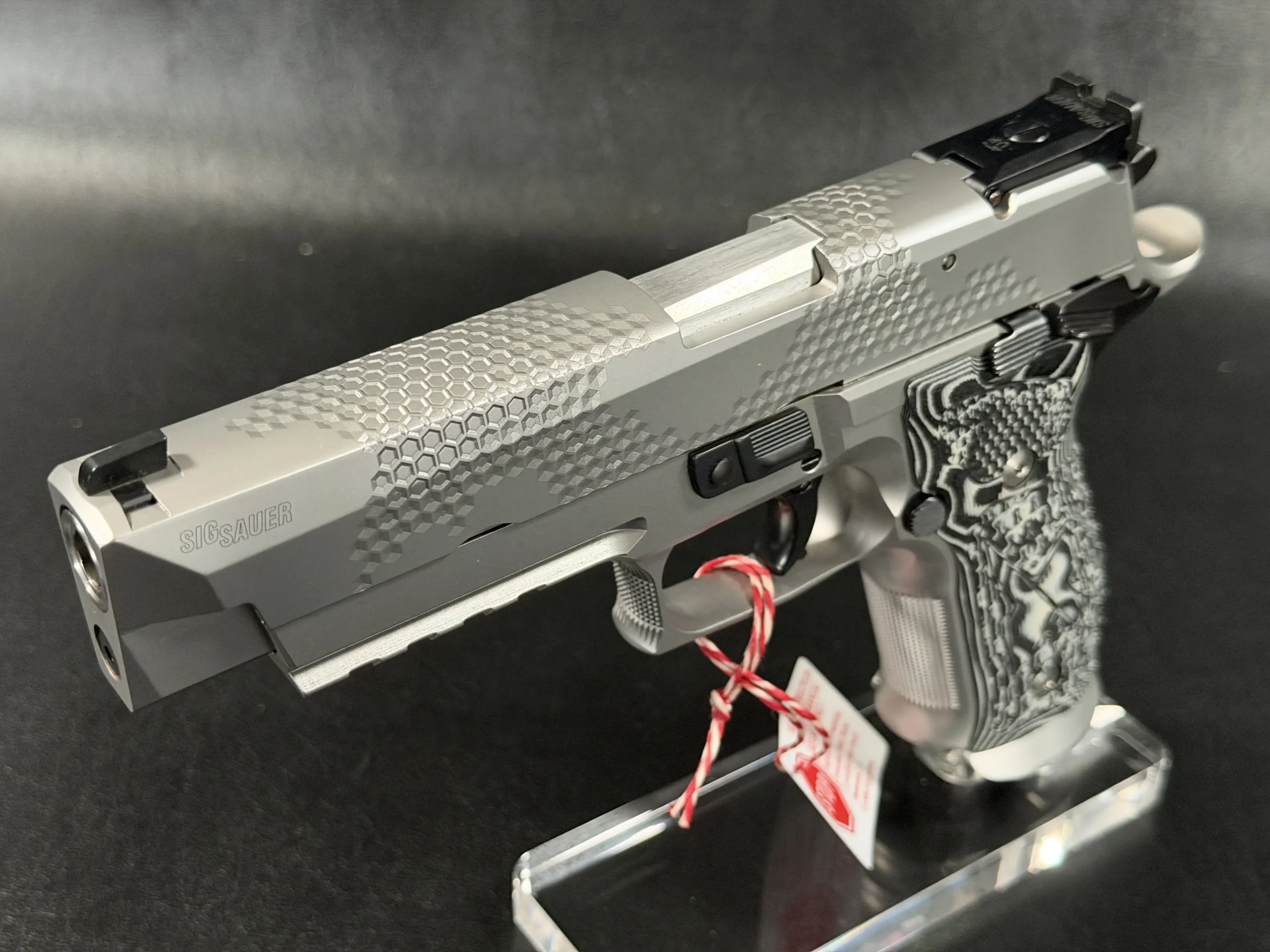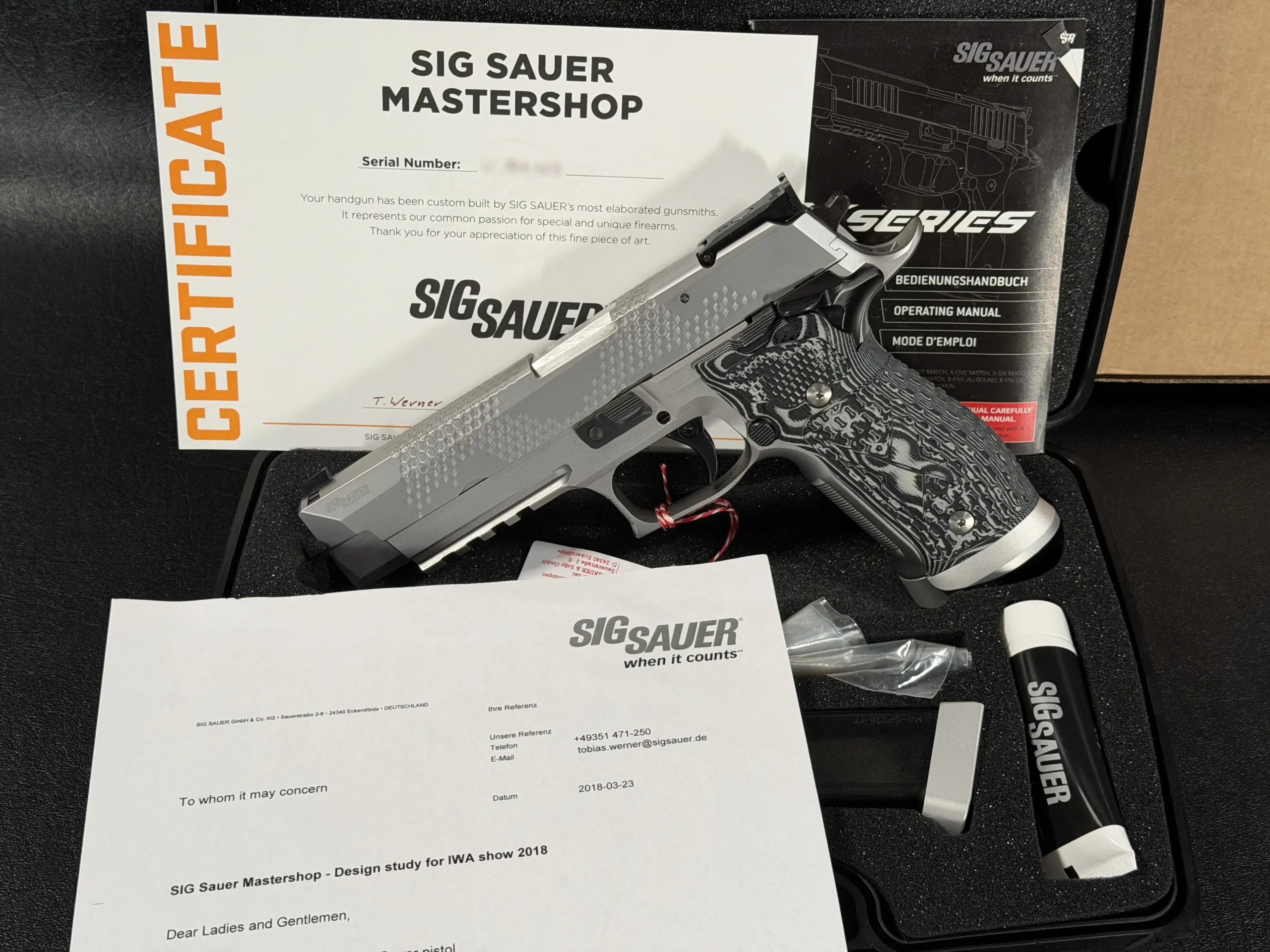 Chambered in 9mm, this pistol pairs the familiar X-Five format with a distinctly experimental Mastershop treatment. It is accompanied by its original SIG Sauer Mastershop documentation confirming its role as a design study, and all numbered components are factory-matched.