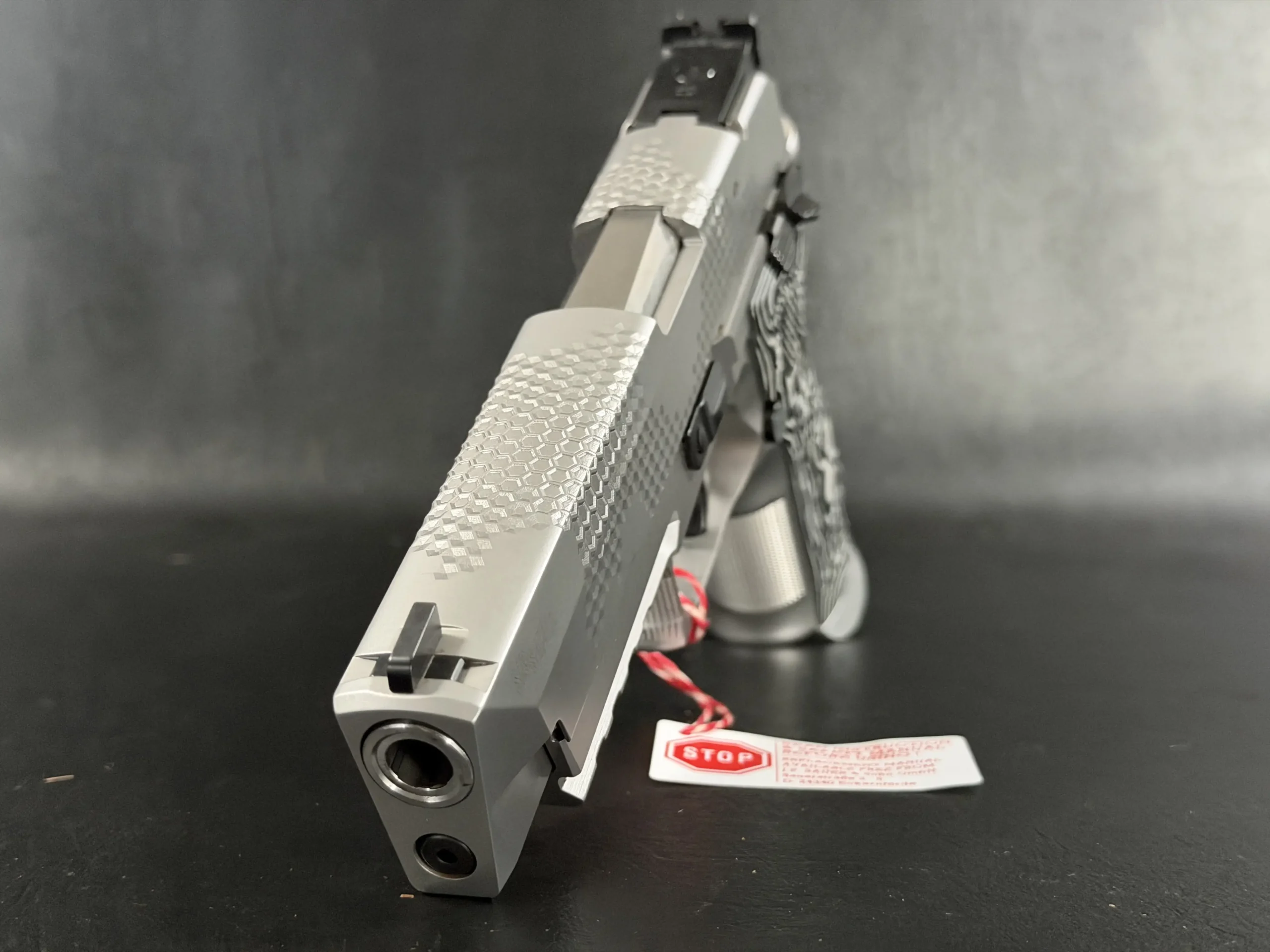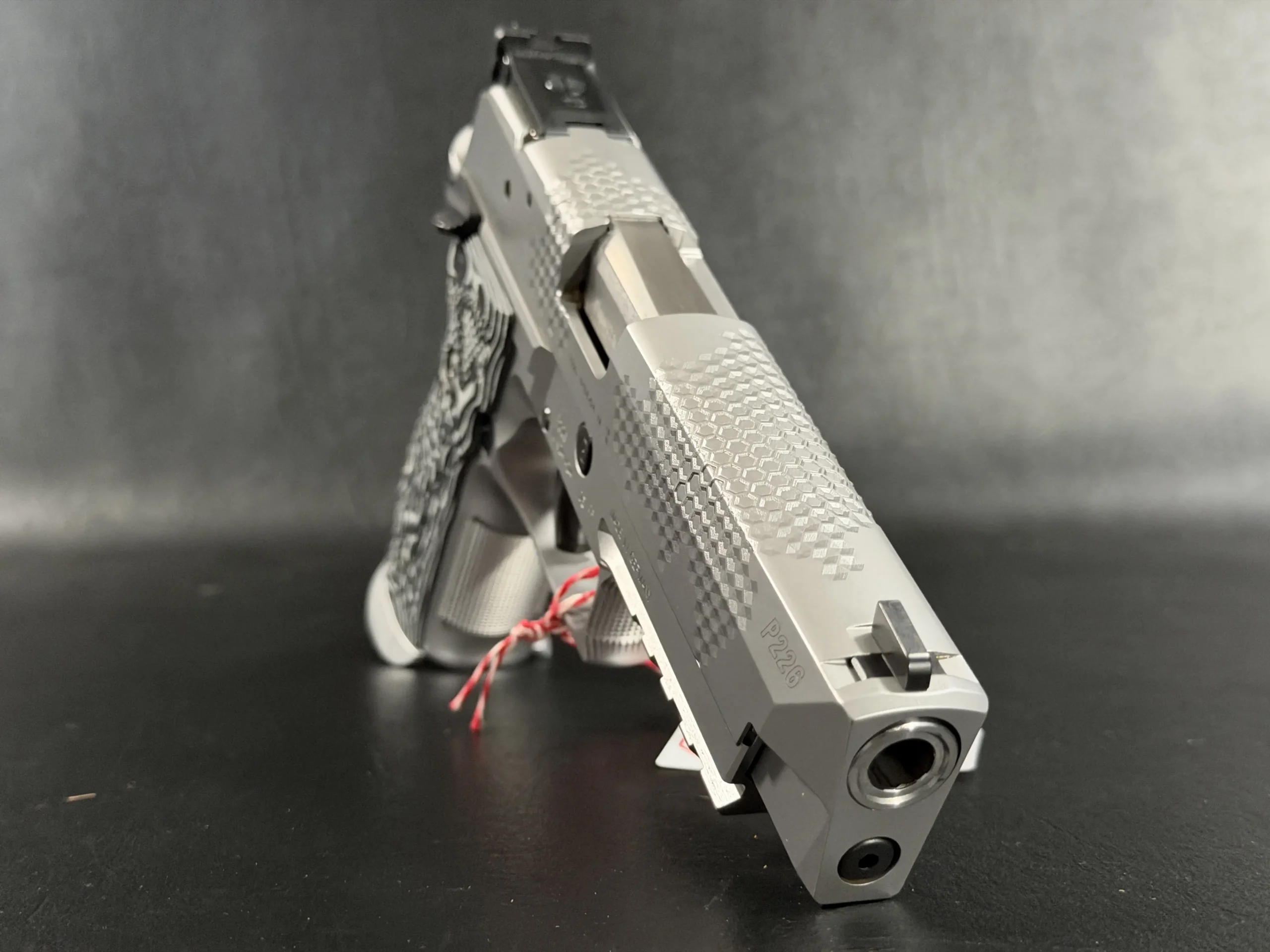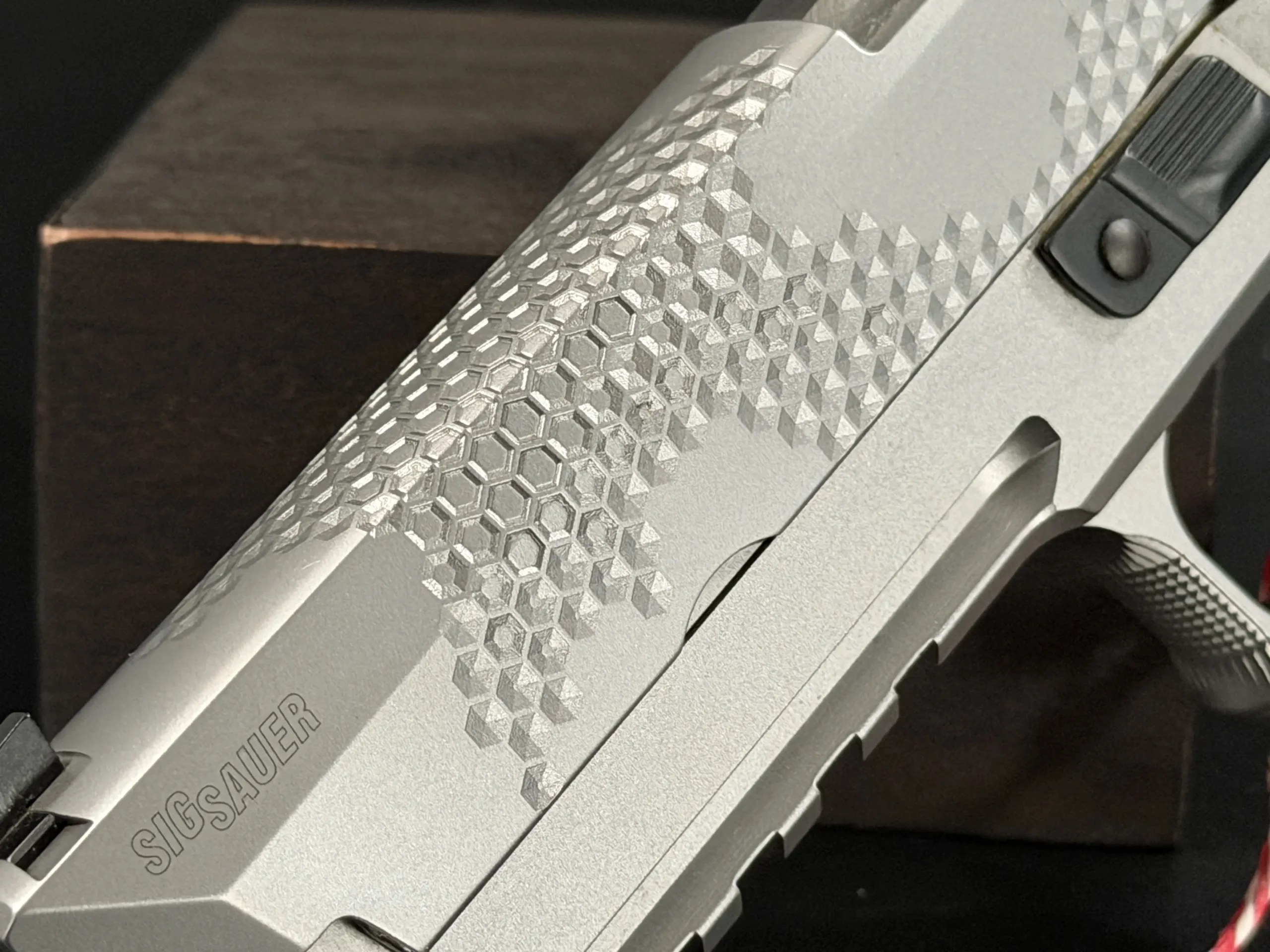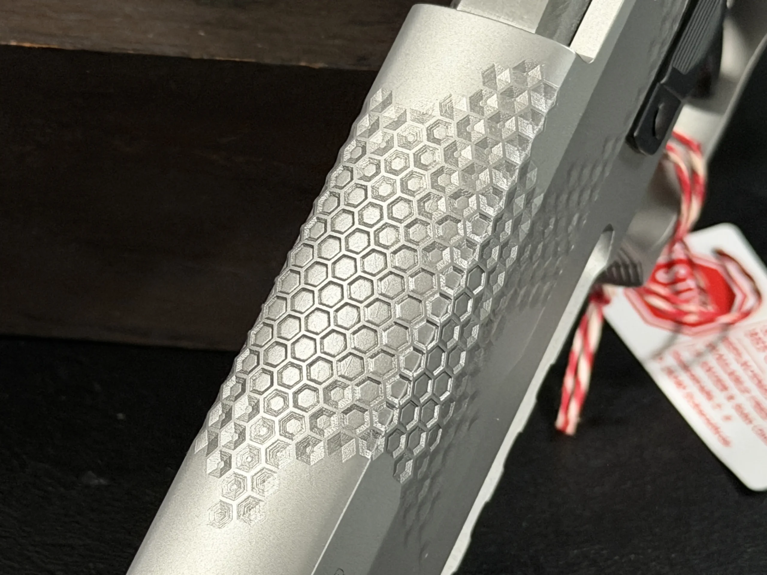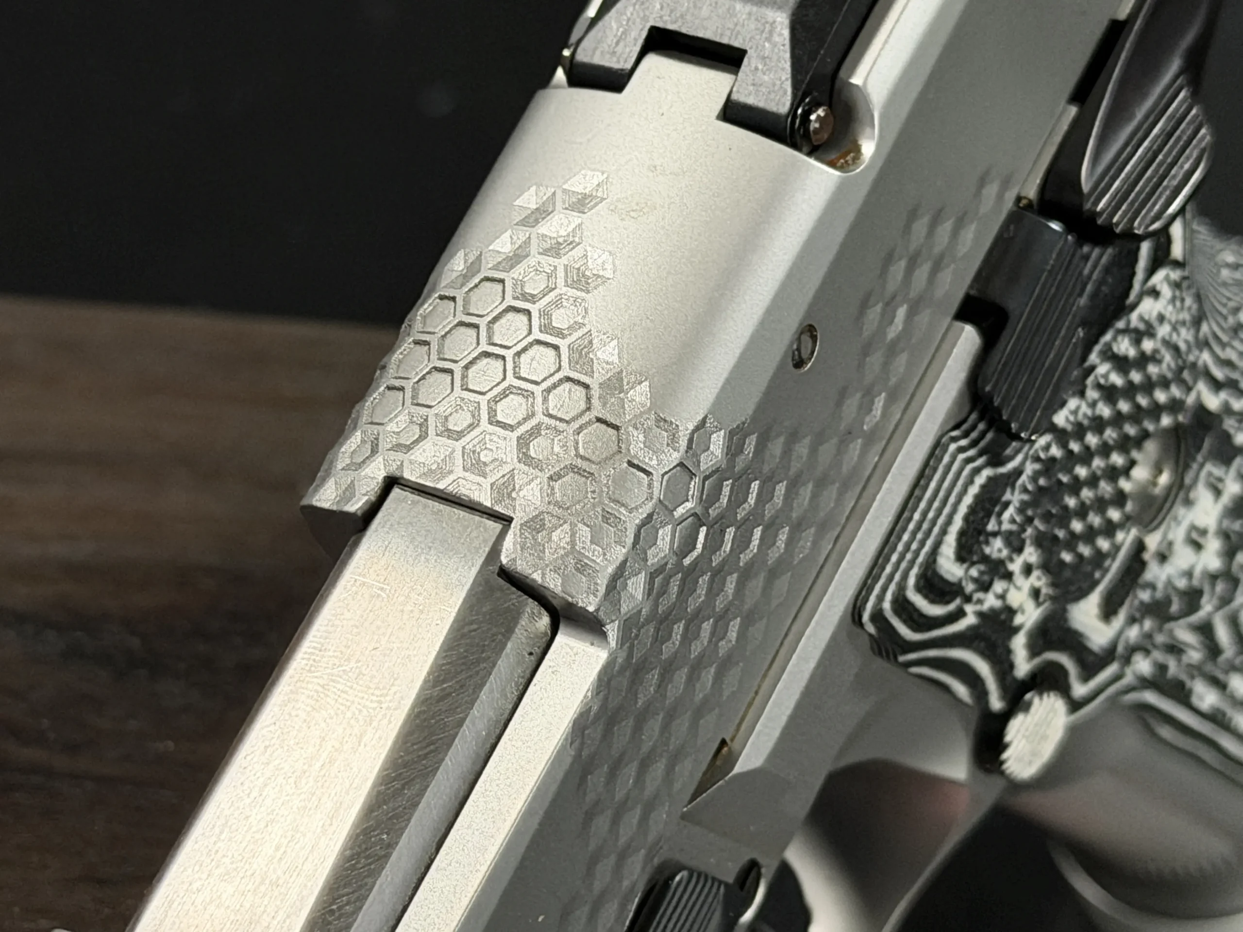 Its defining feature is the Hexagon-pattern serration work across the slide, executed in a precise repeating geometry that changes with light and viewing angle. The motif is carried throughout the pistol, giving the overall design a cohesive and intentional visual language.