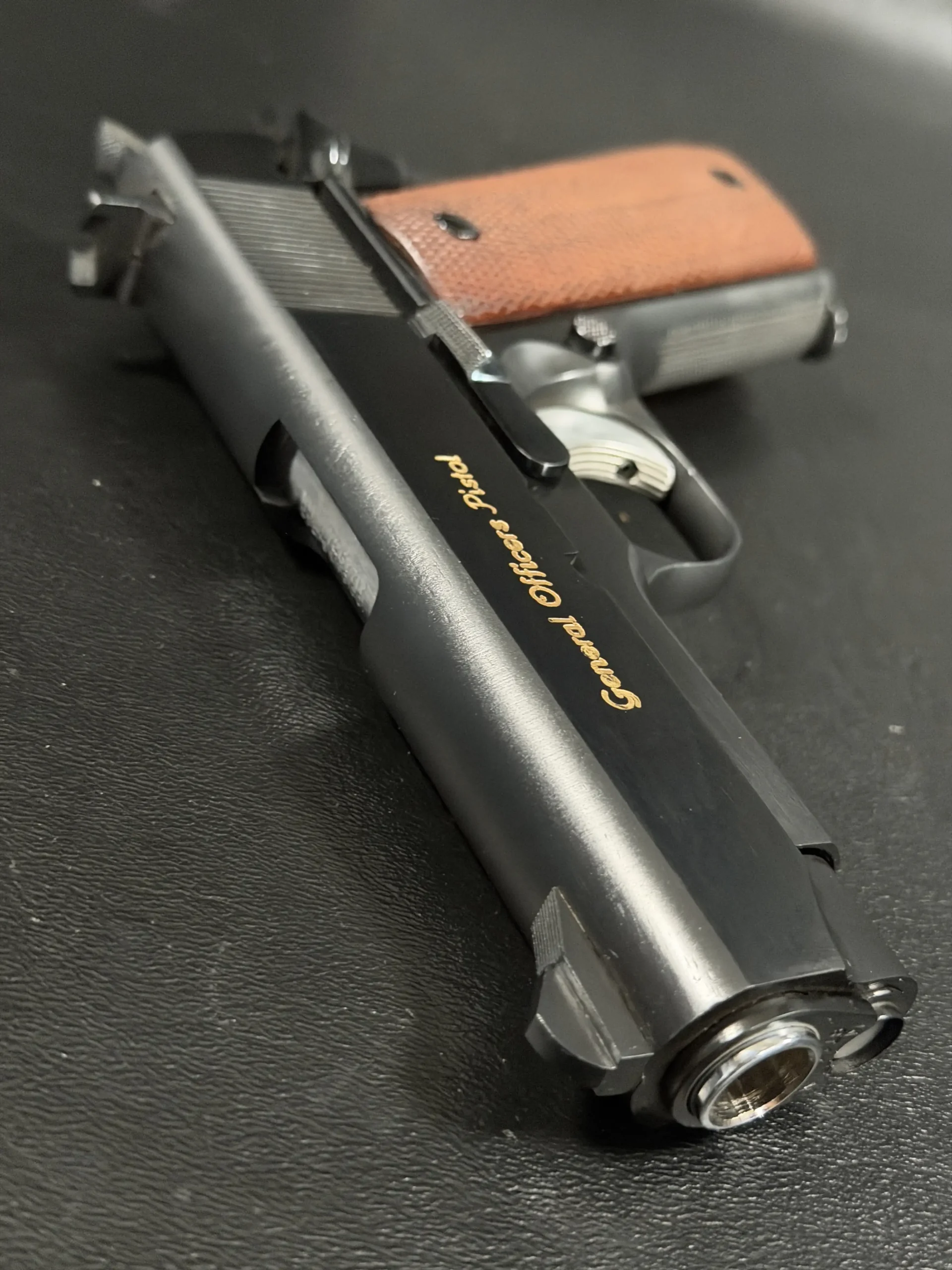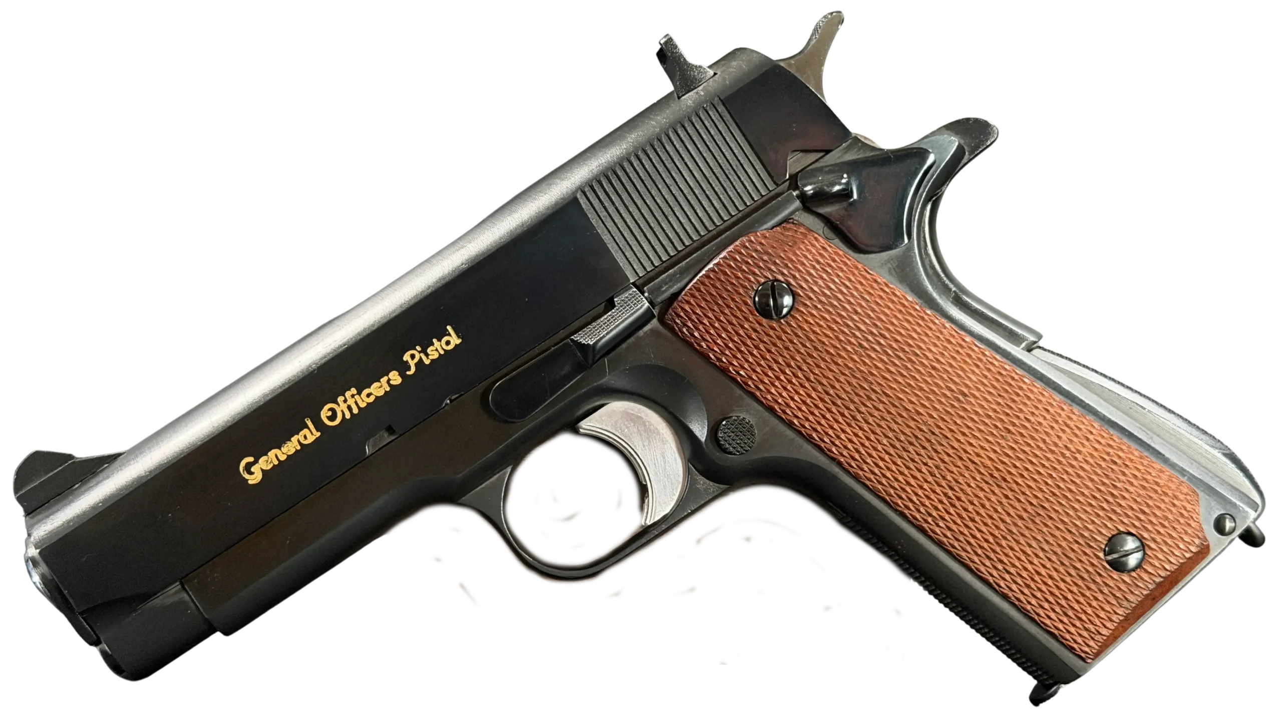It features a matte black finish, a purposeful compact profile, and slide markings reading “General Officers Pistol” in gold script. Checkered brown grip panels with a U.S. insignia medallion add a distinctive visual element consistent with the model’s presentation-oriented styling.