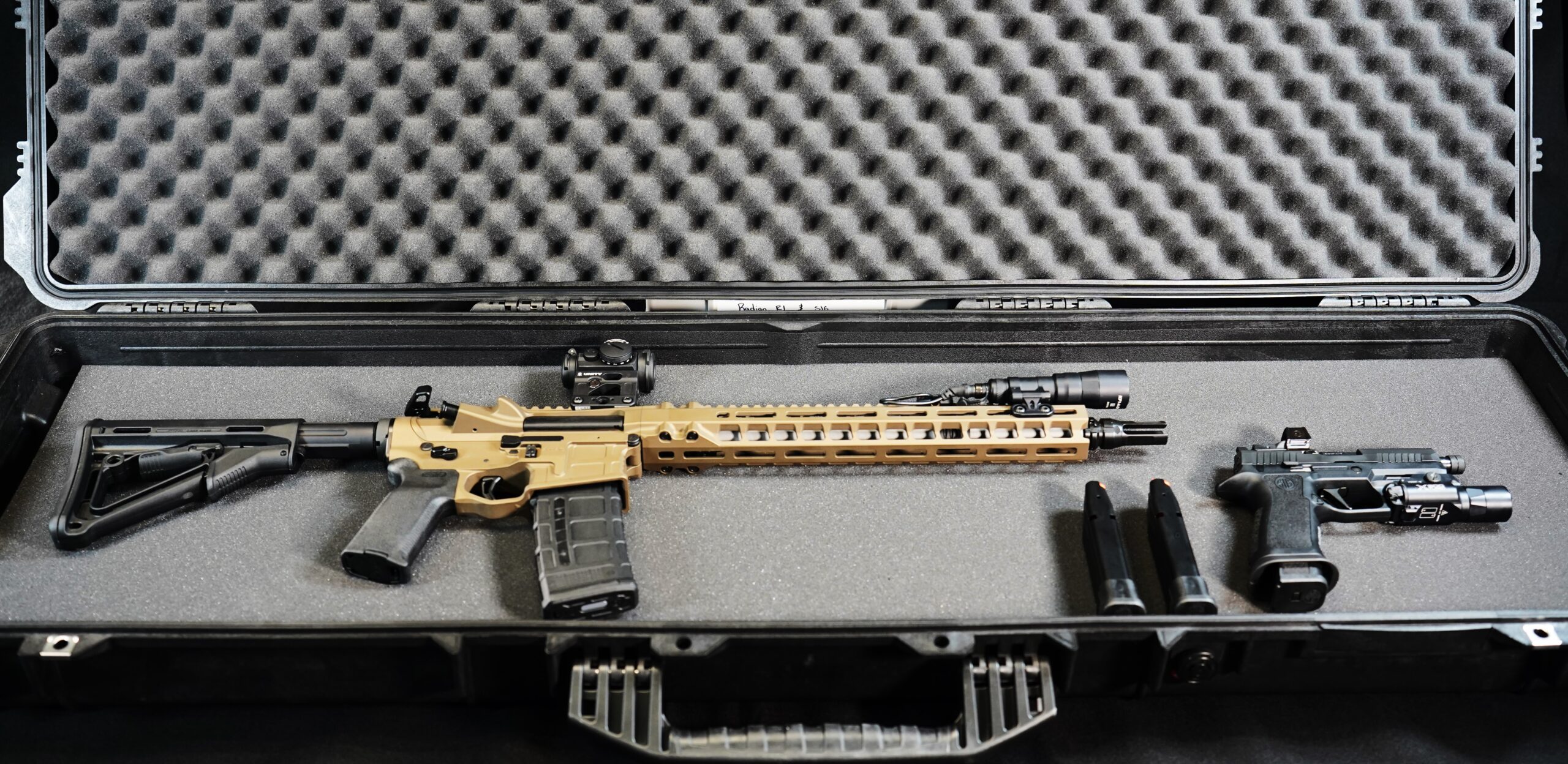 This tactical deployment kit brings together a Radian Model R1 rifle, a Sig Sauer P320 NSF pistol, and a Pelican 1750 Hard Case for storage and transport.