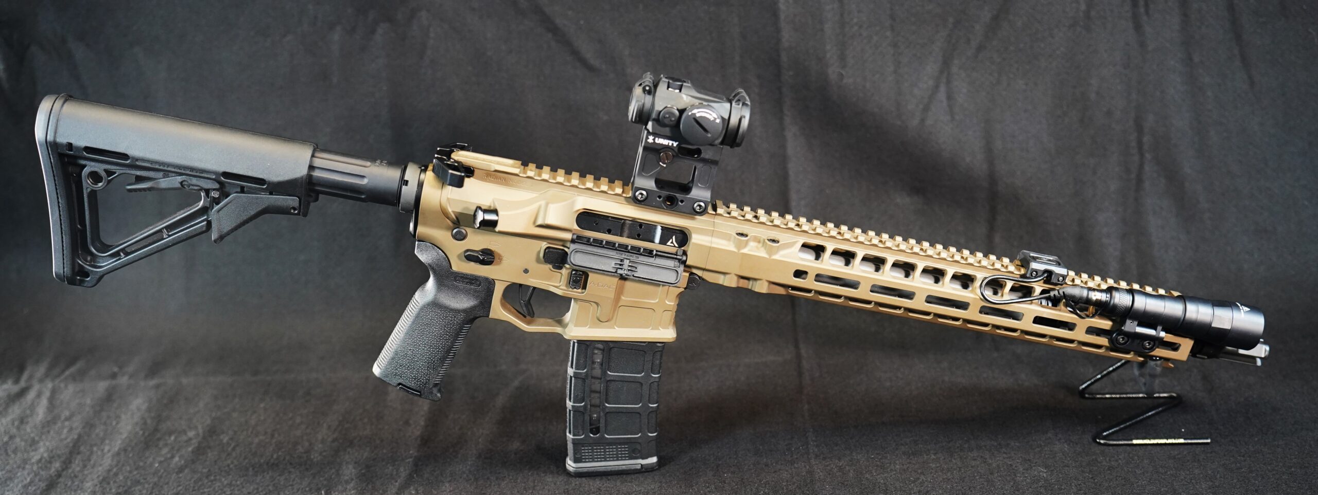 The Radian Model R1 is chambered in 5.56 NATO and features a 14.5-inch barrel with a pinned muzzle device. It is equipped with an Aimpoint T2 red dot sight mounted on a Unity Tactical FAST Mount, along with a SureFire M340 Turbo light paired with a Unity Tactical Mod Button.