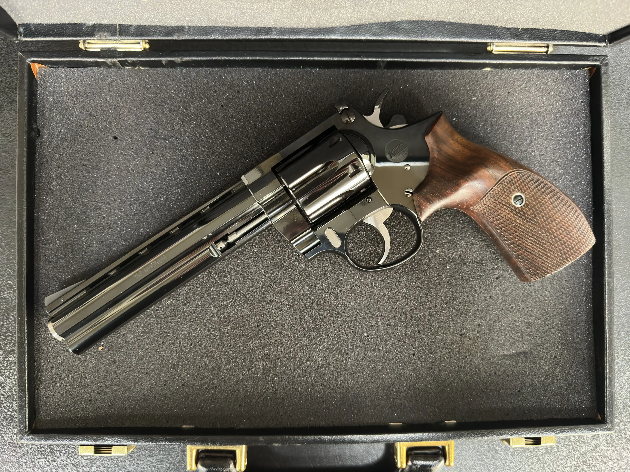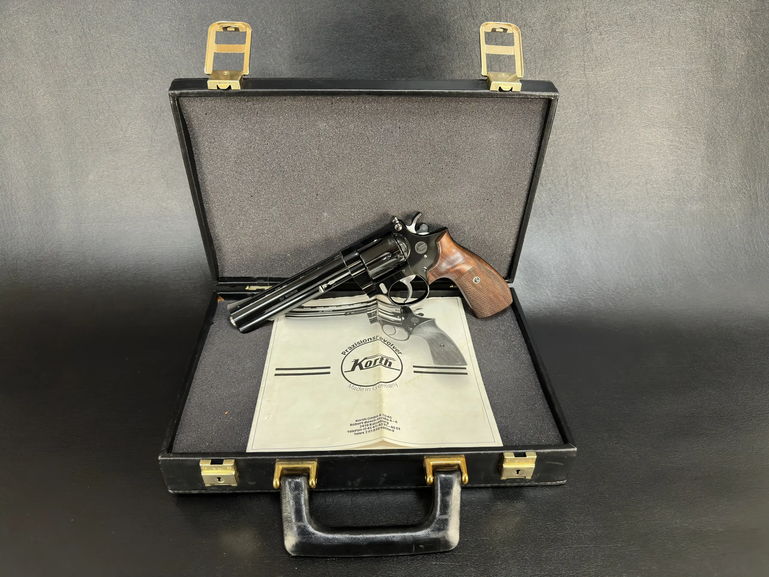 Mechanically, this revolver features the refined action Korth is known for, with a smooth double-action pull and a crisp single-action break. This example is accompanied by its original factory case and paperwork, with matching components.